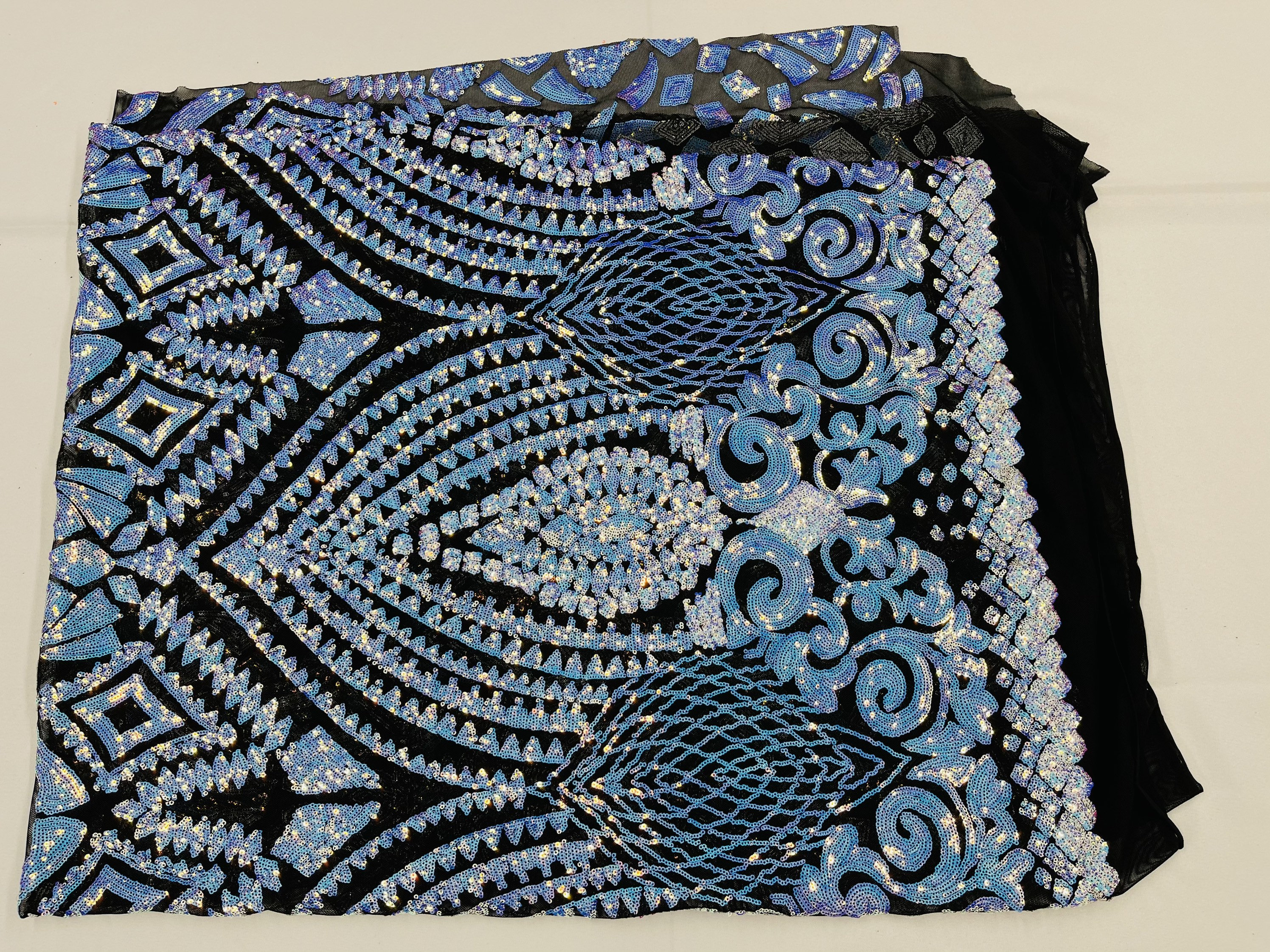 This sequins material has a unique geometric design on the mesh.