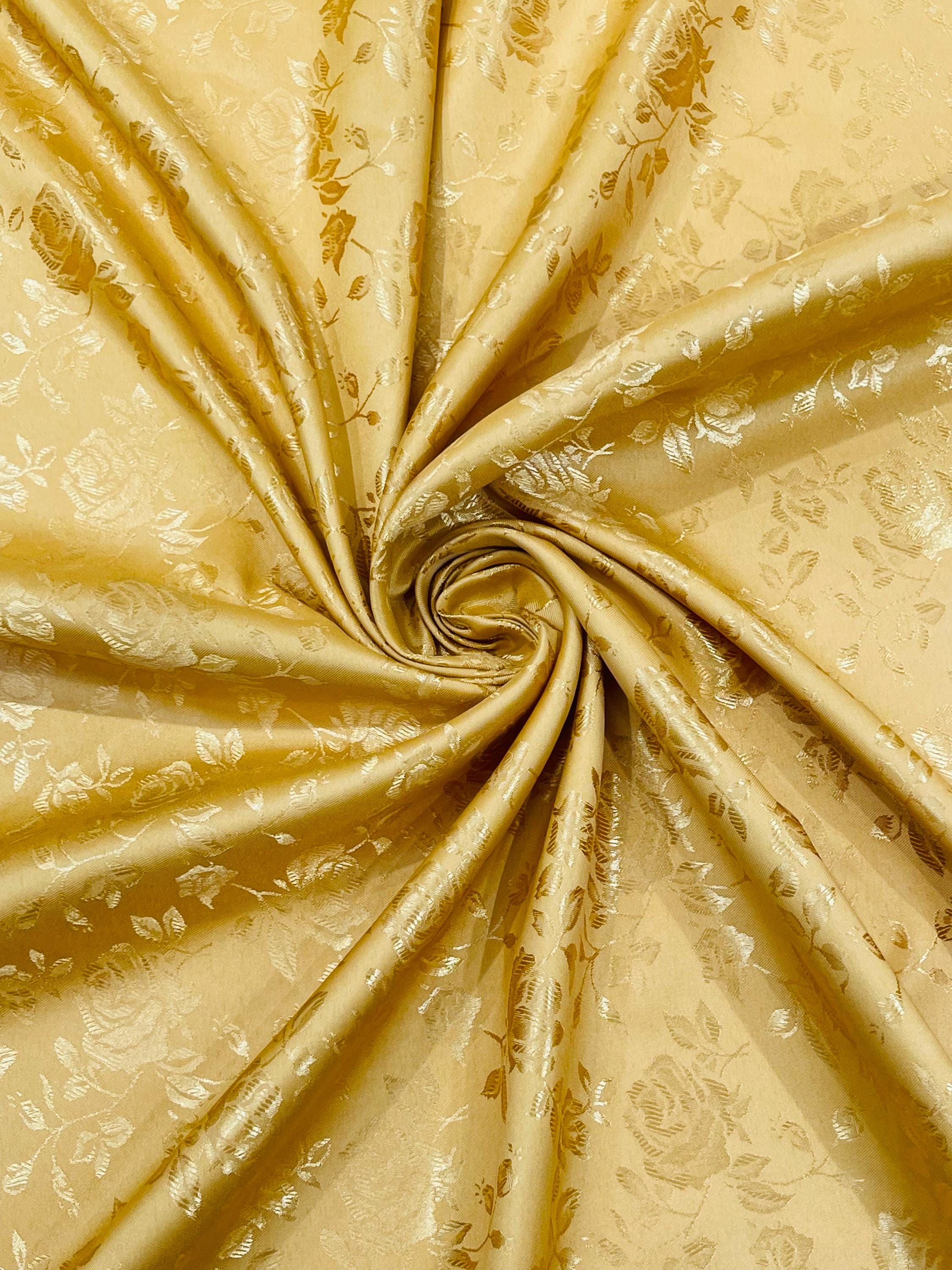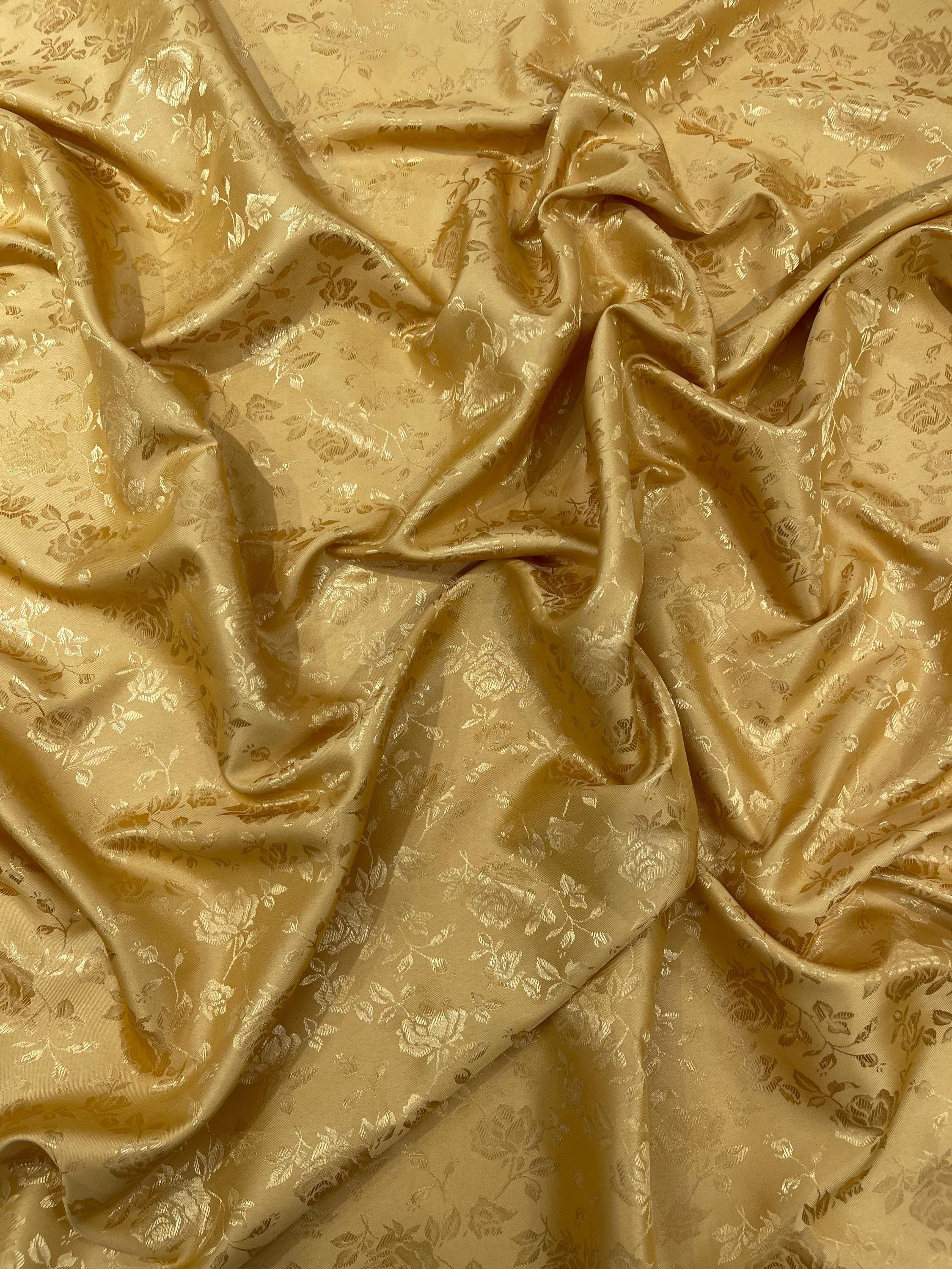The subtle beauty of the floral pattern stitched into this fabric grows more apparent the closer you look. The fabric has a slight shine, but the pattern is stitched with a matte thread producing a very unique effect as it moves through the light. Note that the flower images are slightly different for each color (all are lovely) and since it is a brocade, the pattern is visible on both sides.
