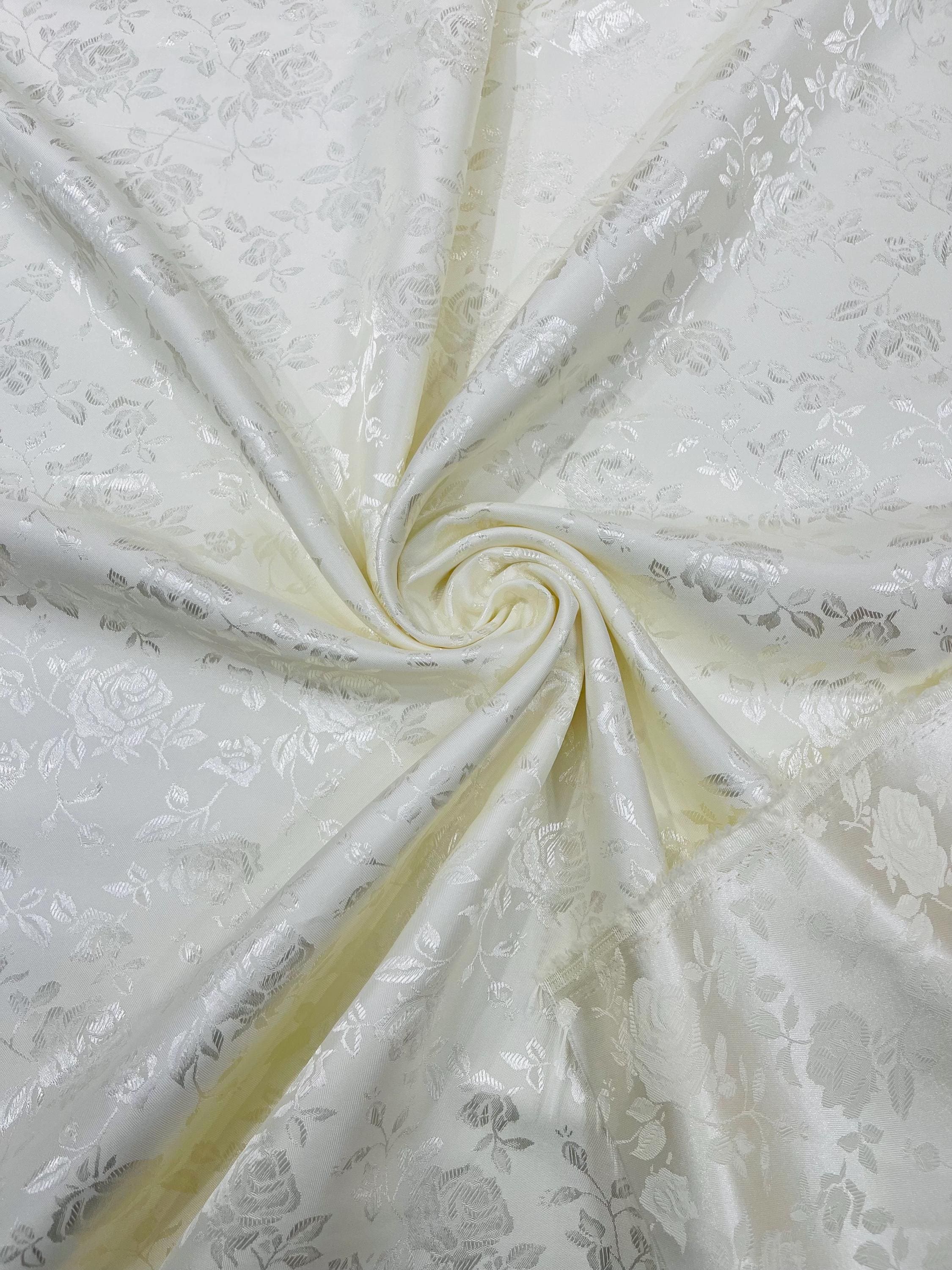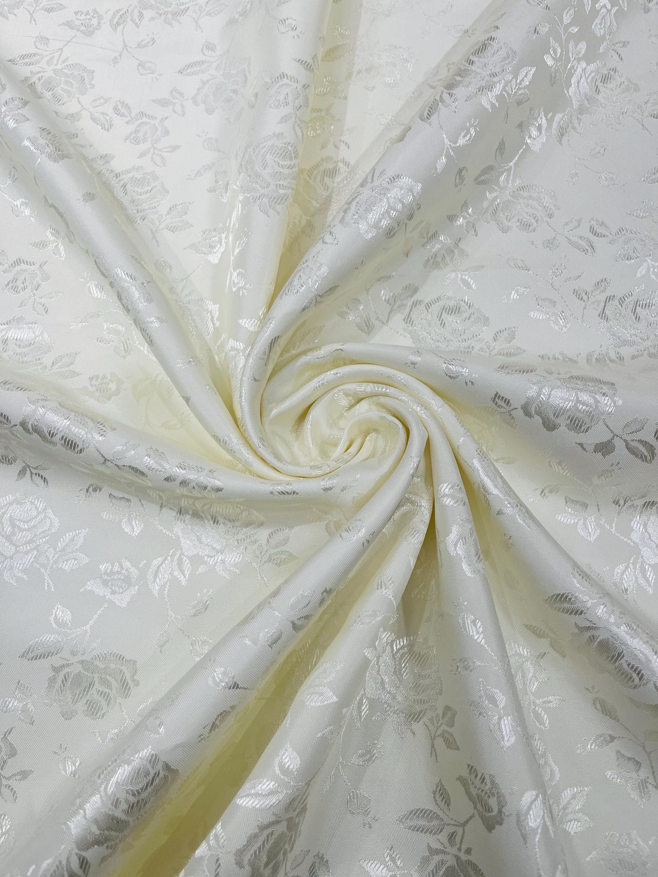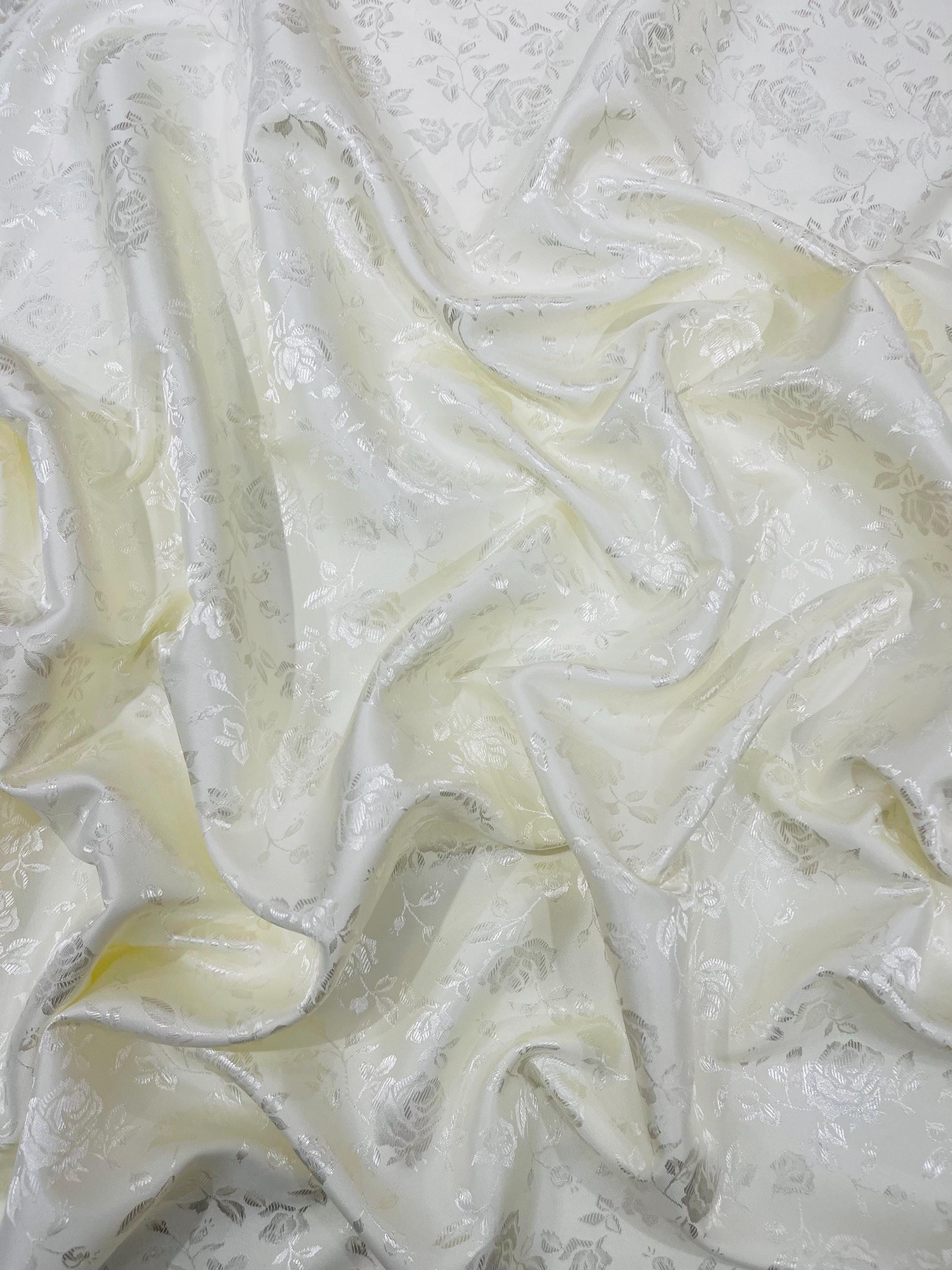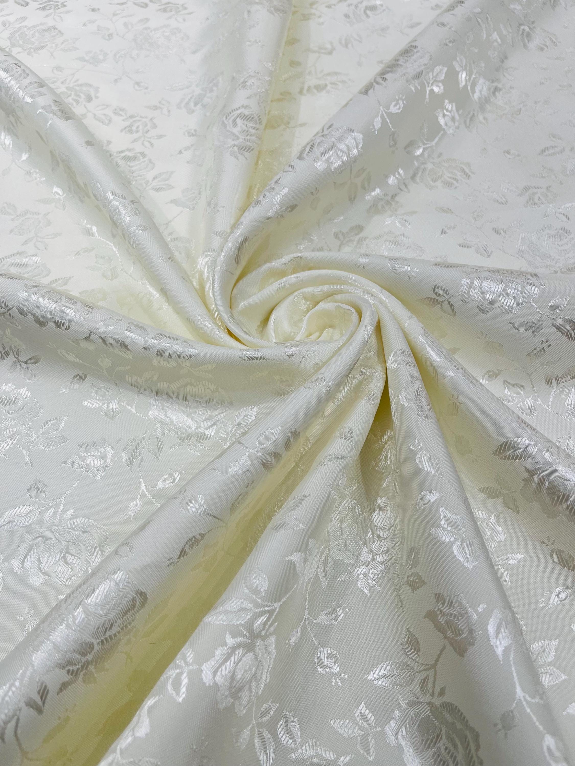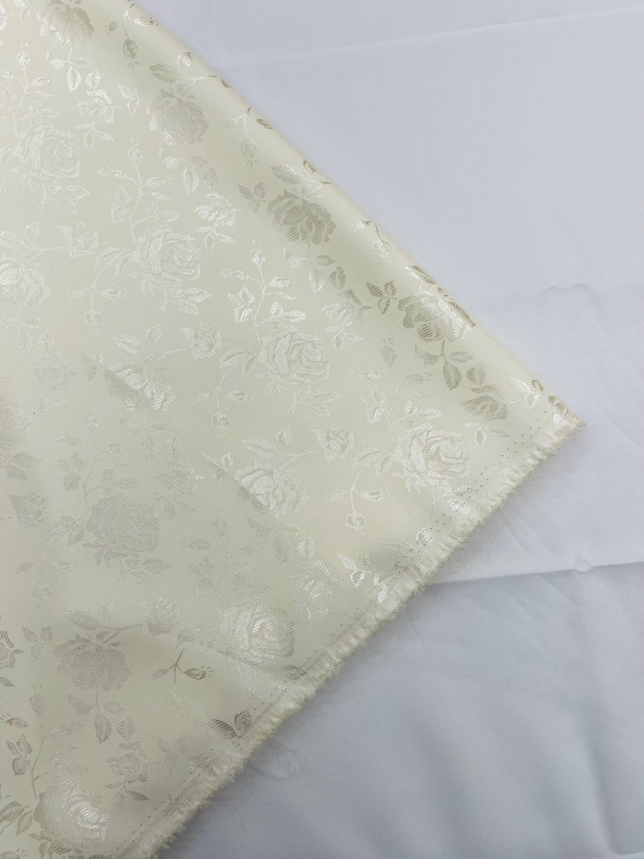 The subtle beauty of the floral pattern stitched into this fabric grows more apparent the closer you look. The fabric has a slight shine, but the pattern is stitched with a matte thread producing a very unique effect as it moves through the light. Note that the flower images are slightly different for each color (all are lovely) and since it is a brocade, the pattern is visible on both sides.