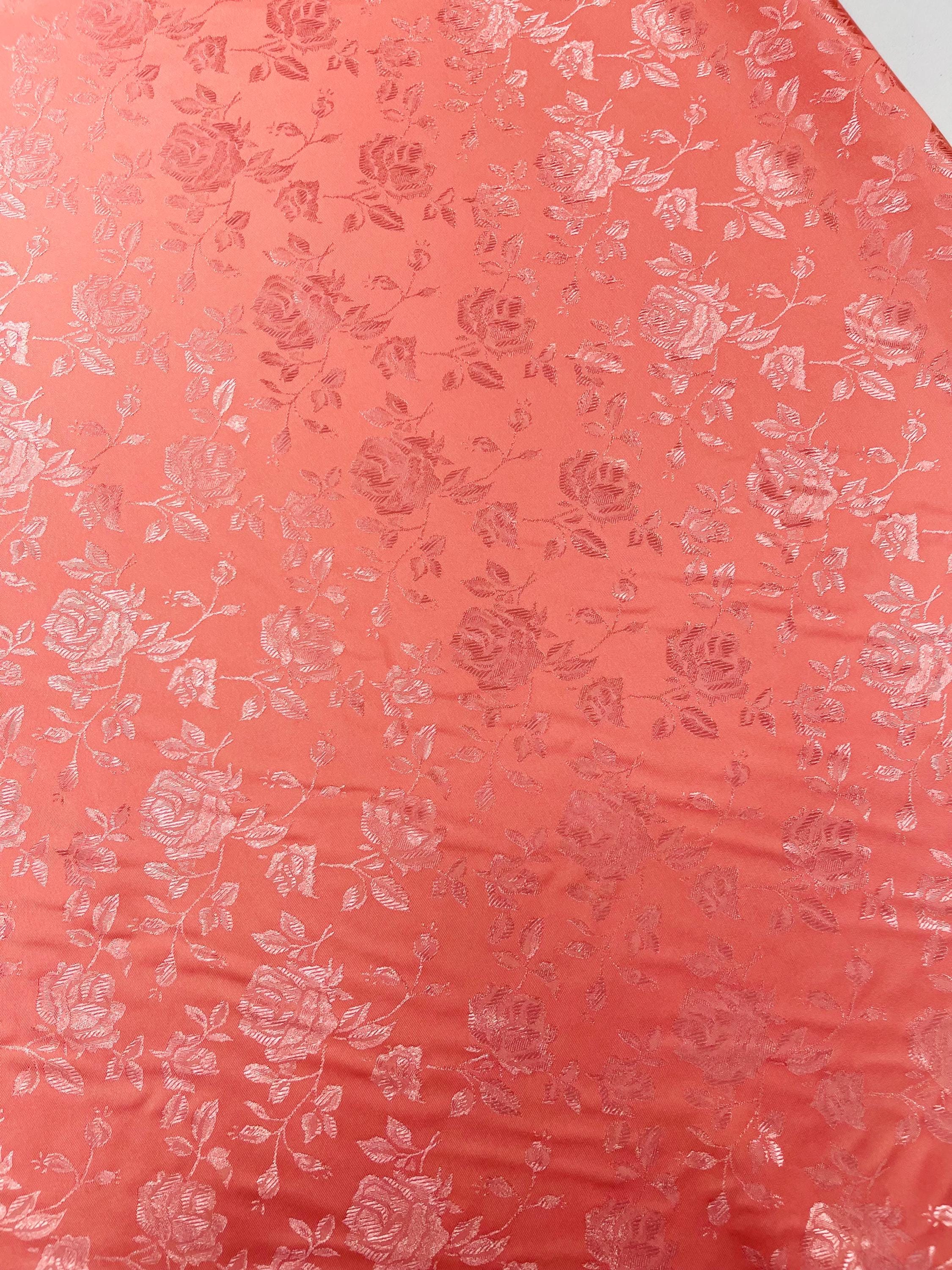 The subtle beauty of the floral pattern stitched into this fabric grows more apparent the closer you look. The fabric has a slight shine, but the pattern is stitched with a matte thread producing a very unique effect as it moves through the light. Note that the flower images are slightly different for each color (all are lovely) and since it is a brocade, the pattern is visible on both sides.