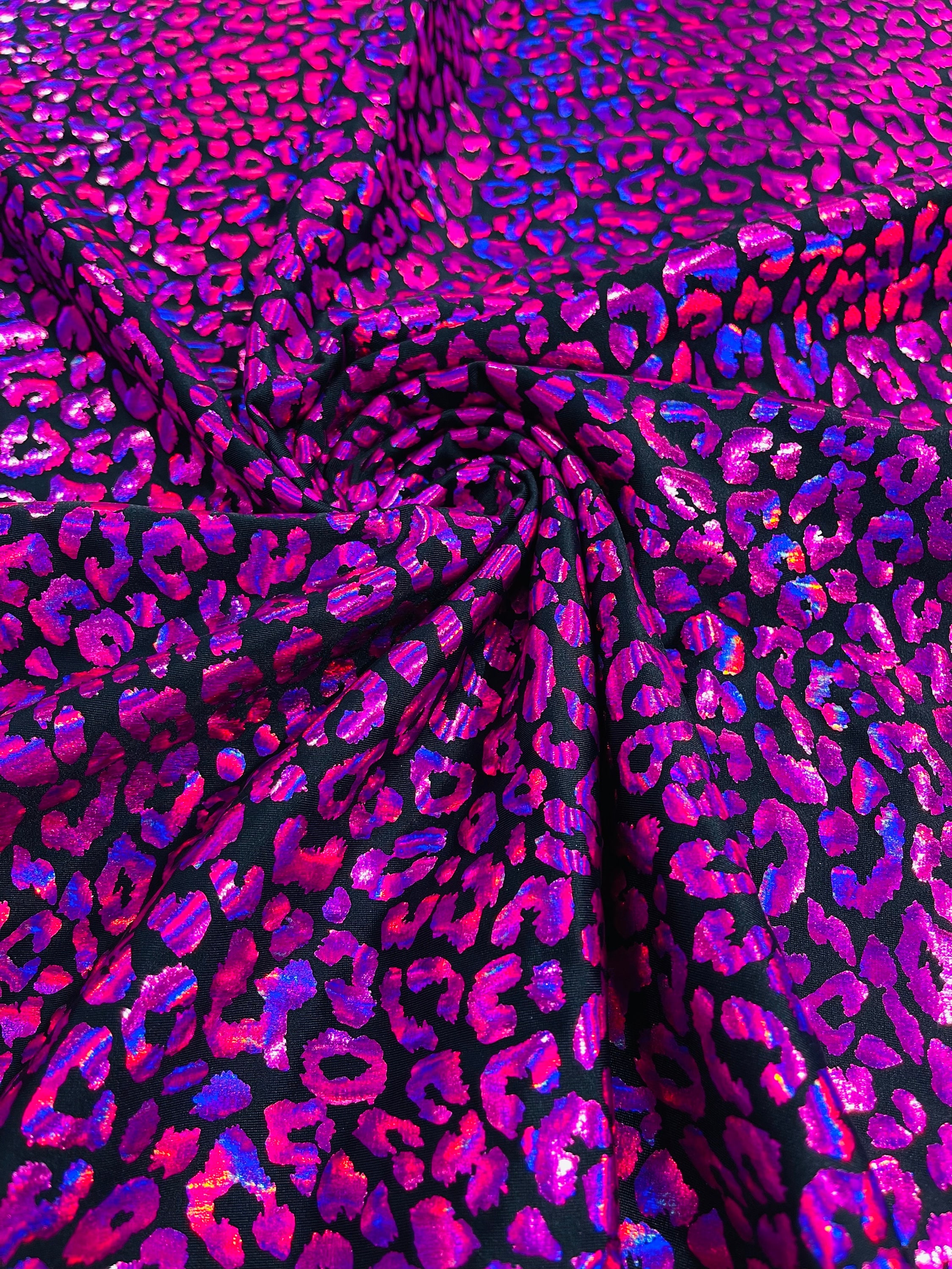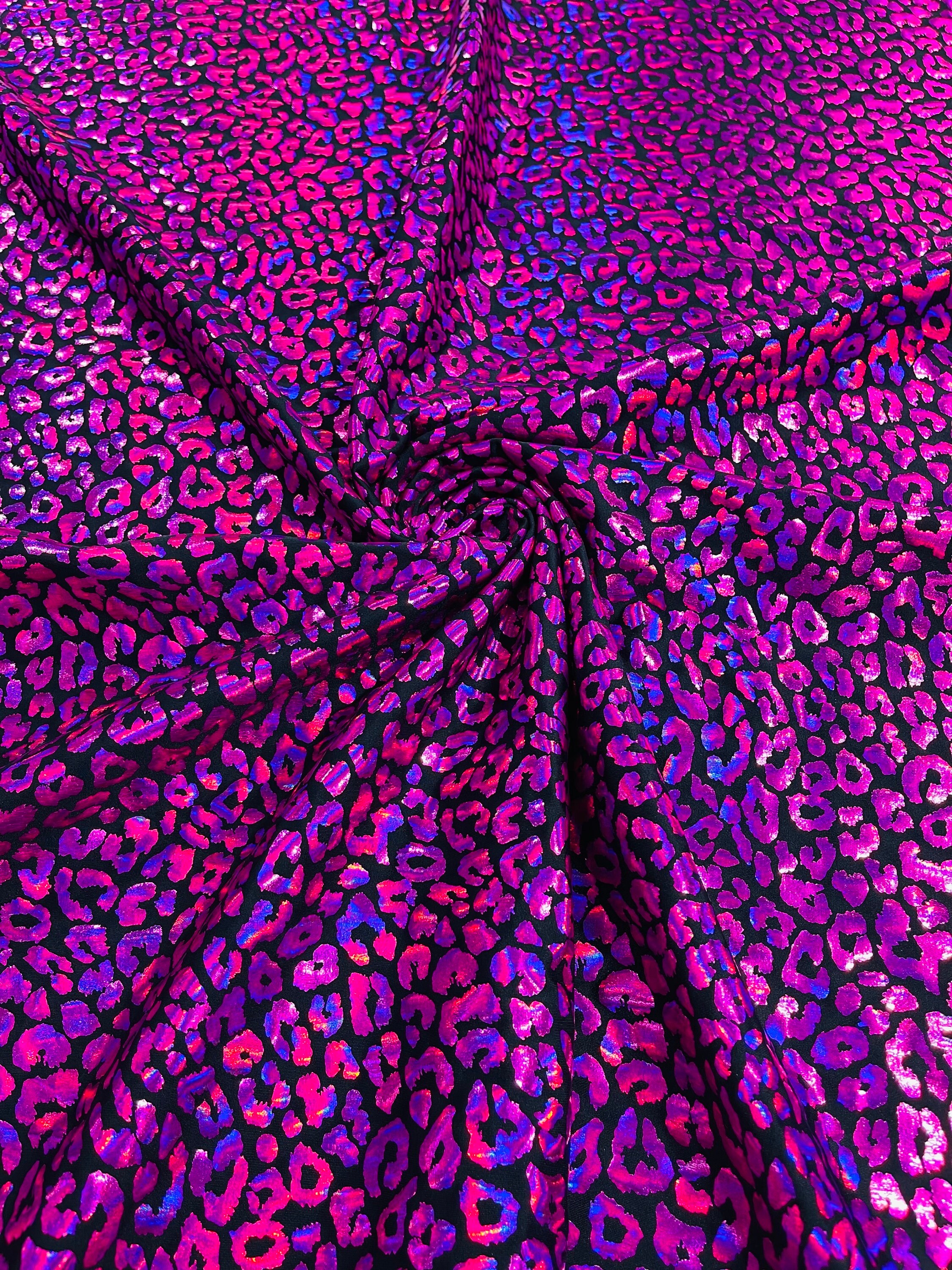 Leopard Design Mystique Nylon Spandex Hologram Metallic, Print Leopard Foil 4 Way Stretch 58/60” Sold By The Yard