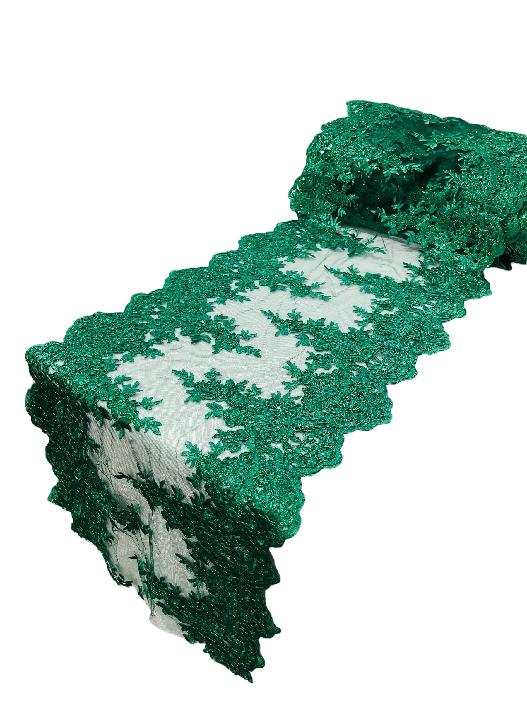 Hunter Green Metallic Floral Lace Fabric: Sequined Embroidery, 15" Wide
