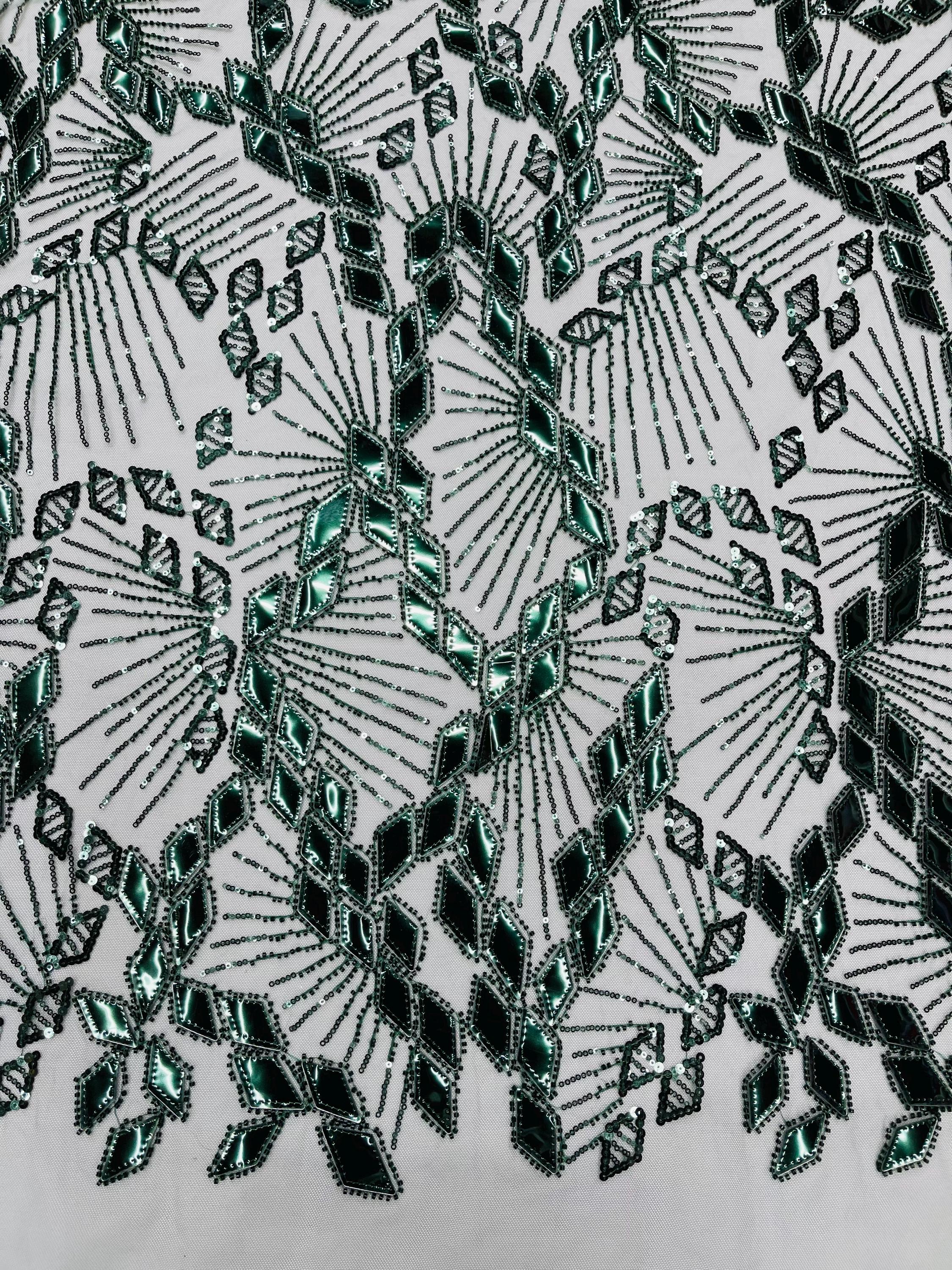Hunter Green Sequins Fabric, Embroidered Sequin Beaded Fabric By The Yard, Geometric Design Beaded Sequins on a Mesh For Wedding/Bridal/Prom