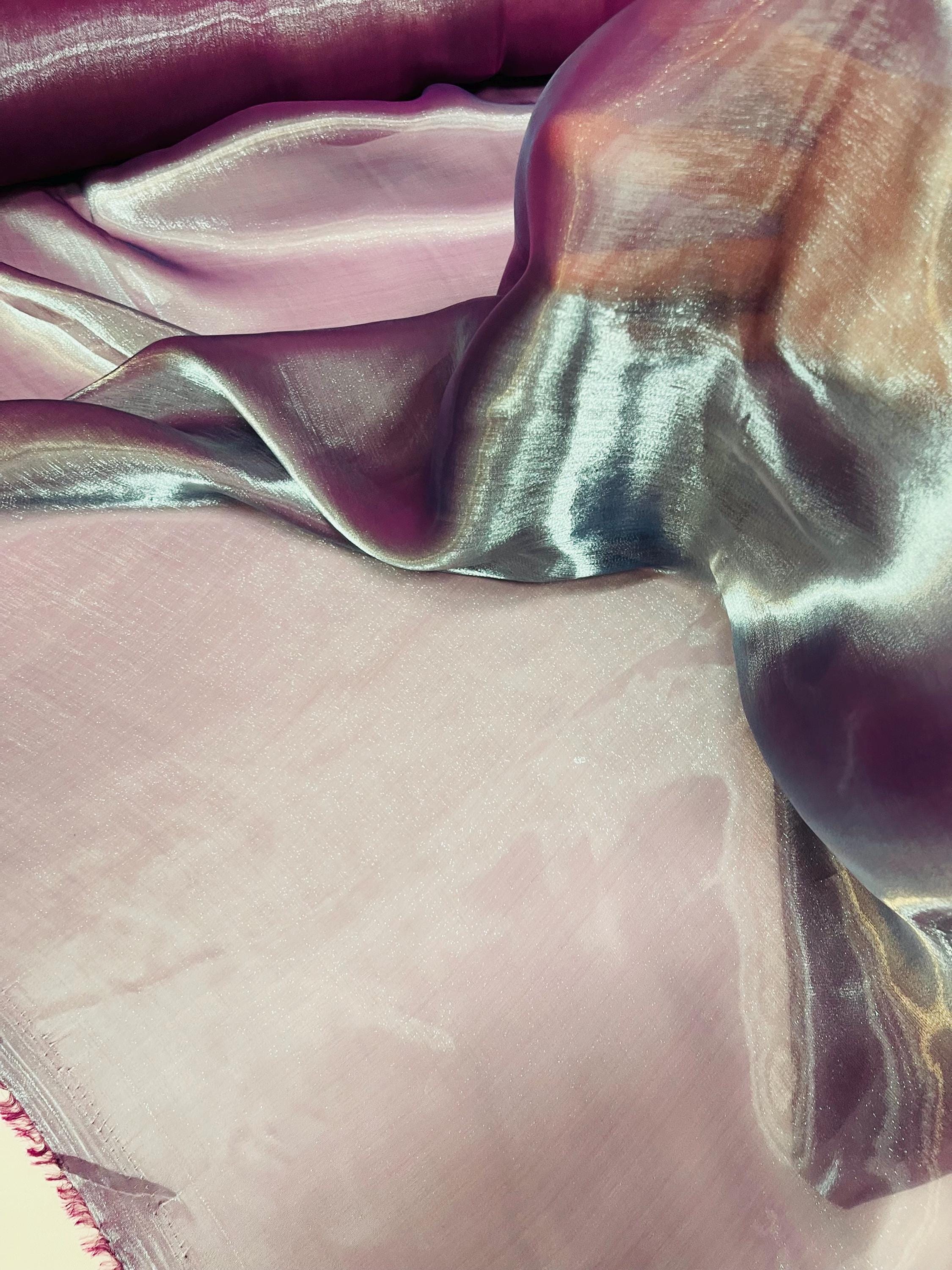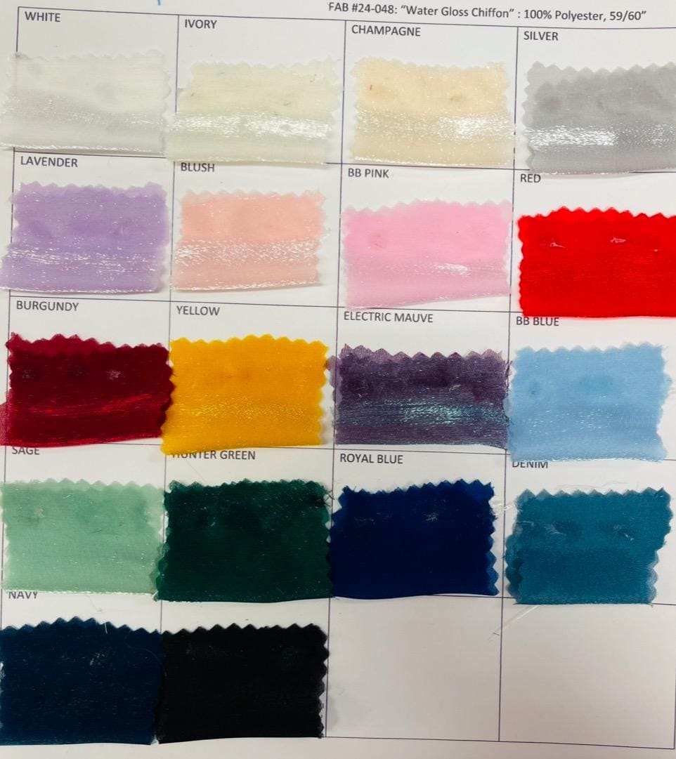 Water gloss chiffon, also known as liquid chiffon, is a luxurious and lightweight fabric characterized by its smooth, fluid drape and subtle sheen. This semi-sheer material combines the delicate, airy qualities of traditional chiffon with a glossy finish, giving it an elegant and sophisticated appearance. It is made from 100% polyester , but has a very silky feel to it. The fabric has a soft, almost liquid-like feel, with a natural flow that makes it ideal for creating flowing dresses, evening gowns, scarves, and other garments where movement and fluidity are desired. Water gloss chiffon is popular in high-fashion and formal wear due to its ability to catch and reflect light beautifully, adding a touch of glamour to any design. Its versatility allows for both structured and loose silhouettes, making it suitable for a wide range of styles.