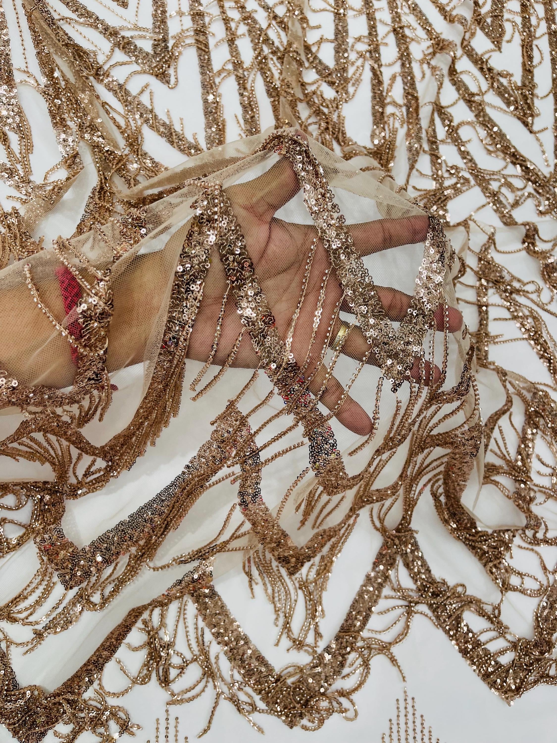 Rose Gold Fringe Beaded Fabric By Yard, Geometric Design Beaded Fringe Sequin, Fringe Beaded Fabric Embroidered on a Mesh Lace Prom Dress
