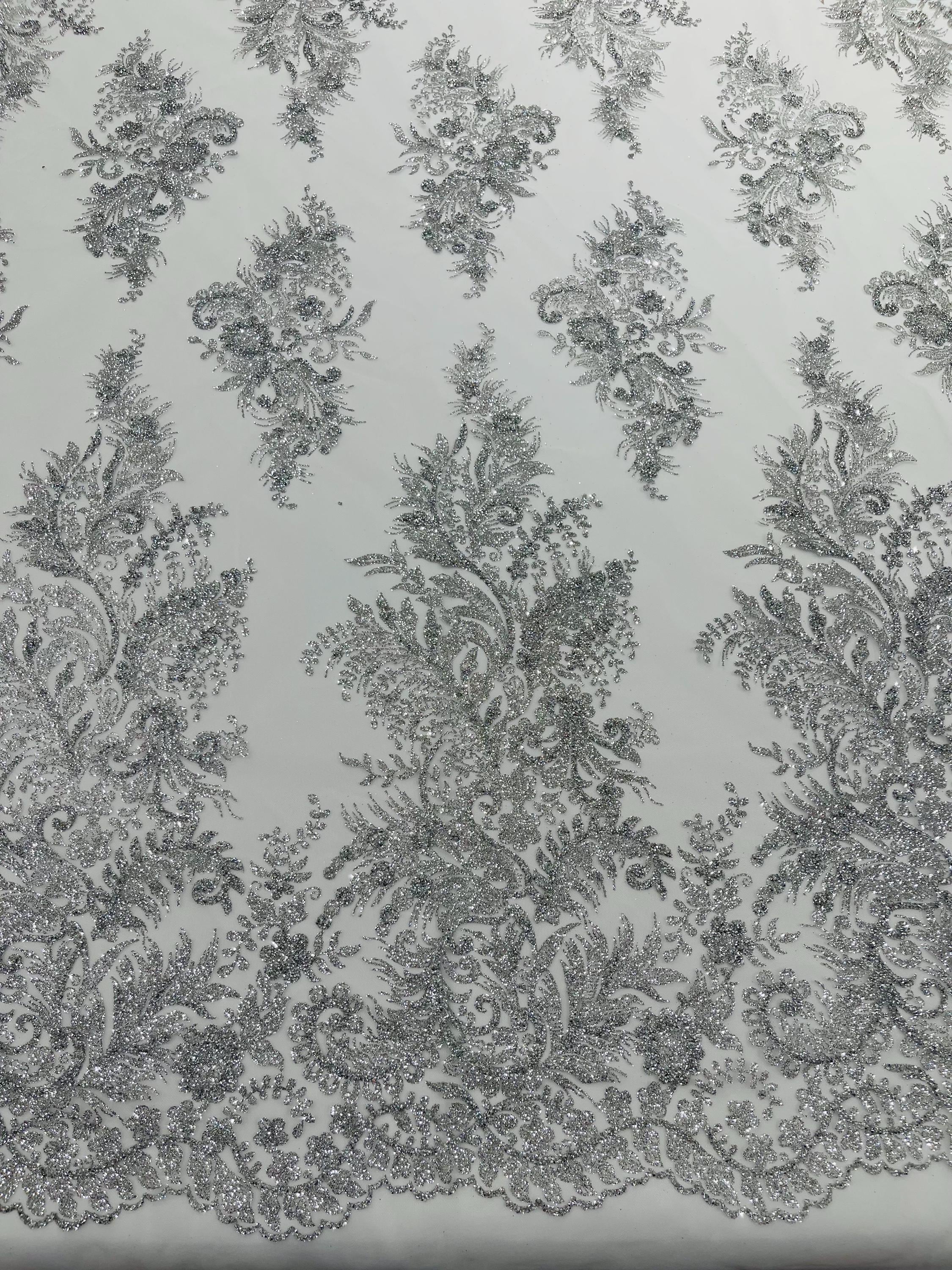 Silver Silver Rhinestones Glitter Fabric on a Mesh By The Yard | Quinceañera Design Glitter Rhinestones on Mesh Fabric Prom Dress