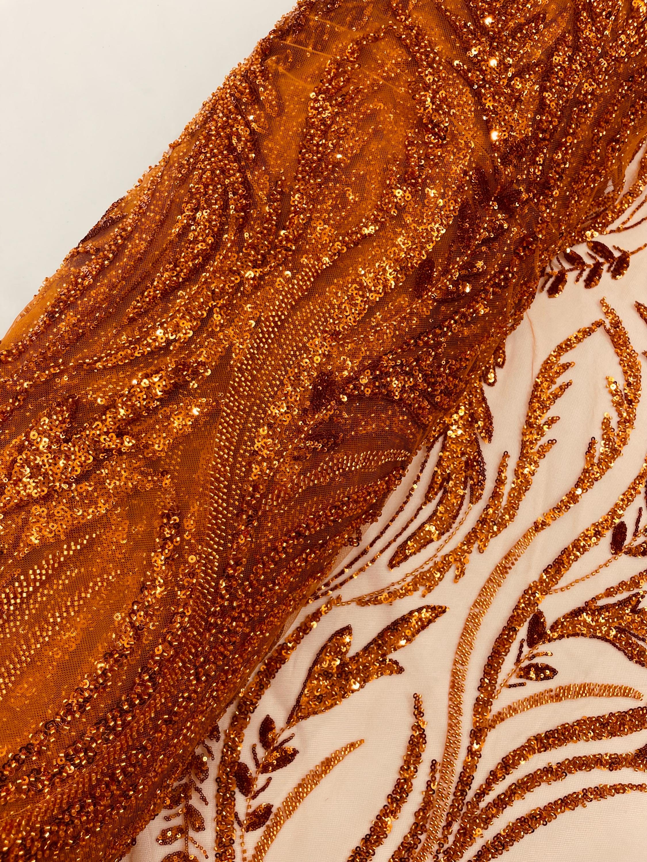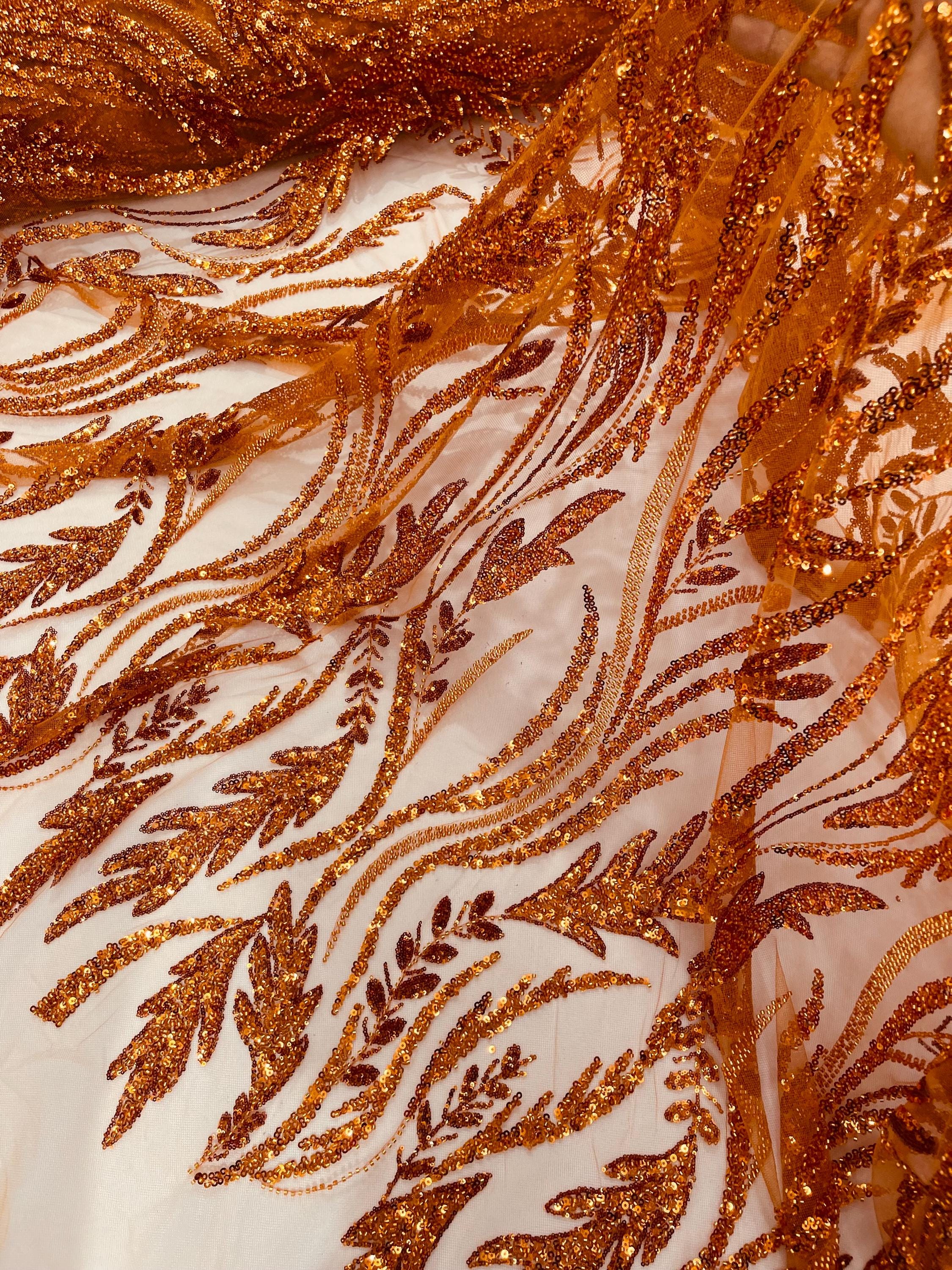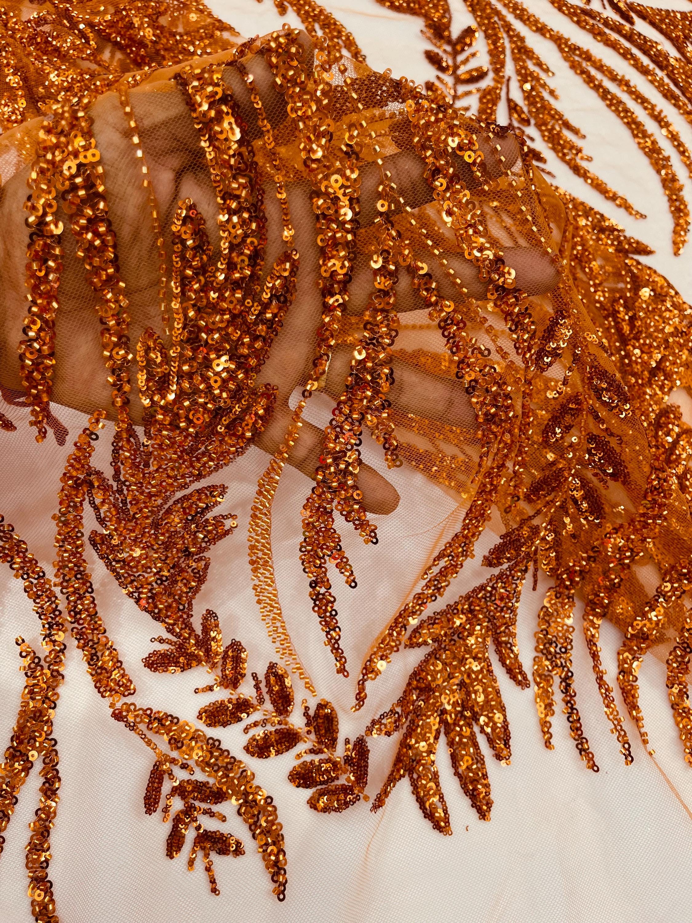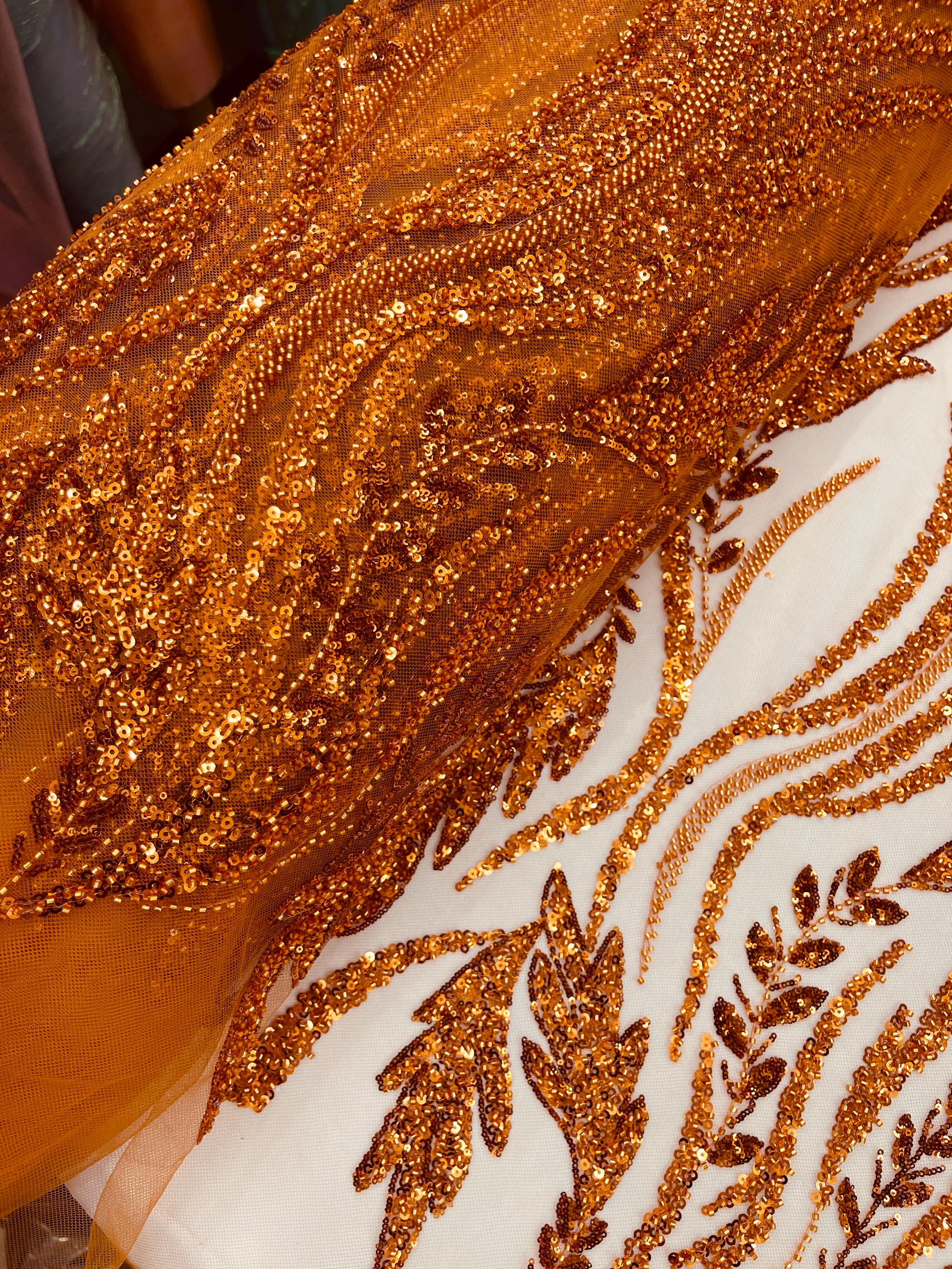 The beautiful design includes embroidered wavy plants patterns with beads across a mesh fabric of great quality. It has a beautiful border on both ends. This lace can be used for dresses, tablecloths, nightgowns, prom gowns, bridesmaid gowns, wedding gowns, table covers/runners, pillows, home /event decorations, and much more.