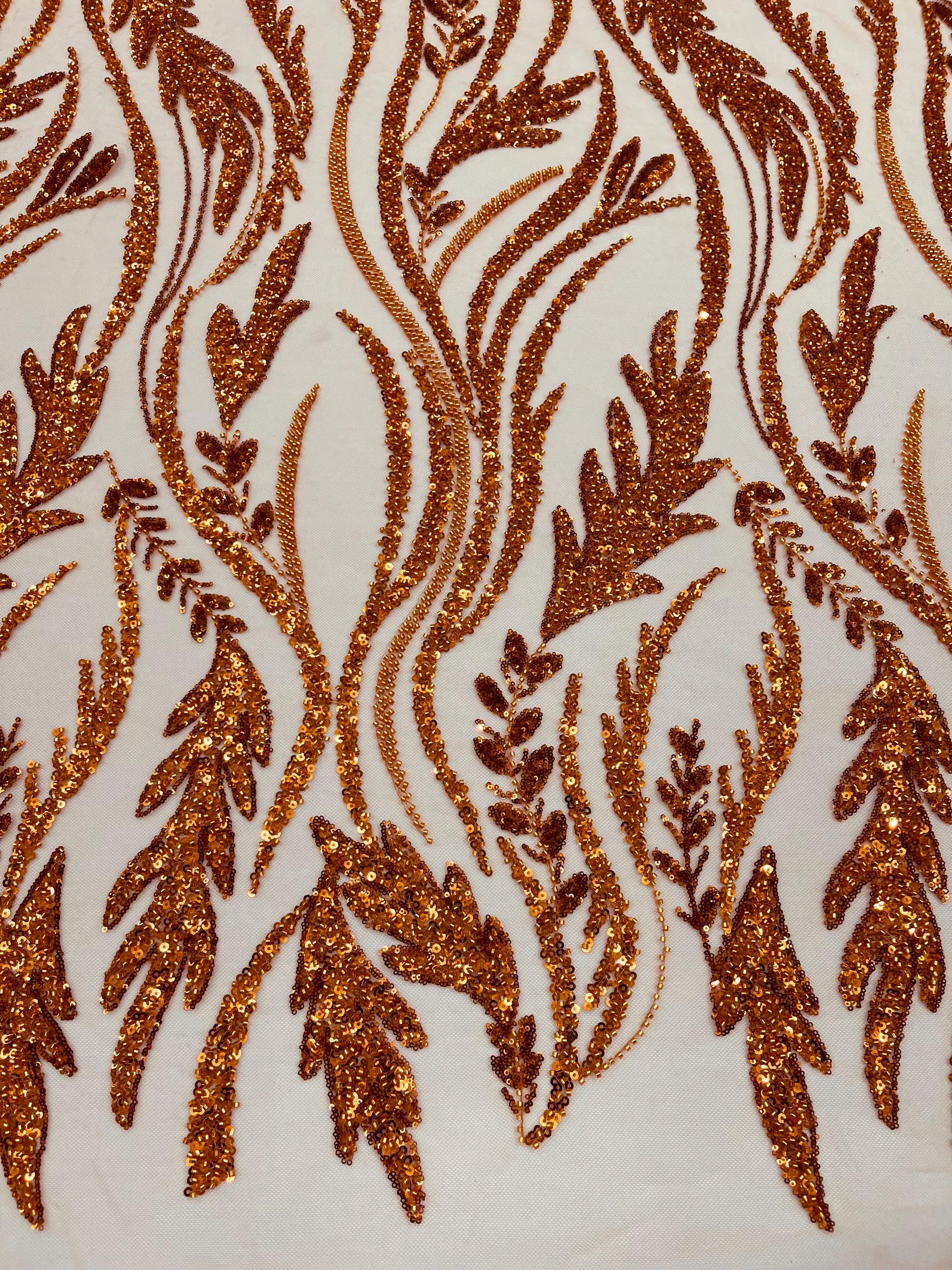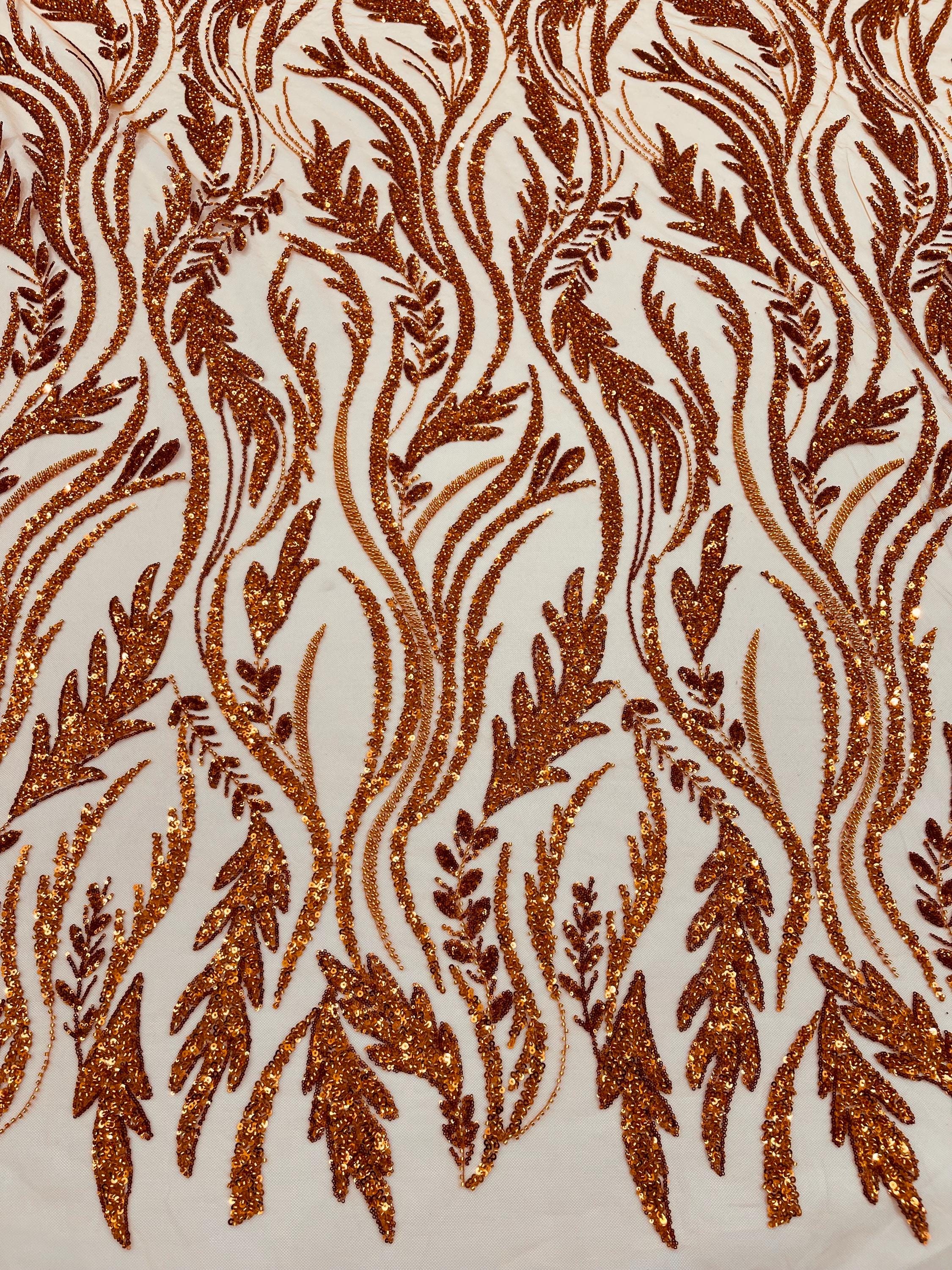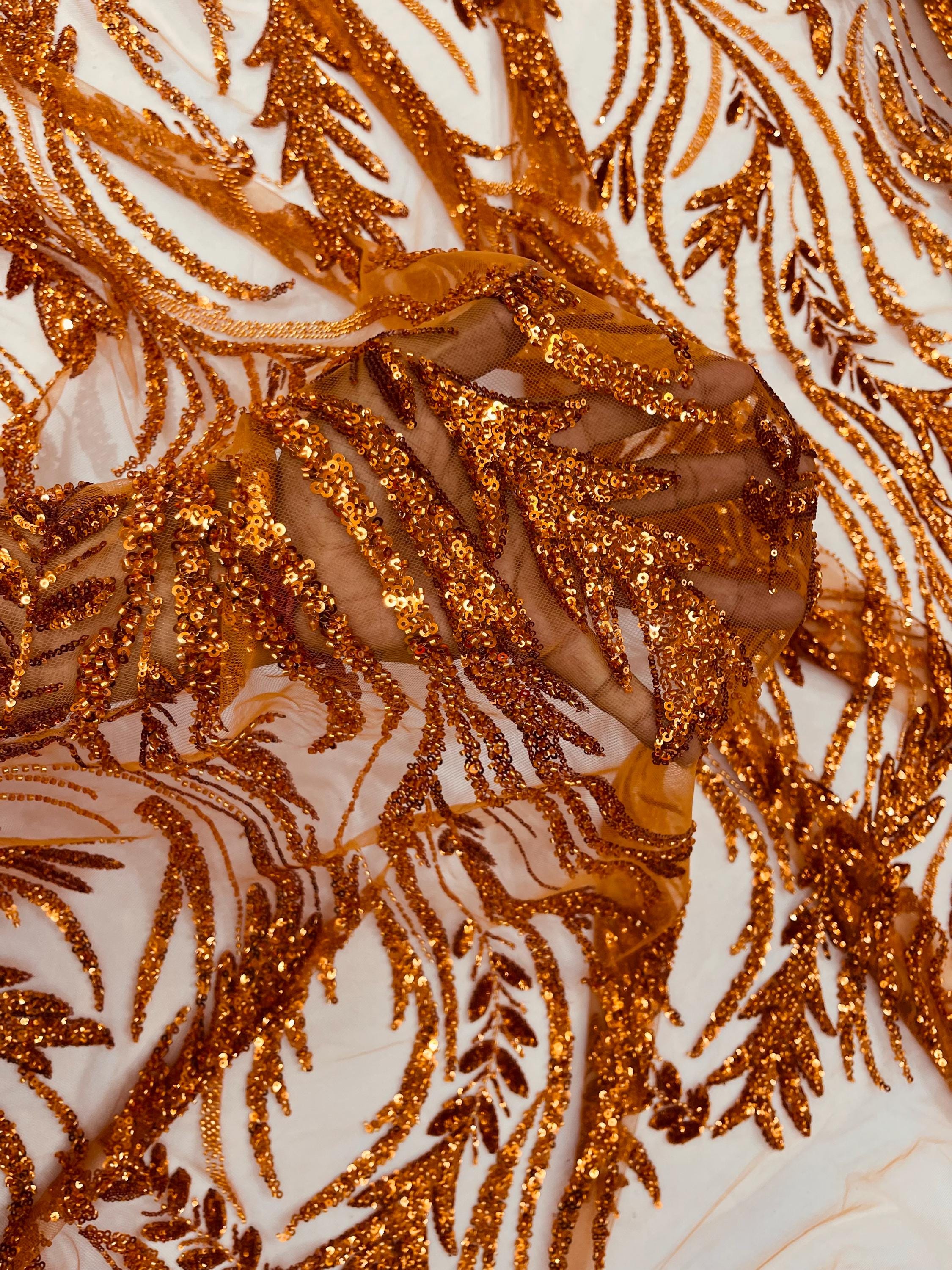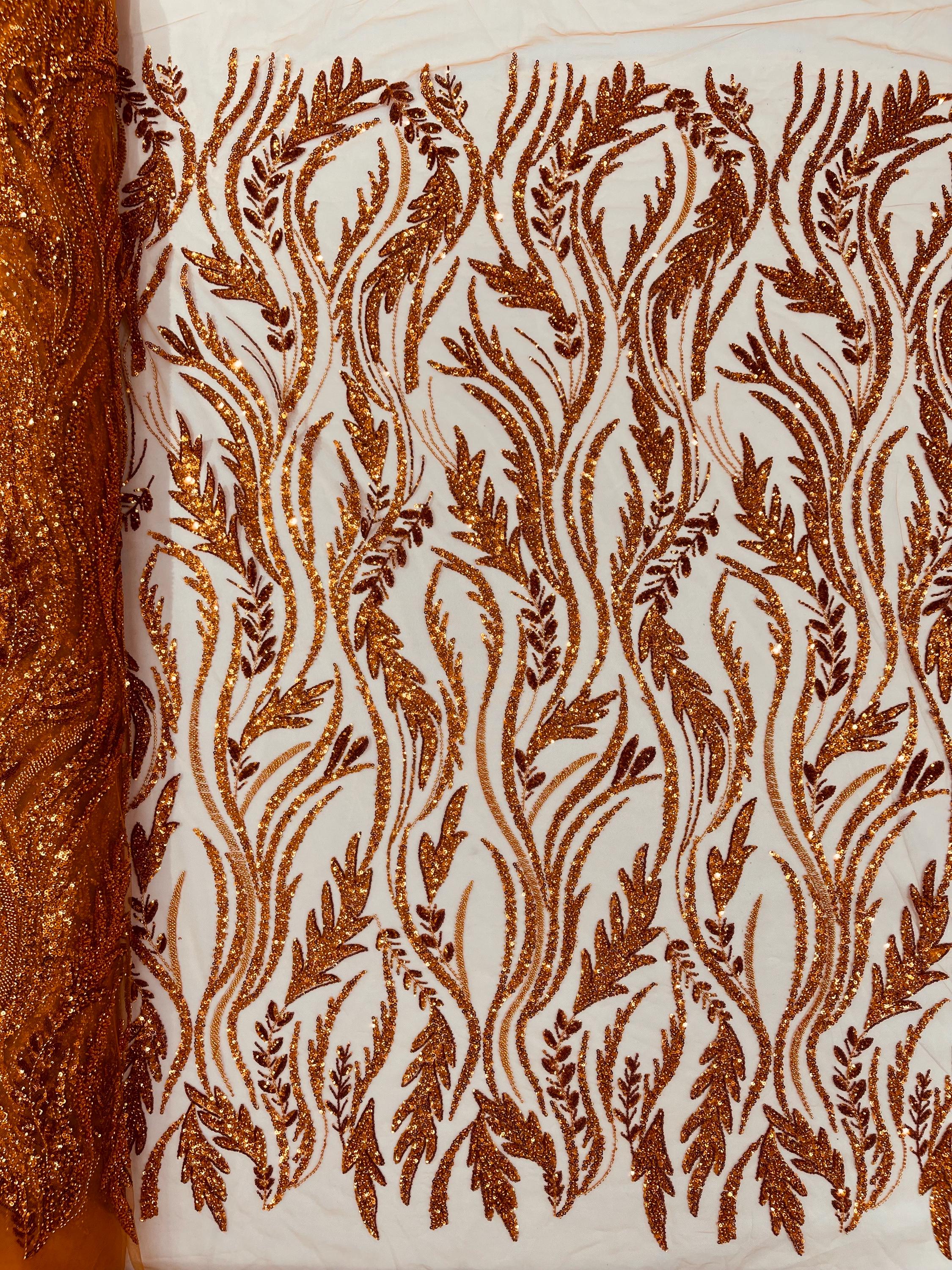 The beautiful design includes embroidered wavy plants patterns with beads across a mesh fabric of great quality. It has a beautiful border on both ends. This lace can be used for dresses, tablecloths, nightgowns, prom gowns, bridesmaid gowns, wedding gowns, table covers/runners, pillows, home /event decorations, and much more.