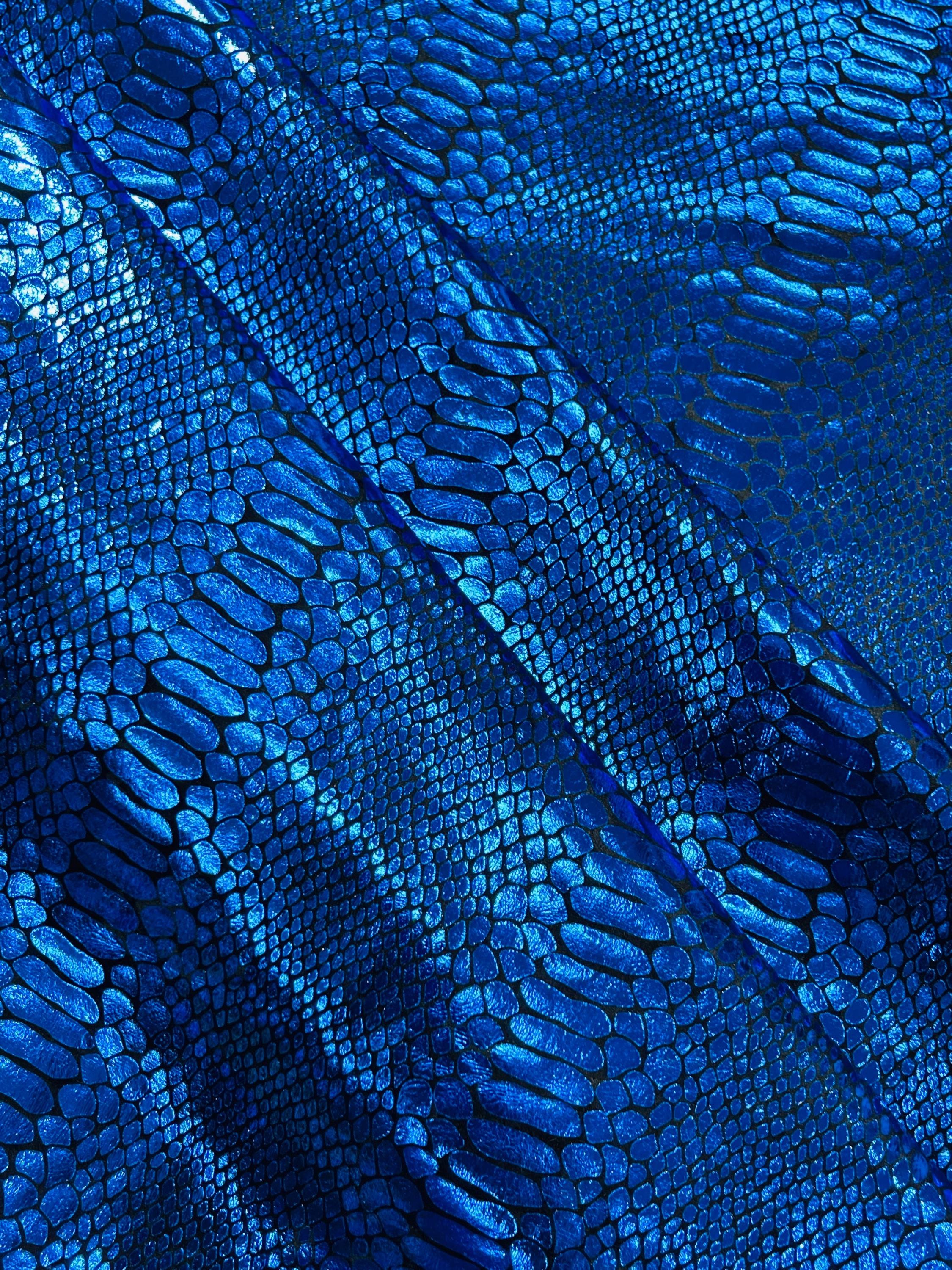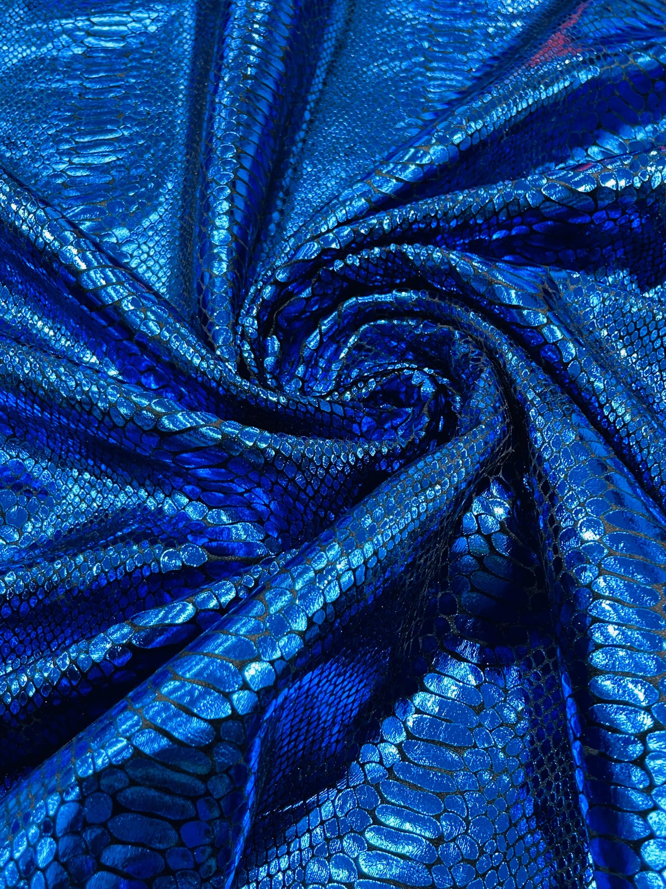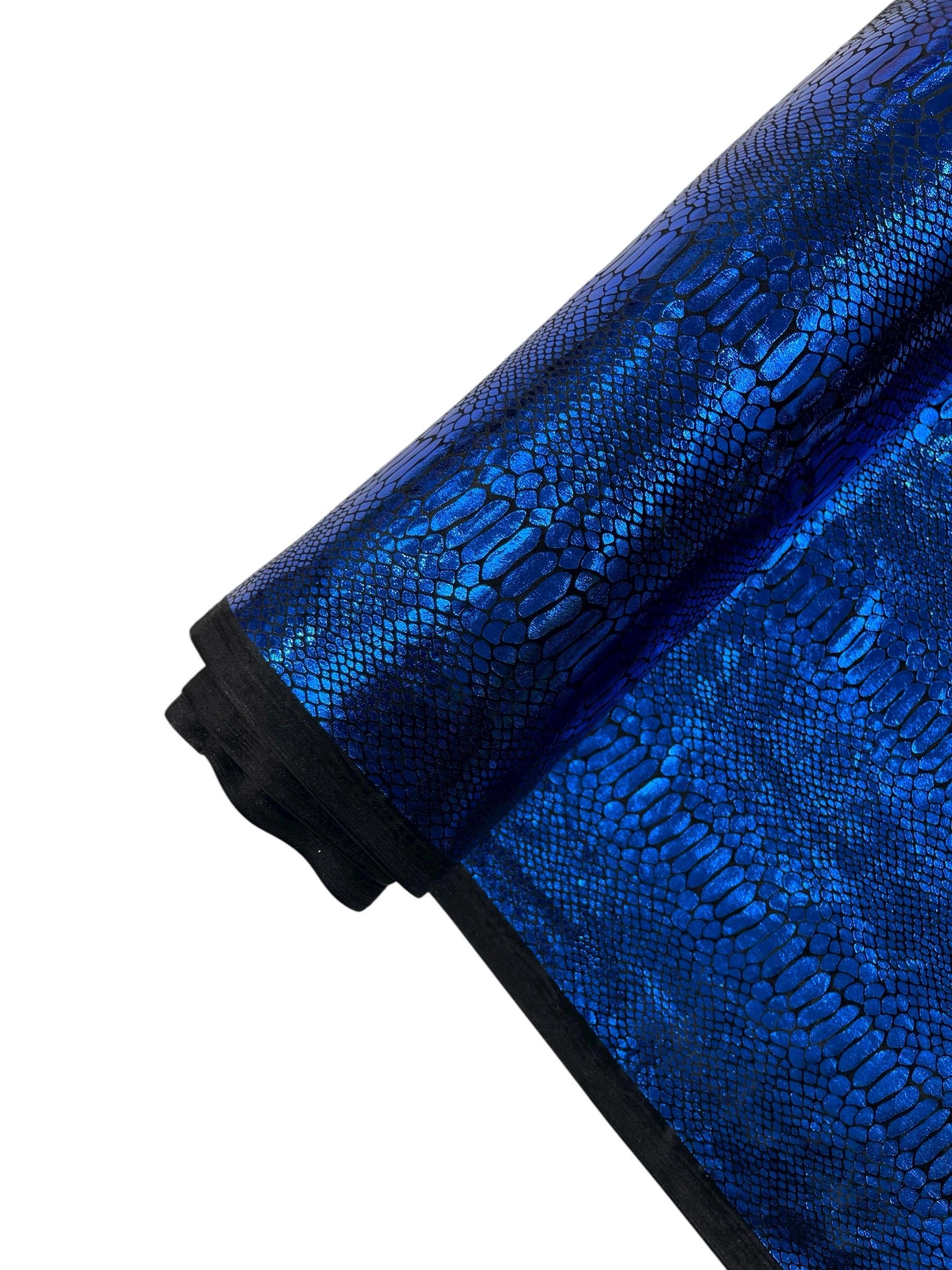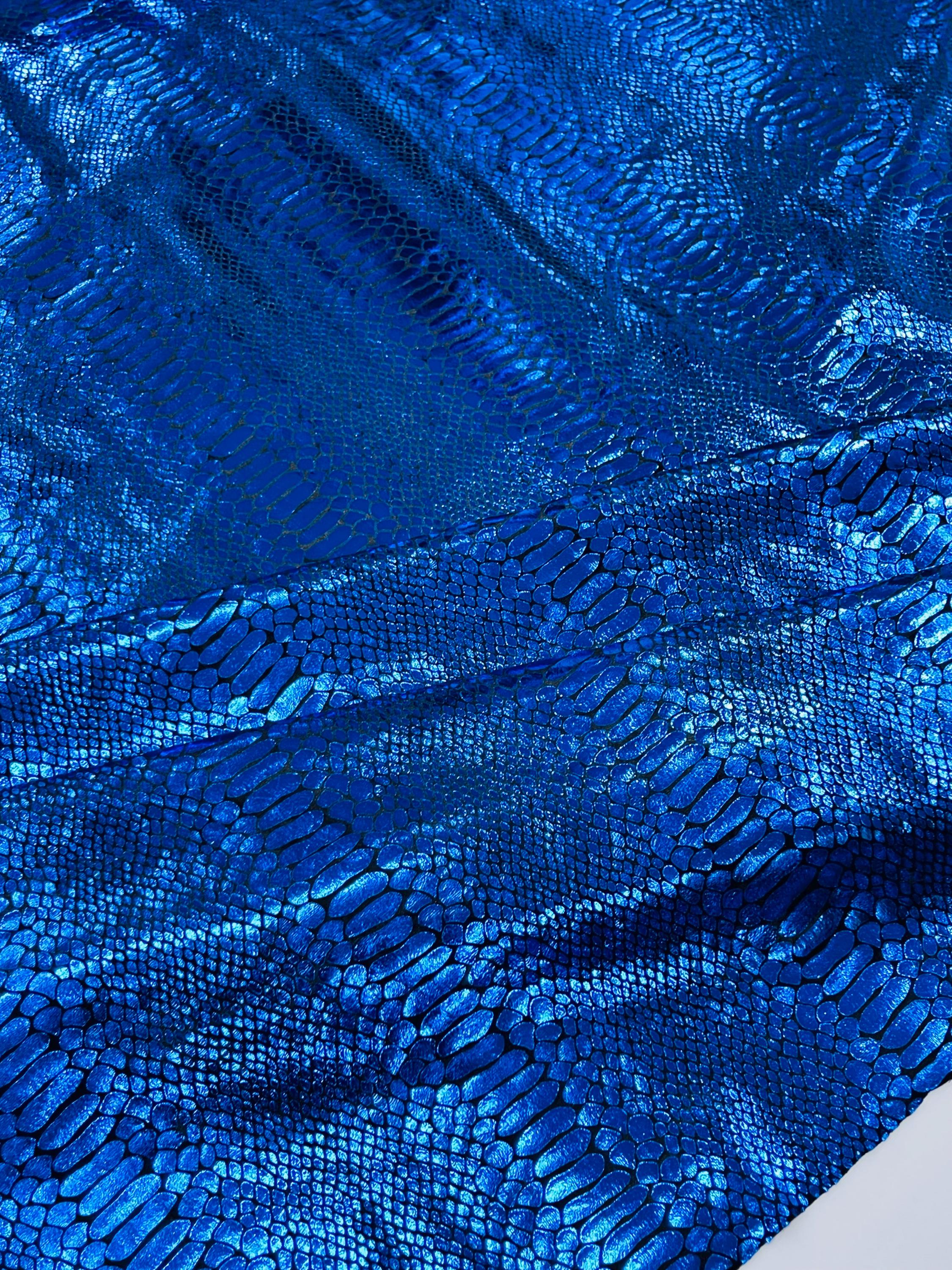 Our Venom Snake Skin Spandex Fabric has an iridescent lame snake print on stretch velvet fabric. Item has a 20% stretch on the grain and has a 10% stretch vertical. If more than one yard is purchased, item will come in one piece. For instance, if you order one yard, you will receive a piece of 58" x 36". If you order two yards, you will receive a piece of 58" x 72", etc.
