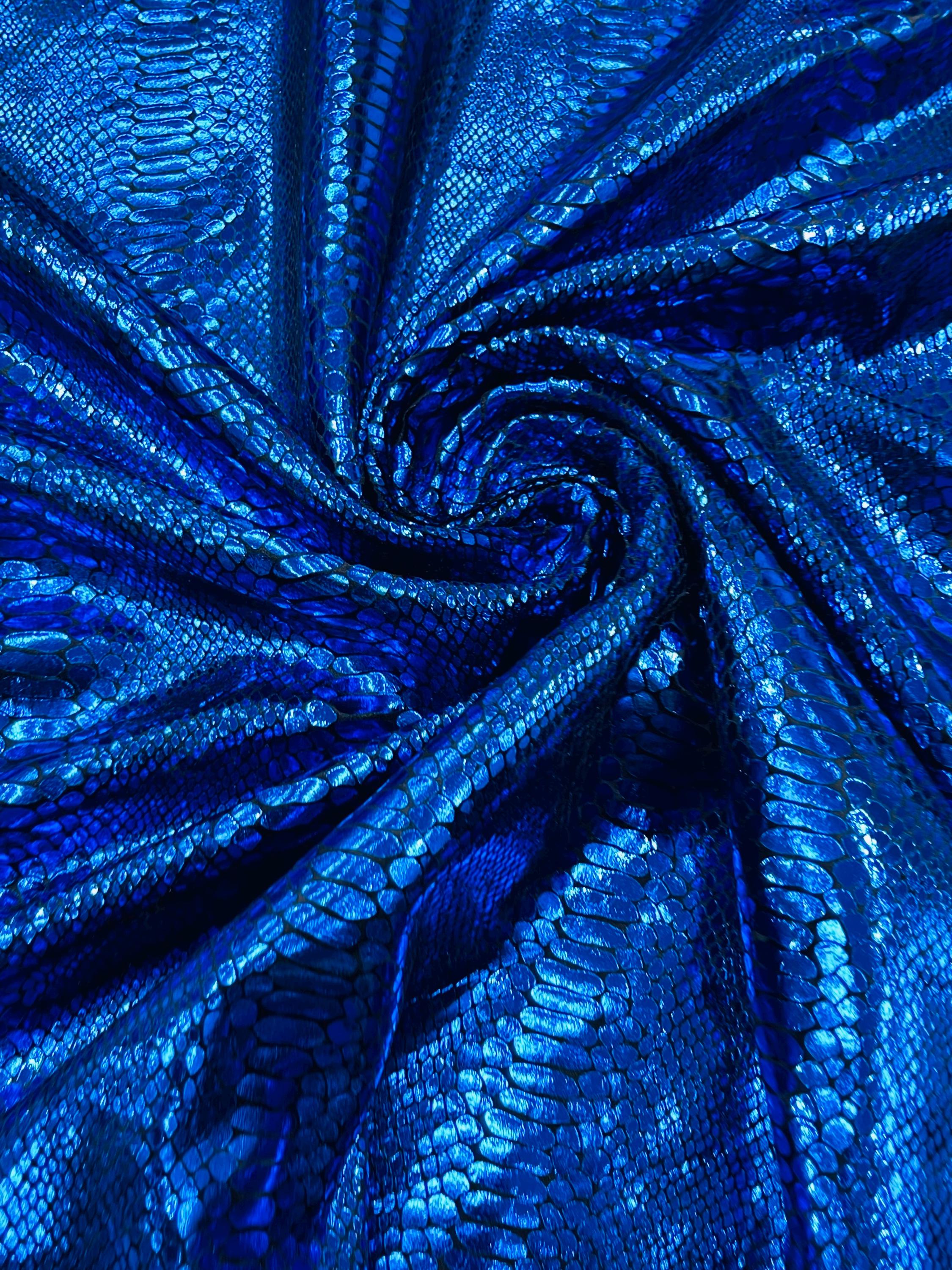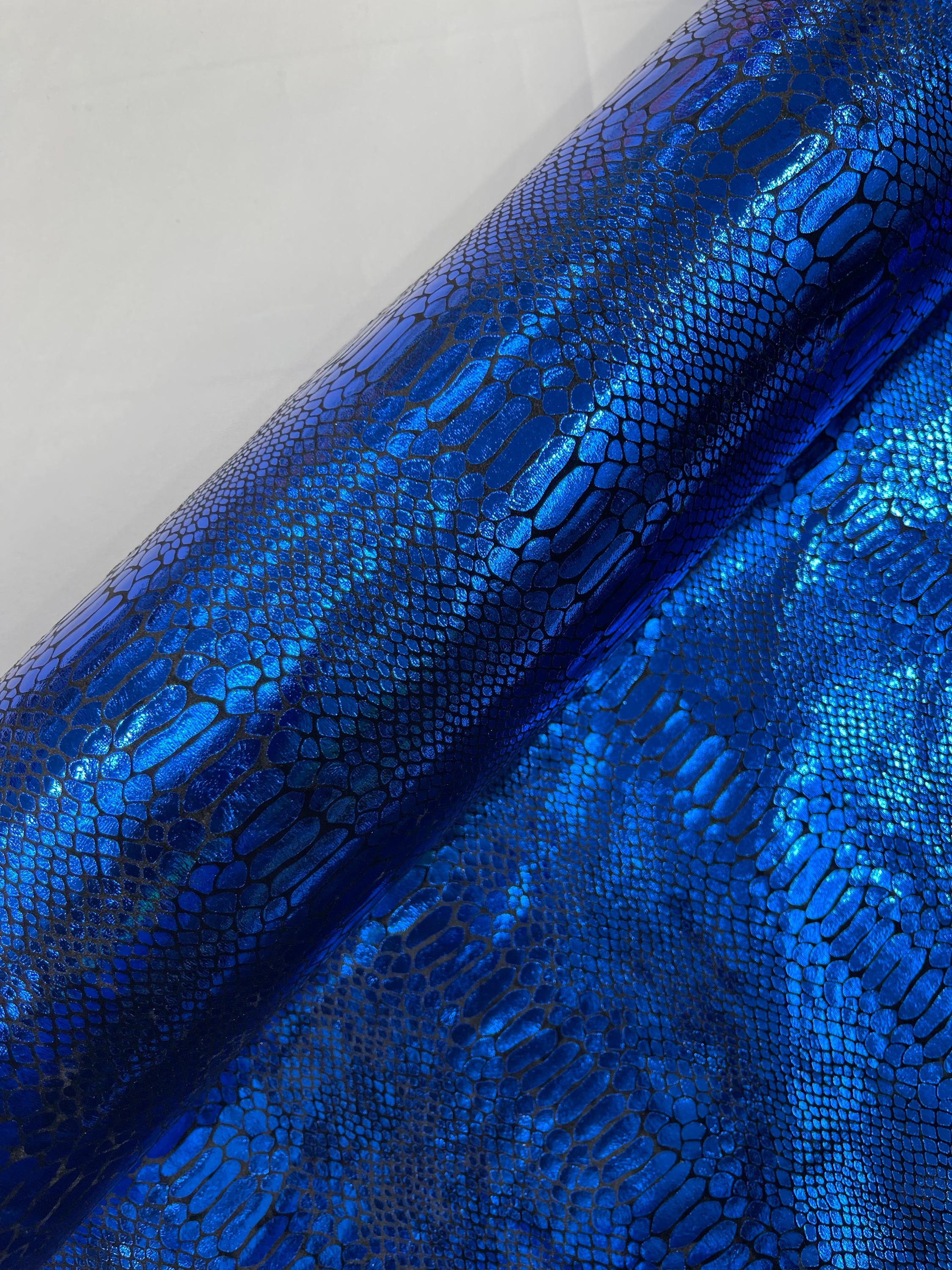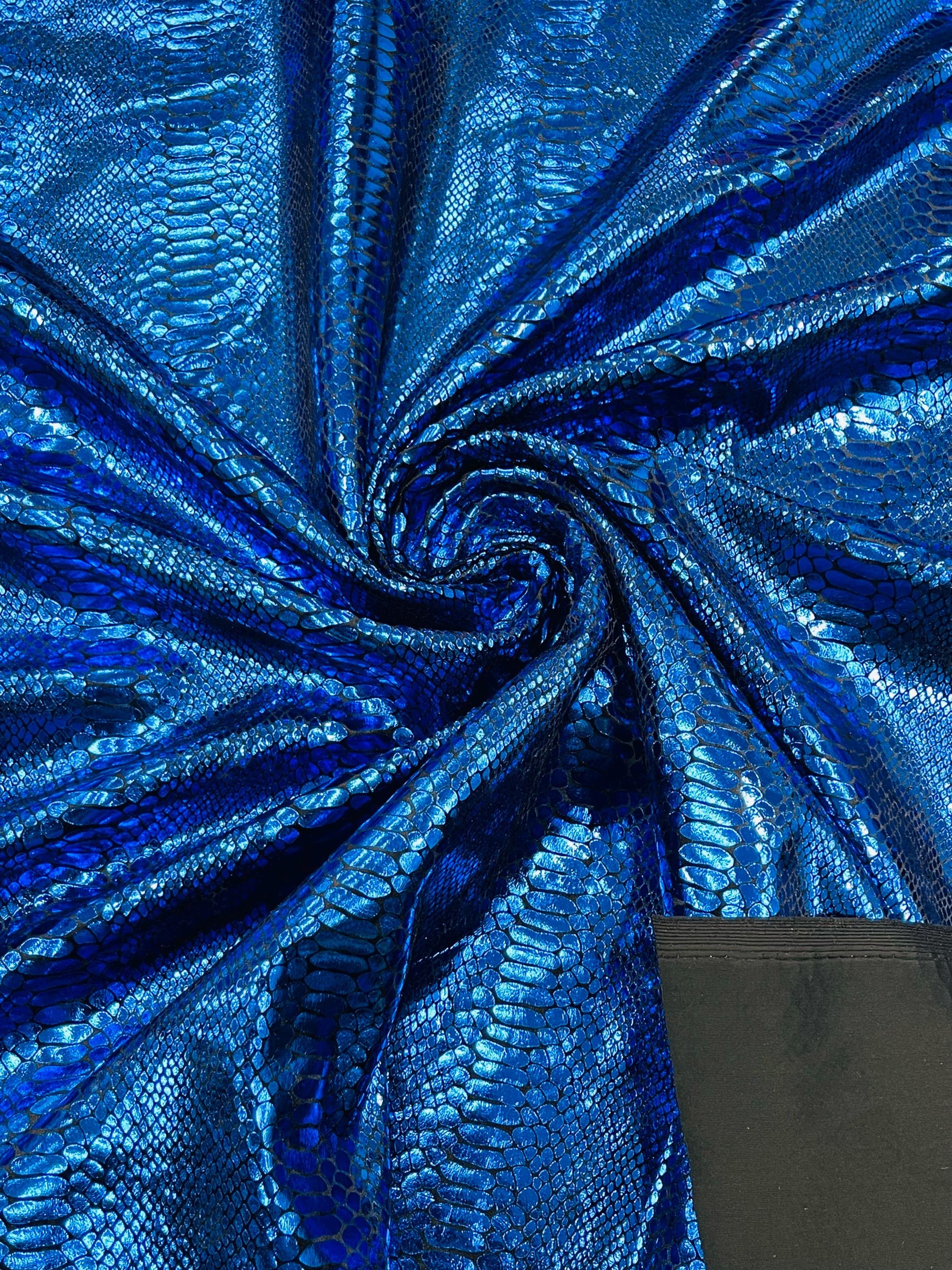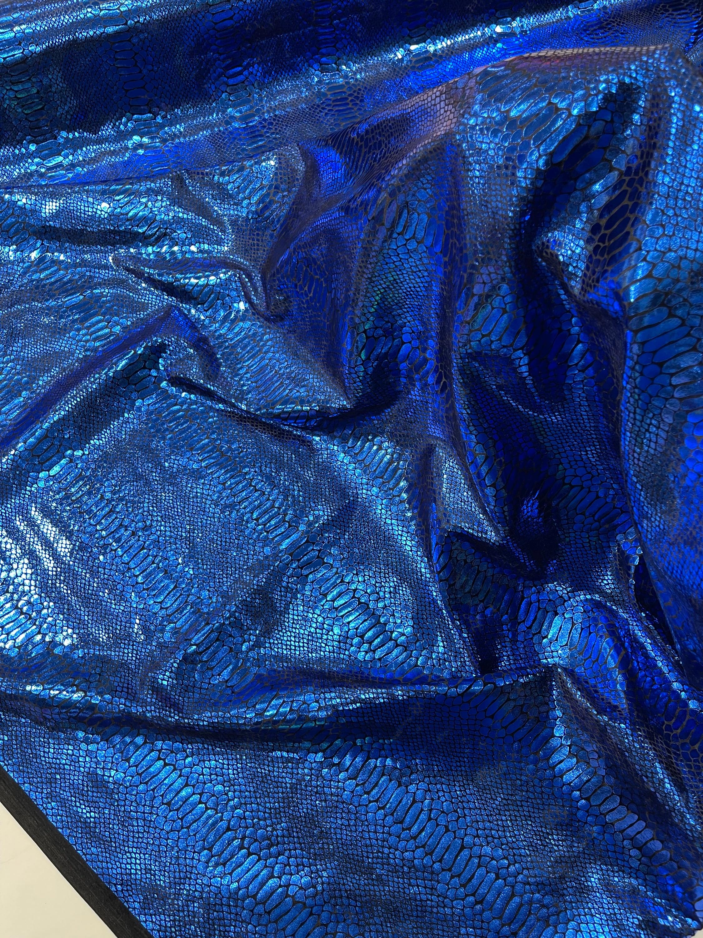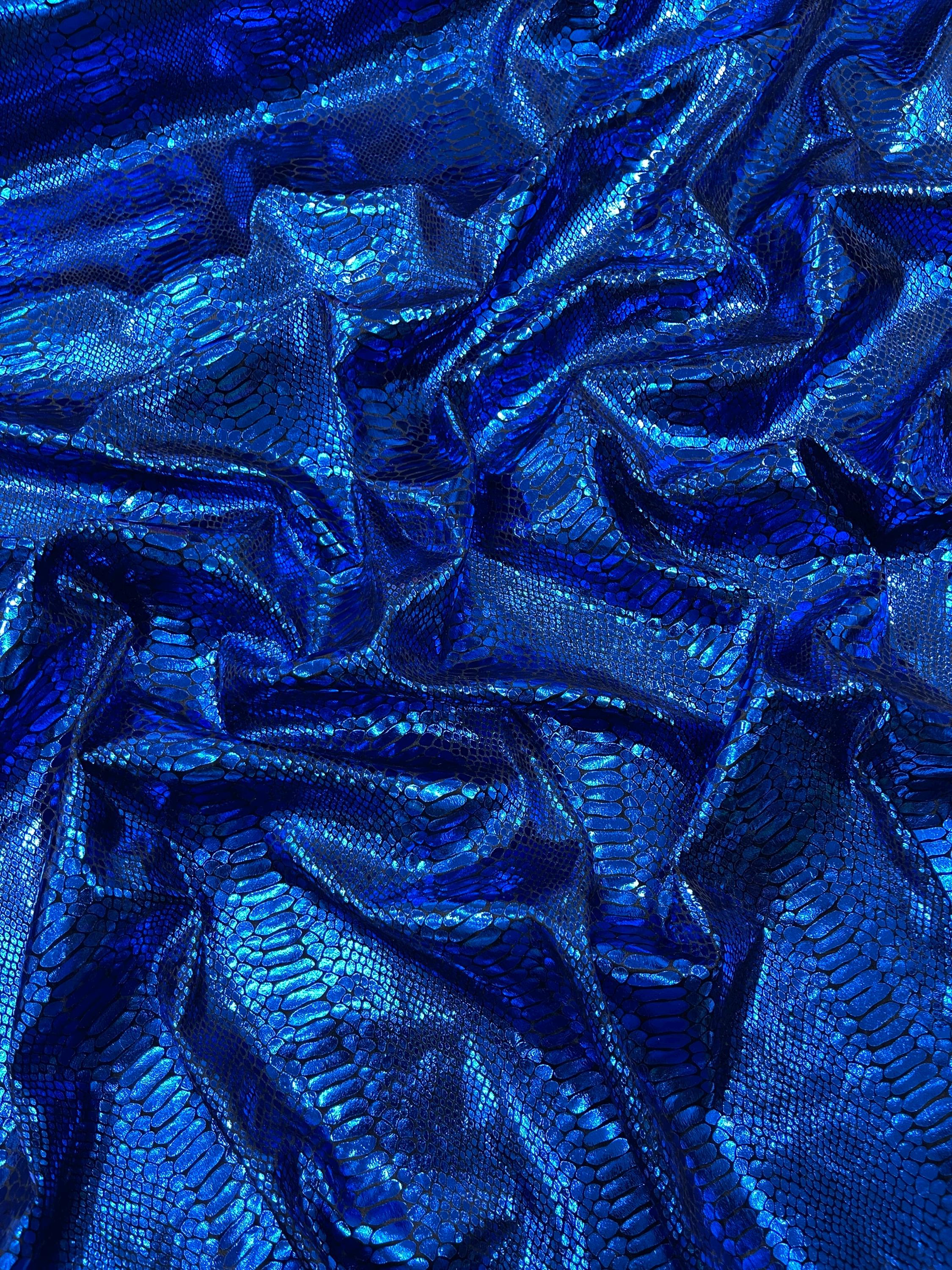 Our Venom Snake Skin Spandex Fabric has an iridescent lame snake print on stretch velvet fabric. Item has a 20% stretch on the grain and has a 10% stretch vertical. If more than one yard is purchased, item will come in one piece. For instance, if you order one yard, you will receive a piece of 58" x 36". If you order two yards, you will receive a piece of 58" x 72", etc.