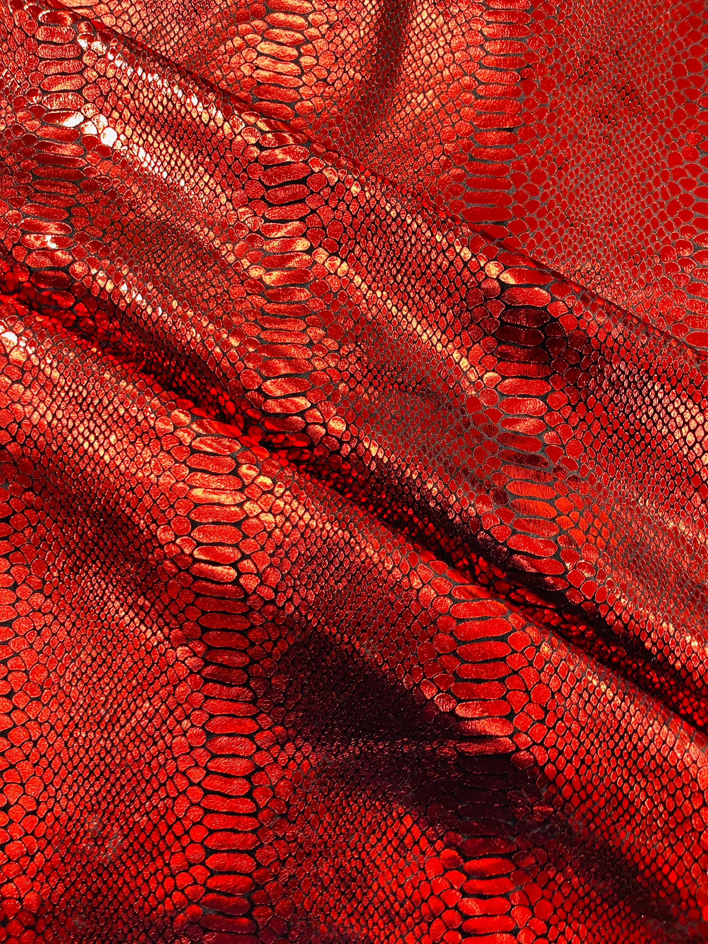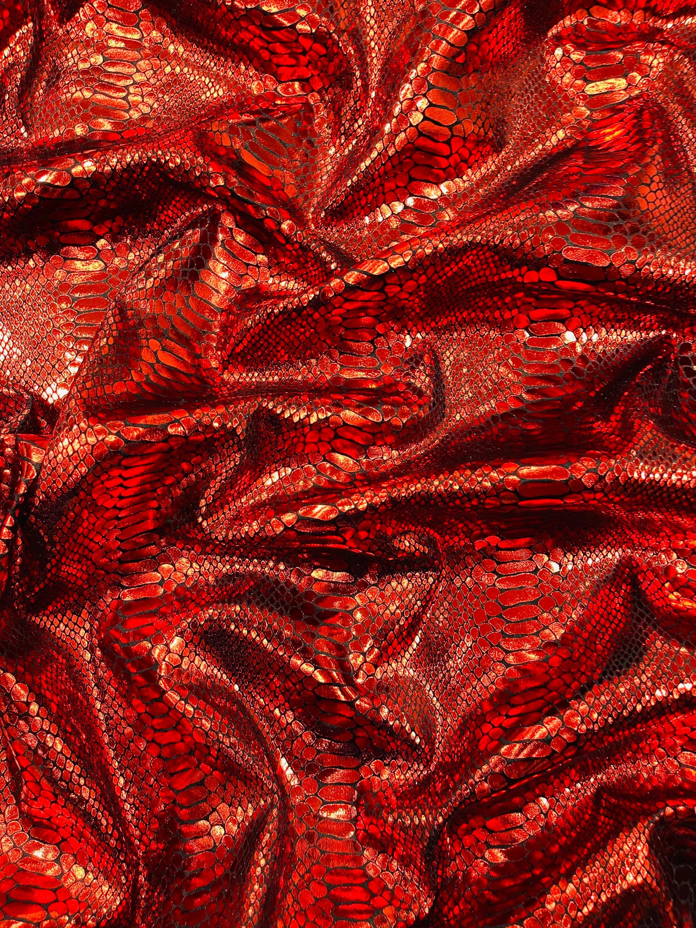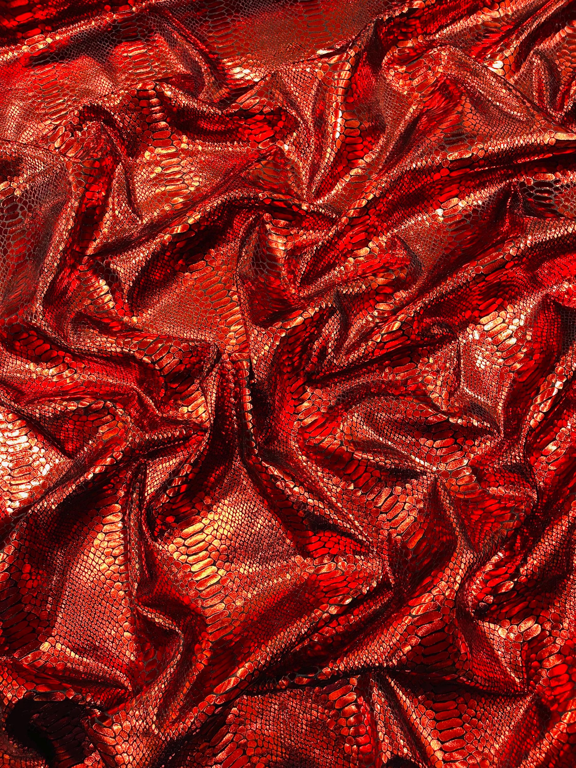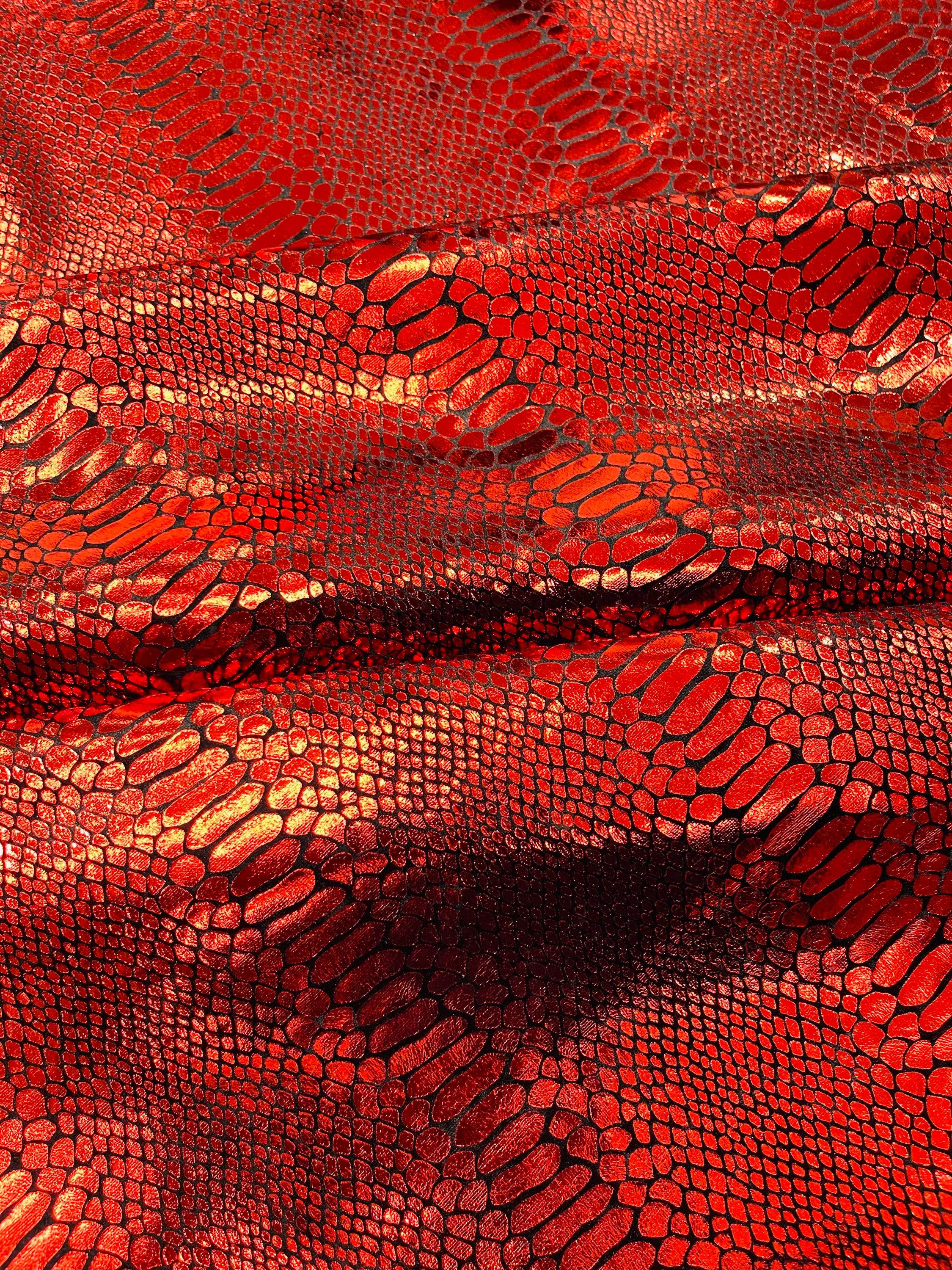 Our Venom Snake Skin Spandex Fabric has an iridescent lame snake print on stretch velvet fabric. Item has a 20% stretch on the grain and has a 10% stretch vertical. If more than one yard is purchased, item will come in one piece. For instance, if you order one yard, you will receive a piece of 58" x 36". If you order two yards, you will receive a piece of 58" x 72", etc.