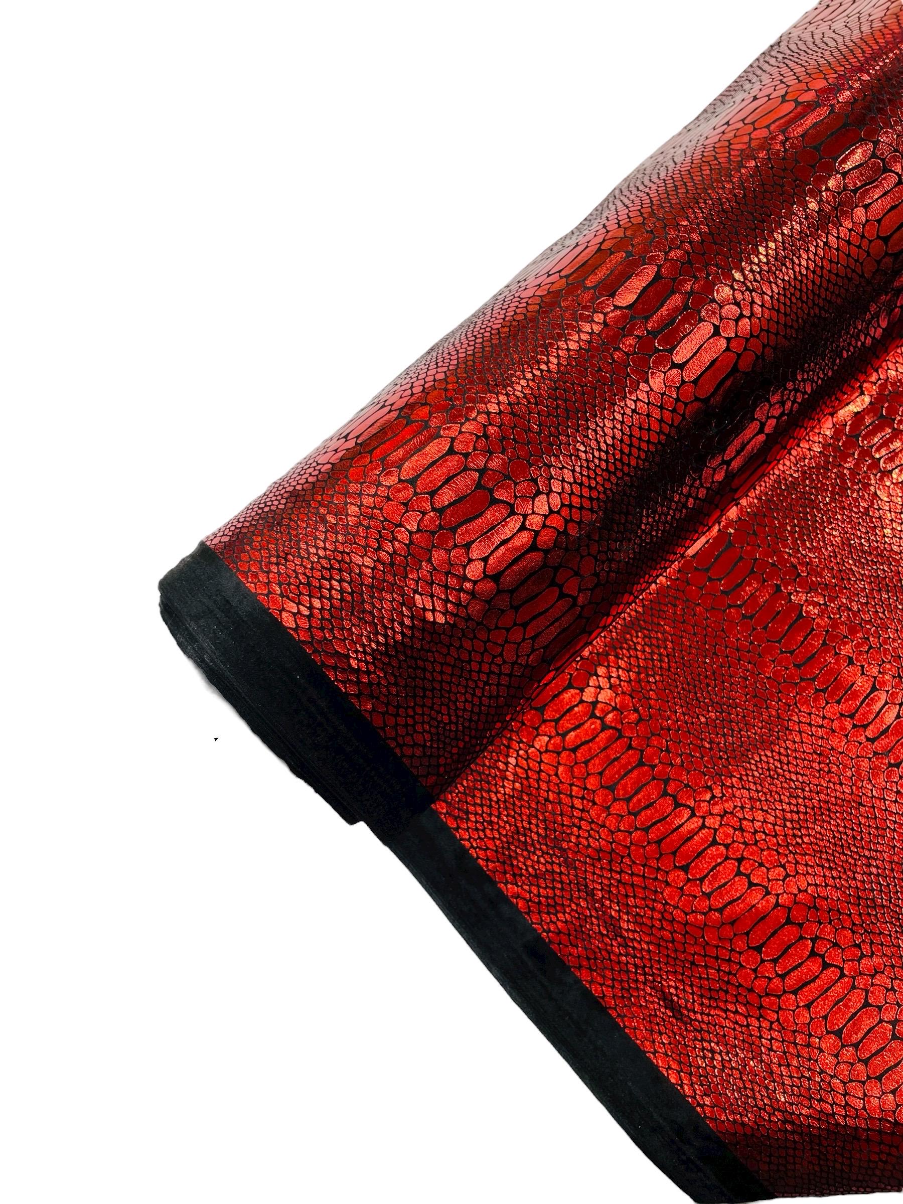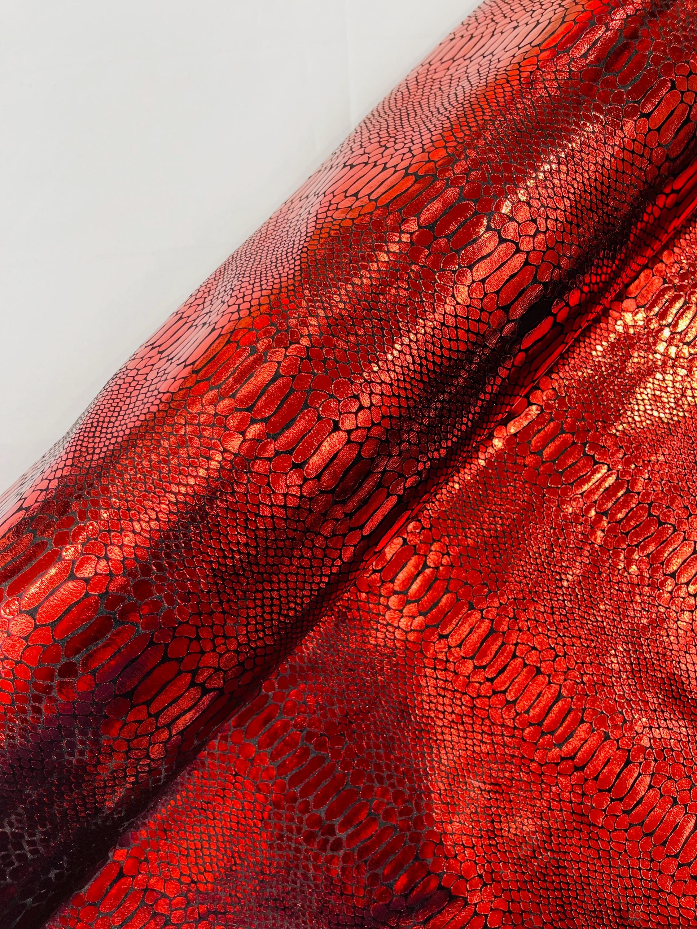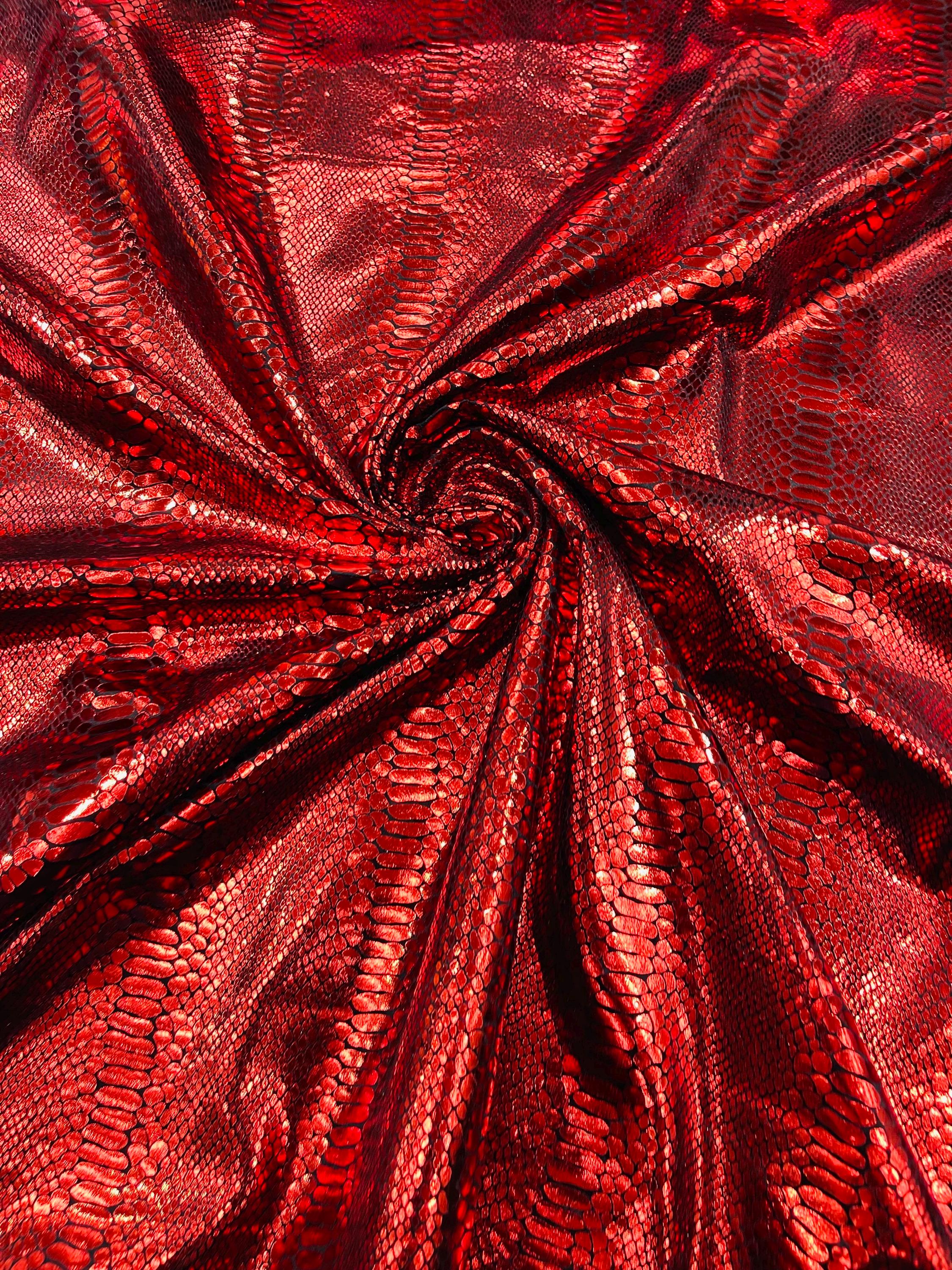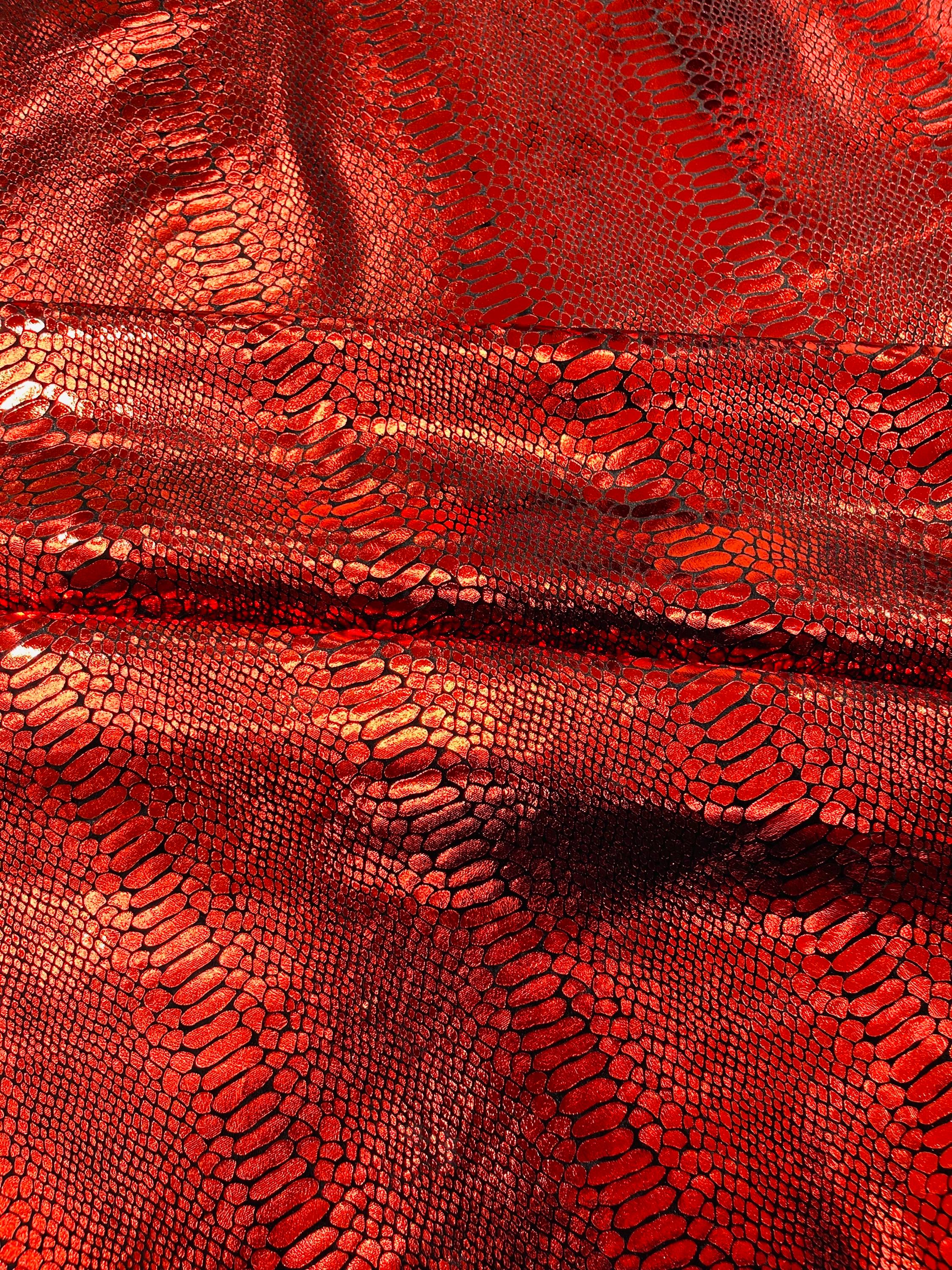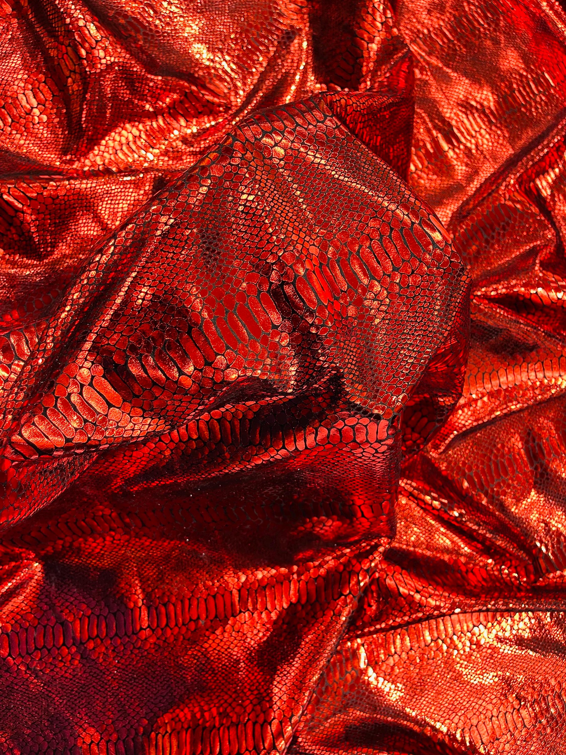 Our Venom Snake Skin Spandex Fabric has an iridescent lame snake print on stretch velvet fabric. Item has a 20% stretch on the grain and has a 10% stretch vertical. If more than one yard is purchased, item will come in one piece. For instance, if you order one yard, you will receive a piece of 58" x 36". If you order two yards, you will receive a piece of 58" x 72", etc.