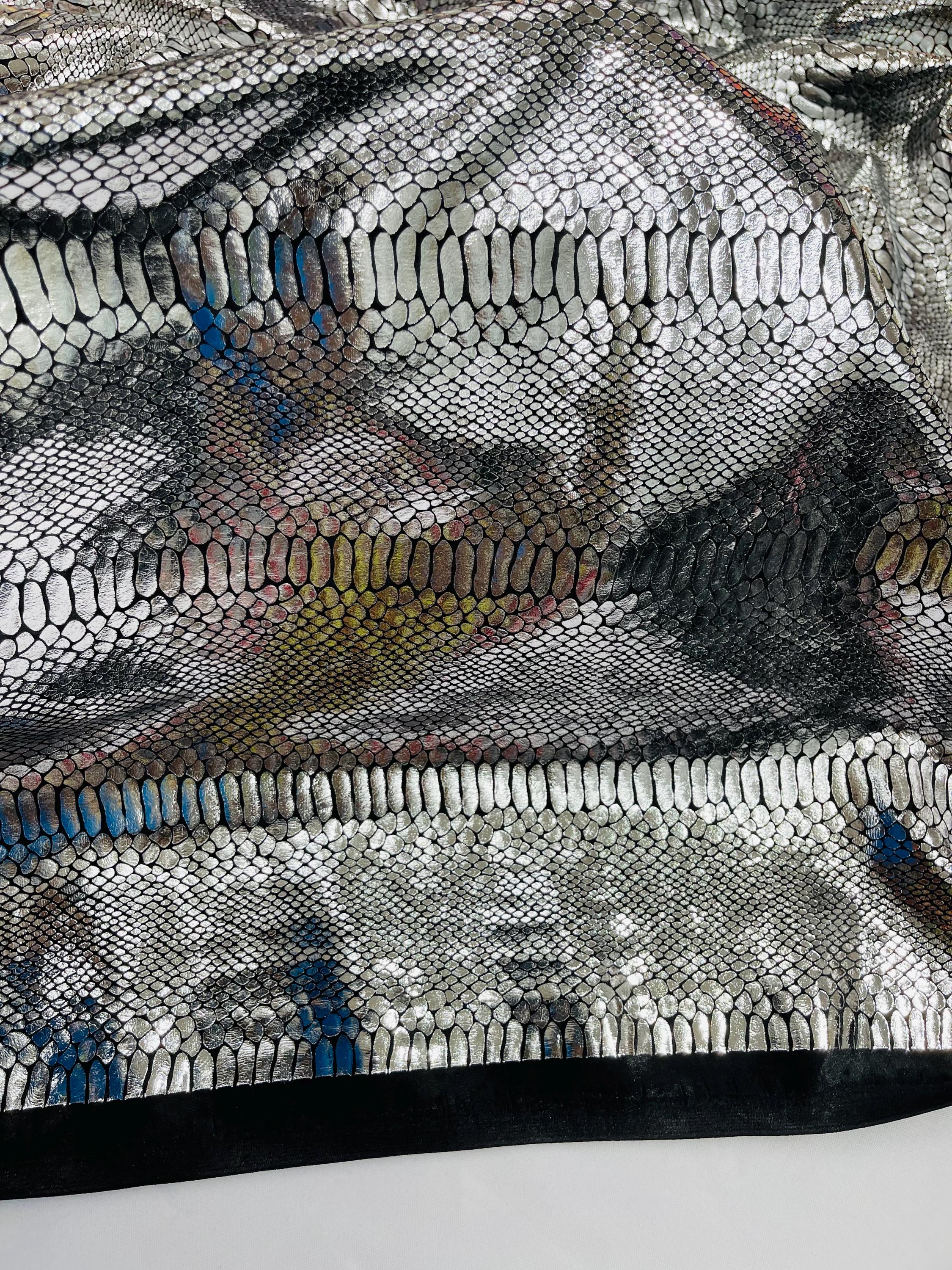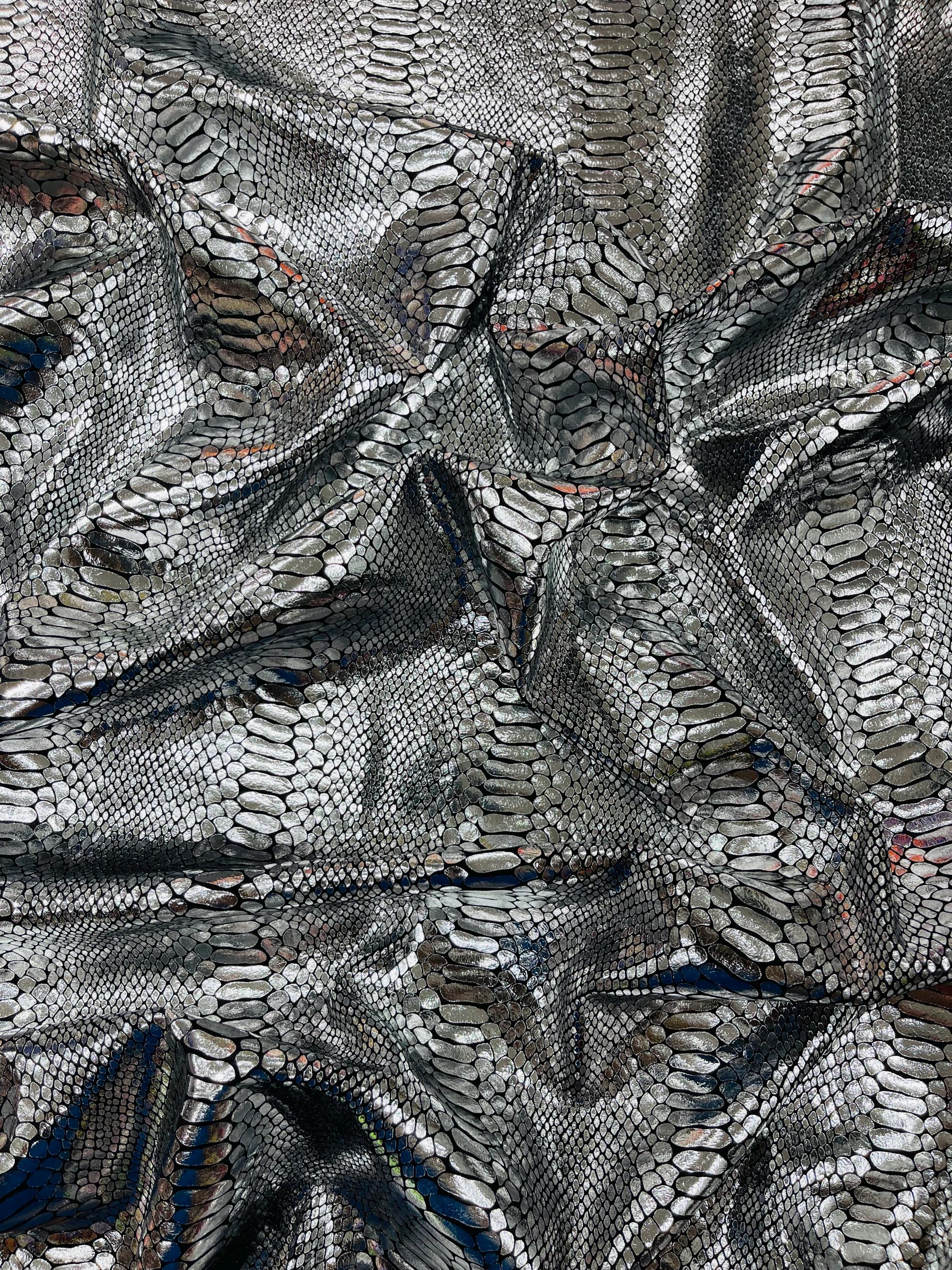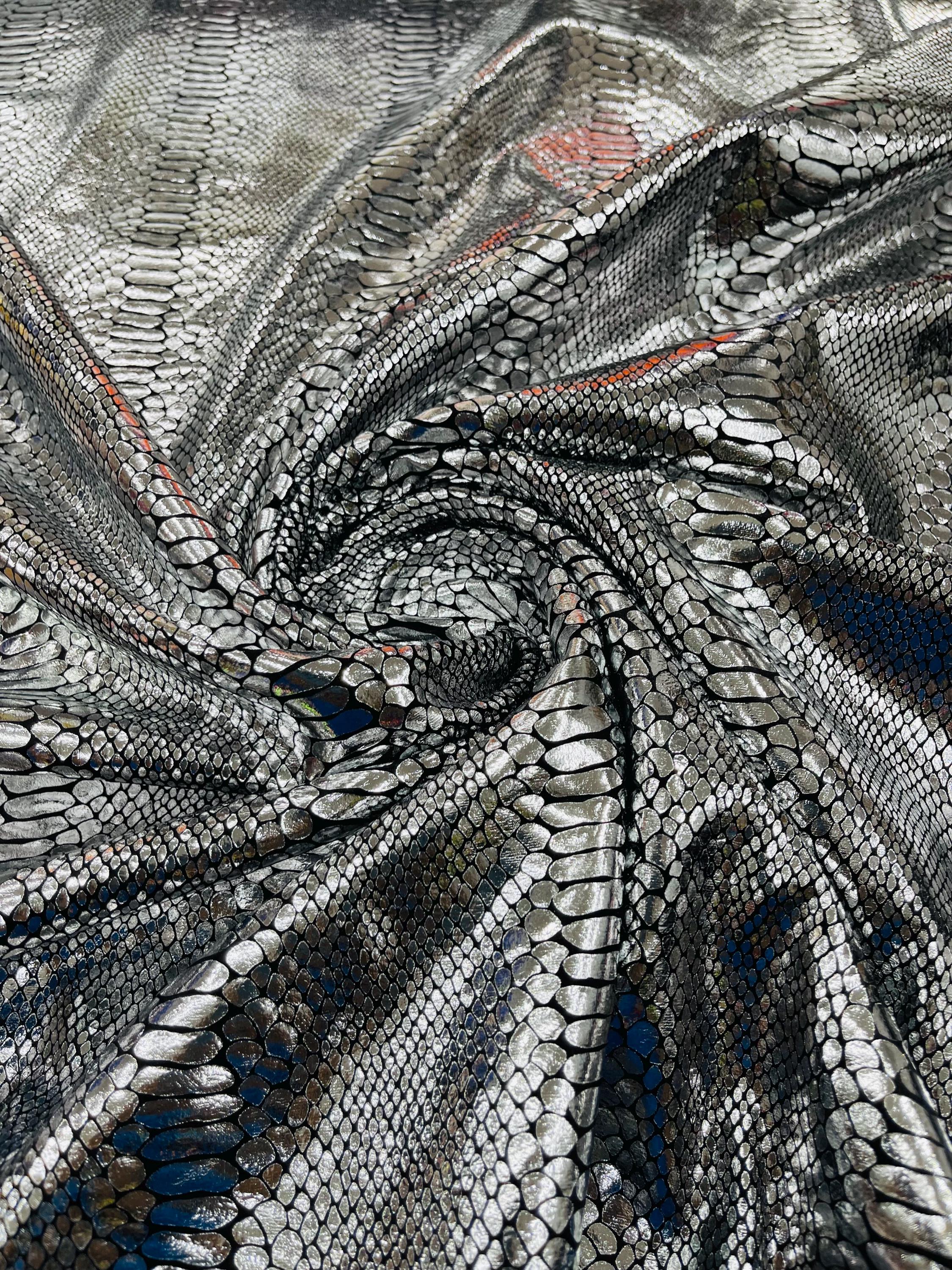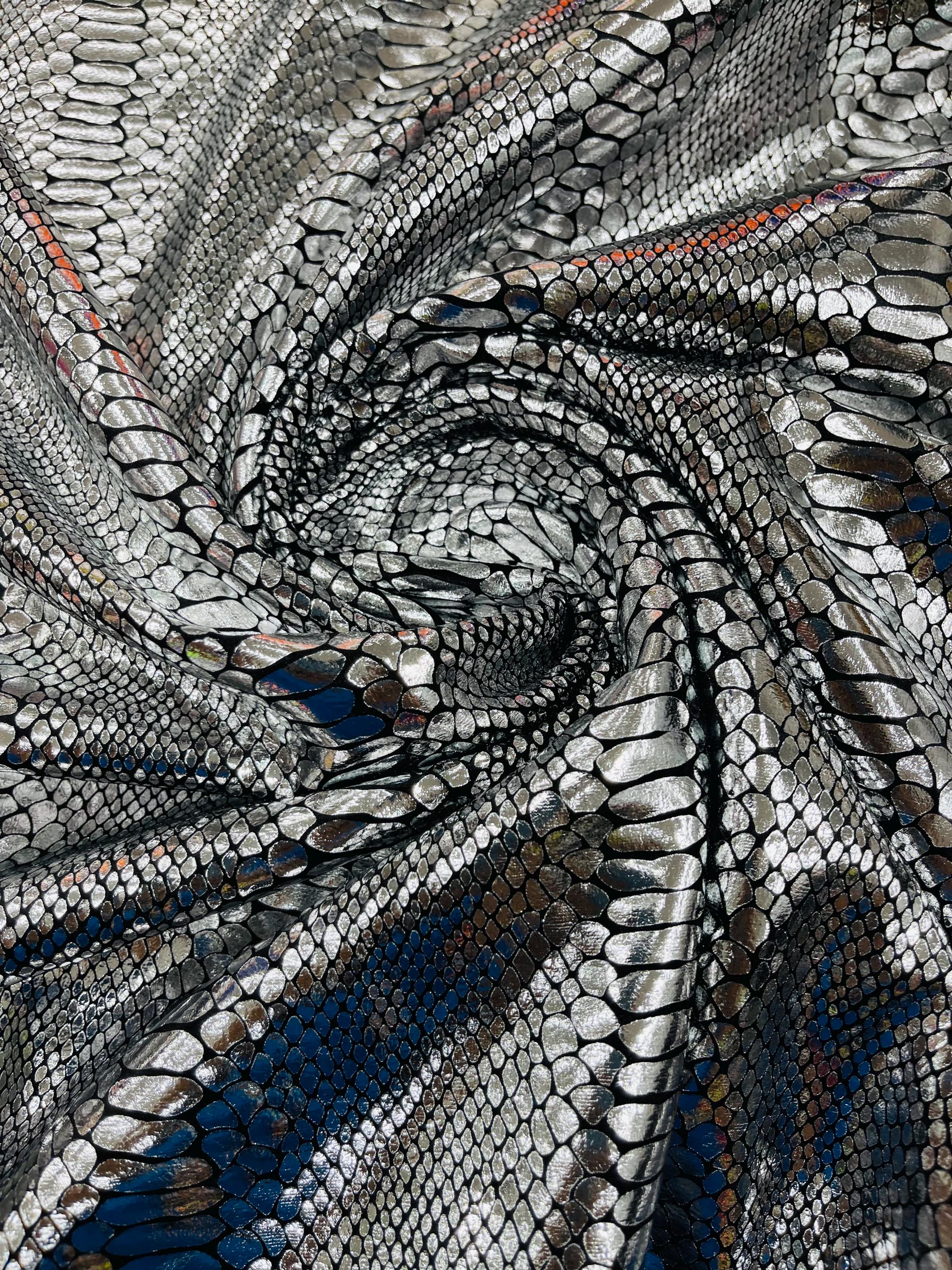 Our Venom Snake Skin Spandex Fabric has an iridescent lame snake print on stretch velvet fabric. Item has a 20% stretch on the grain and has a 10% stretch vertical. If more than one yard is purchased, item will come in one piece. For instance, if you order one yard, you will receive a piece of 58" x 36". If you order two yards, you will receive a piece of 58" x 72", etc.