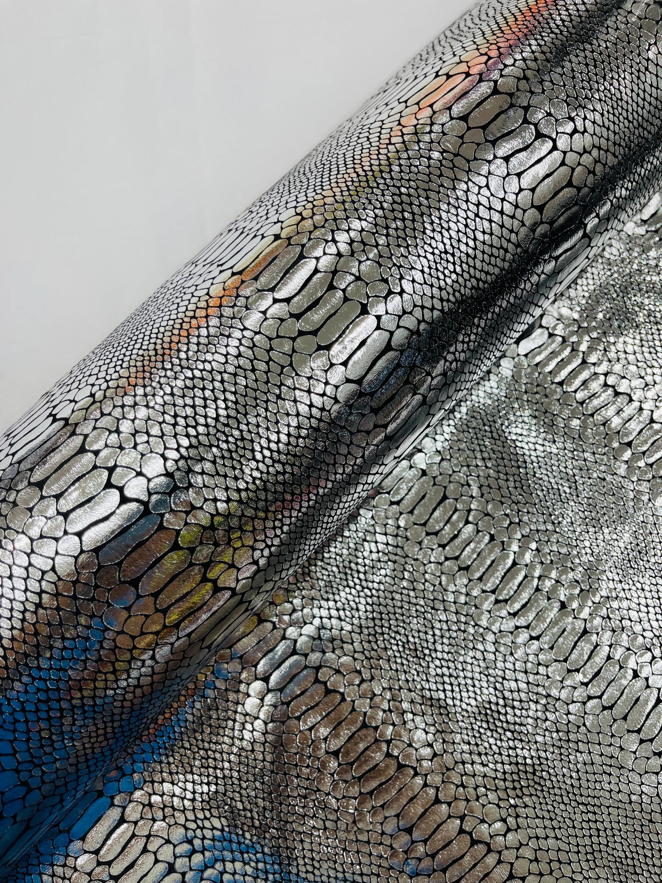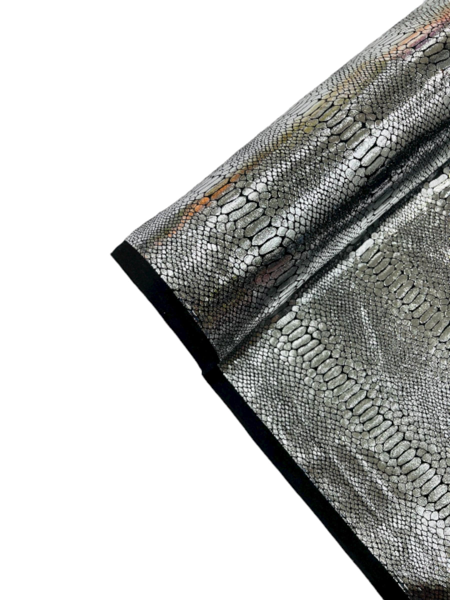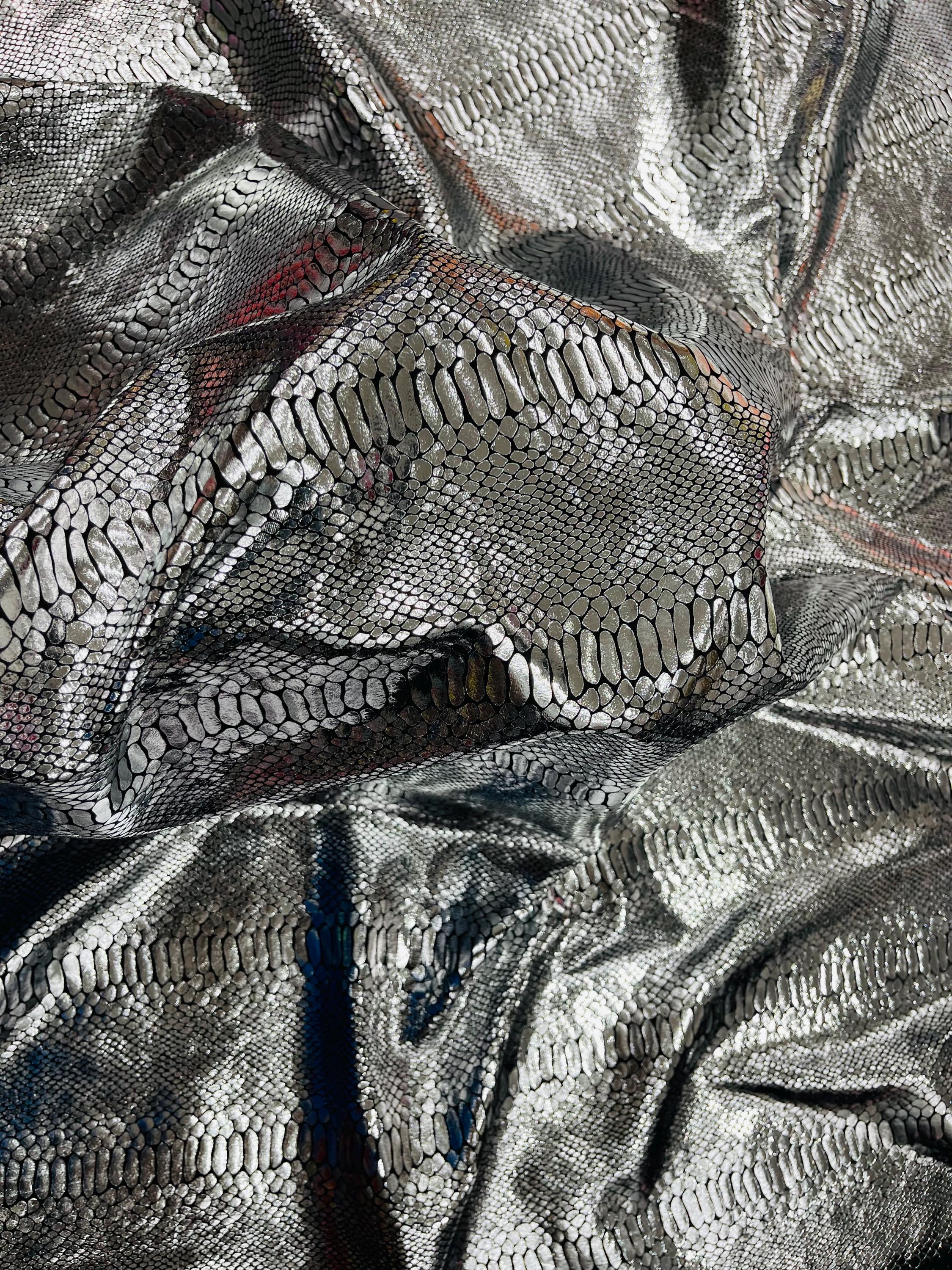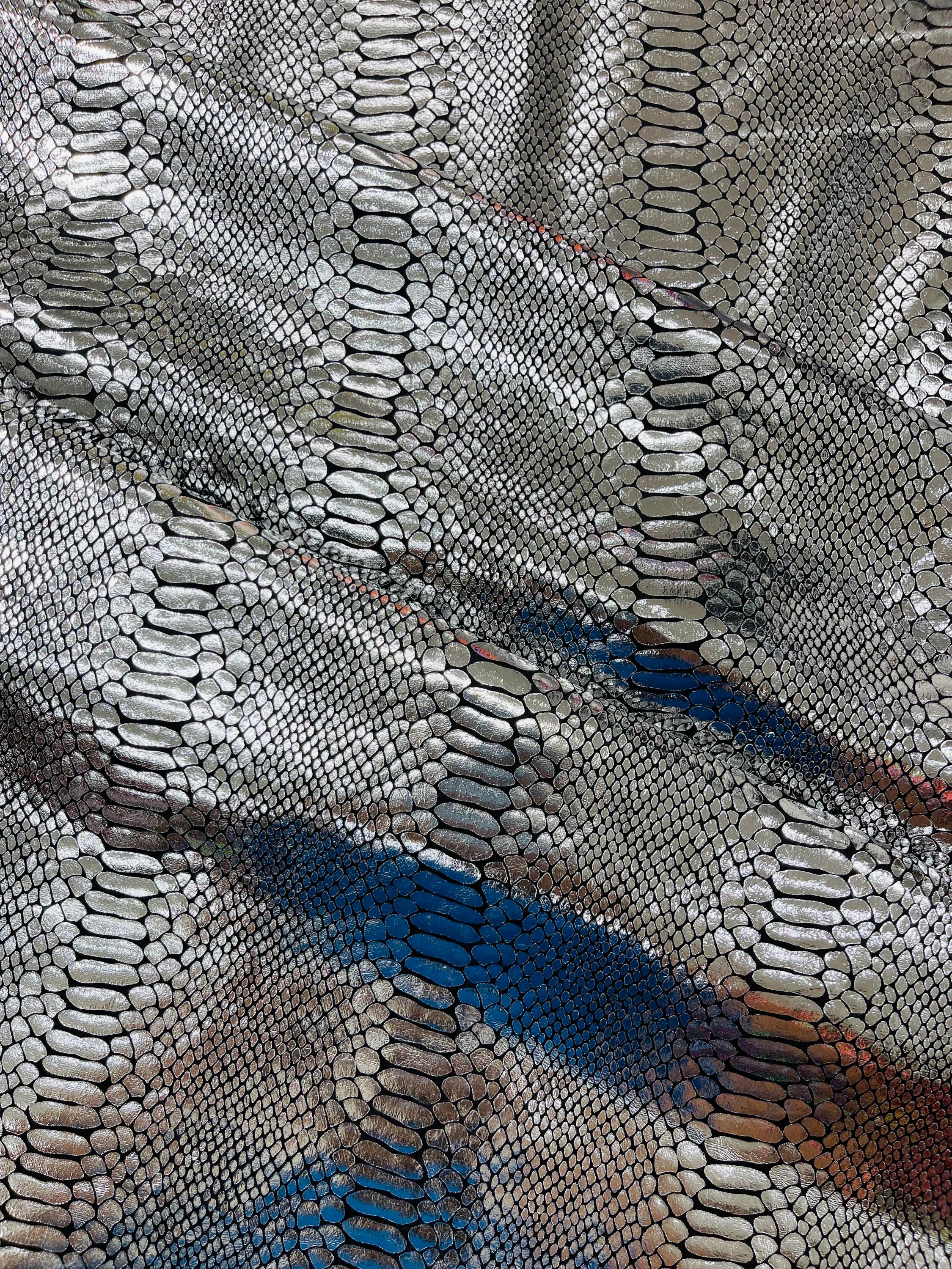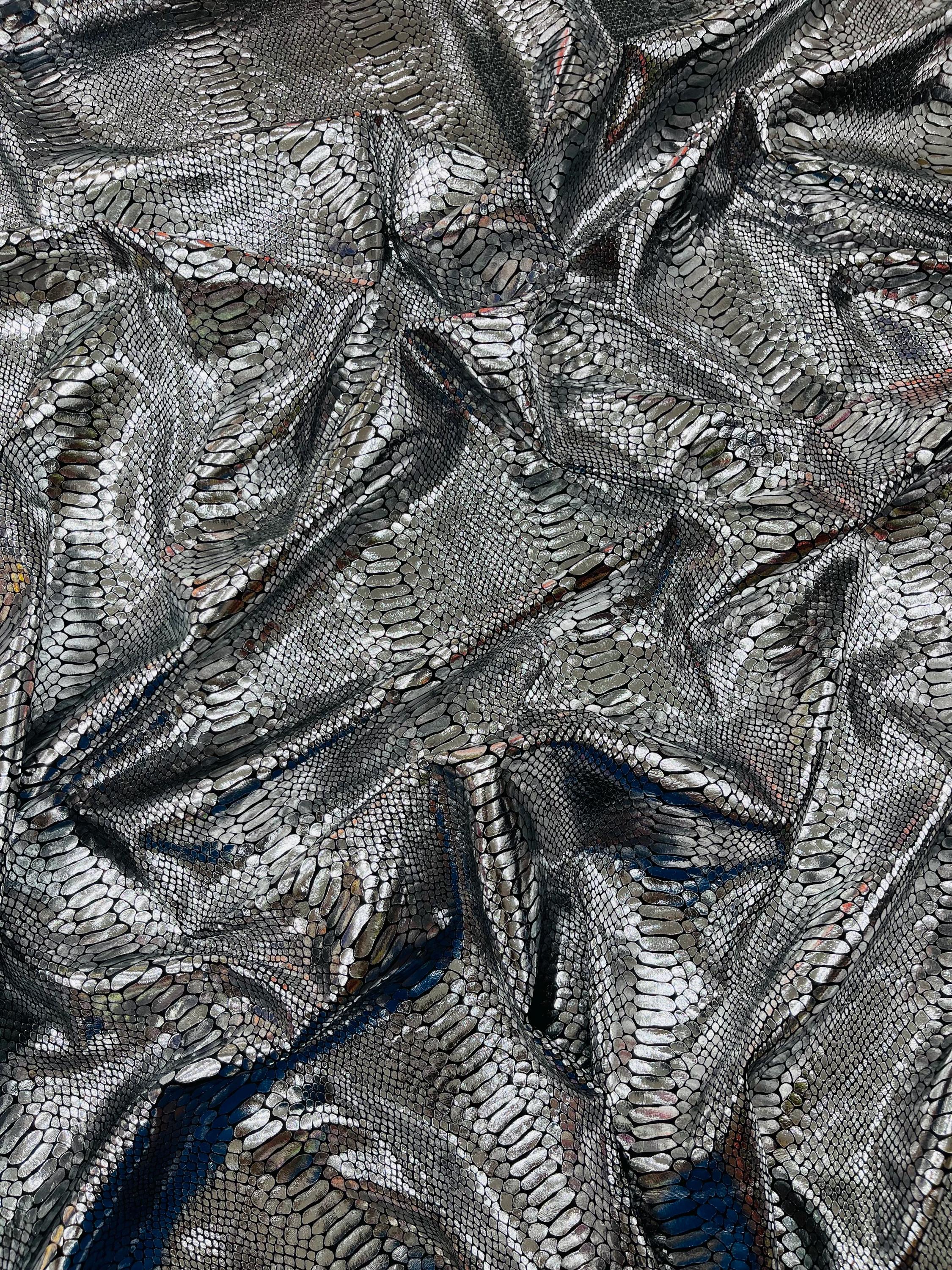 Our Venom Snake Skin Spandex Fabric has an iridescent lame snake print on stretch velvet fabric. Item has a 20% stretch on the grain and has a 10% stretch vertical. If more than one yard is purchased, item will come in one piece. For instance, if you order one yard, you will receive a piece of 58" x 36". If you order two yards, you will receive a piece of 58" x 72", etc.