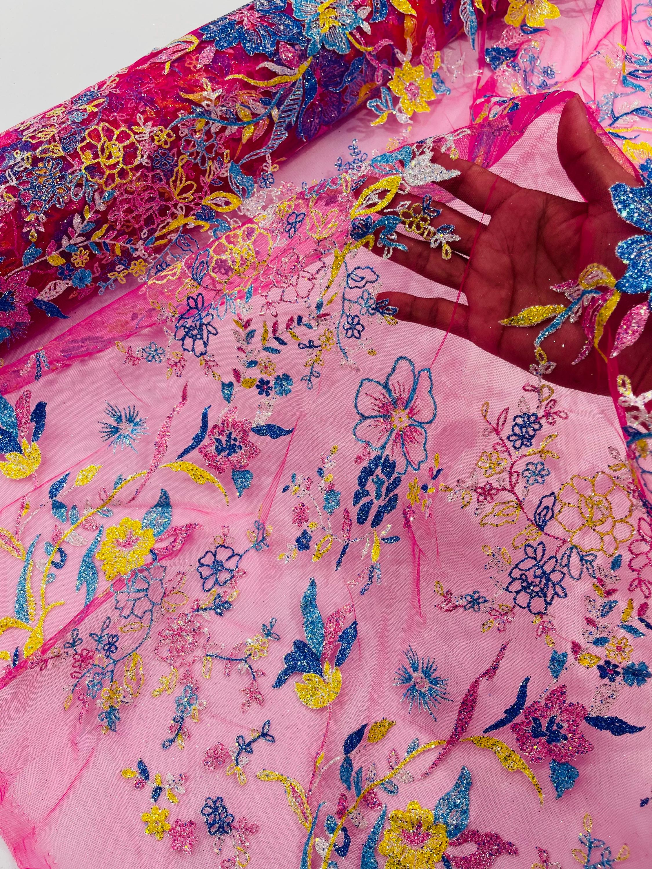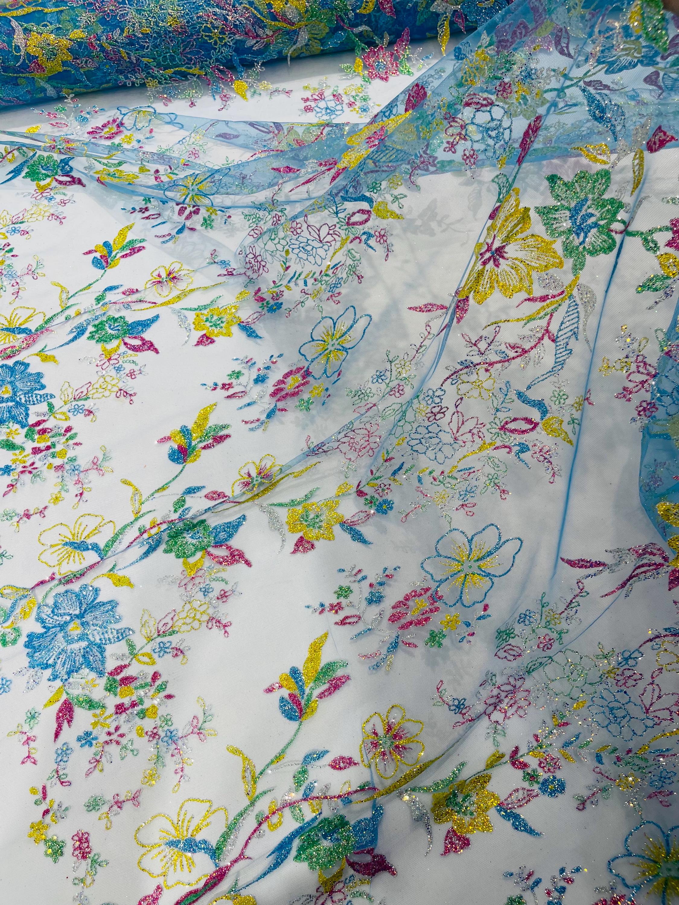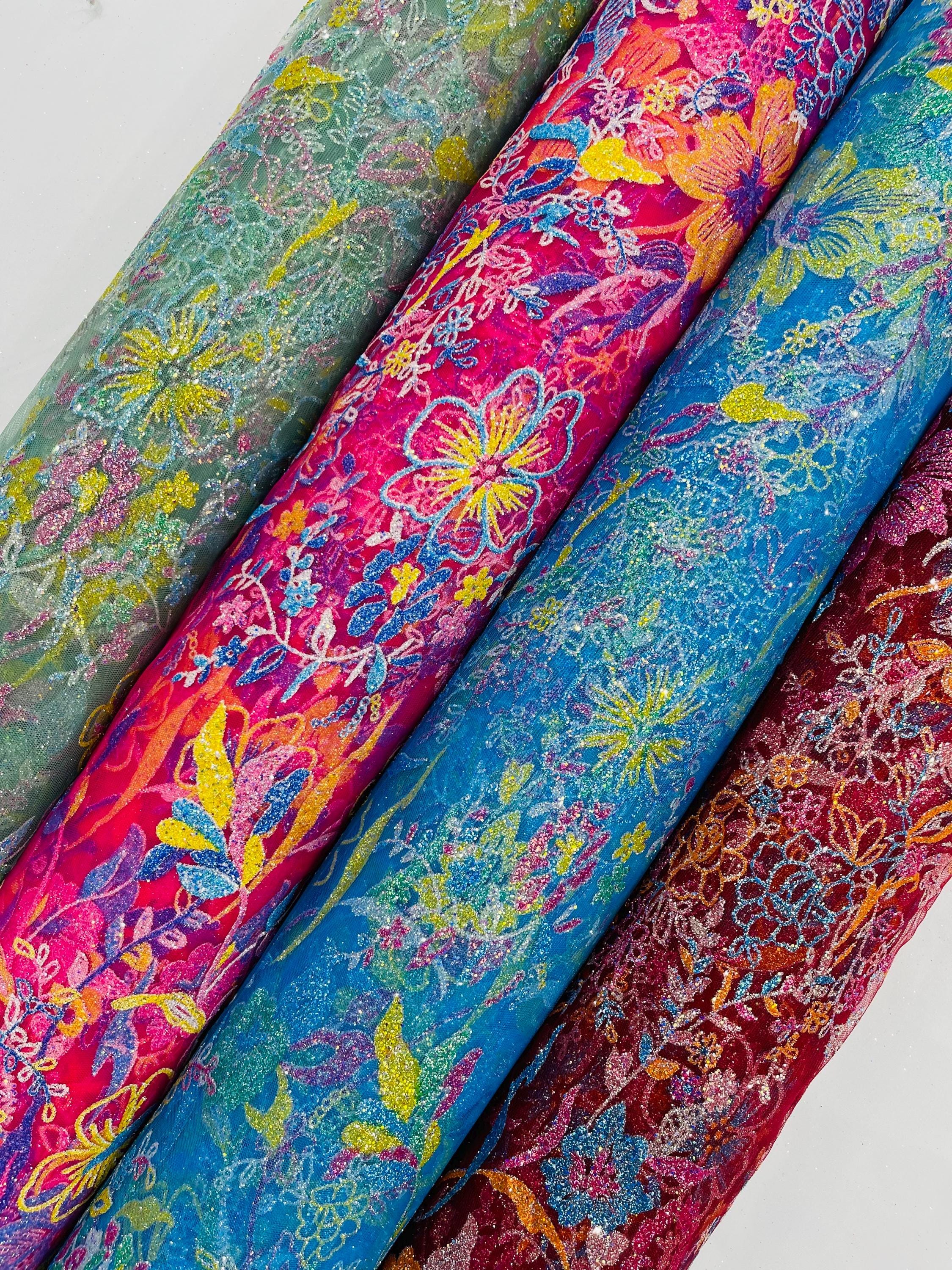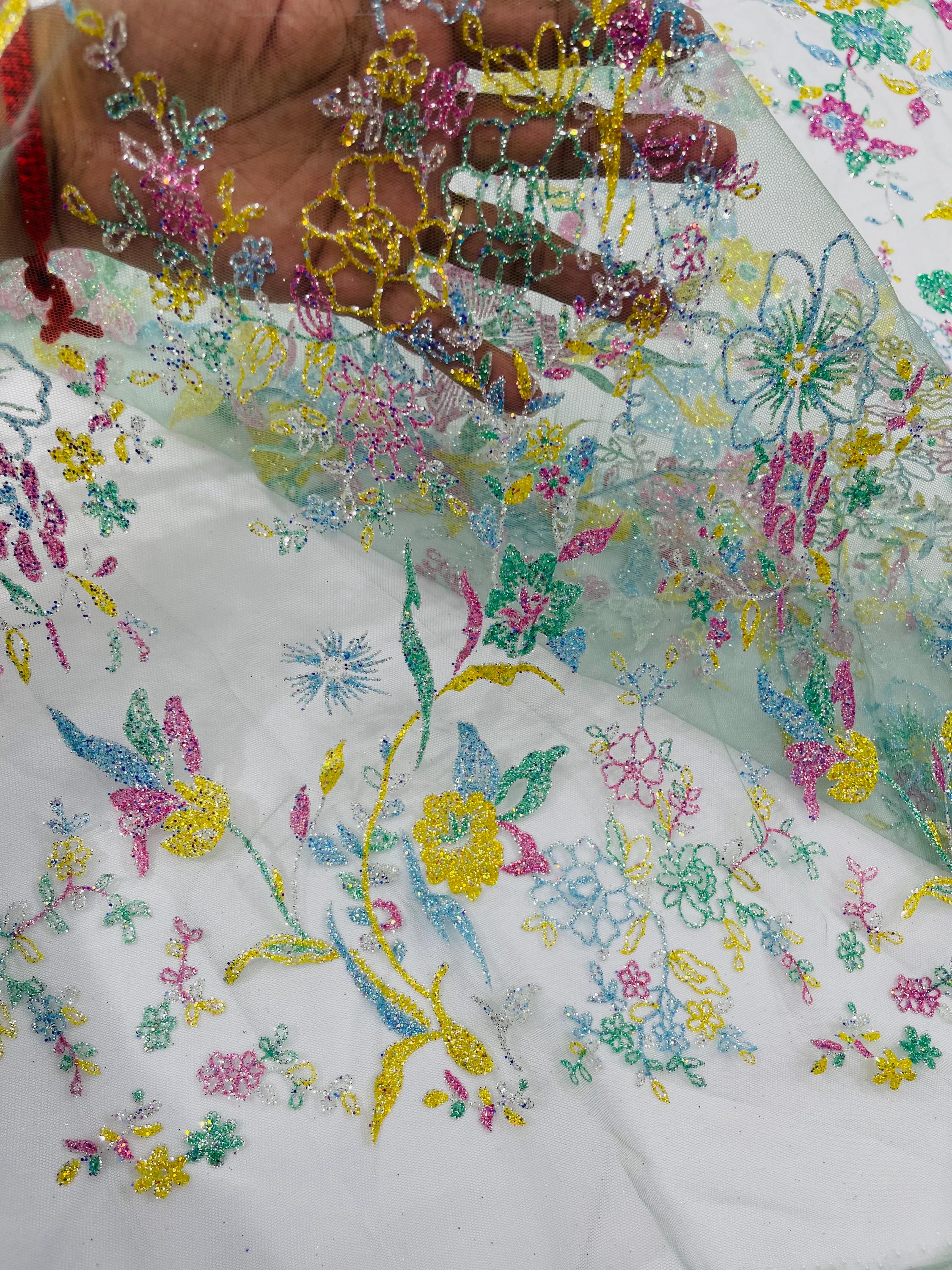 Mesh Glitter Lace Fabric, Multi Color Floral Design, For Wedding Decor Bridal/Prom