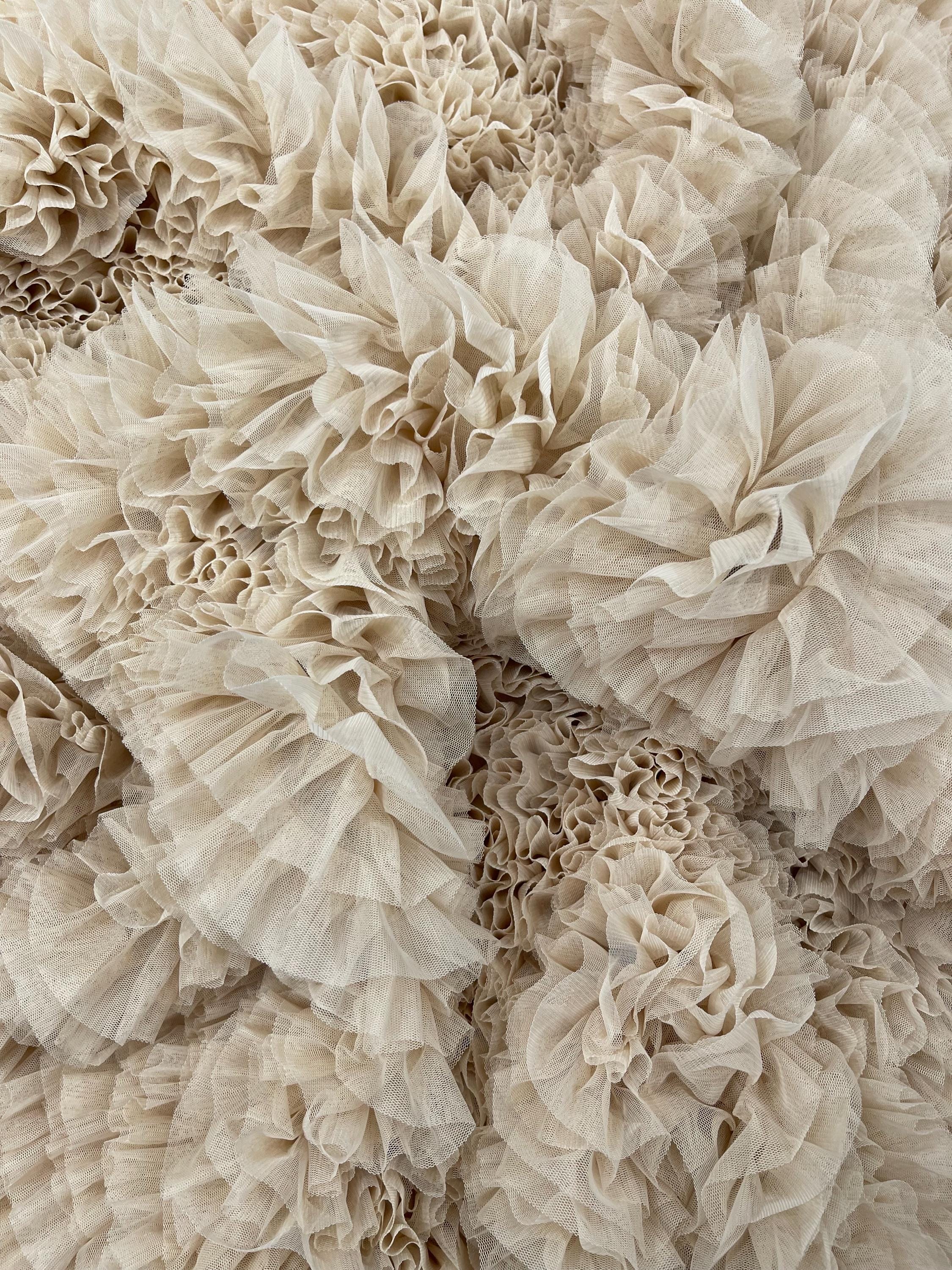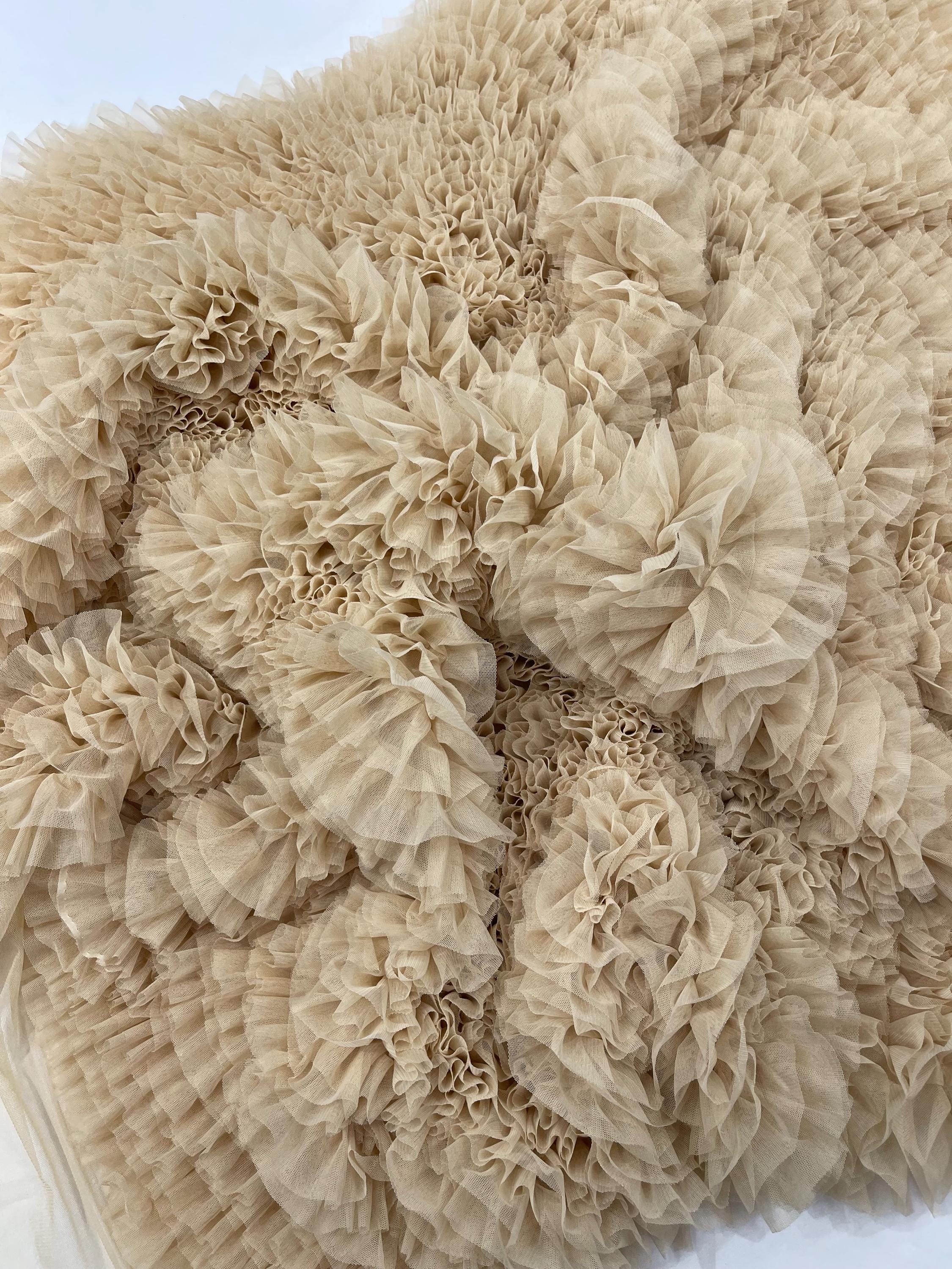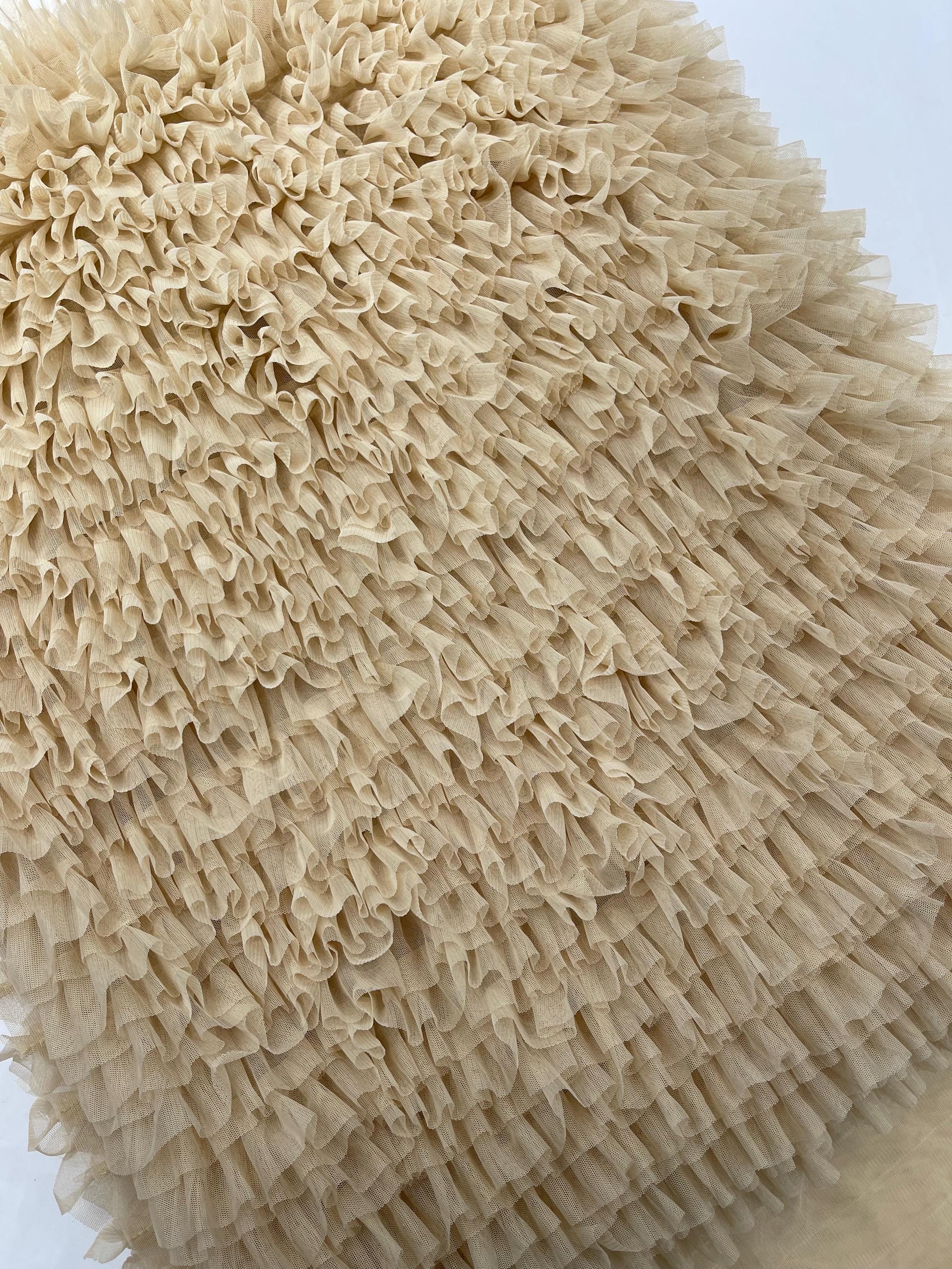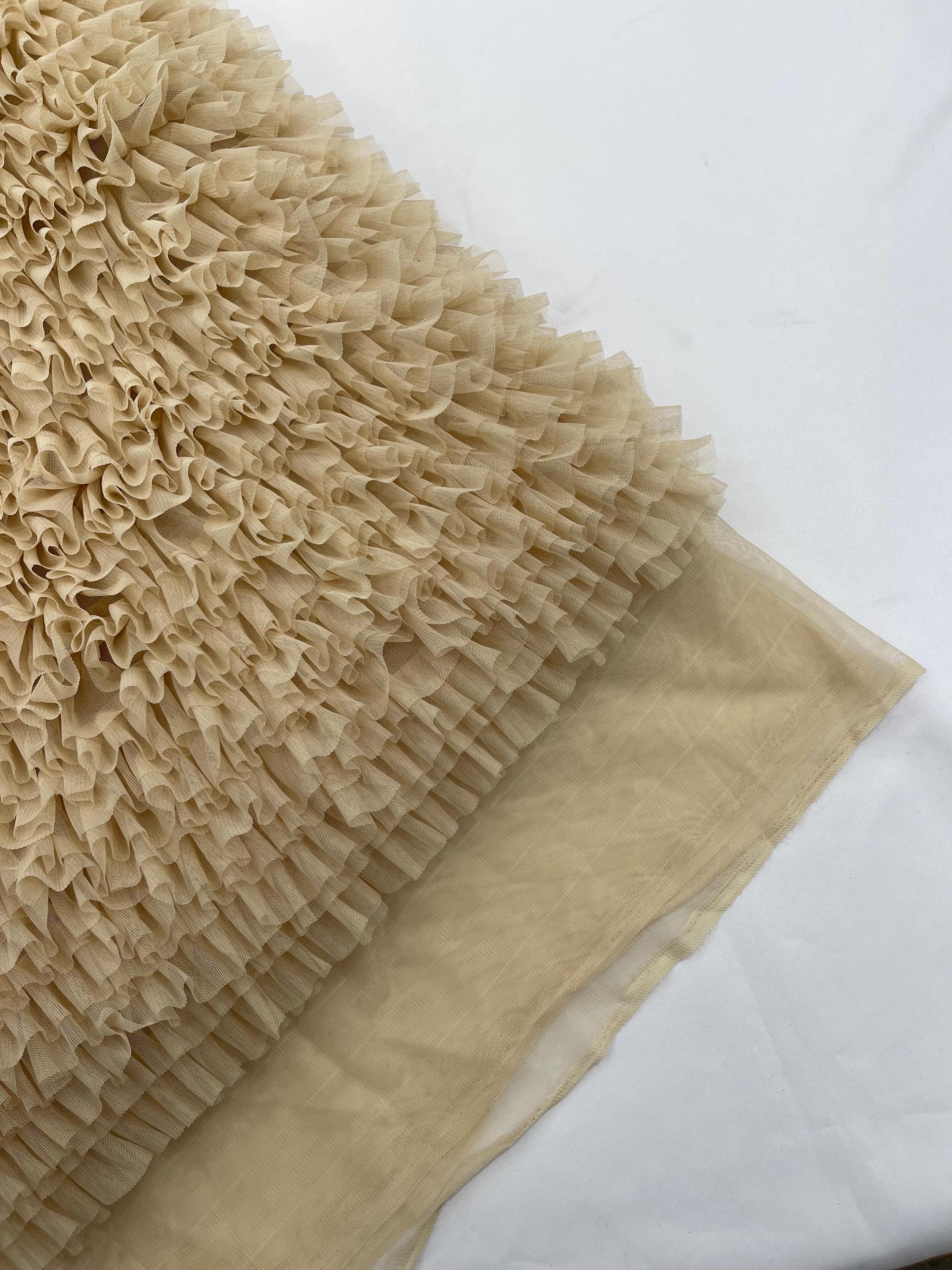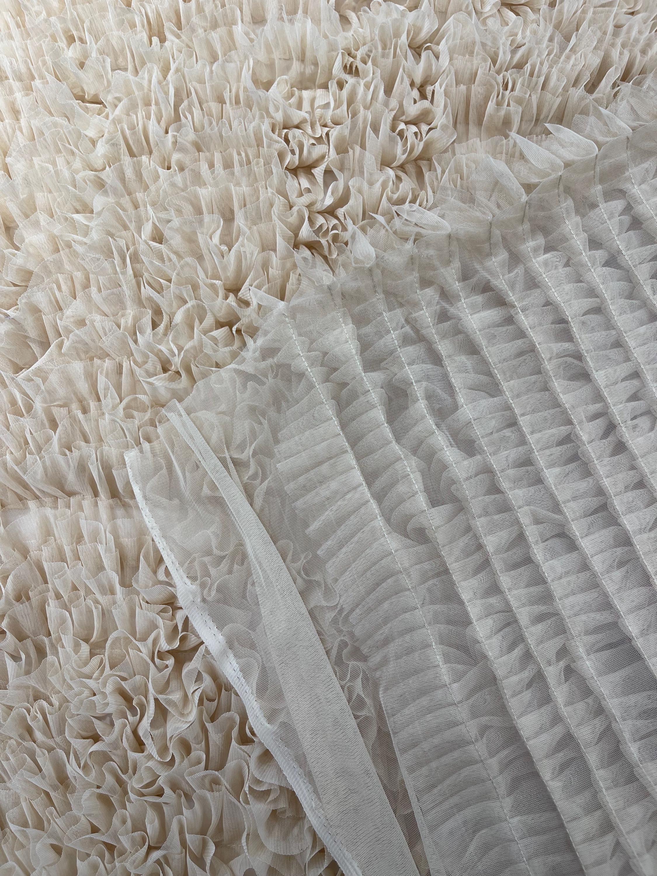 Soft double Ruffle Tulle is a transparent fabric that is used to make fabric for formal wear and ribbon. It is a thin poly mesh fabric that is accented and designed with puffy waves that resemble ruffle shapes making it ideal for puffy dresses and high end gowns. This carries a very elegant and extravagant style that will surely amaze you. There are also many uses for this fabric in sewing and crafting projects.