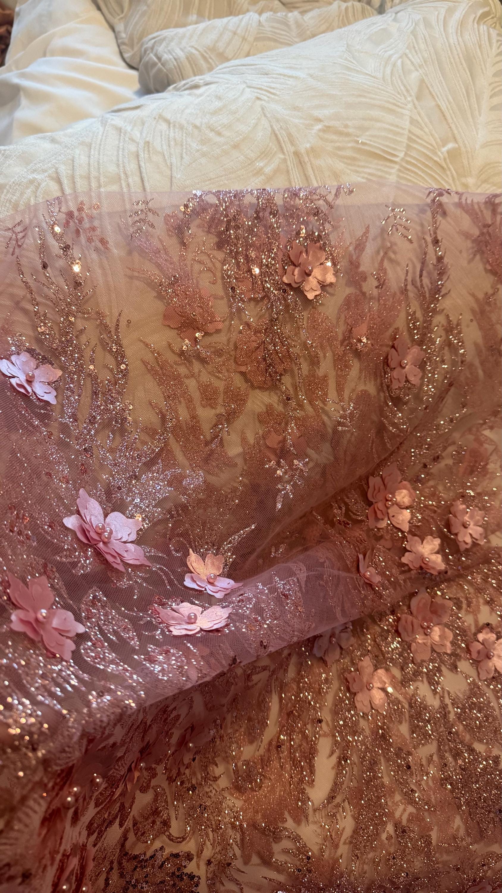 Glitter Tulle Beaded Lace Fabric, by the yard, for wedding dress, glitter tulle Fabric with beads across a mesh fabric of great quality. It has a beautiful border on both ends. This lace can be used for dresses, tablecloths, nightgowns, prom gowns, bridesmaid gowns, wedding gowns, table covers/runners, pillows, home /event decorations, and much more.