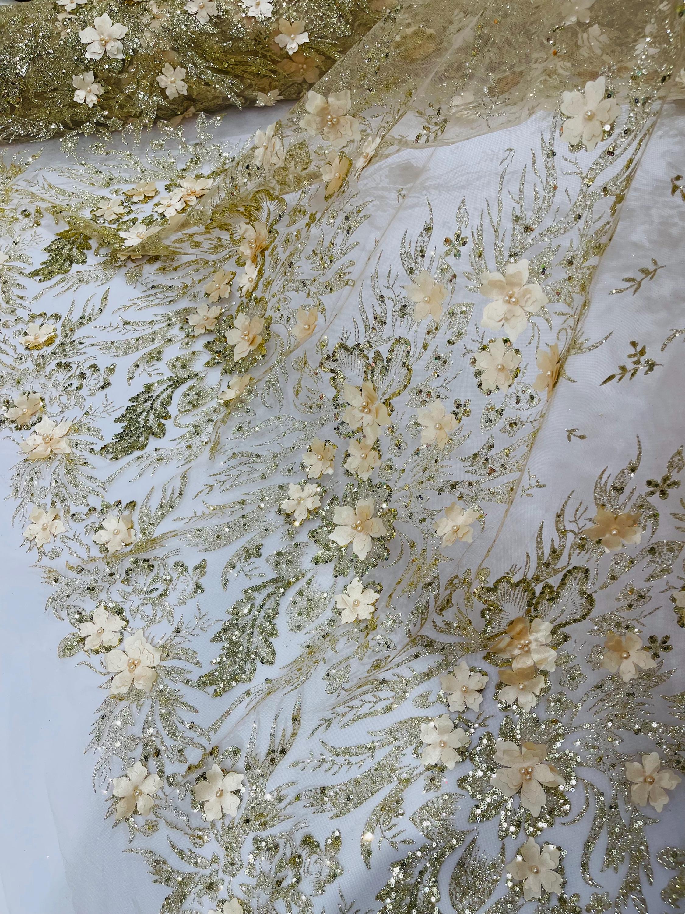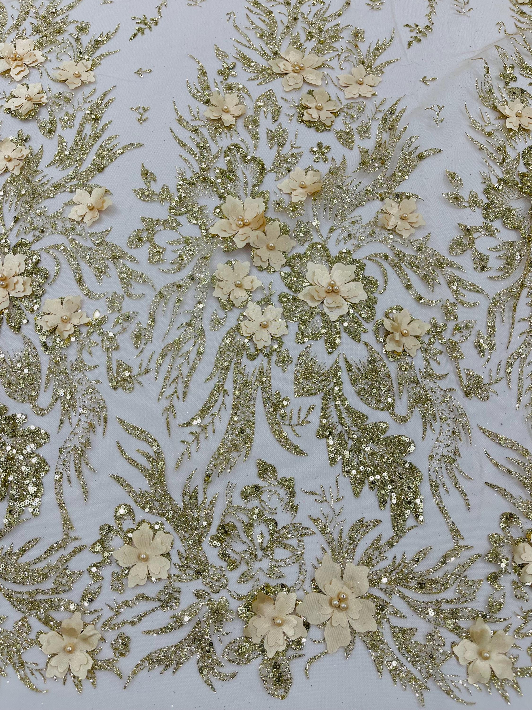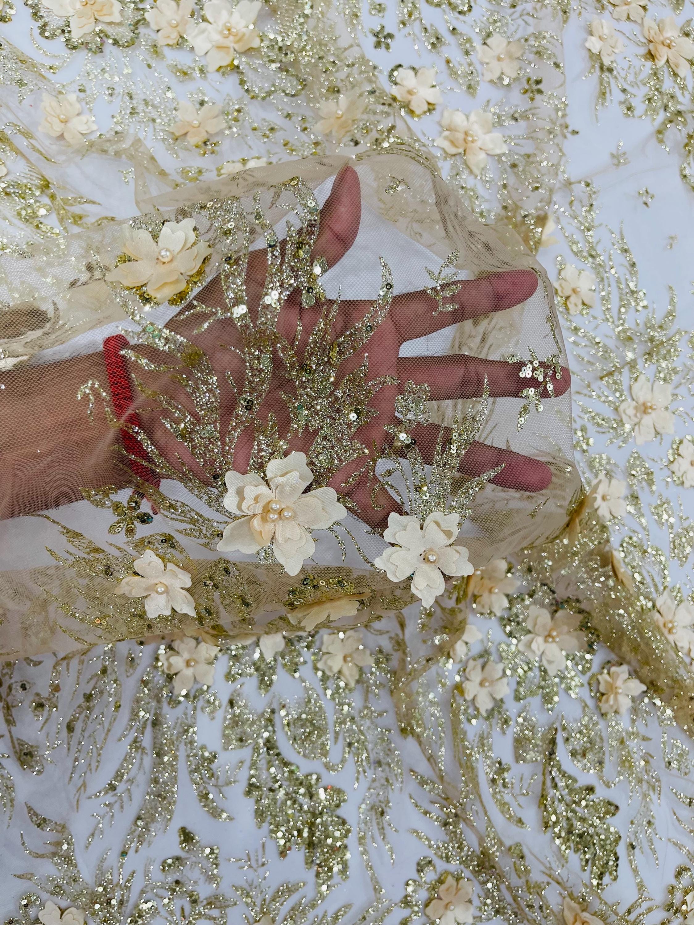 Champagne Glitter Floral Mesh, Glitter 3D Flower Sequin Fabric, Wedding Dresses & Quinseñera