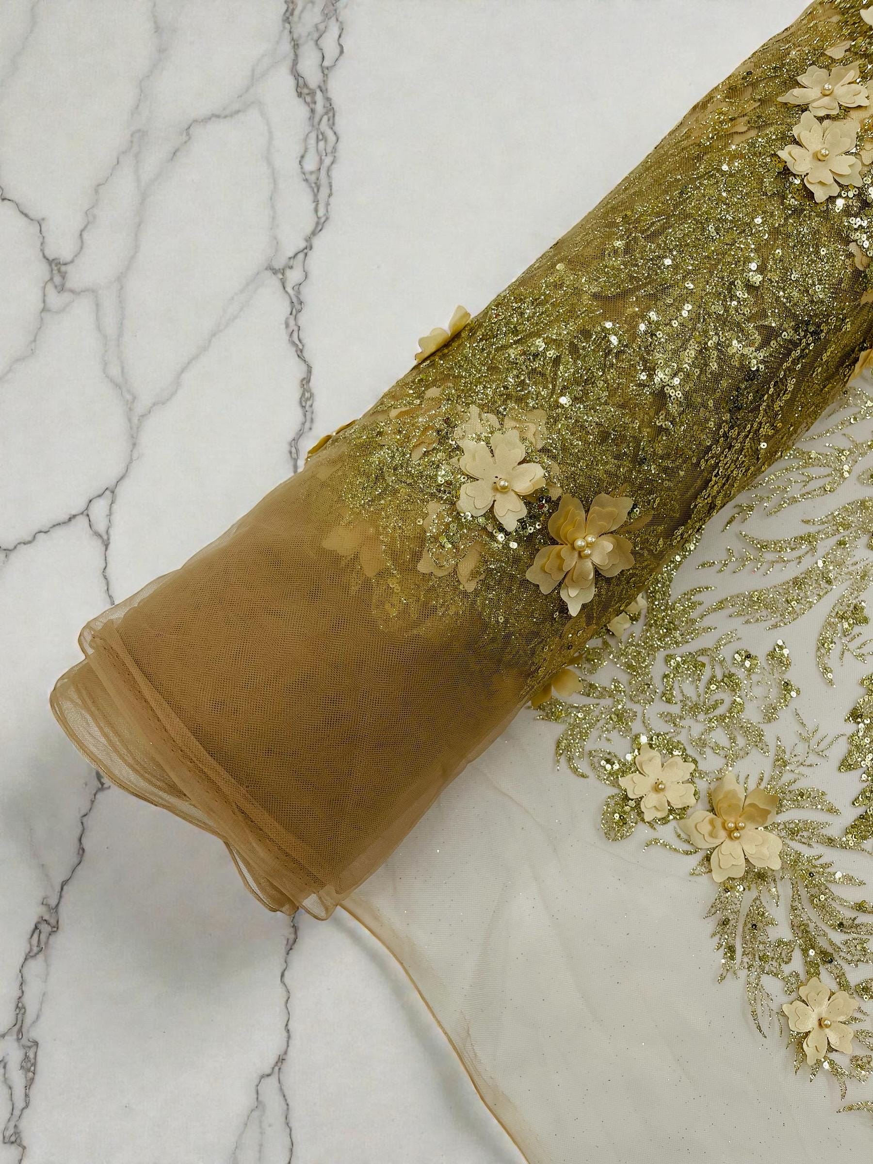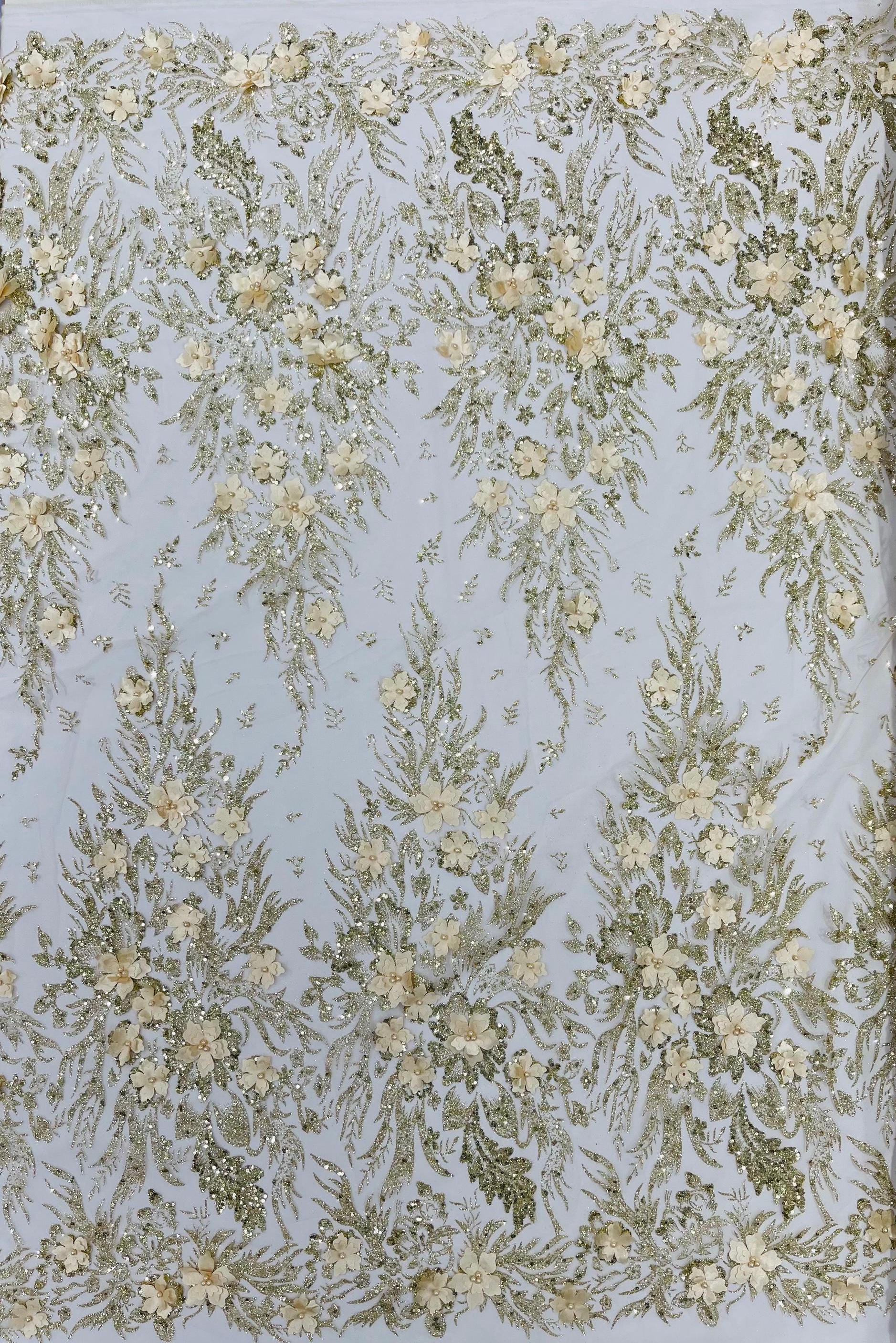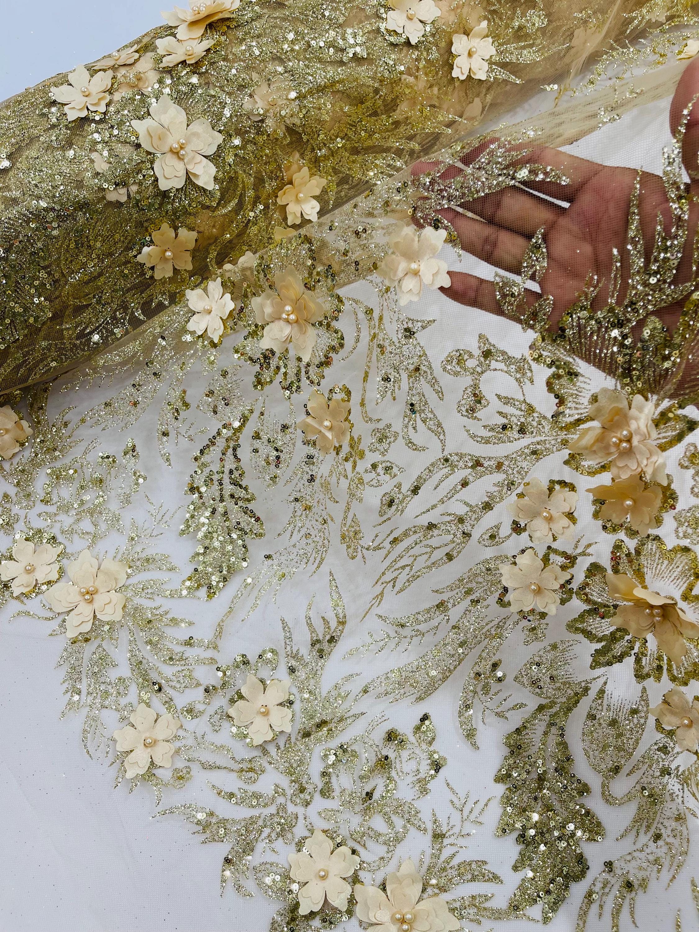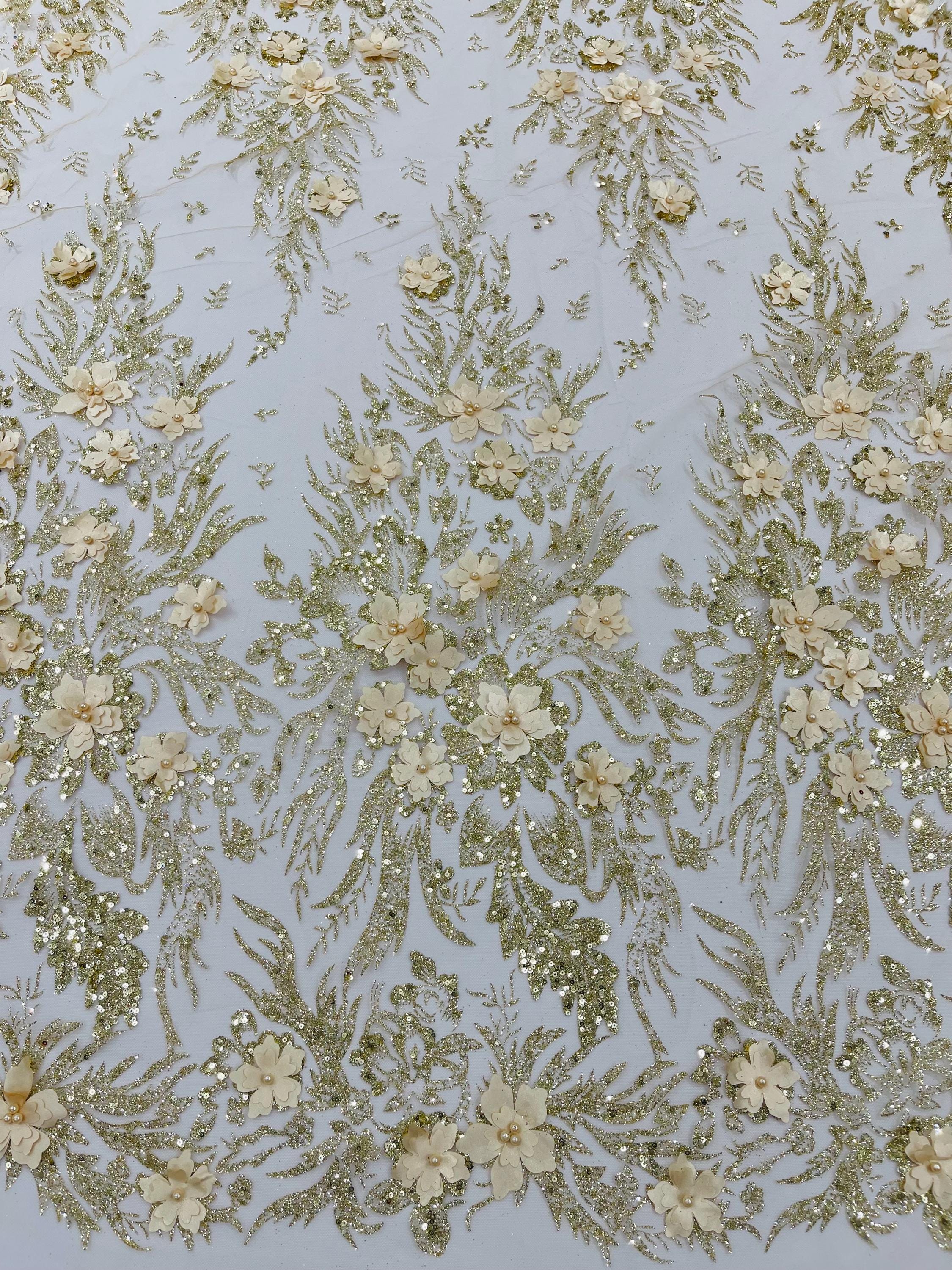 Champagne Glitter Floral Mesh, Glitter 3D Flower Sequin Fabric, Wedding Dresses & Quinseñera