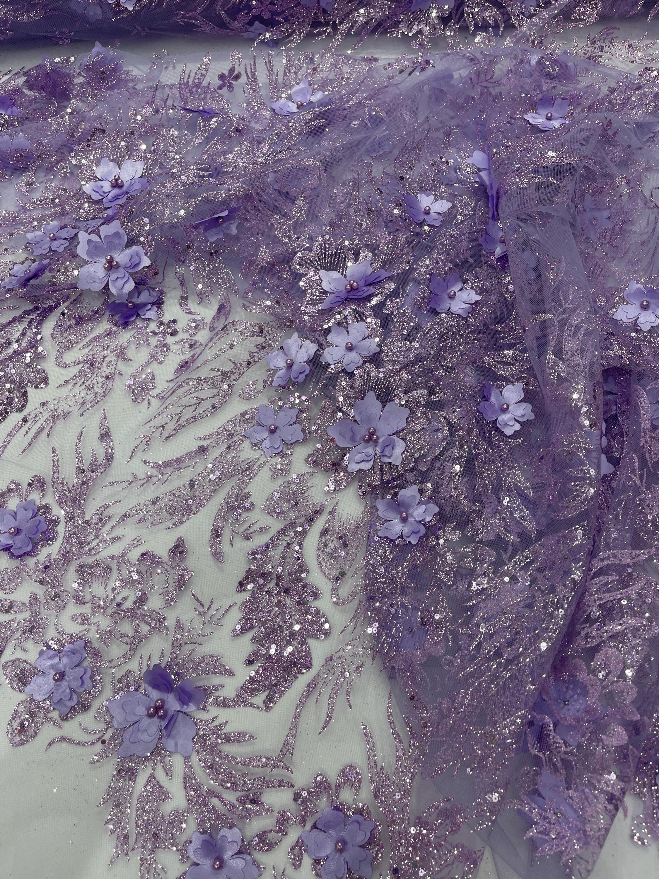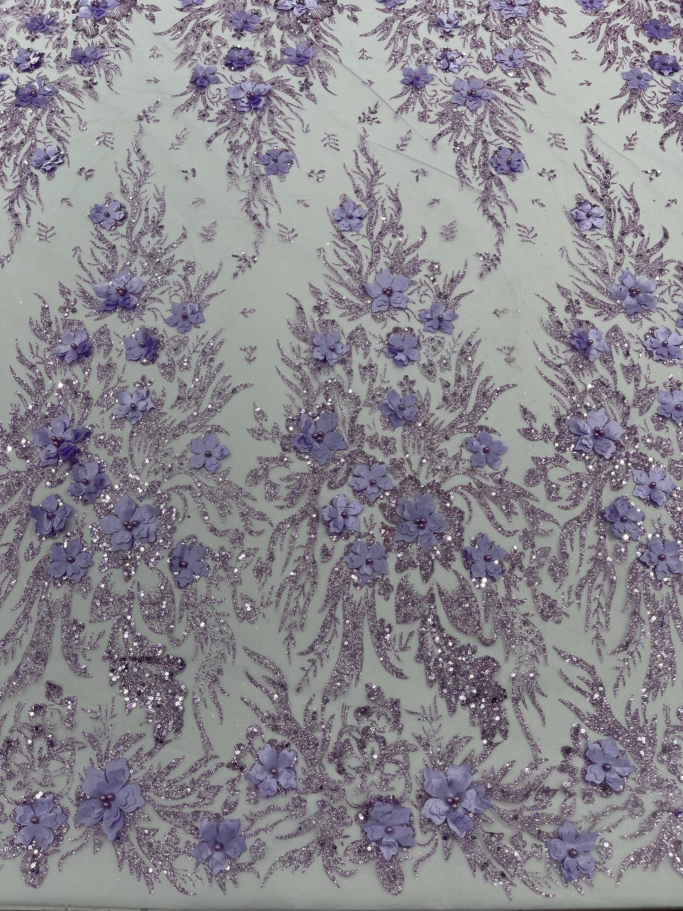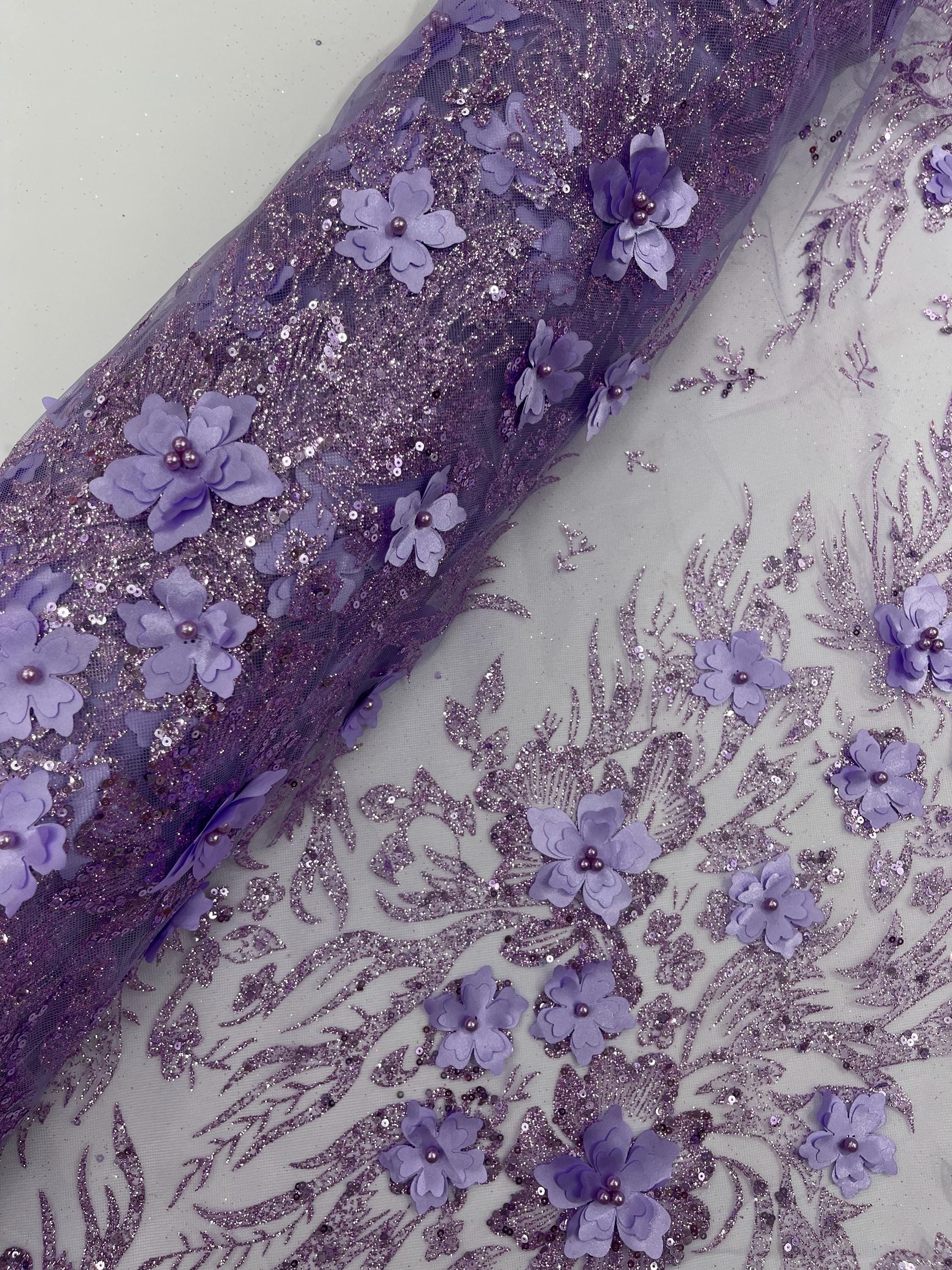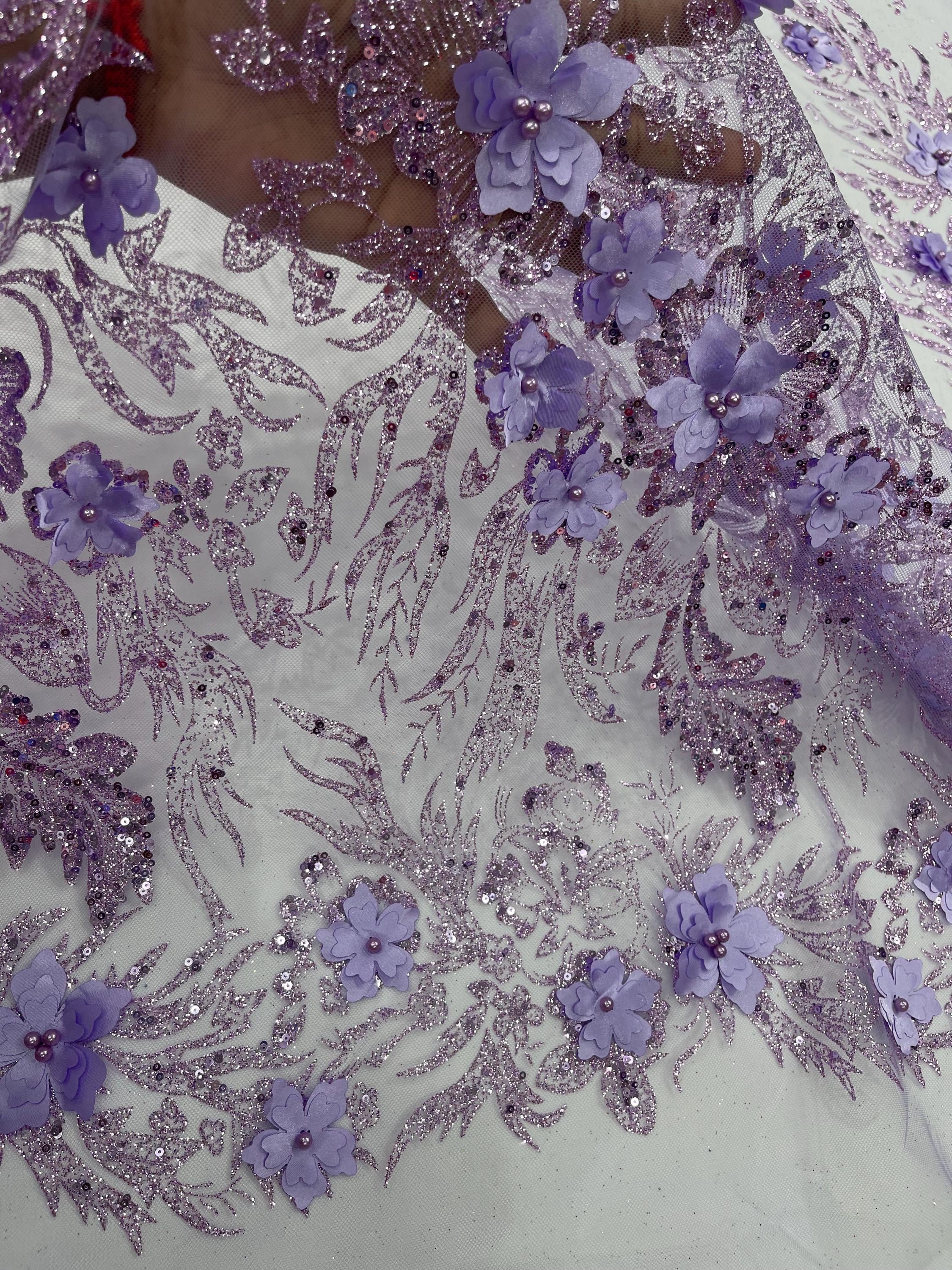 Lilac Glitter Floral Mesh, Glitter 3D Flower Sequin Fabric, Wedding Dresses & Quinseñera