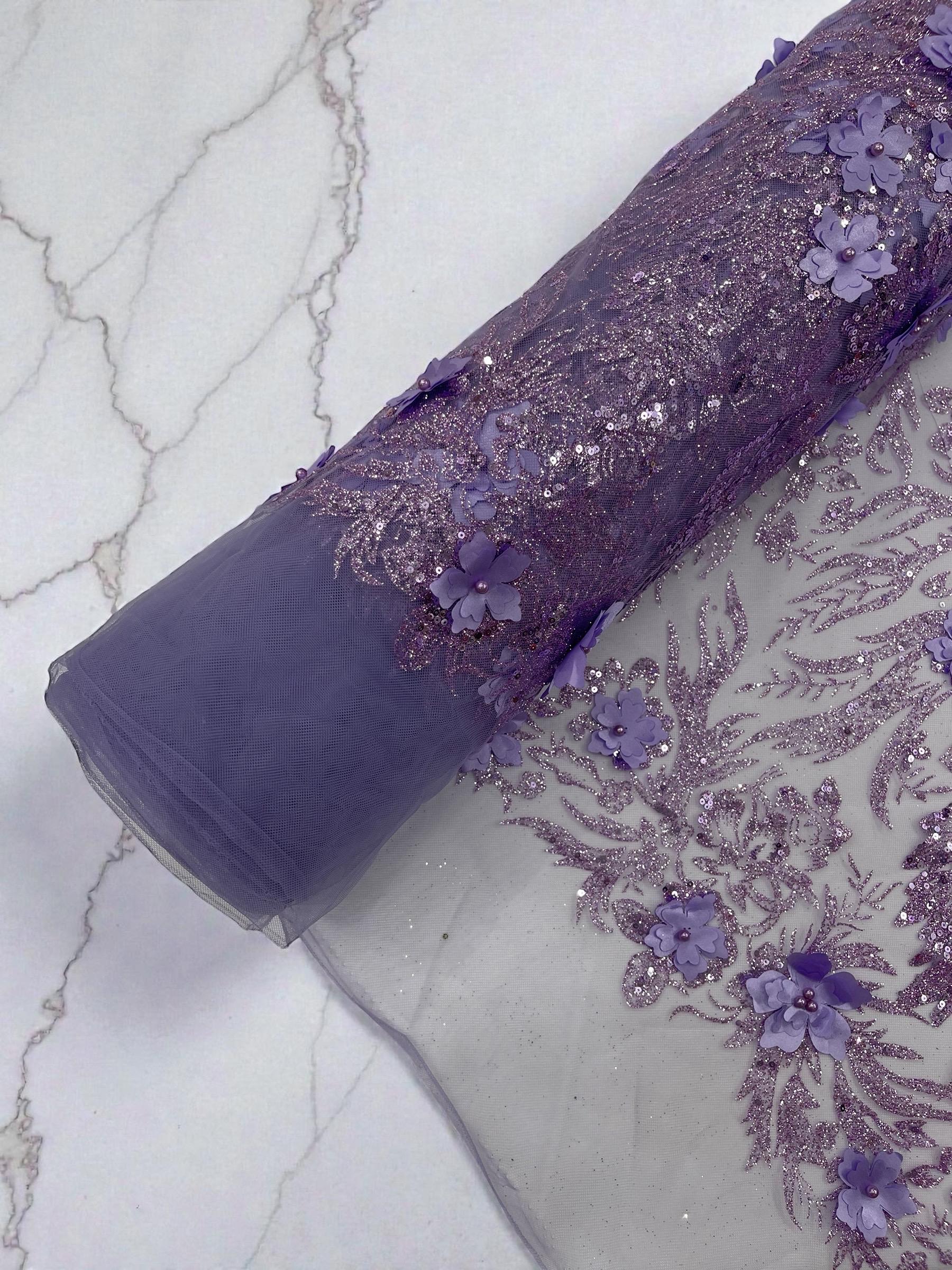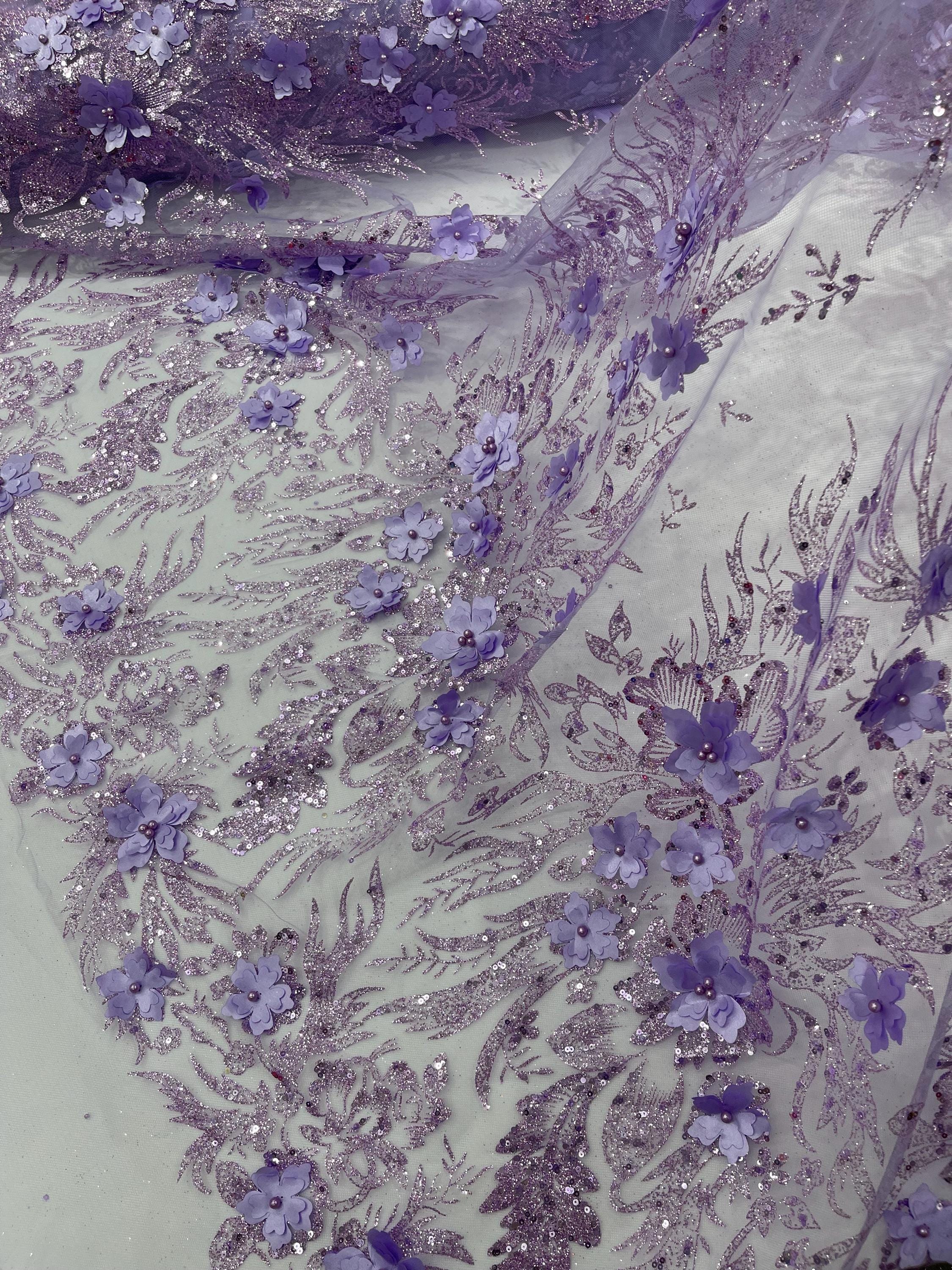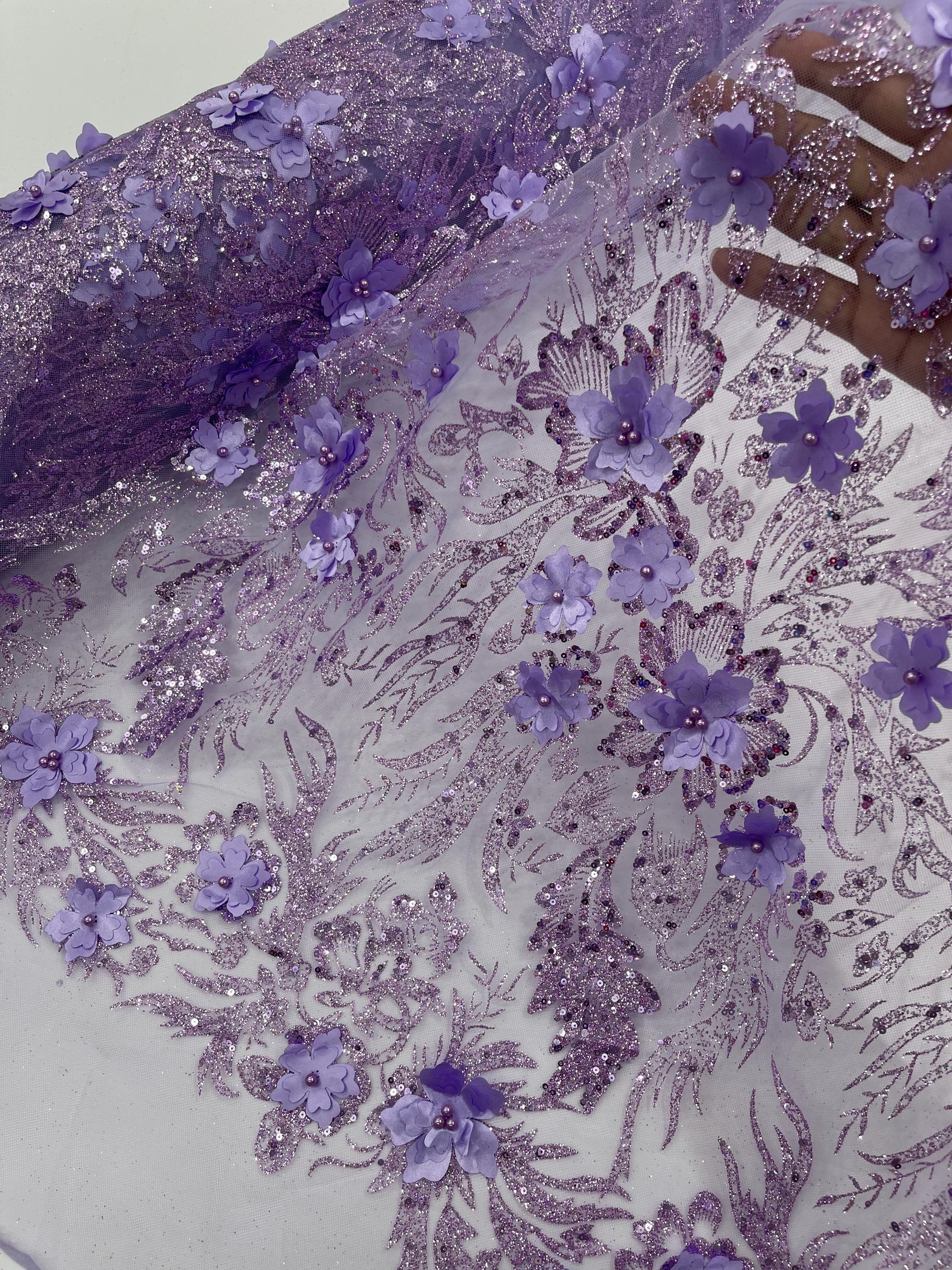 Lilac Glitter Floral Mesh, Glitter 3D Flower Sequin Fabric, Wedding Dresses & Quinseñera