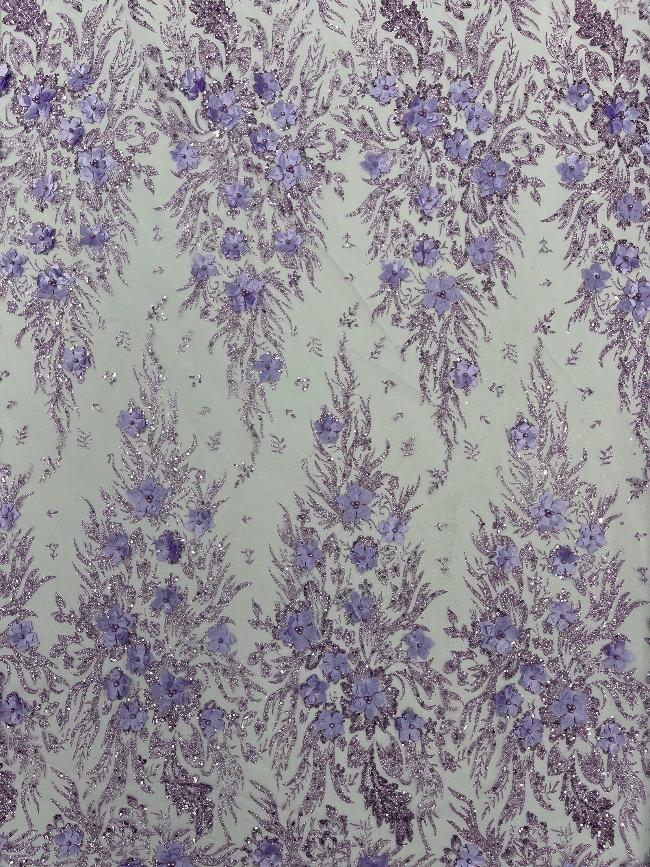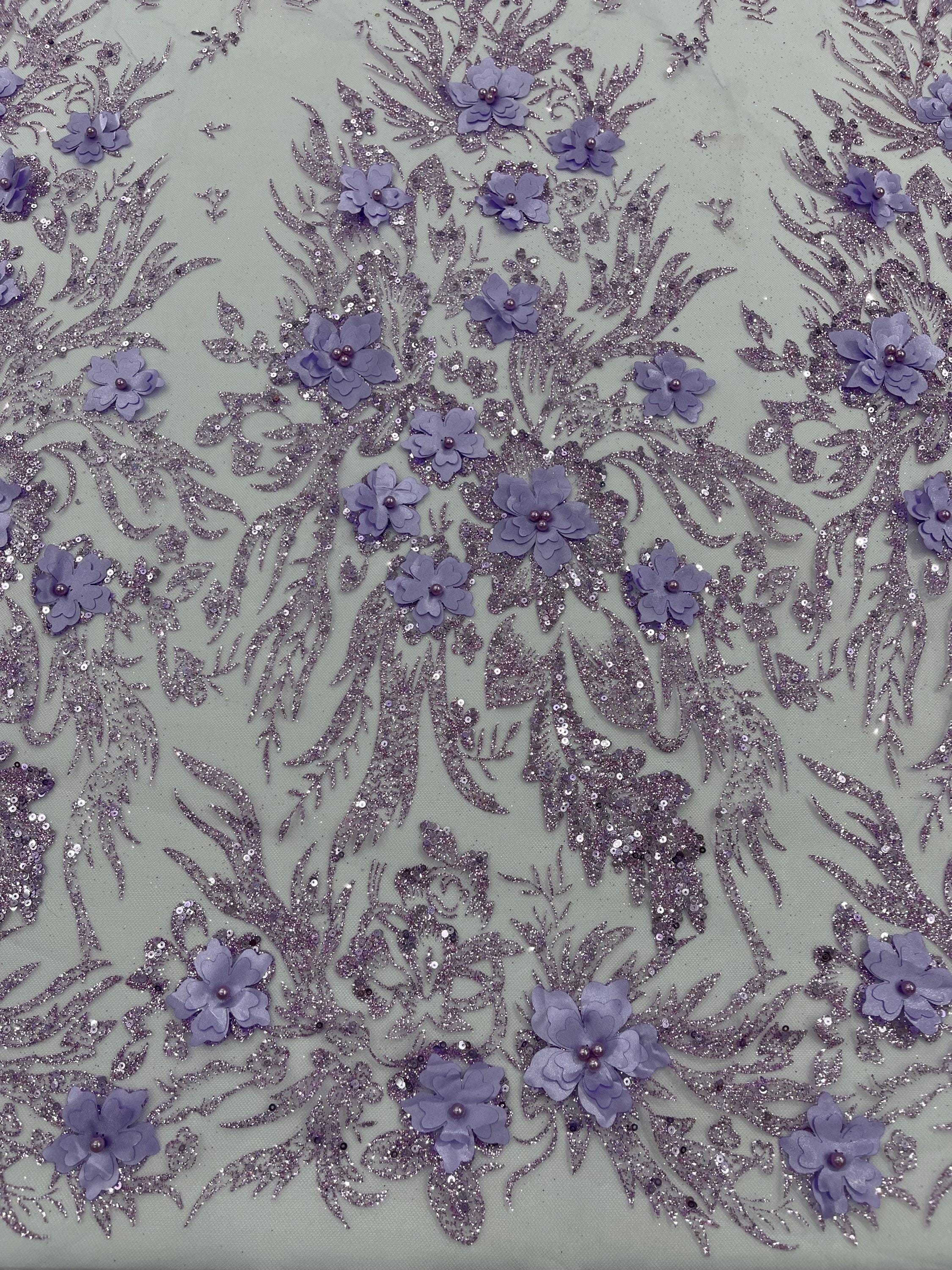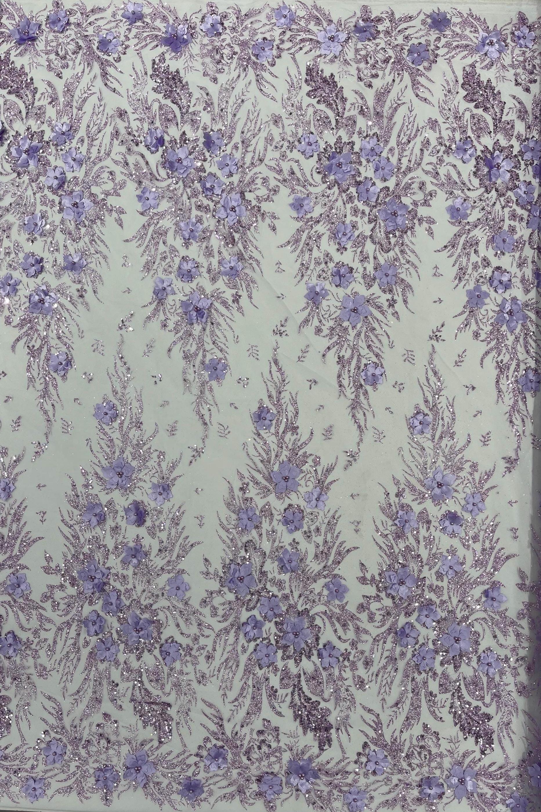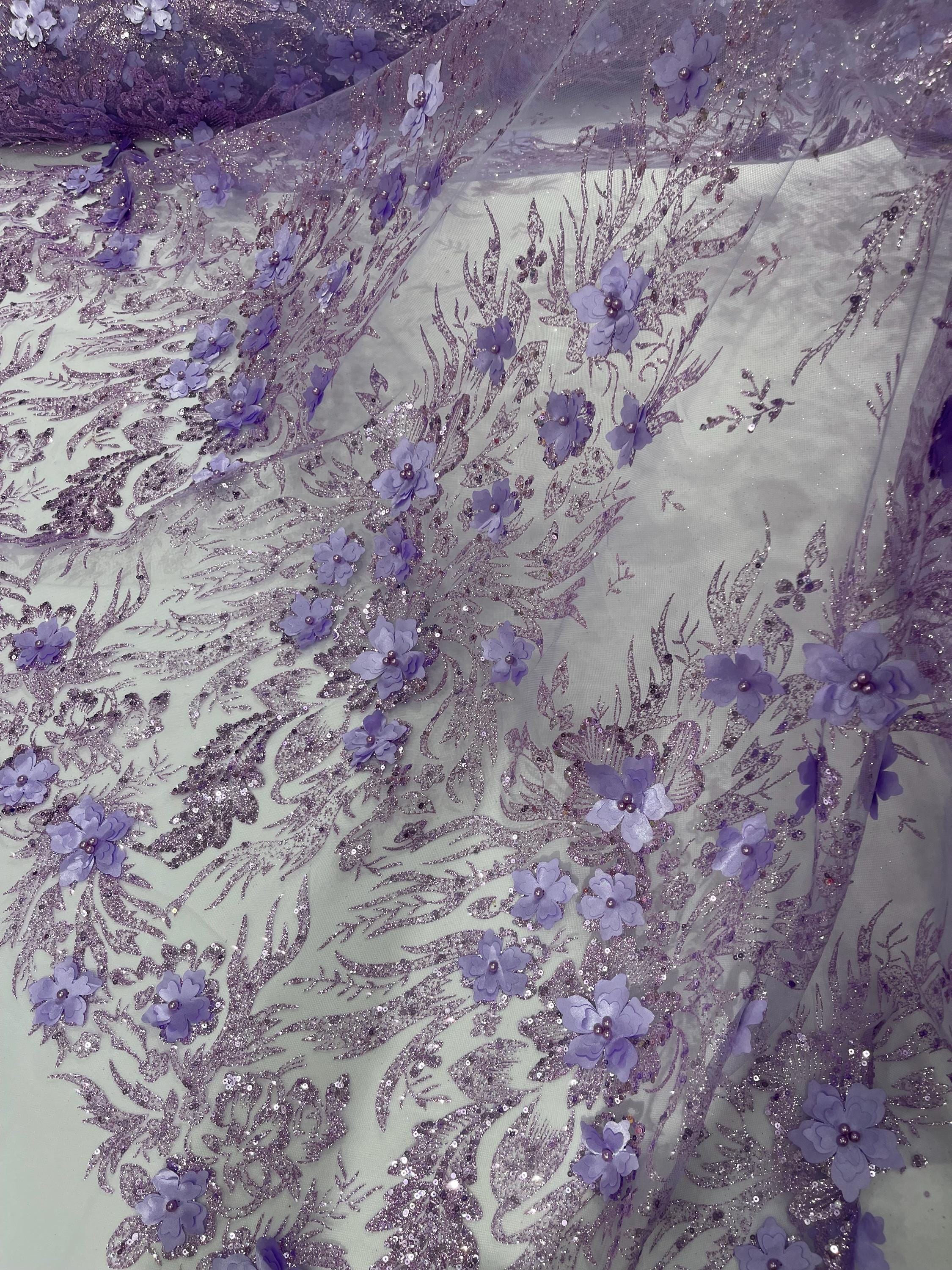 Lilac Glitter Floral Mesh, Glitter 3D Flower Sequin Fabric, Wedding Dresses & Quinseñera