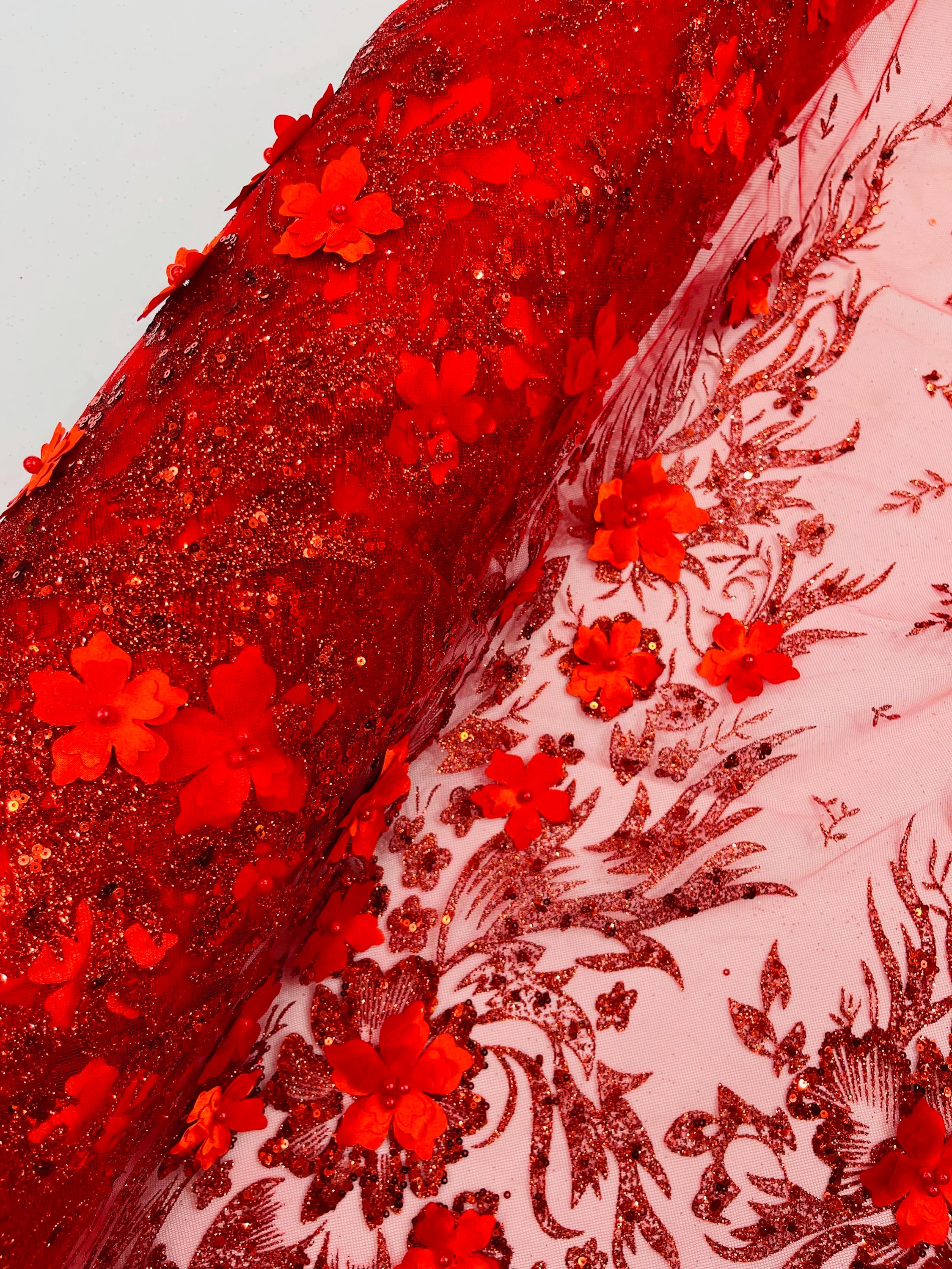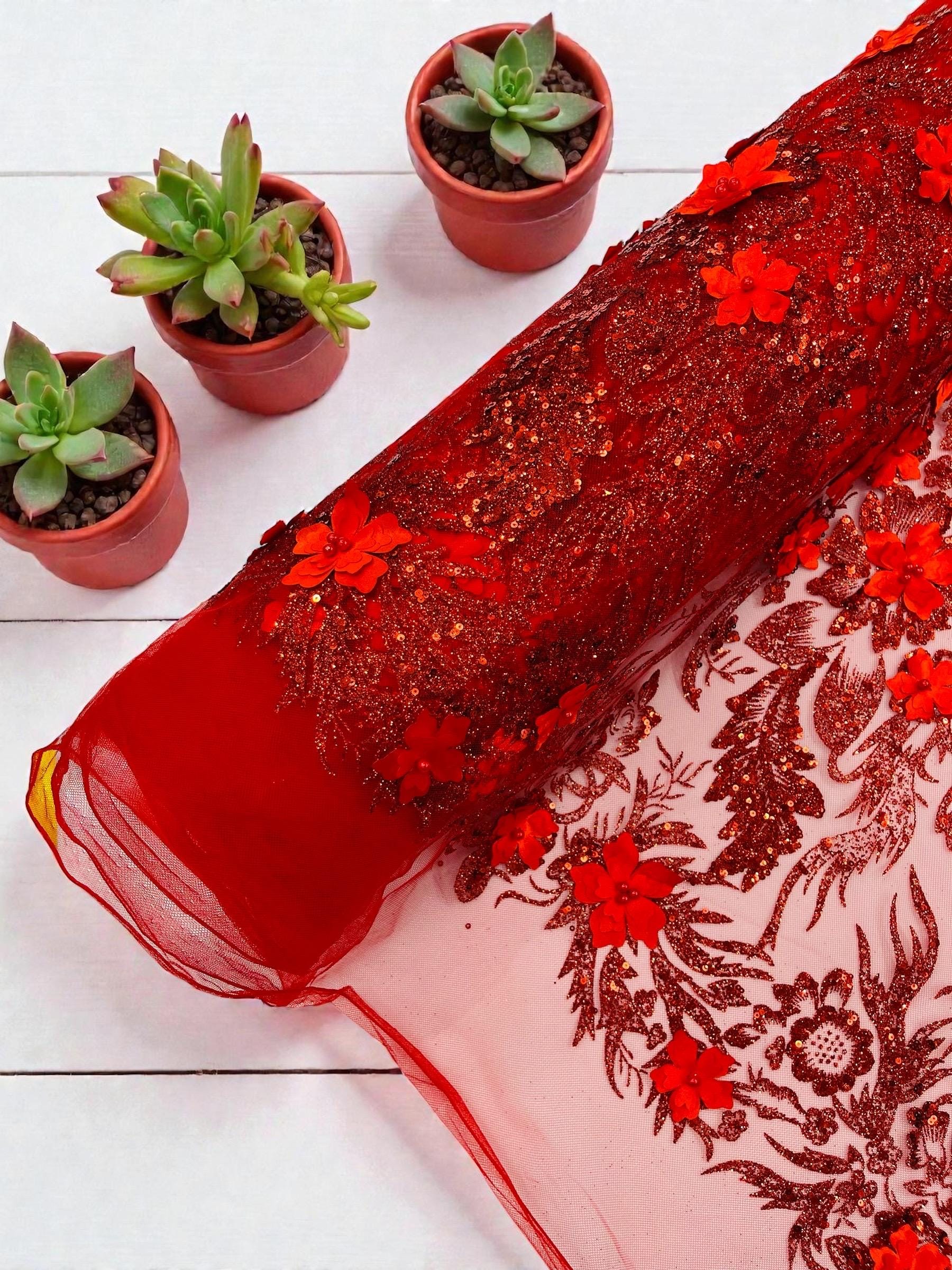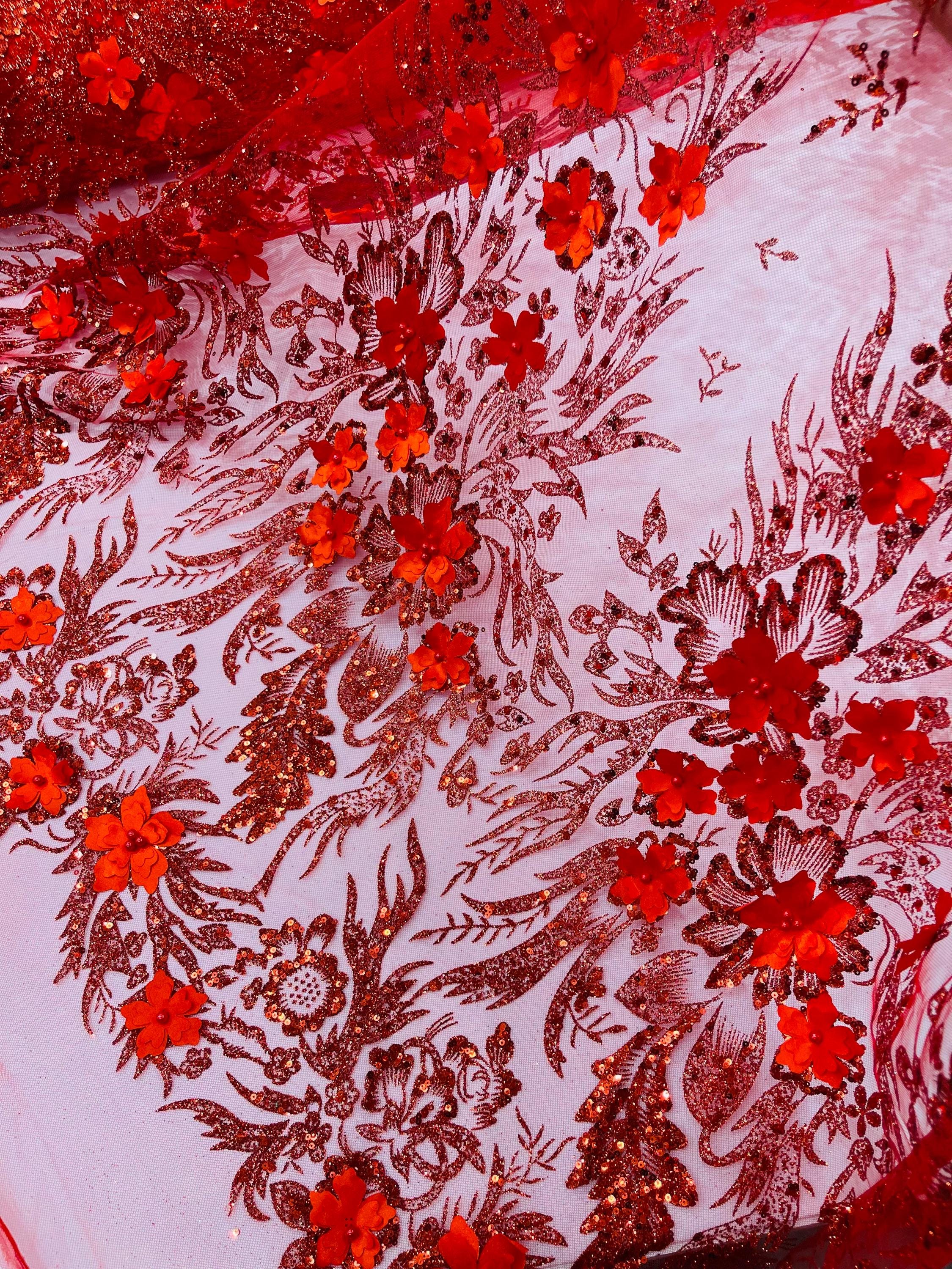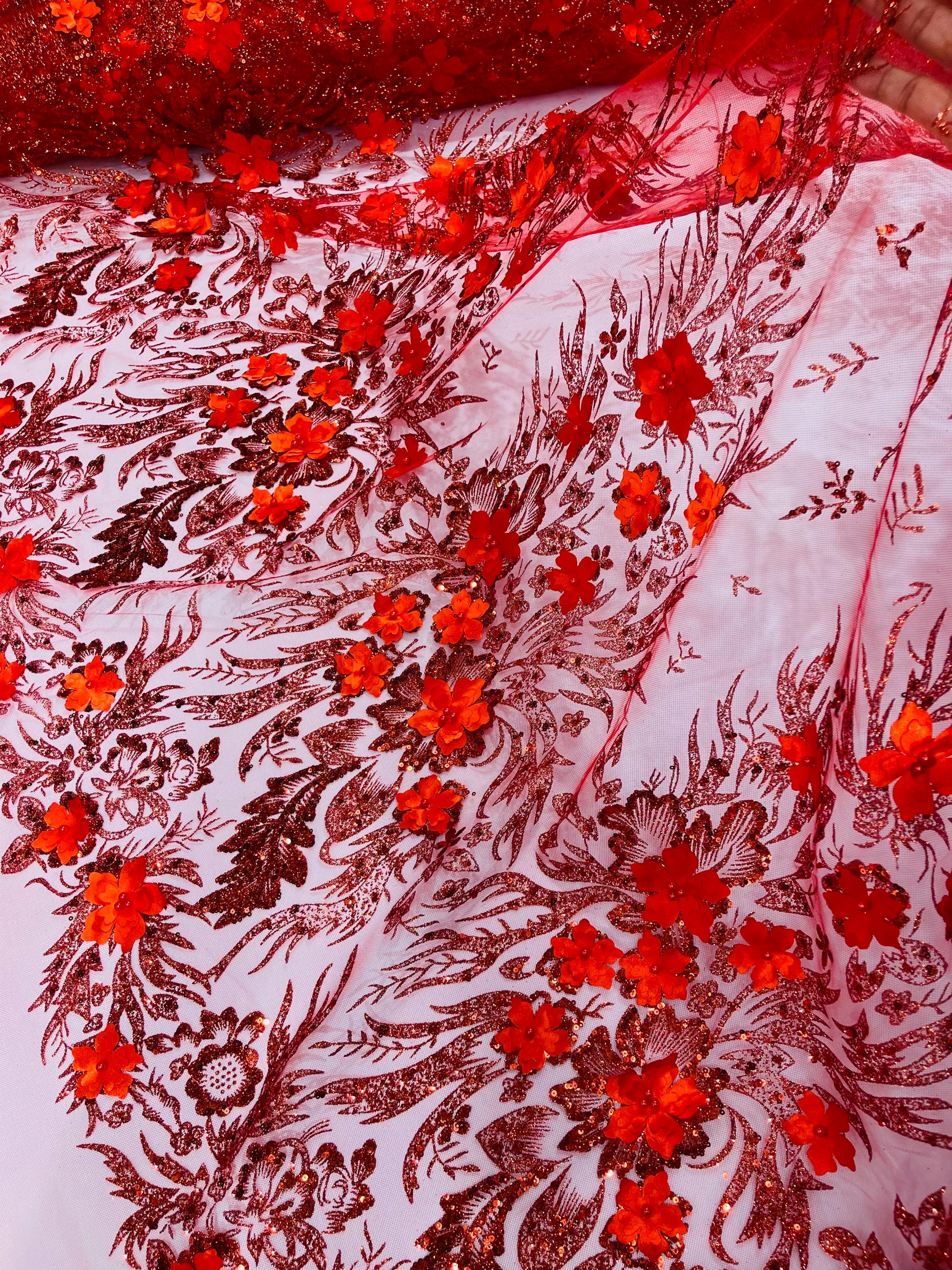 Red Glitter Floral Mesh, Glitter 3D Flower Sequin Fabric, Wedding Dresses & Quinseñera