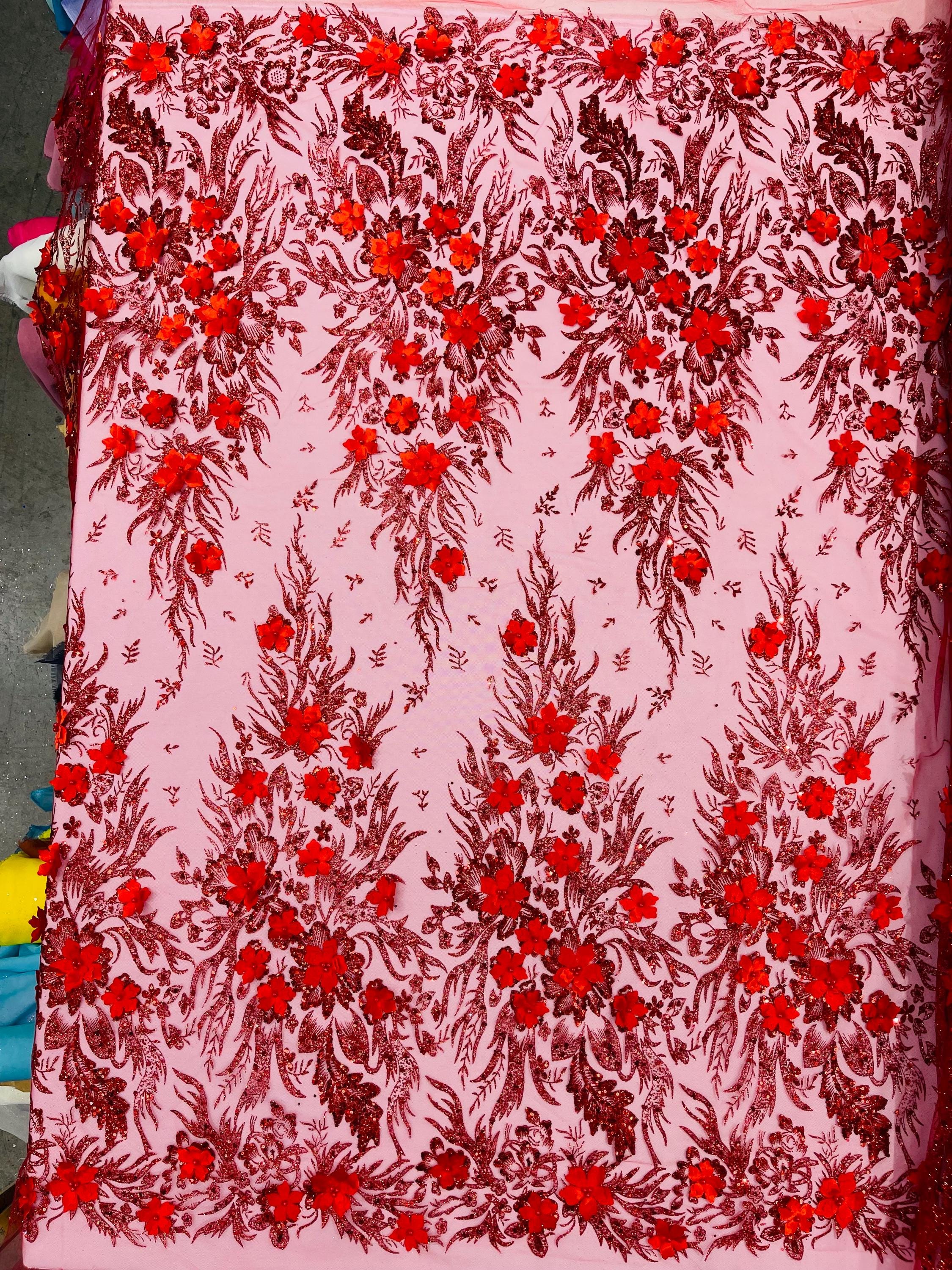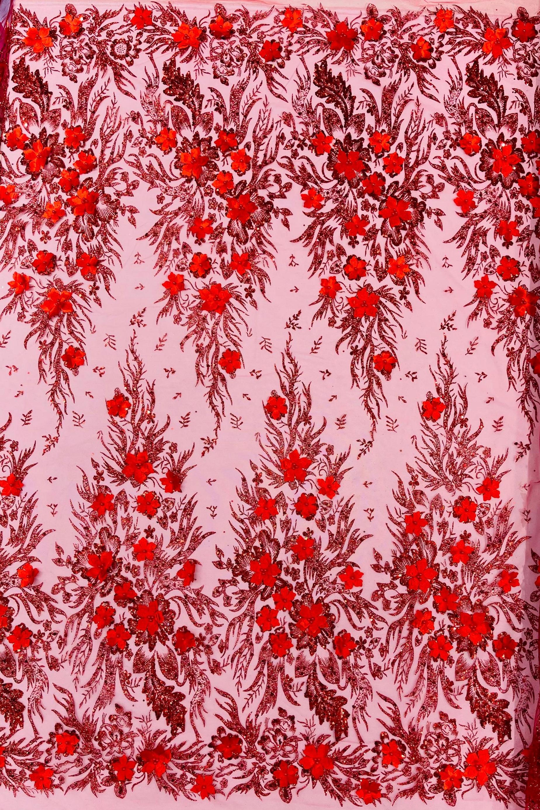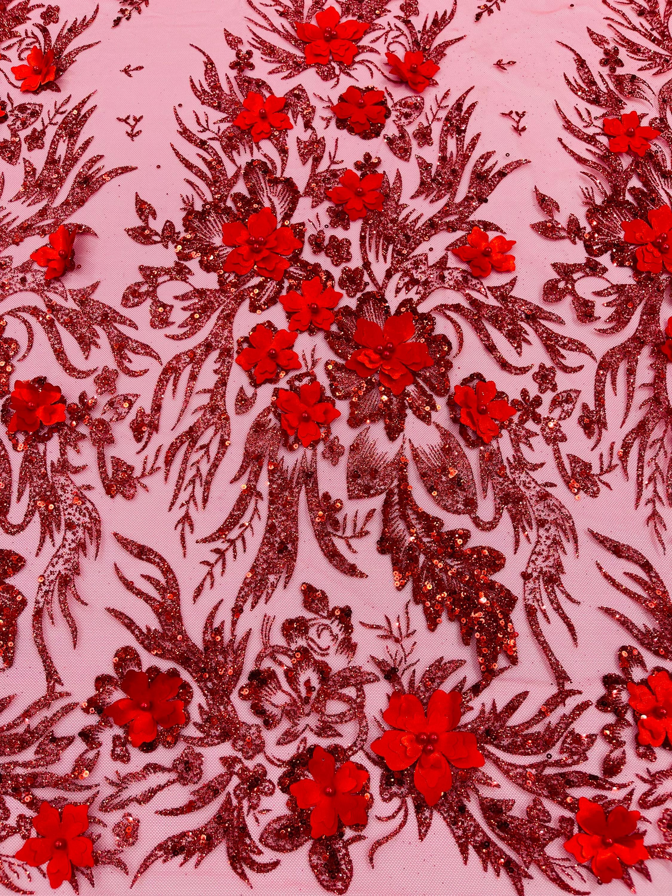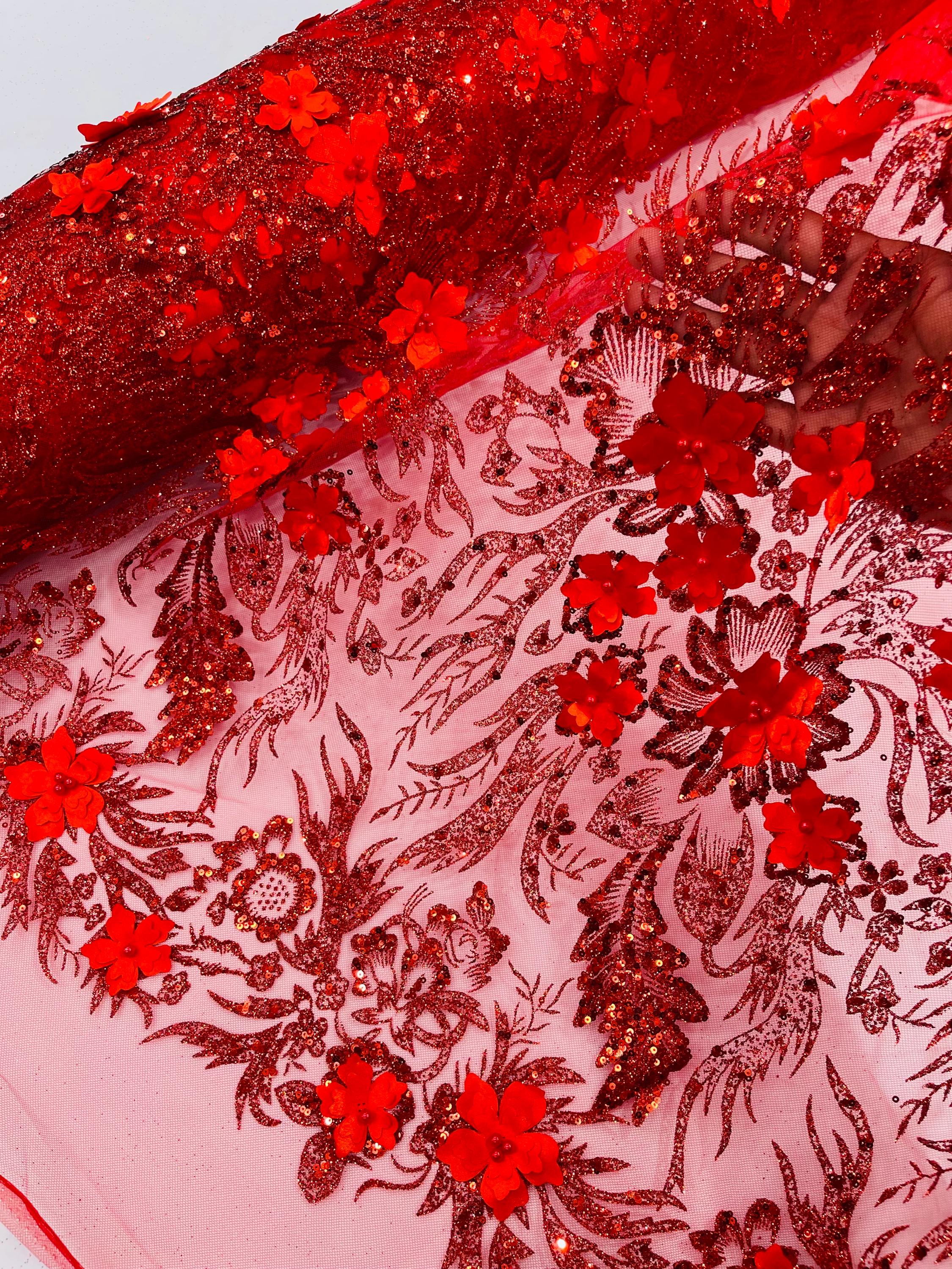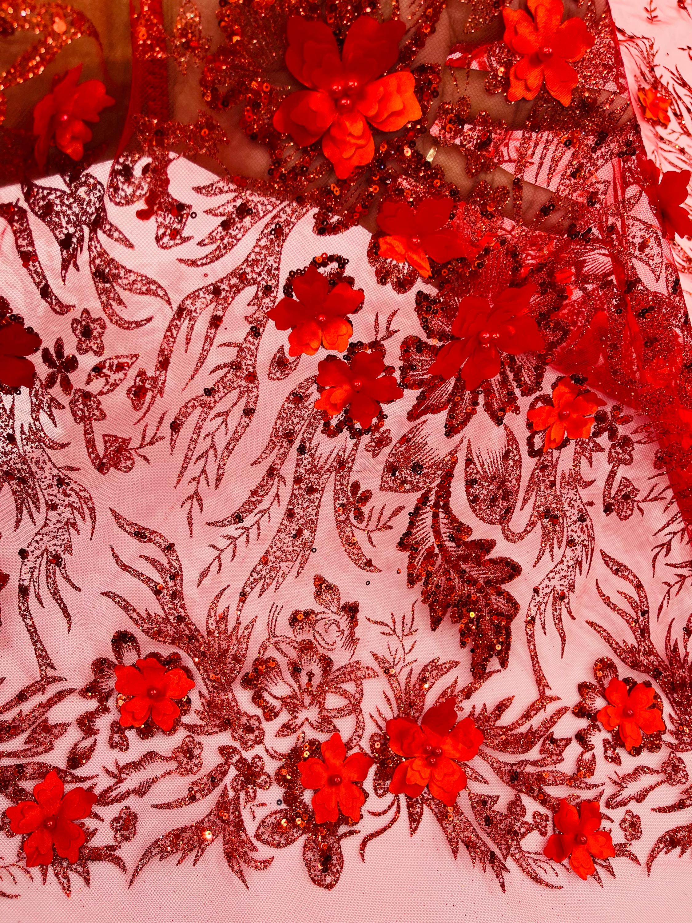Red Glitter Floral Mesh, Glitter 3D Flower Sequin Fabric, Wedding Dresses & Quinseñera