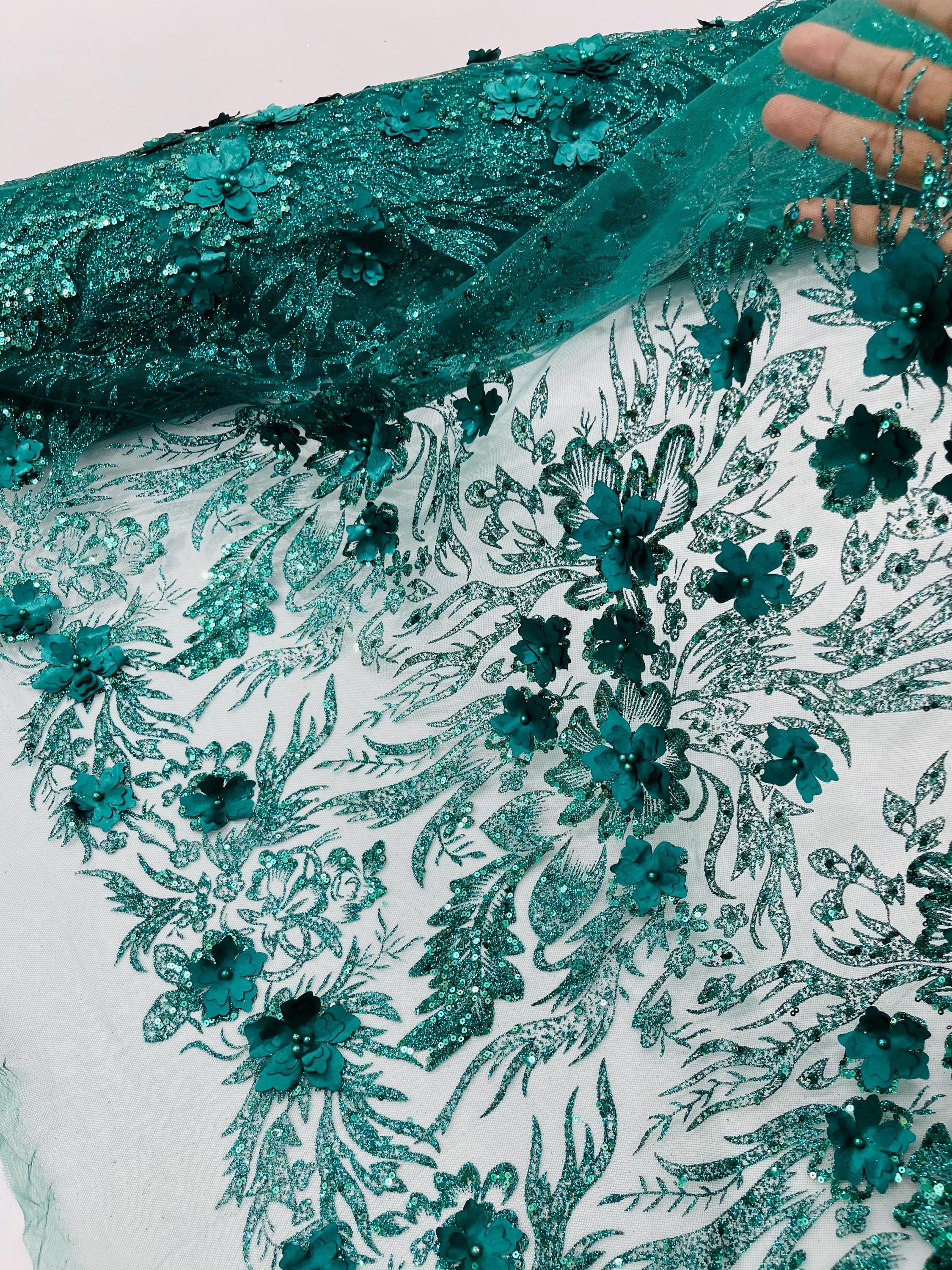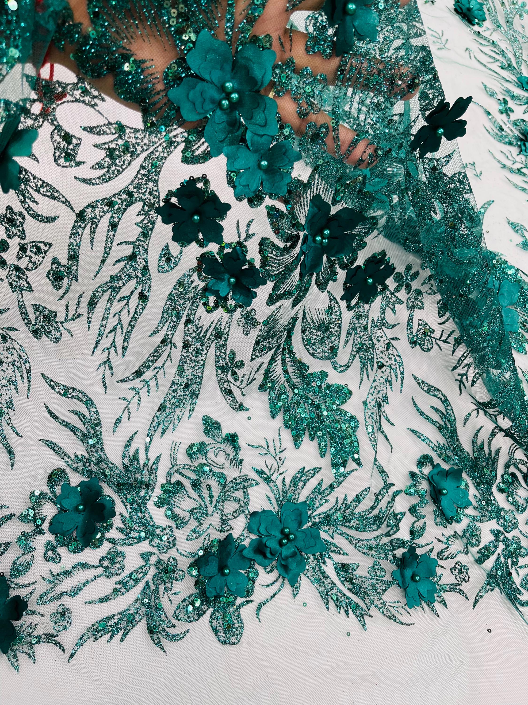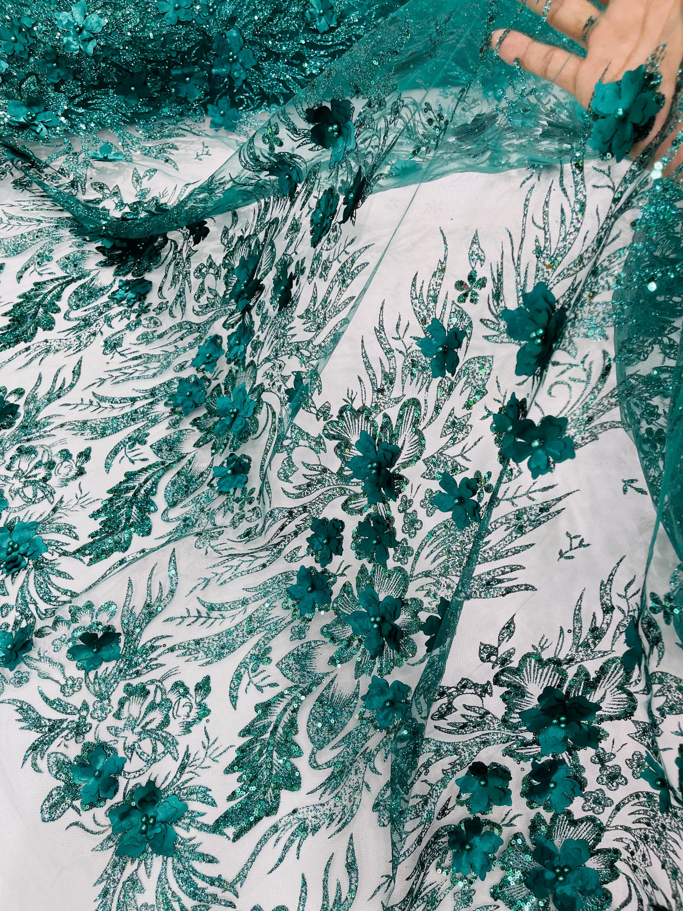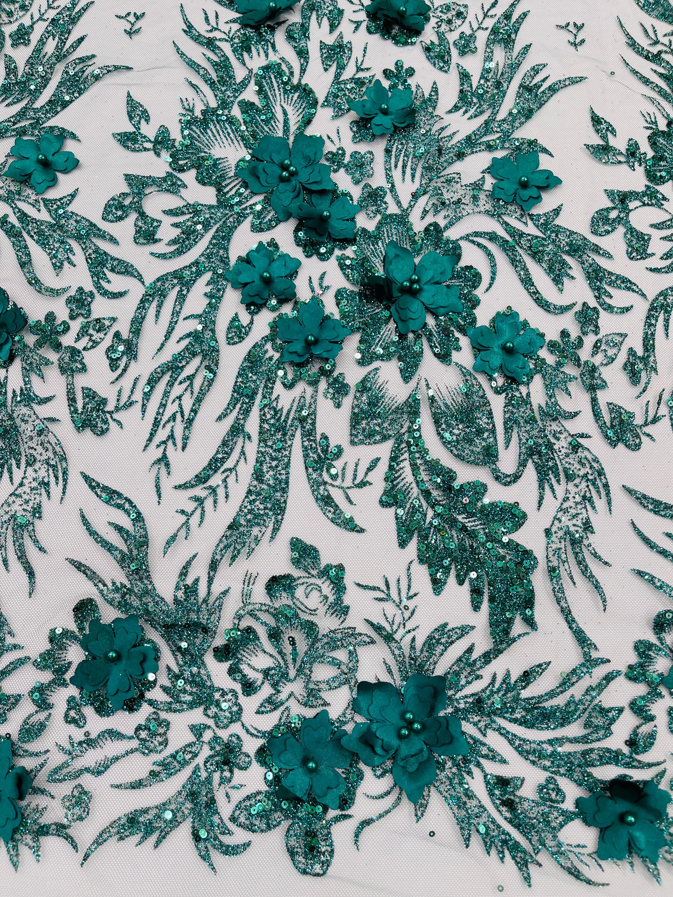 Hunter Green Glitter Floral Mesh, Glitter 3D Flower Sequin Fabric, Wedding Dresses & Quinseñera