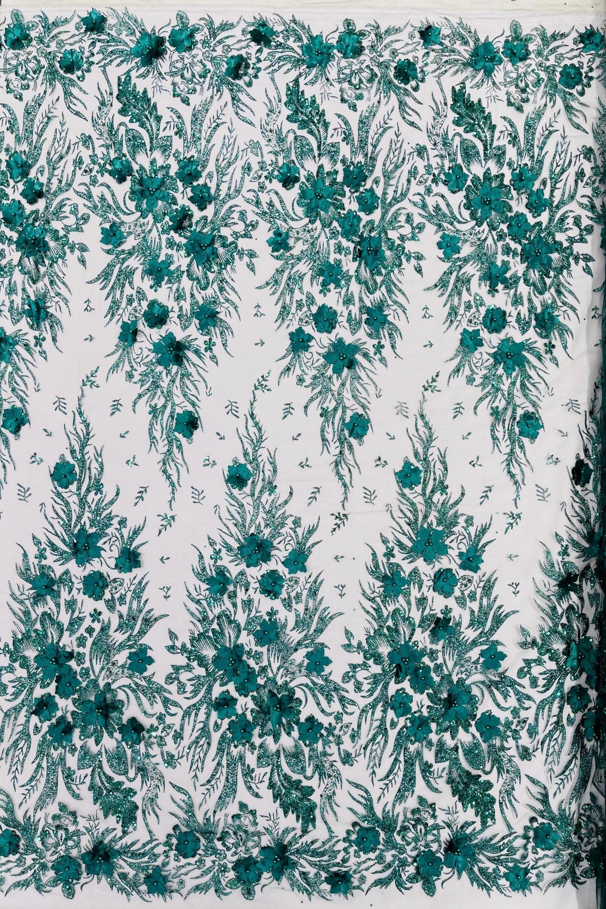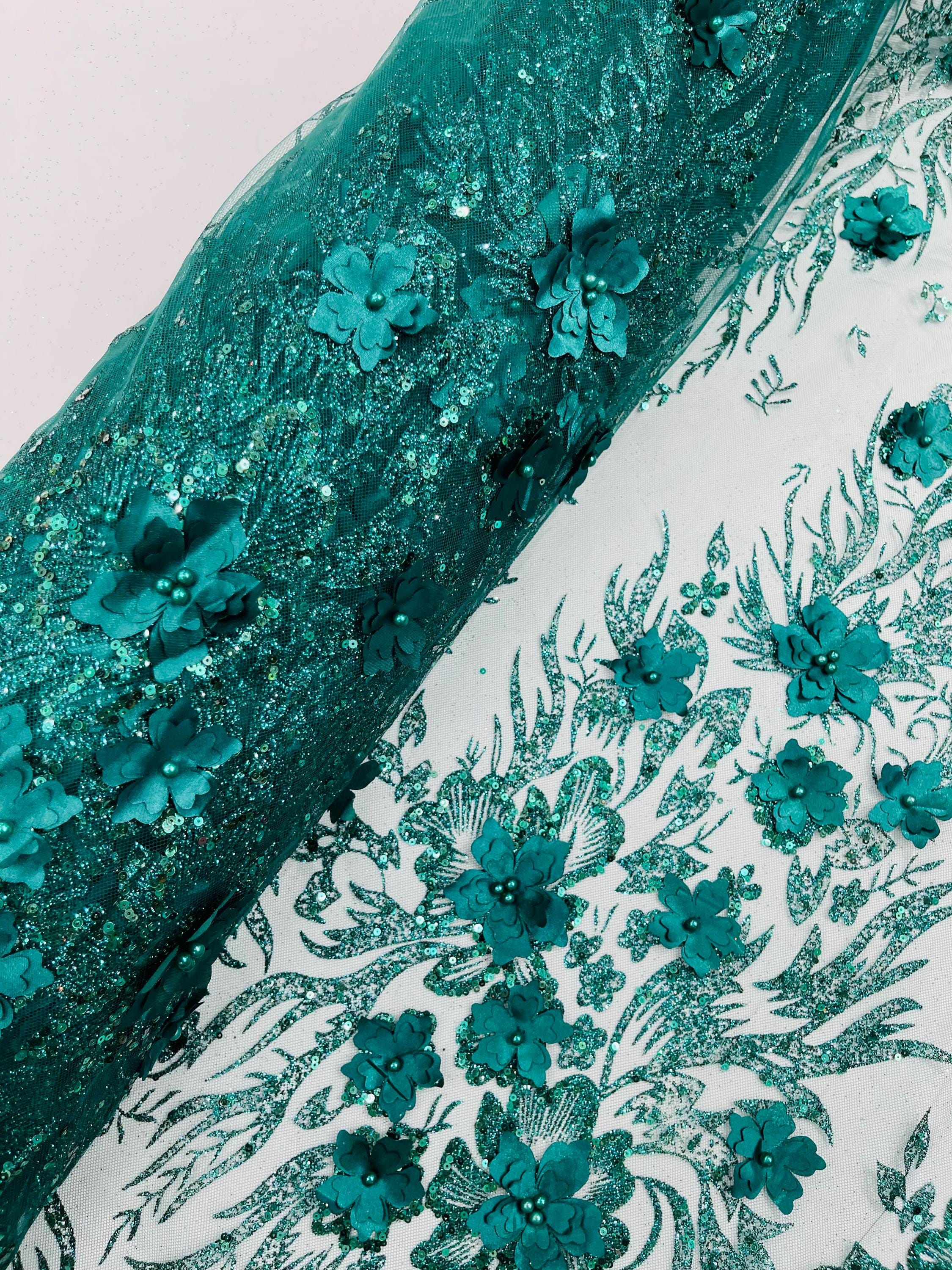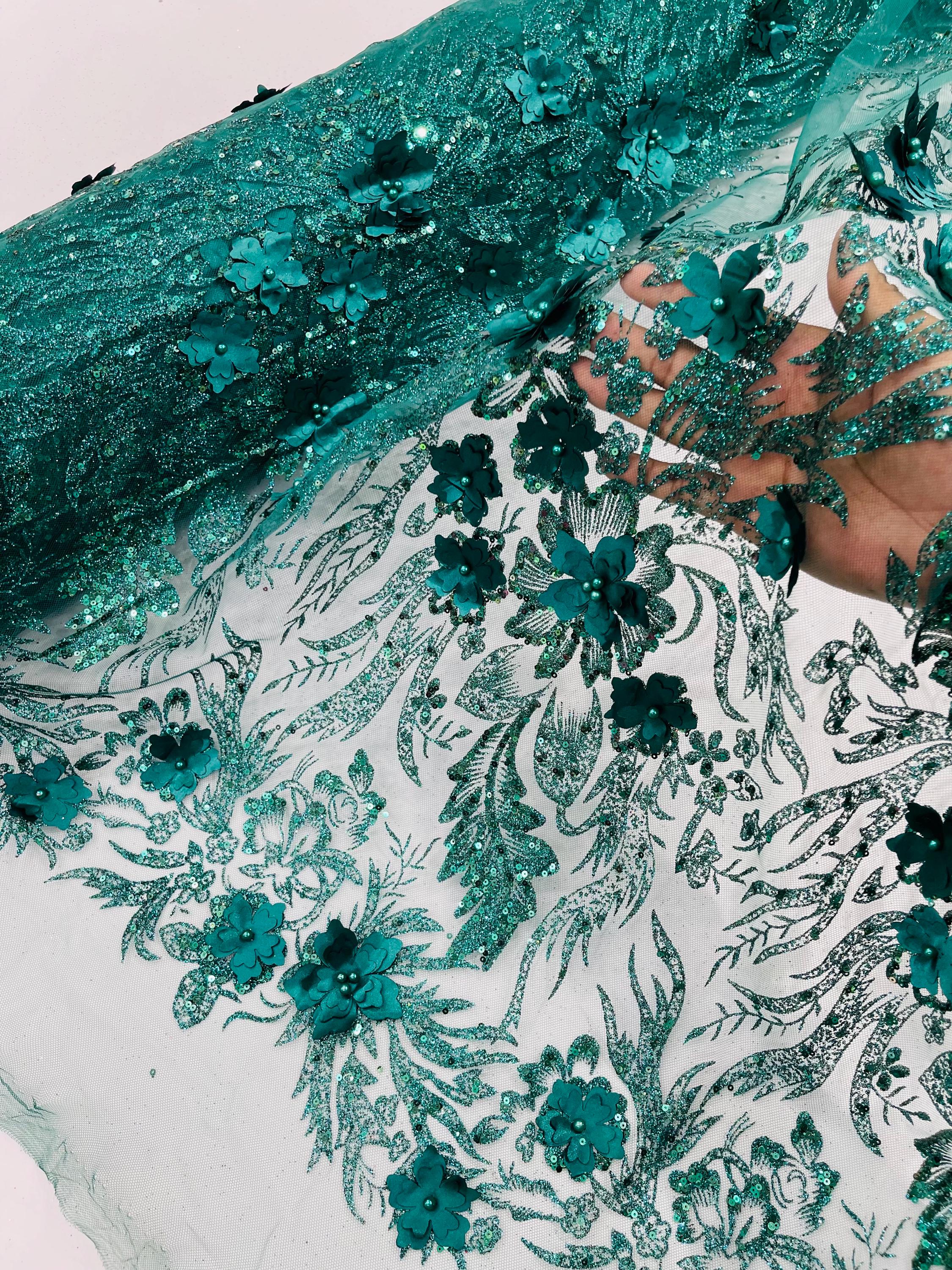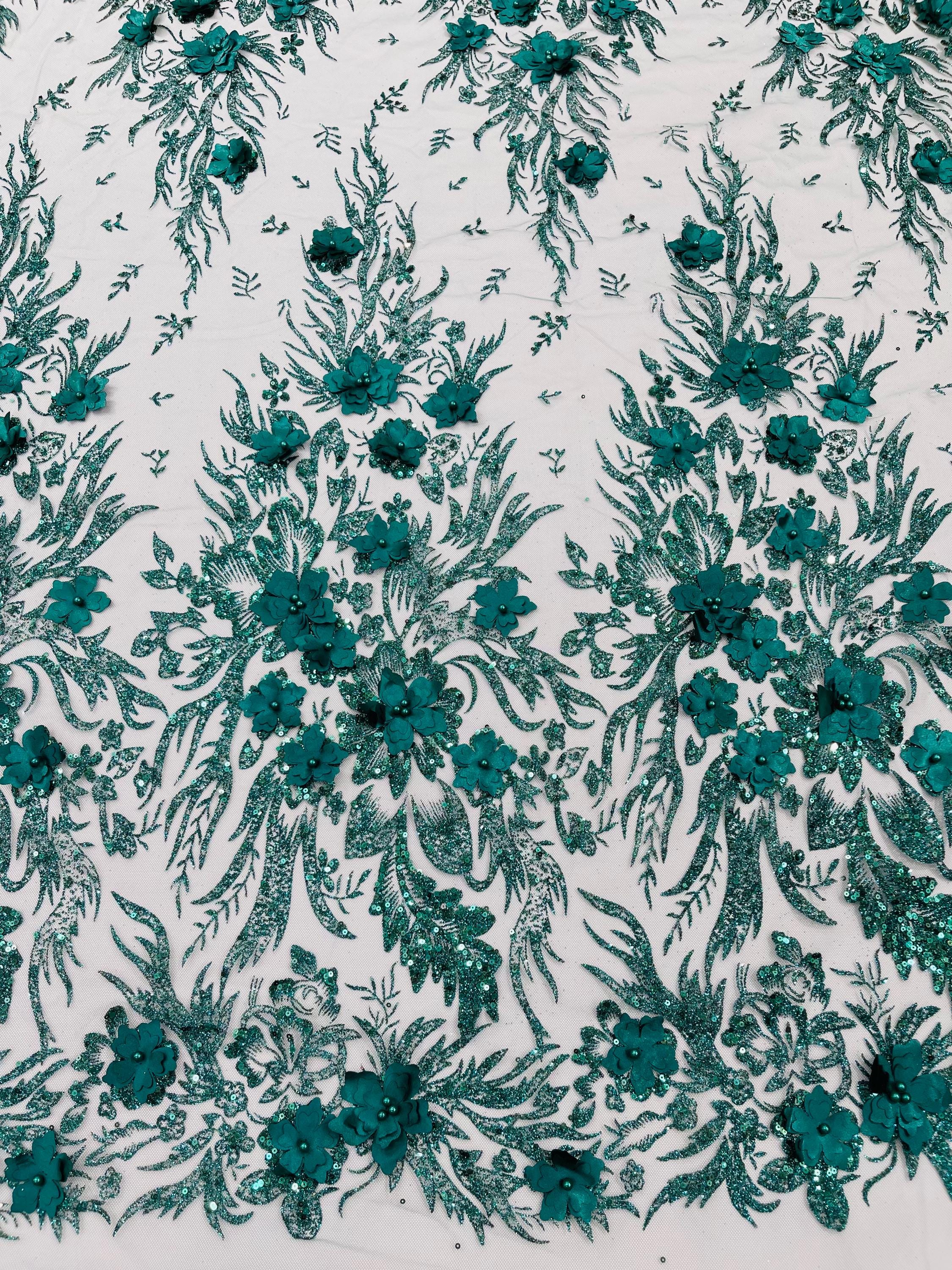 Hunter Green Glitter Floral Mesh, Glitter 3D Flower Sequin Fabric, Wedding Dresses & Quinseñera