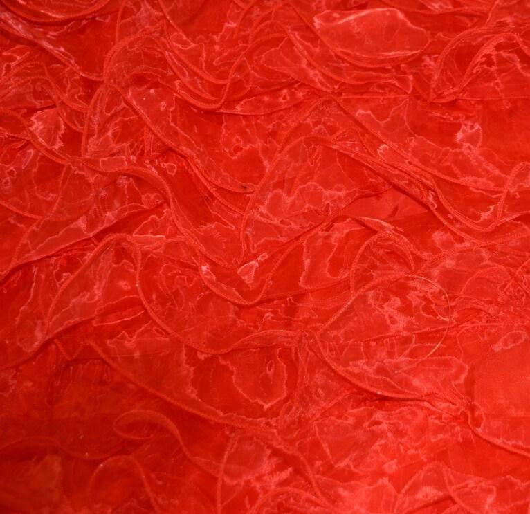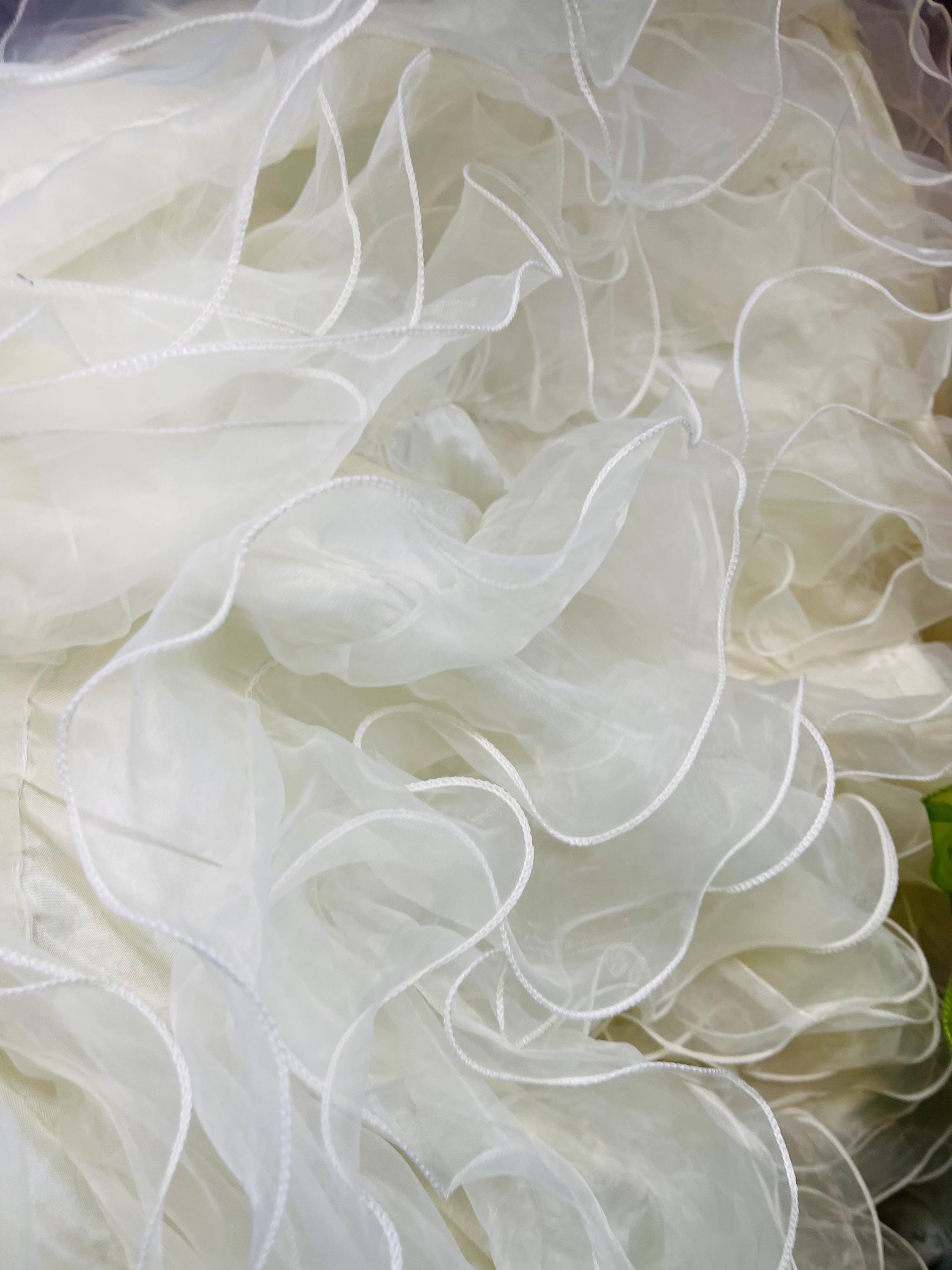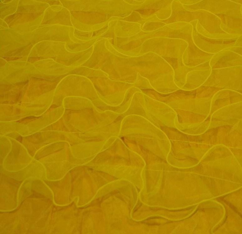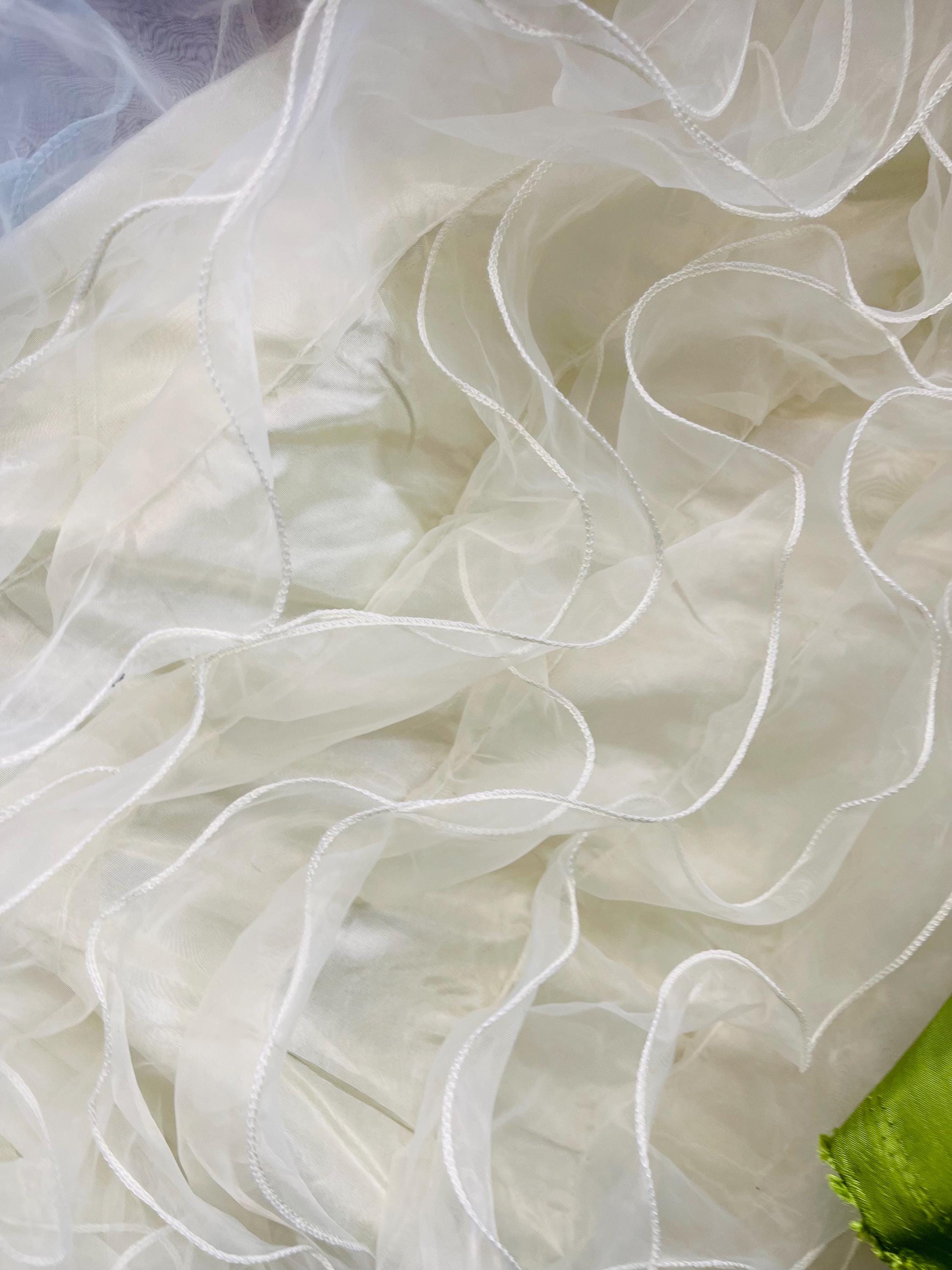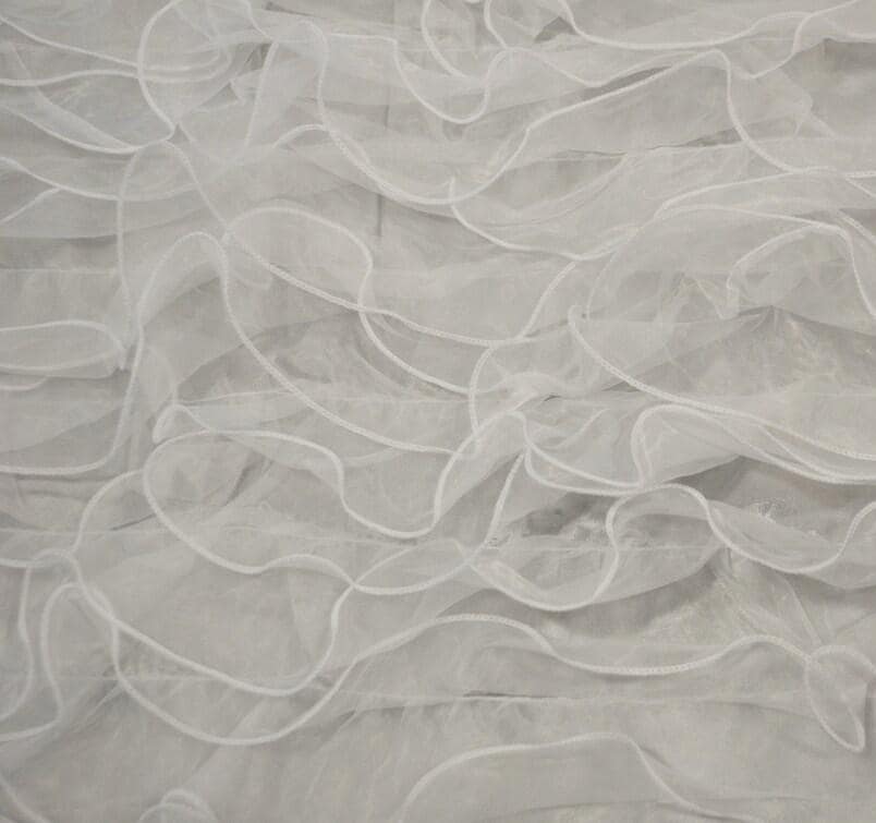 Organza Ruffle Design Embroidered on Taffeta Backing is a transparent fabric that is used to make fabric for formal wear and ribbon. It is a thin poly mesh fabric that is accented and designed with puffy waves that resemble ruffle shapes making it ideal for puffy dresses and high end gowns. This carries a very elegant and extravagant style that will surely amaze you. There are also many uses for this fabric in sewing and crafting projects.