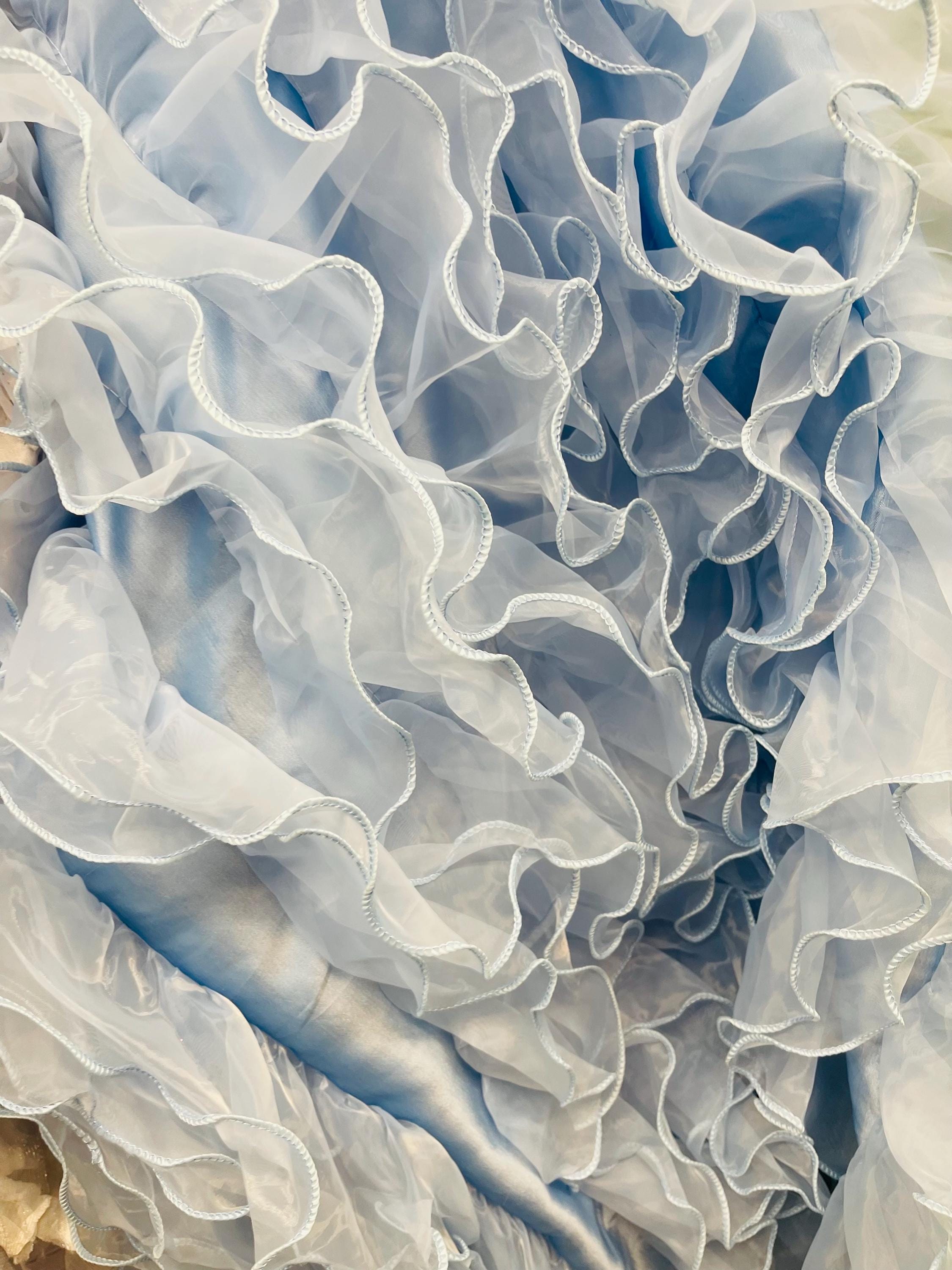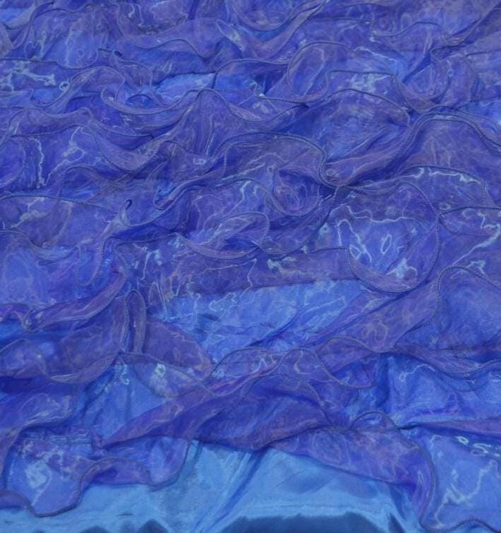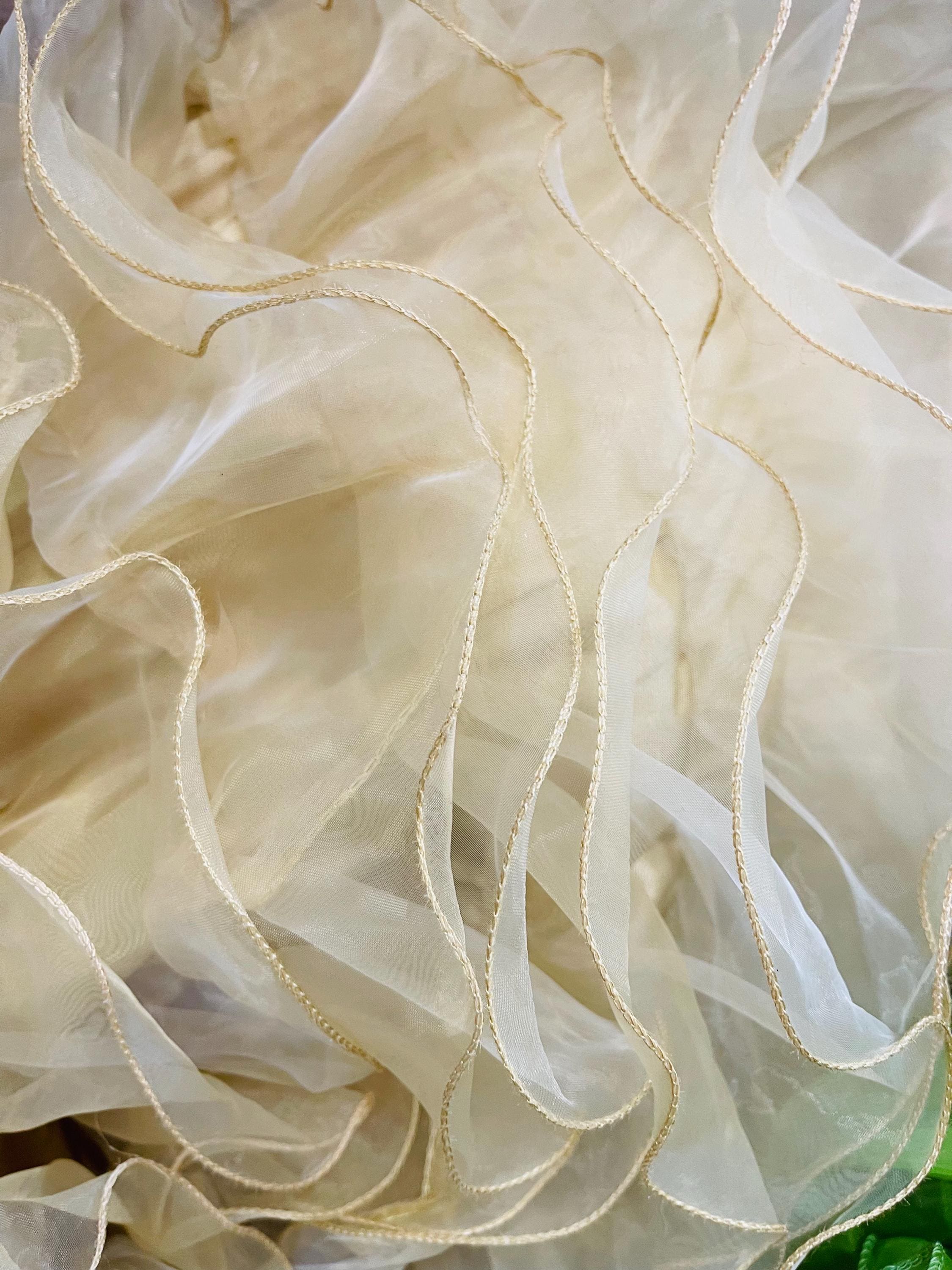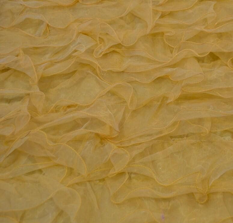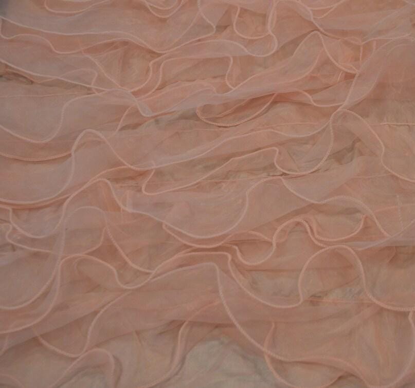 Organza Ruffle Design Embroidered on Taffeta Backing is a transparent fabric that is used to make fabric for formal wear and ribbon. It is a thin poly mesh fabric that is accented and designed with puffy waves that resemble ruffle shapes making it ideal for puffy dresses and high end gowns. This carries a very elegant and extravagant style that will surely amaze you. There are also many uses for this fabric in sewing and crafting projects.