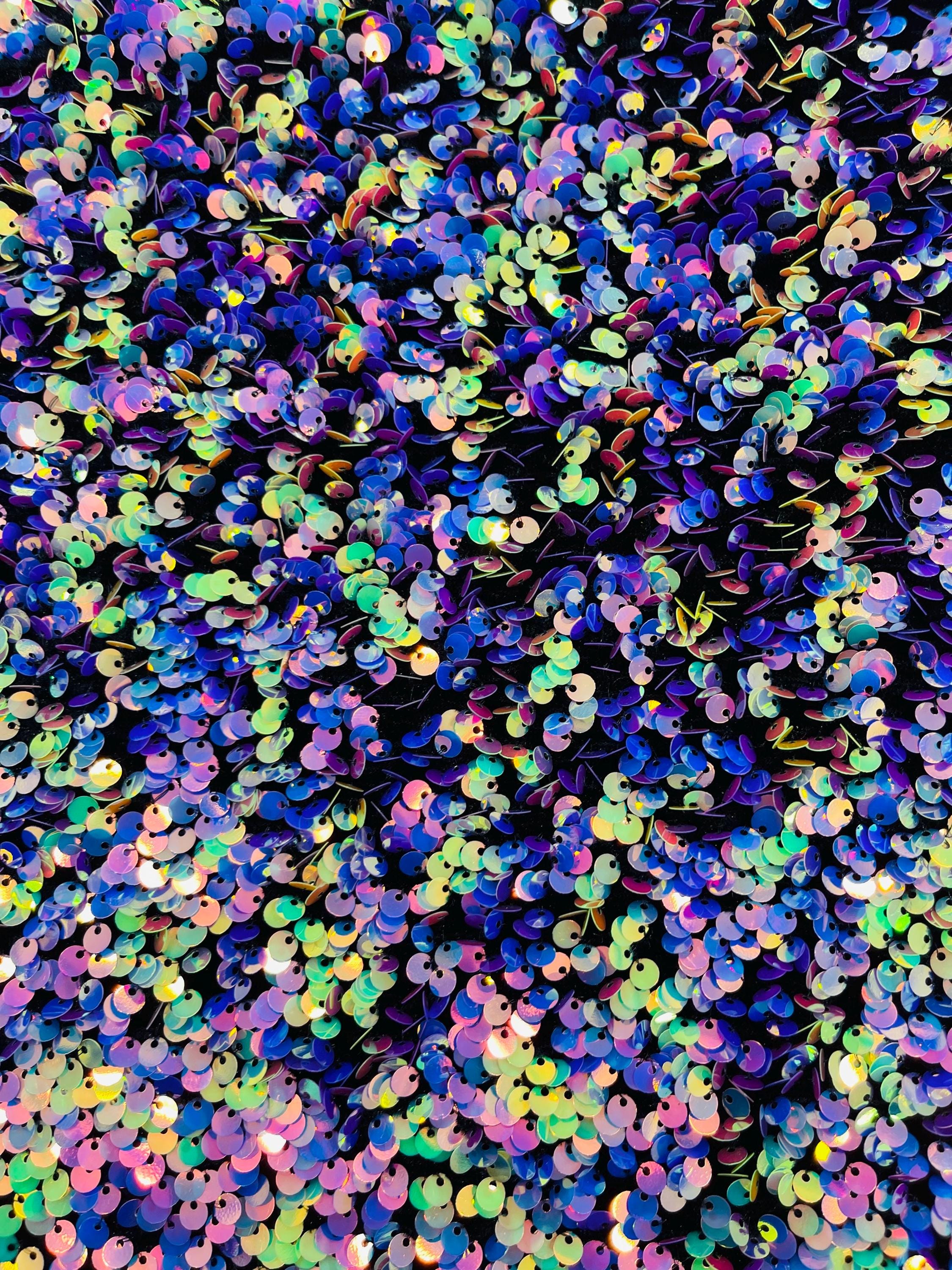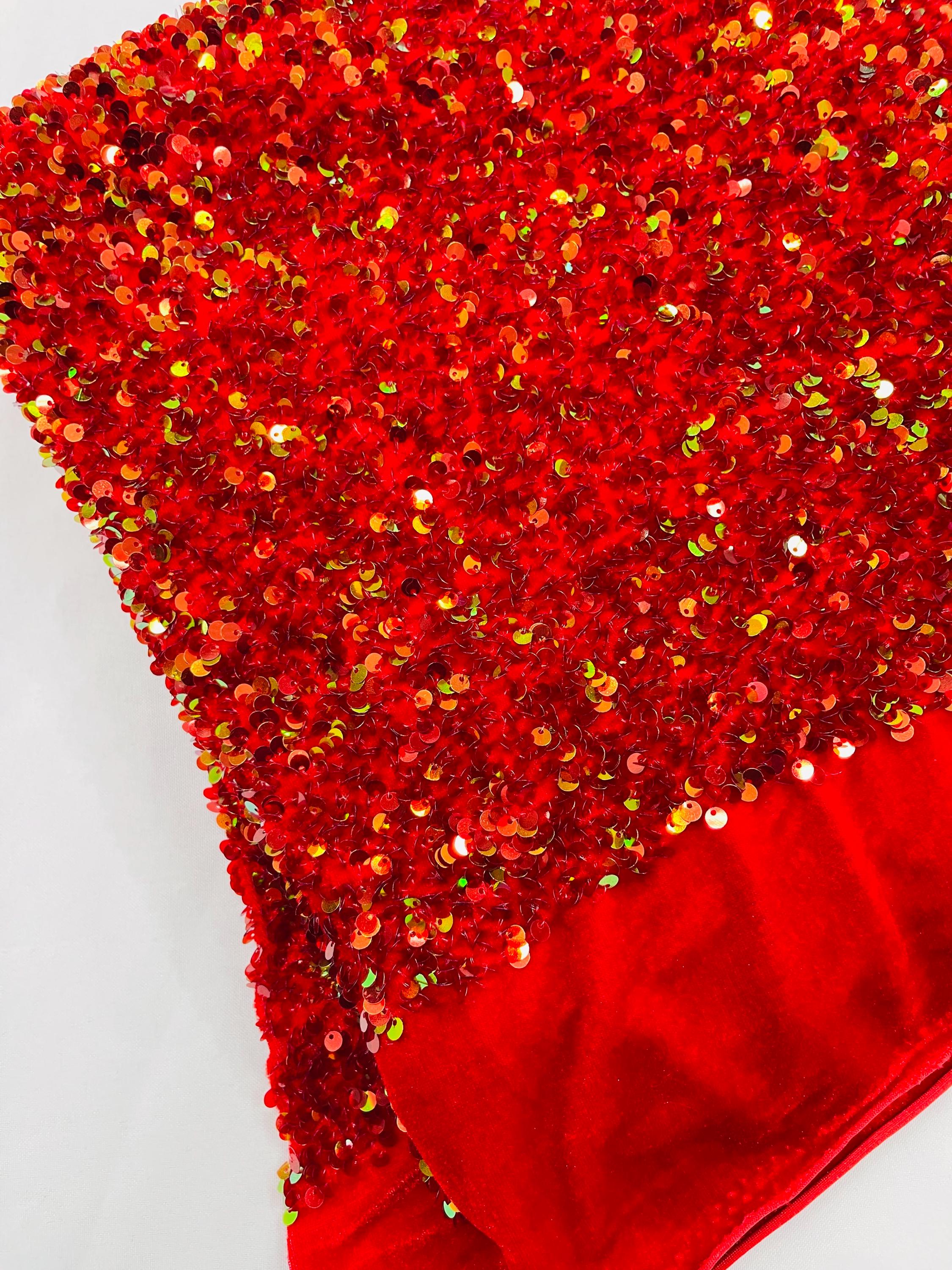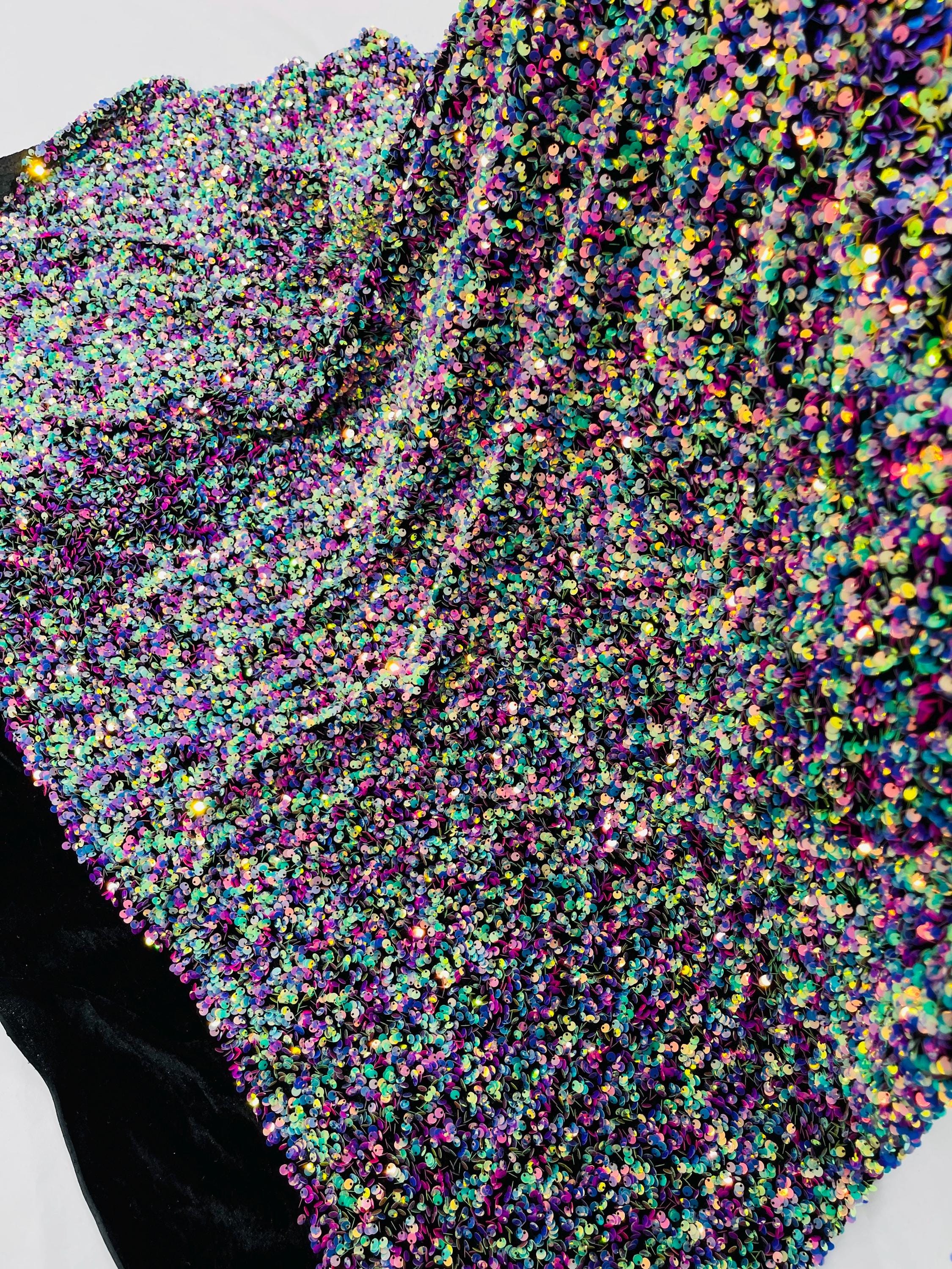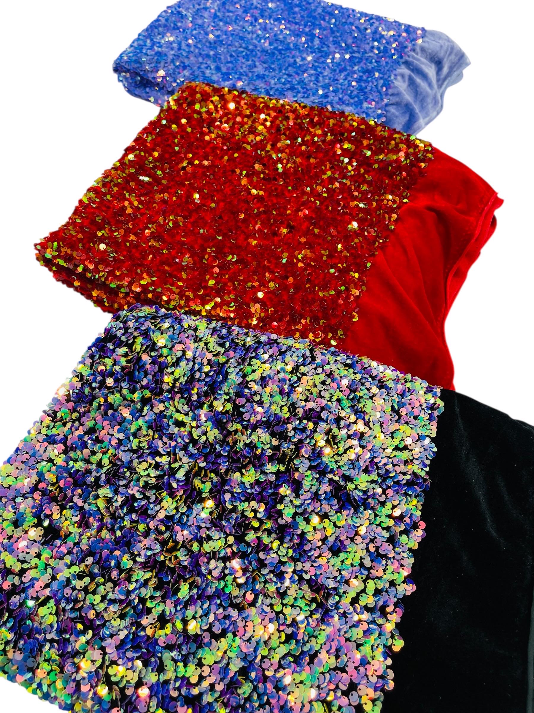 Sequin Collection is a stretch velvet fabric that has sequins embroidered throughout the whole fabric. This fabric is ideal for decorative and apparel purposes. The width of the velvet fabric is 60" and the sequins are embroidered at 58"/ 60". Item is sold by the yard. If more than one yard is purchased, item will come in one piece.