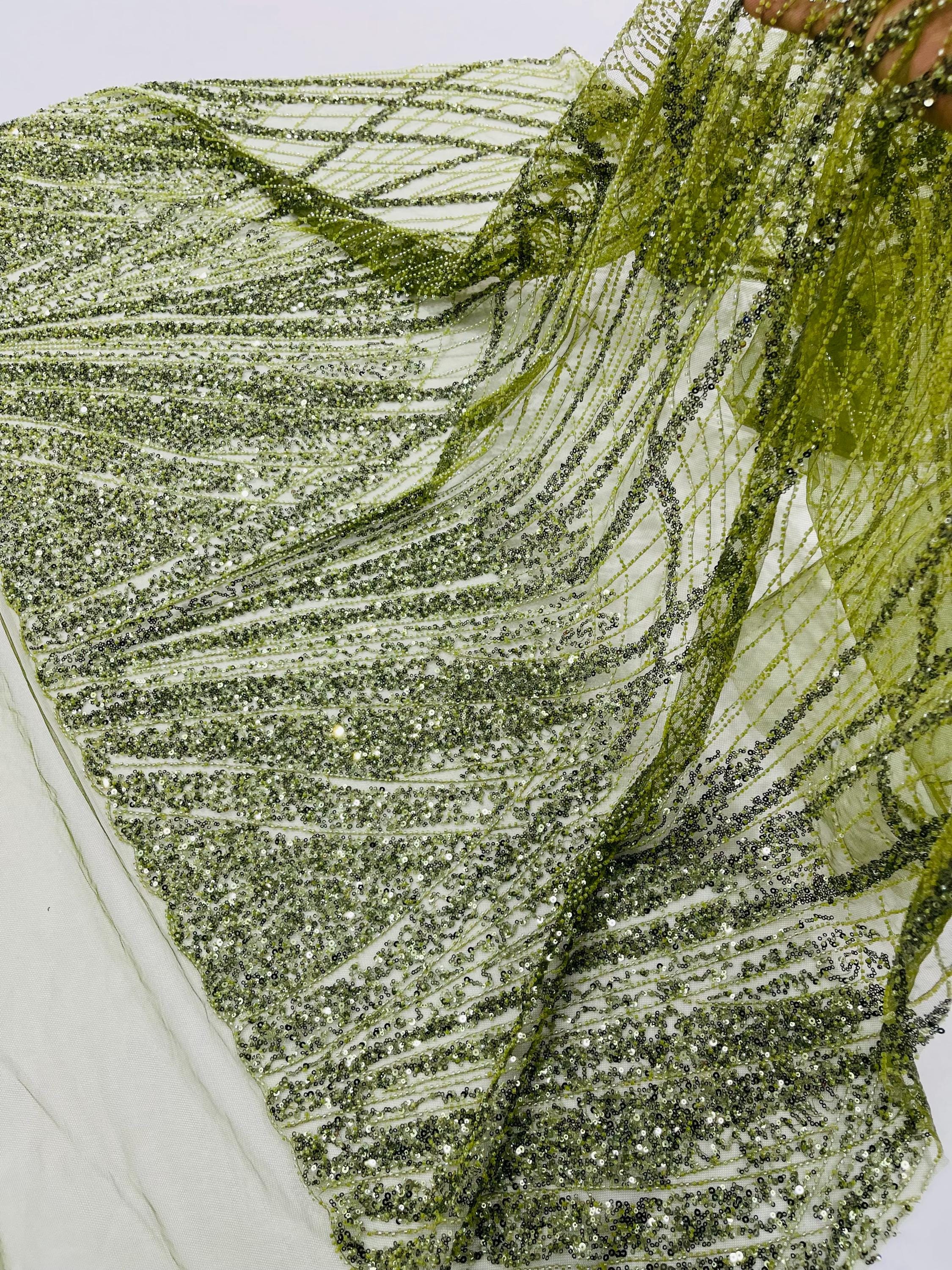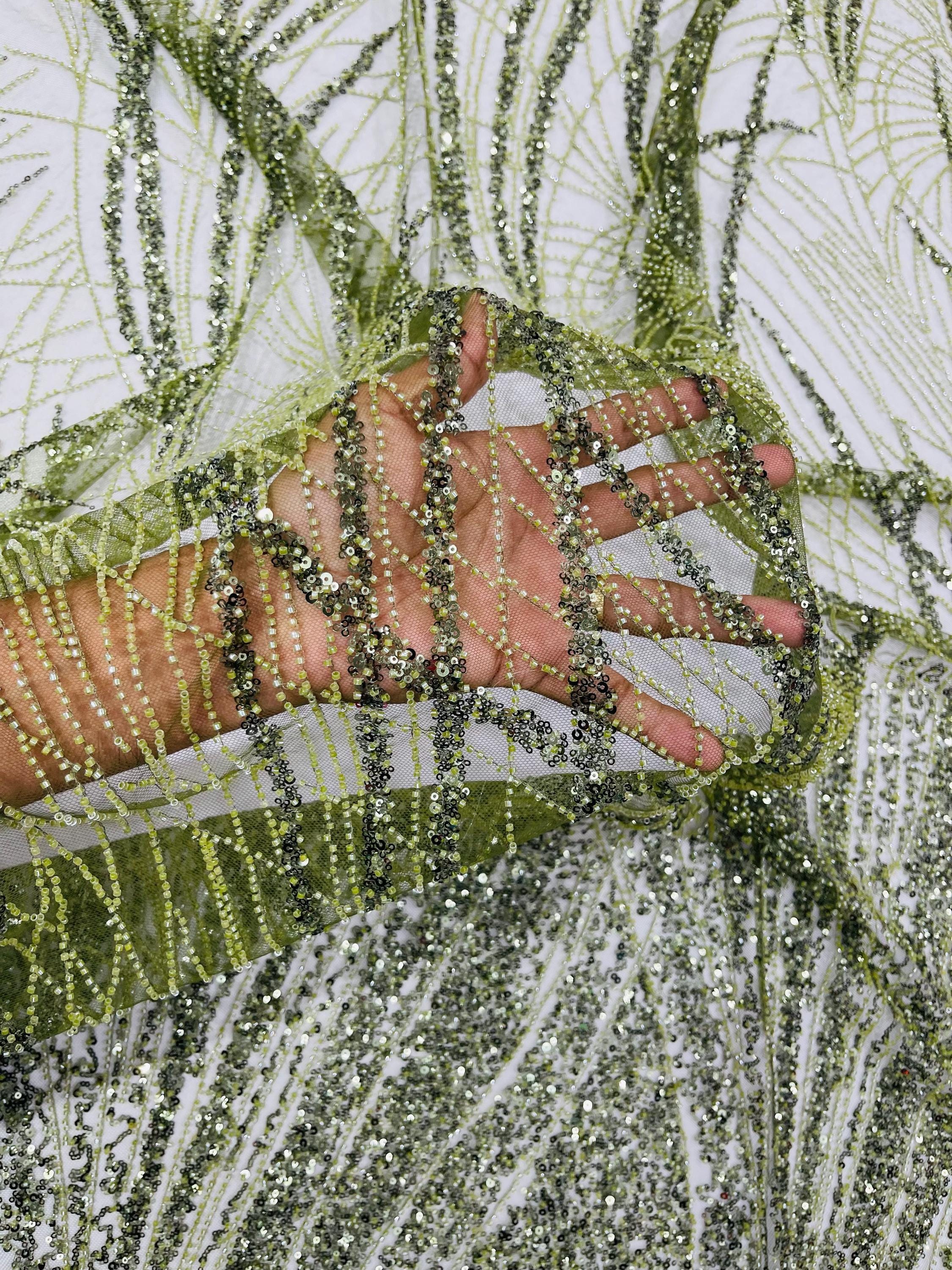 The beautiful design includes embroidered wavy plants patterns with beads across a mesh fabric of great quality. It has a beautiful border on both ends. This lace can be used for dresses, tablecloths, nightgowns, prom gowns, bridesmaid gowns, wedding gowns, table covers/runners, pillows, home /event decorations, and much more.