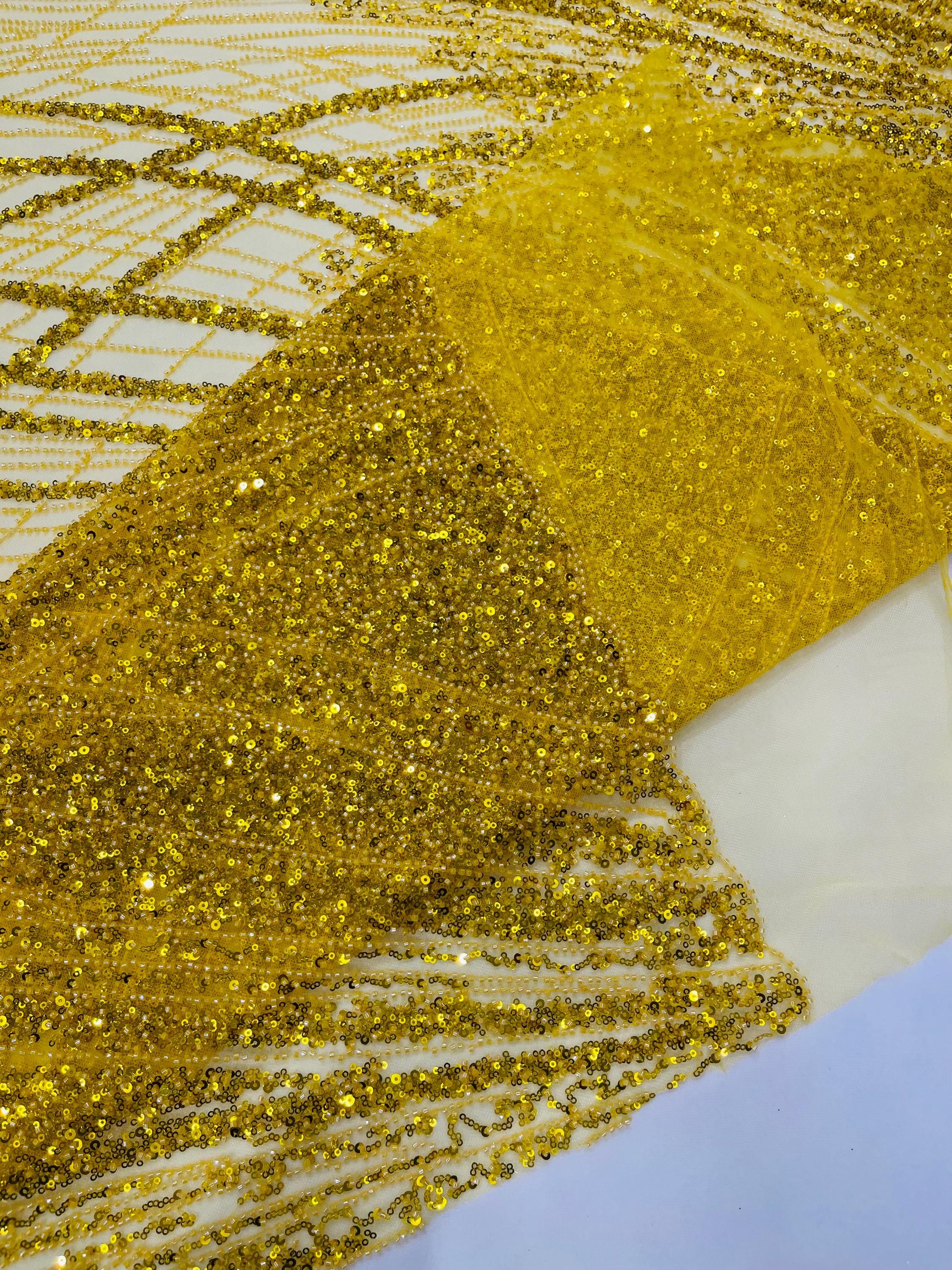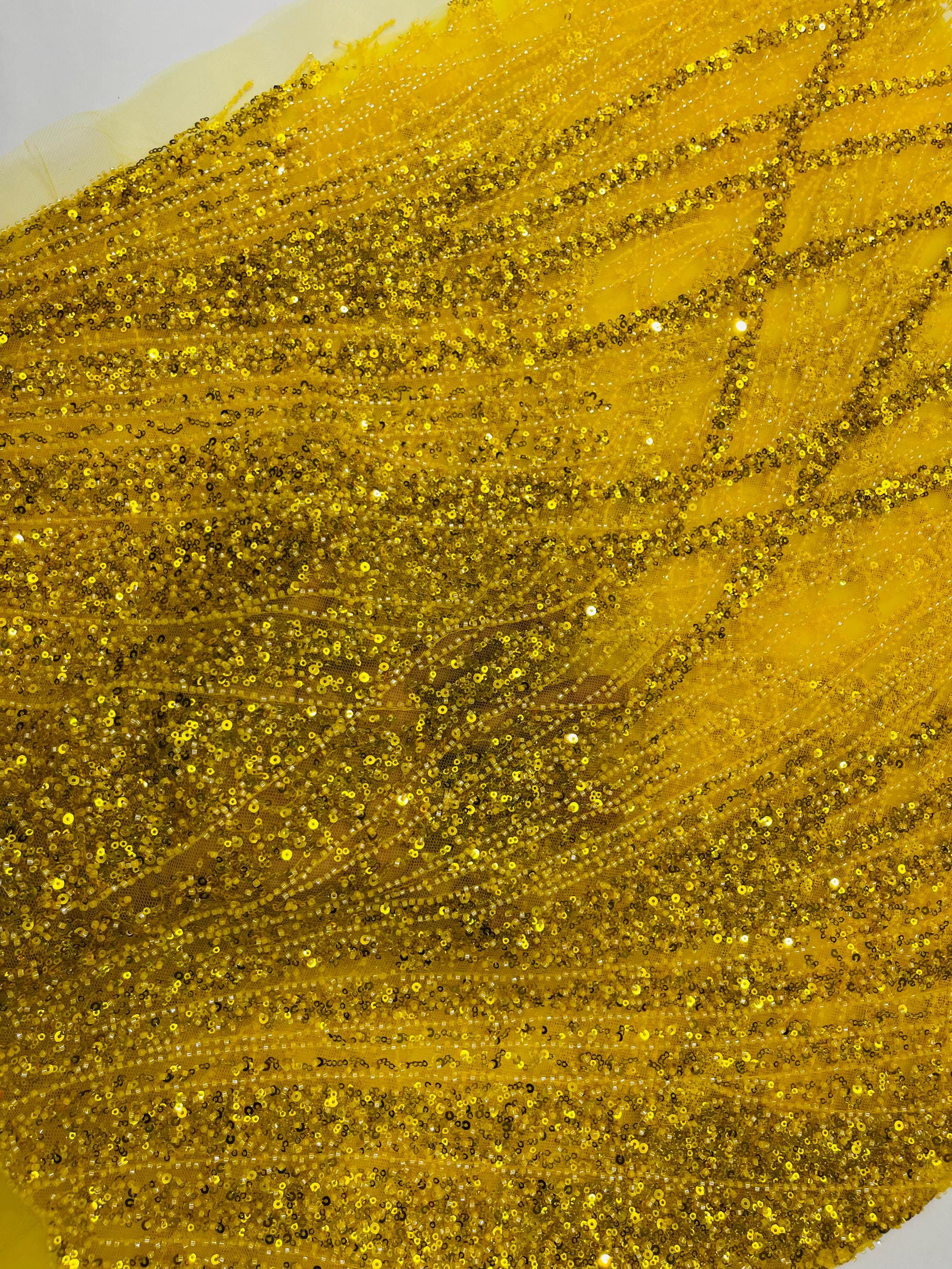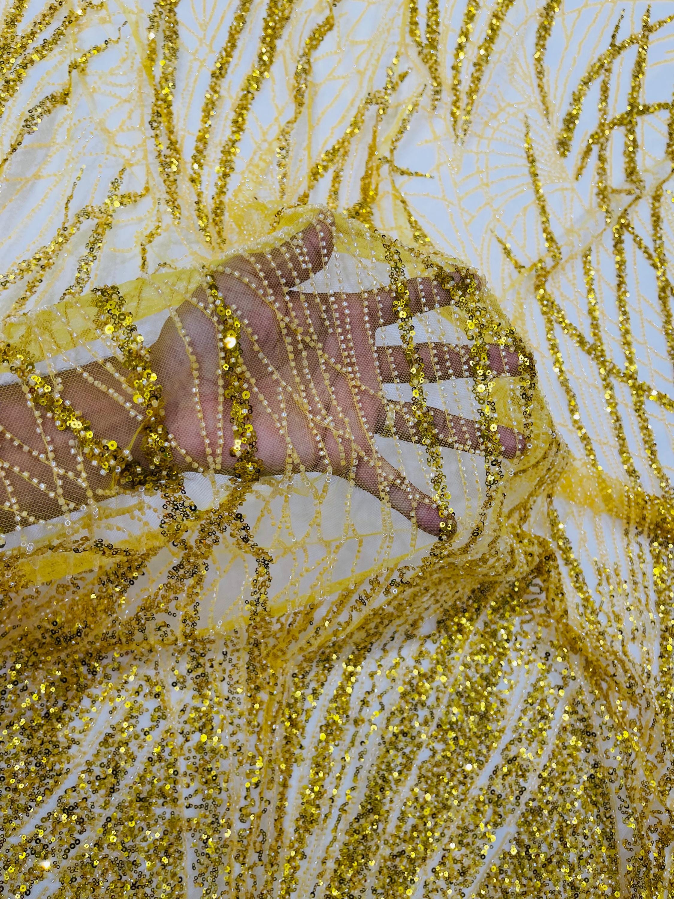 The beautiful design includes embroidered wavy plants patterns with beads across a mesh fabric of great quality. It has a beautiful border on both ends. This lace can be used for dresses, tablecloths, nightgowns, prom gowns, bridesmaid gowns, wedding gowns, table covers/runners, pillows, home /event decorations, and much more.