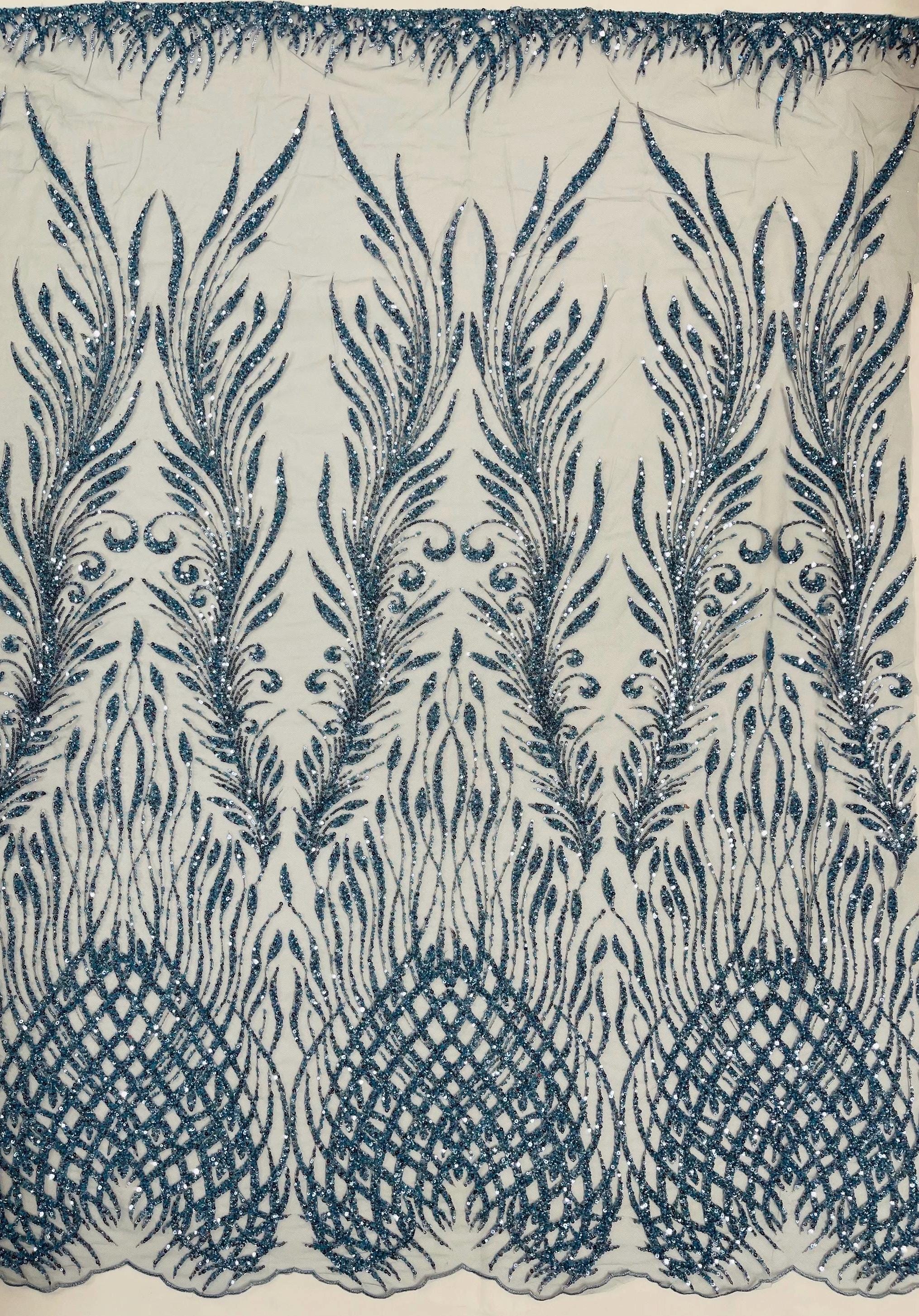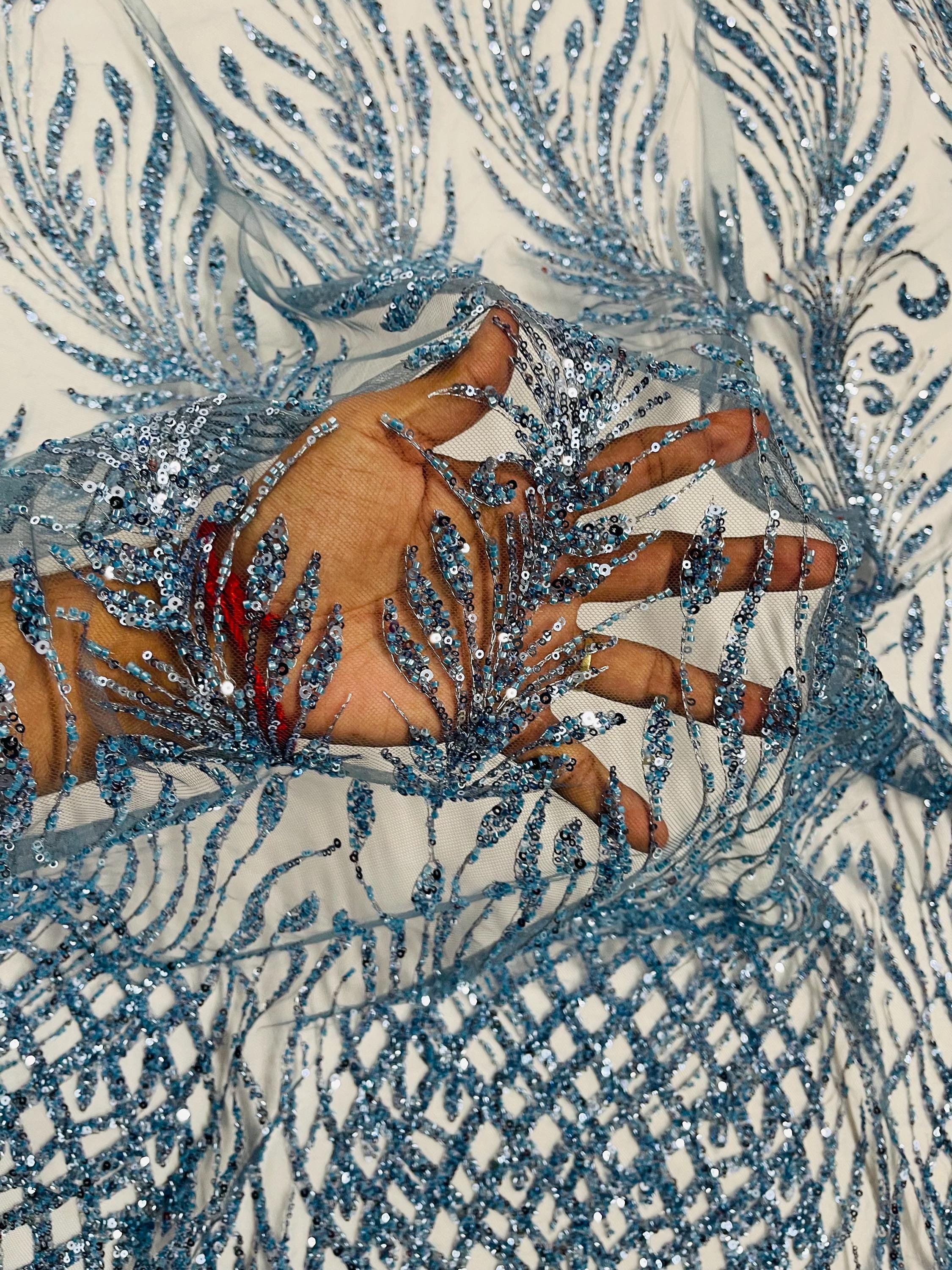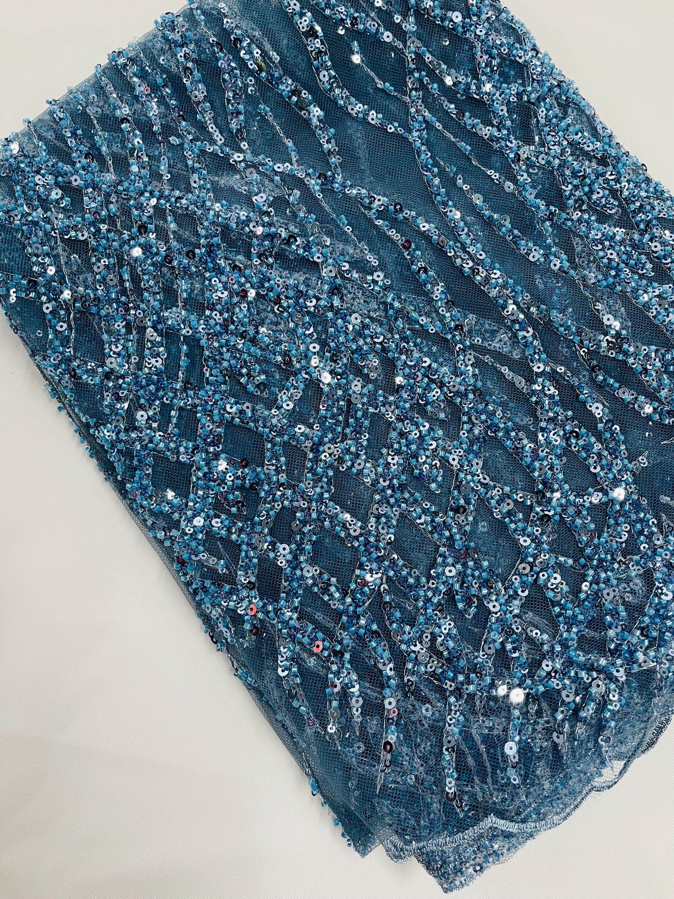 The beautiful design includes embroidered wavy plants patterns with beads across a mesh fabric of great quality. It has a beautiful border on both ends. This lace can be used for dresses, tablecloths, nightgowns, prom gowns, bridesmaid gowns, wedding gowns, table covers/runners, pillows, home /event decorations, and much more.