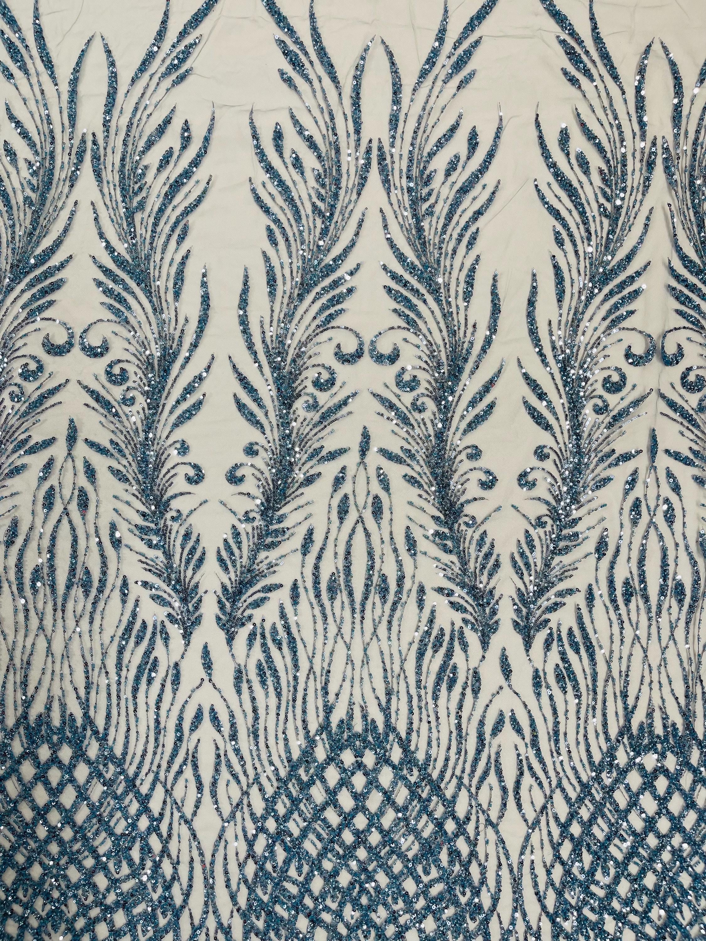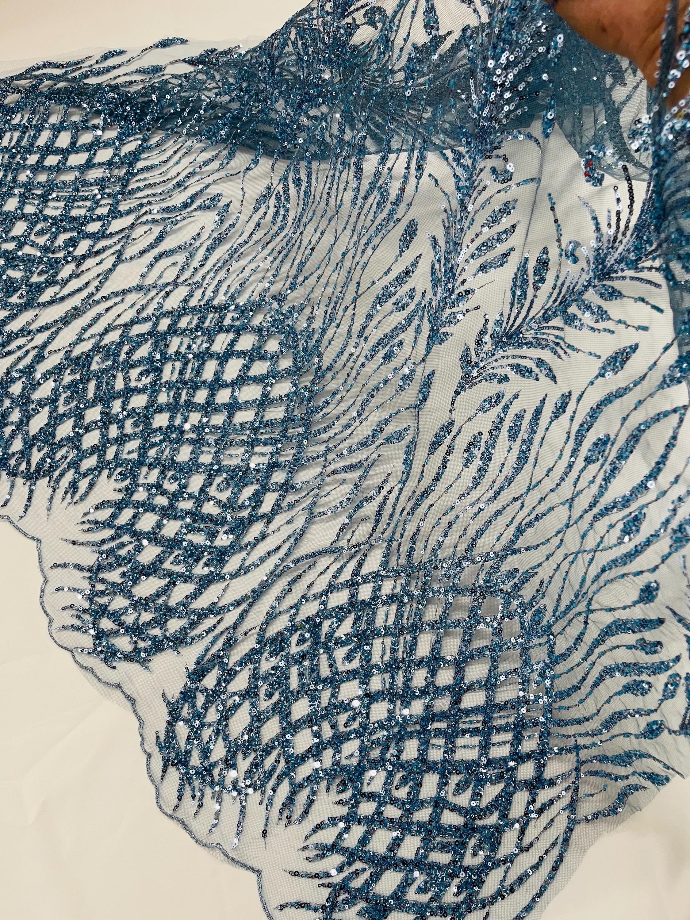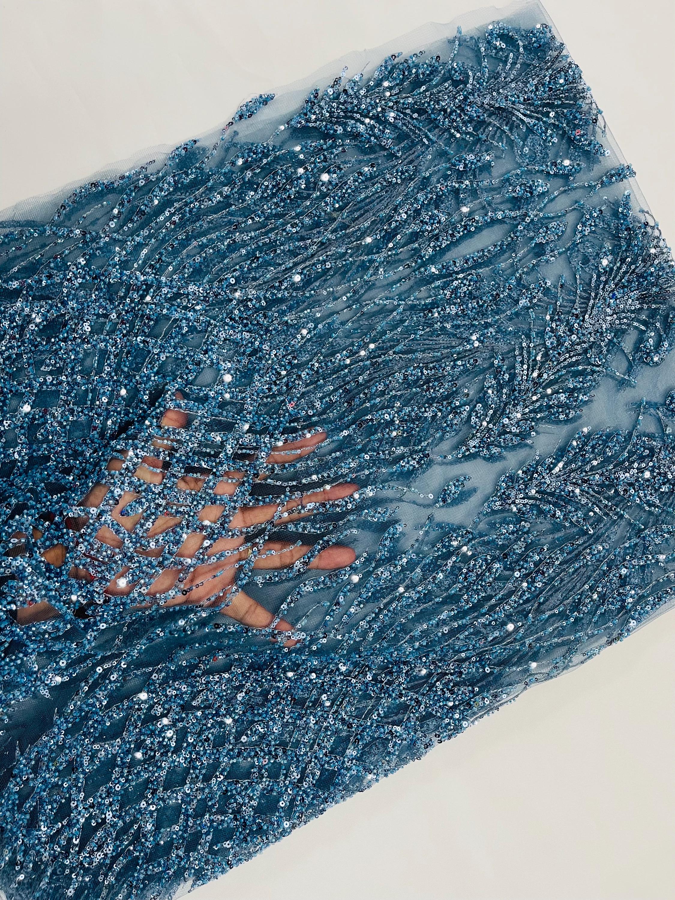 The beautiful design includes embroidered wavy plants patterns with beads across a mesh fabric of great quality. It has a beautiful border on both ends. This lace can be used for dresses, tablecloths, nightgowns, prom gowns, bridesmaid gowns, wedding gowns, table covers/runners, pillows, home /event decorations, and much more.