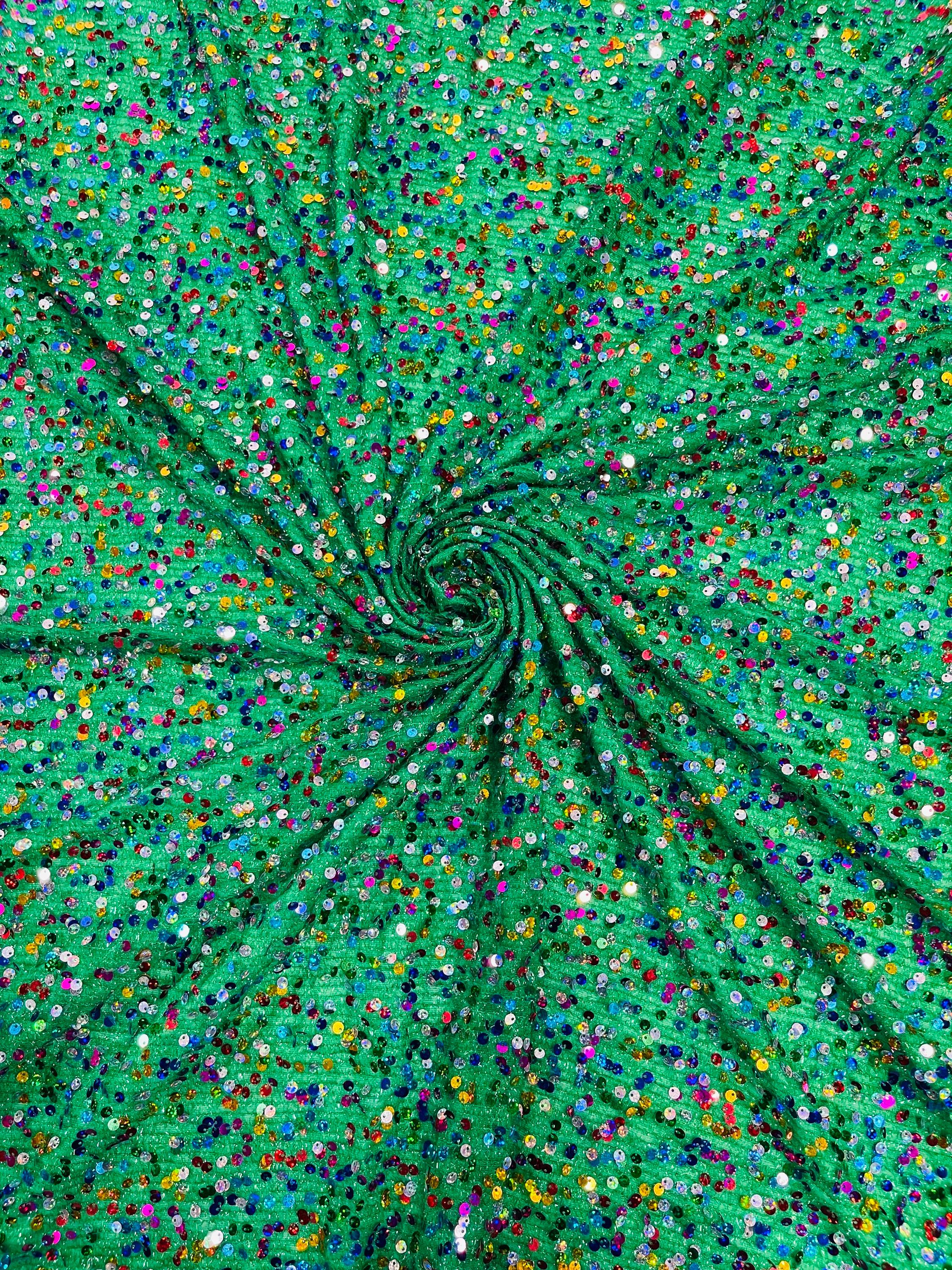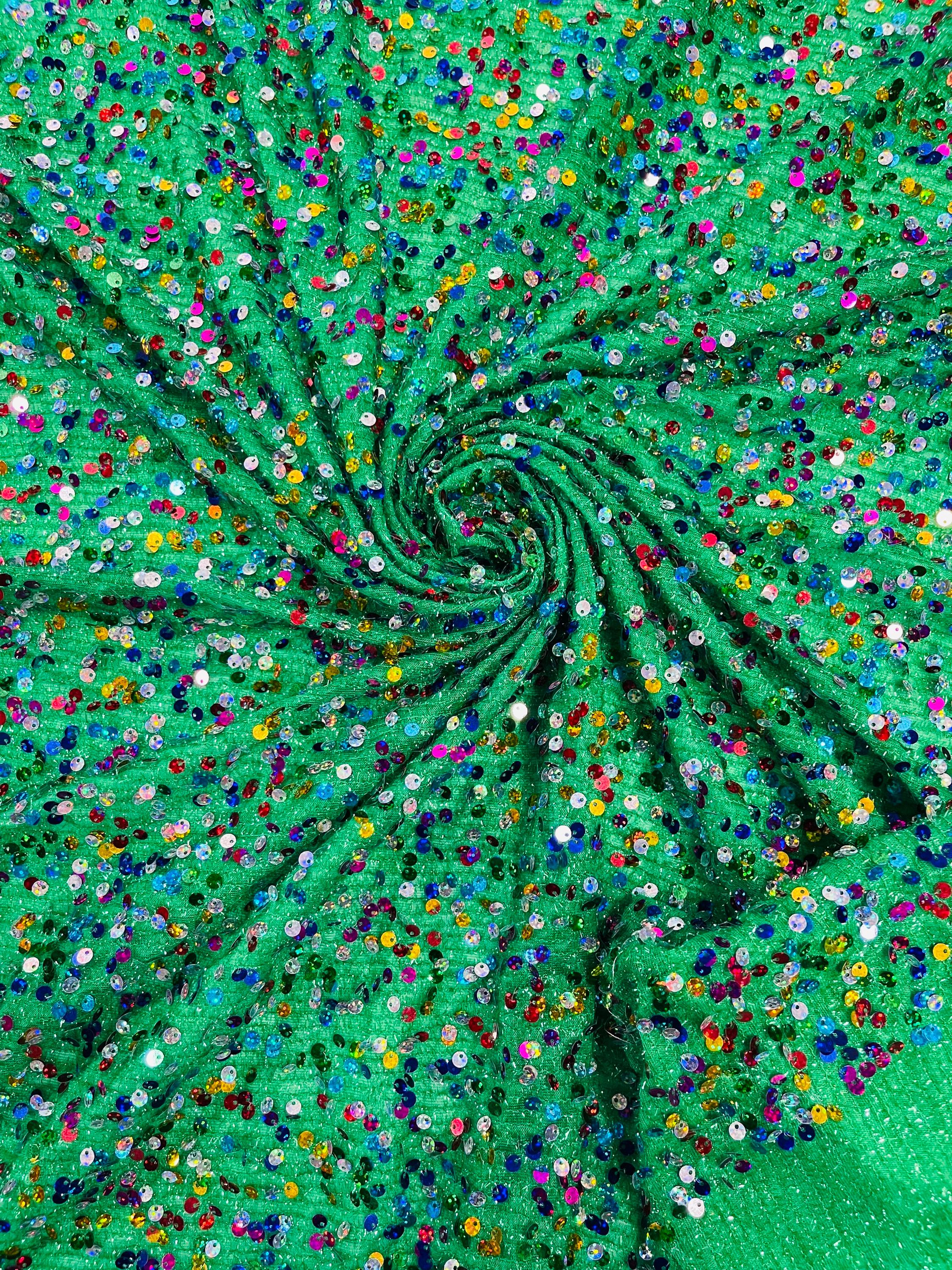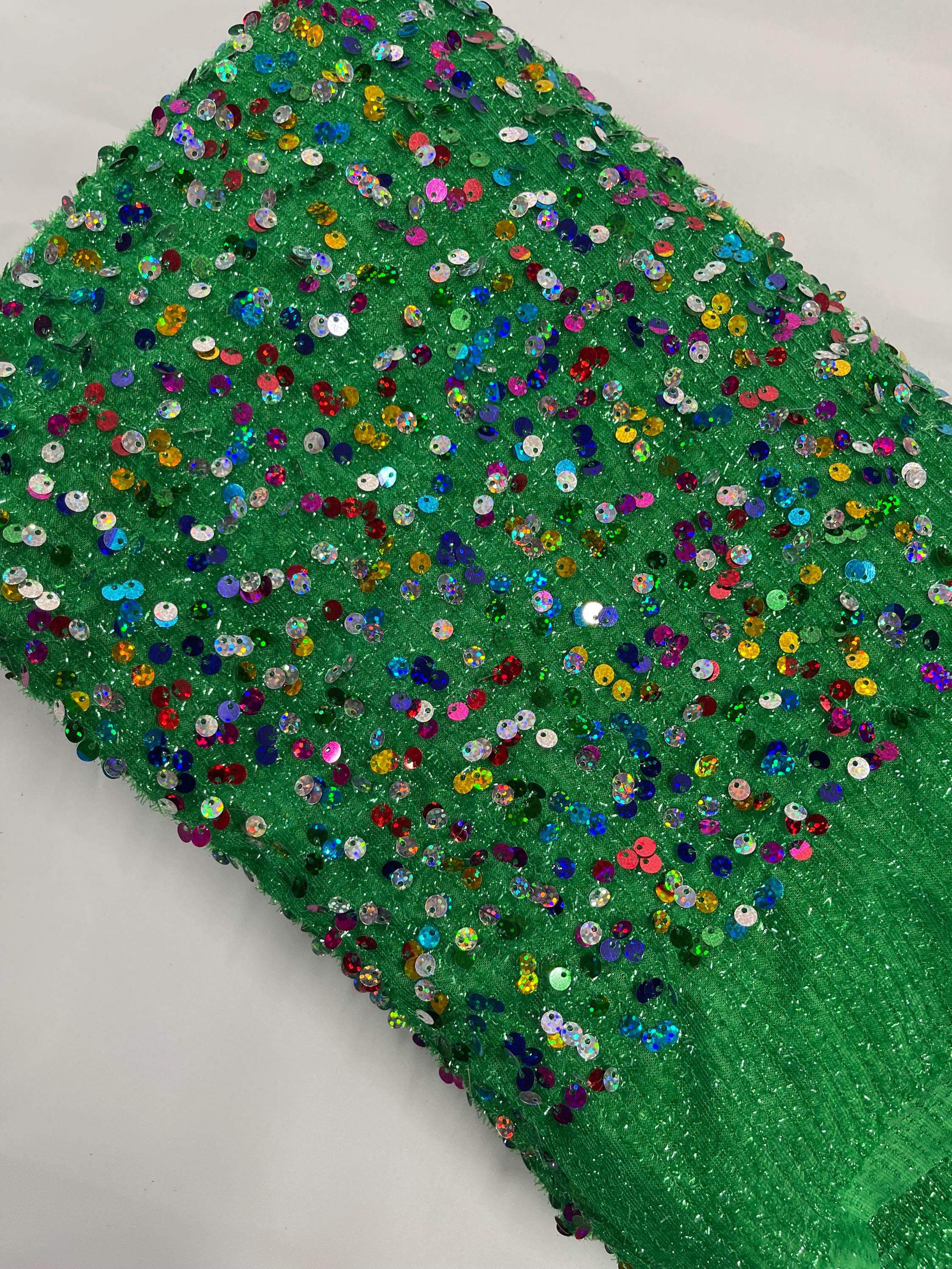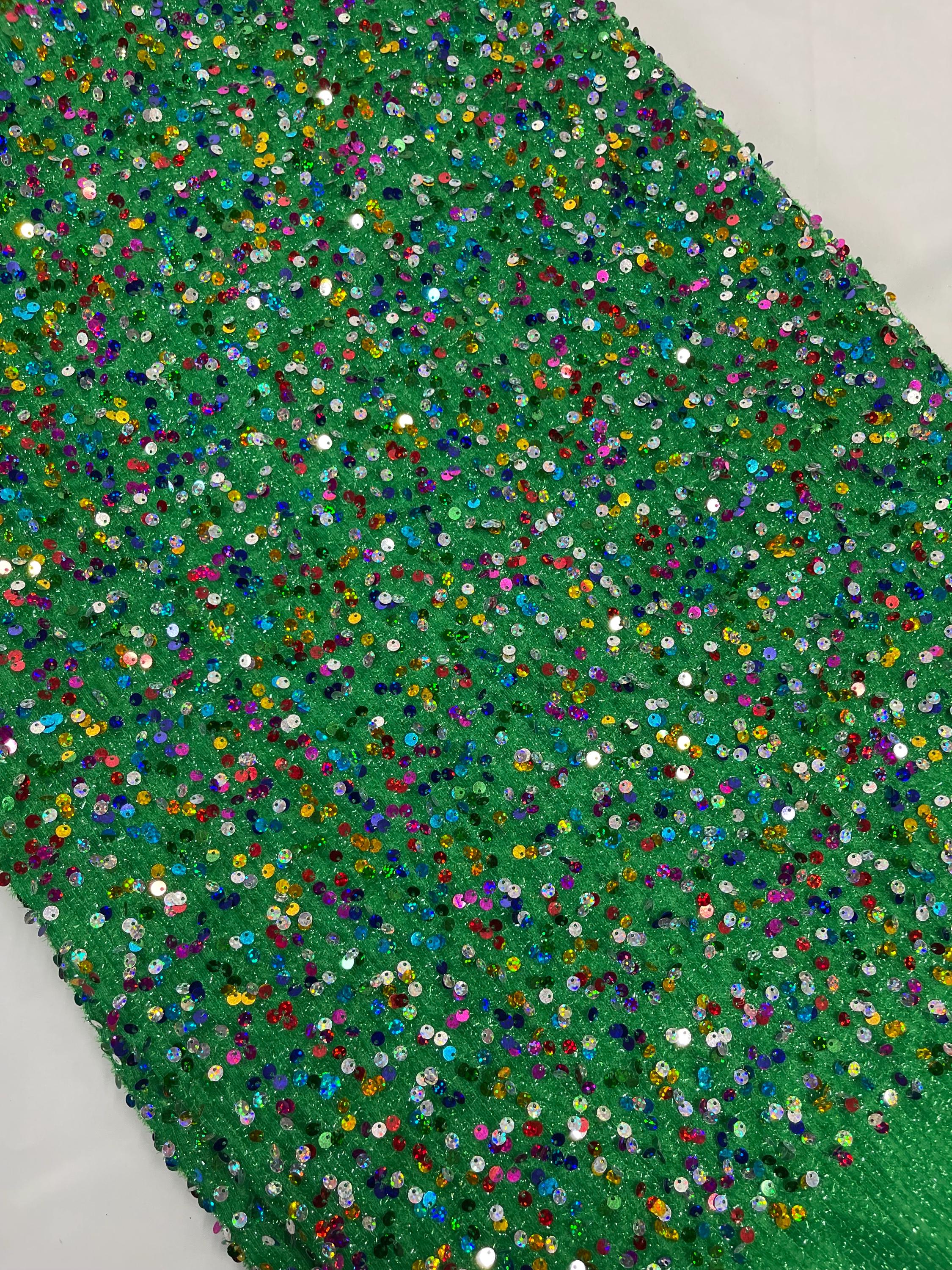 Multi Color Hologram Sequin Fabric On Green Fabric: Confetti Sequins, 2-Way Stretch By Yard