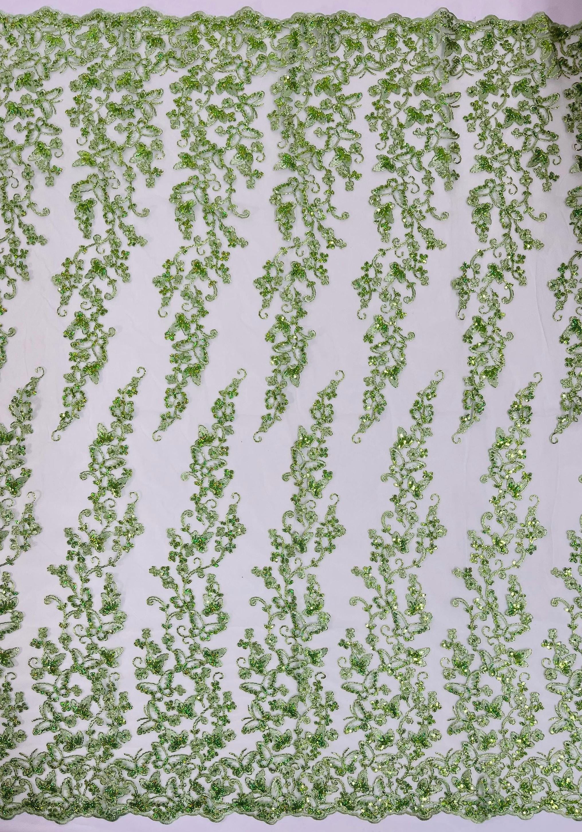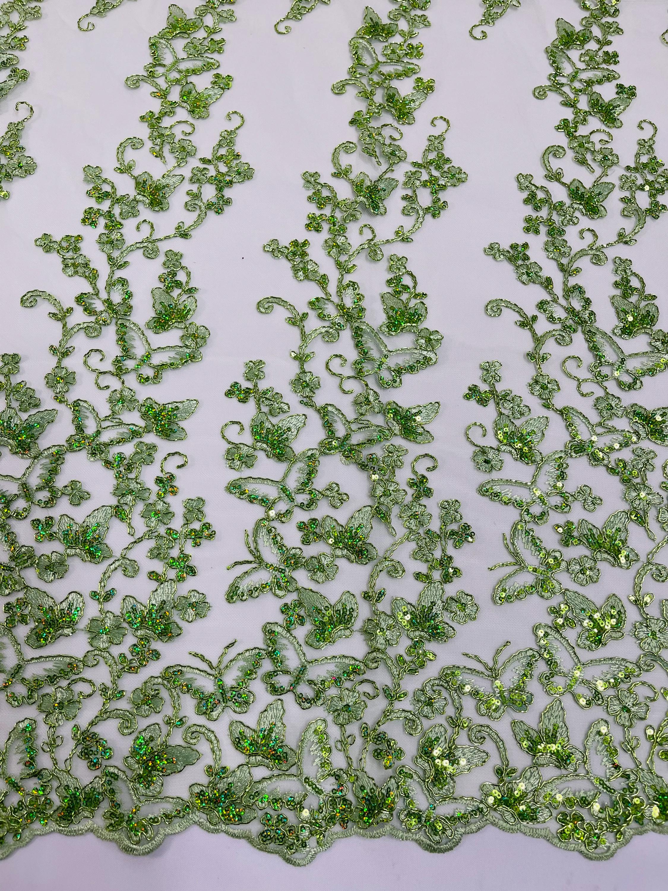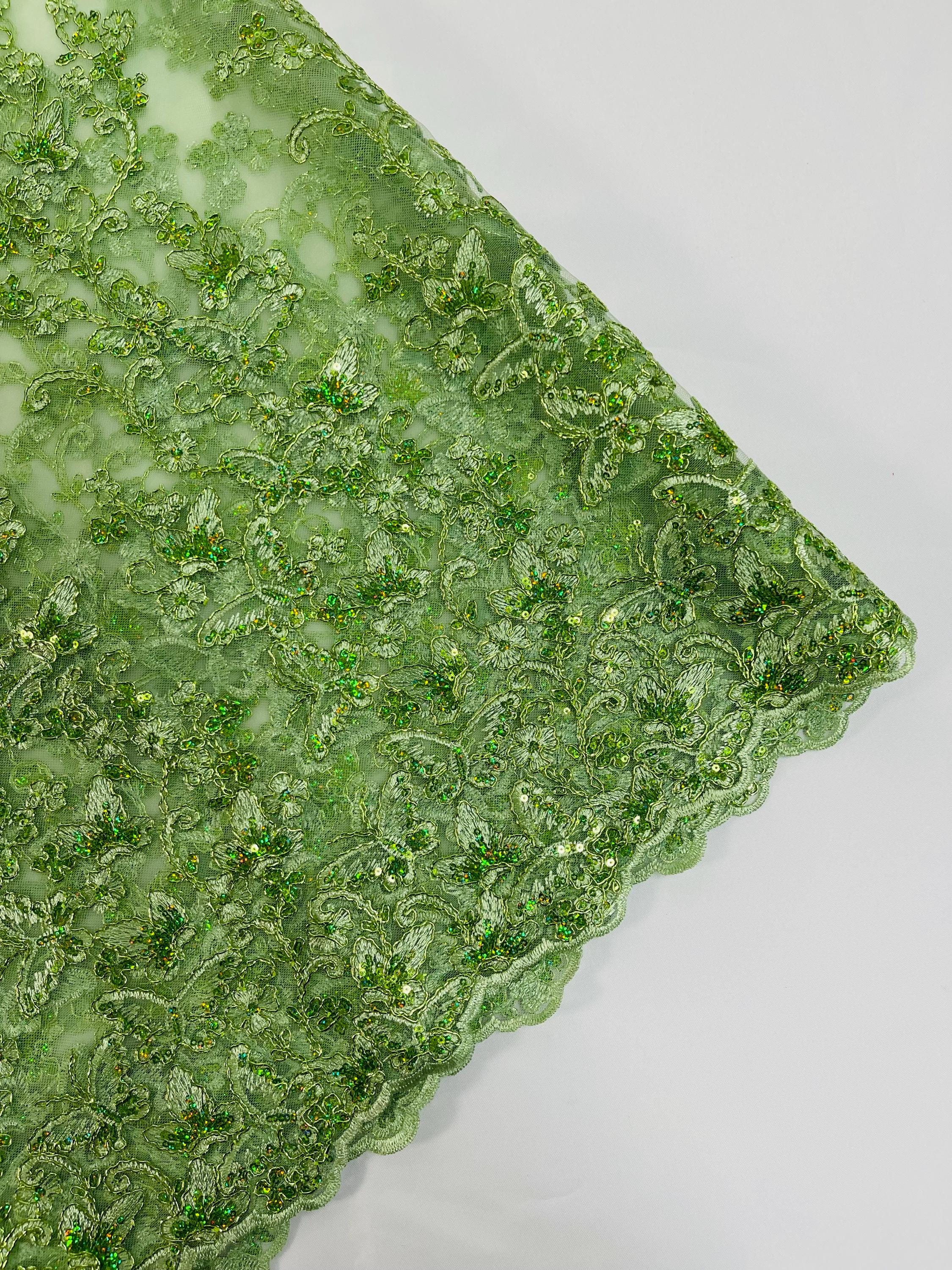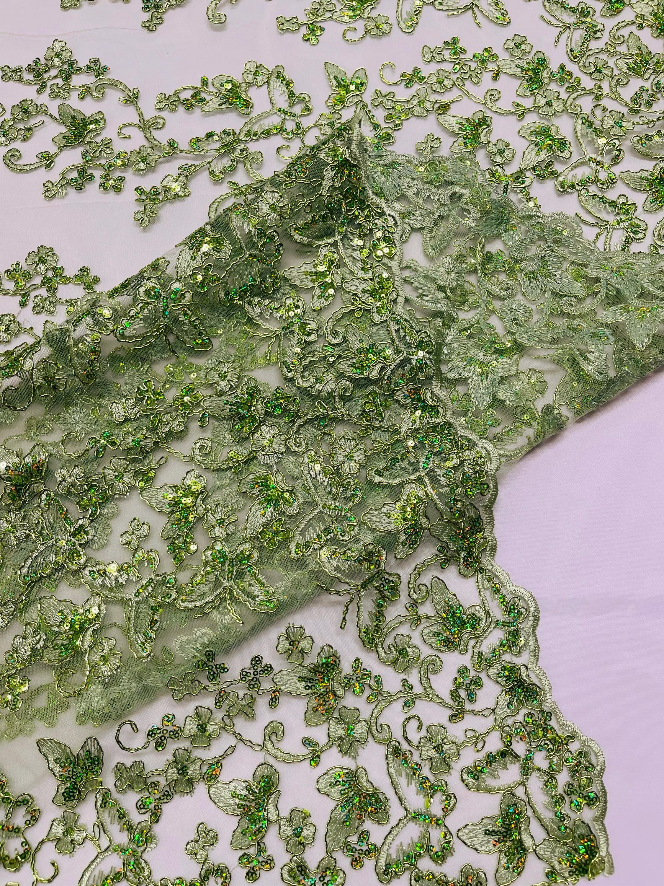 Sage Hologram Sequin Butterfly Lace Fabric: Metallic Corded Embroidery with Sequins