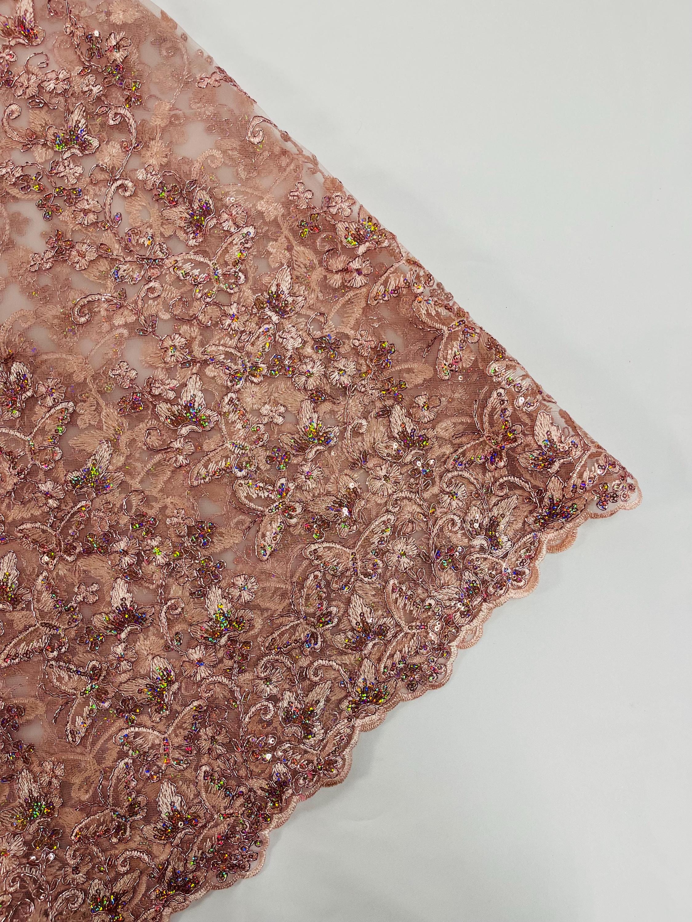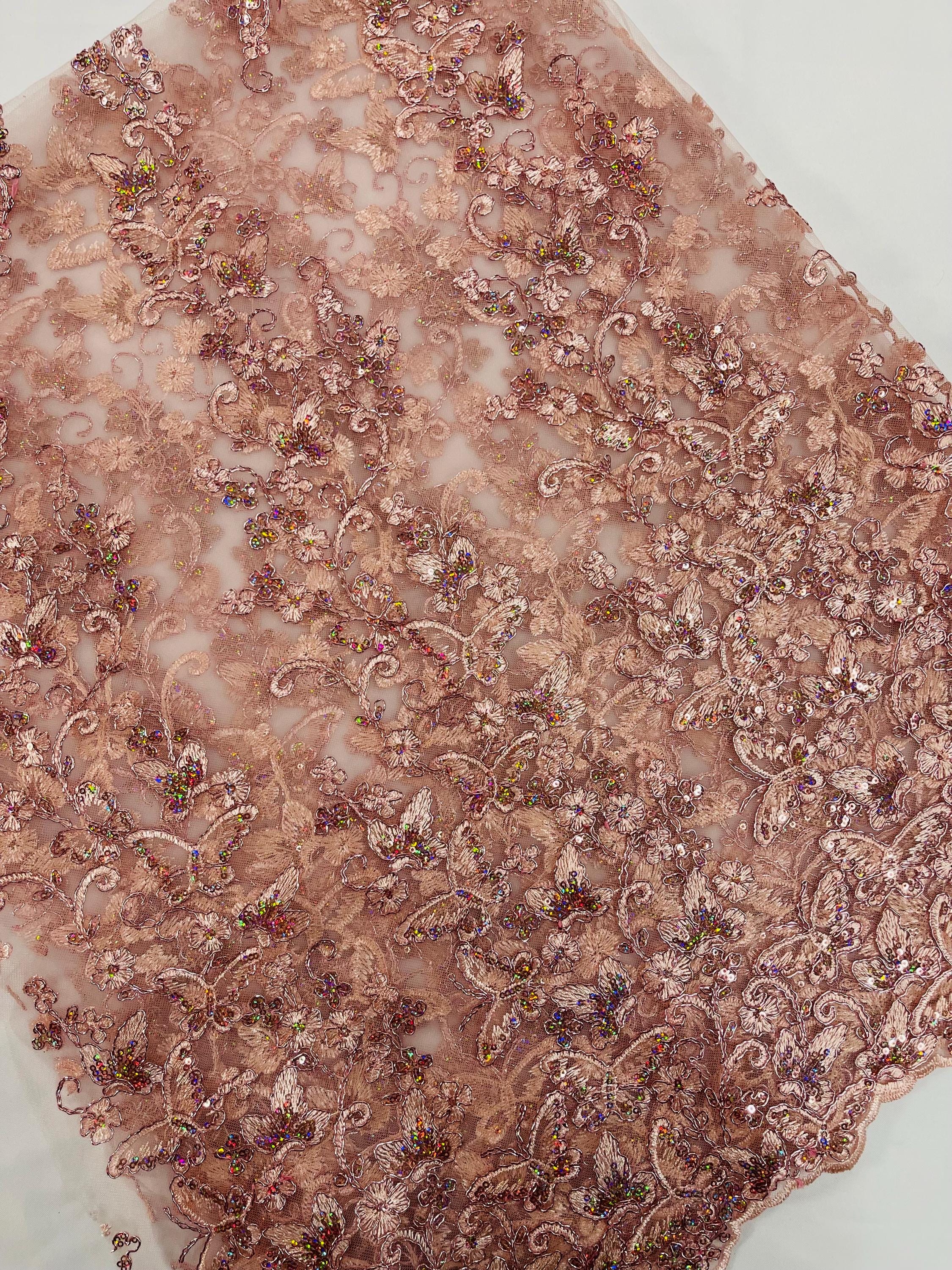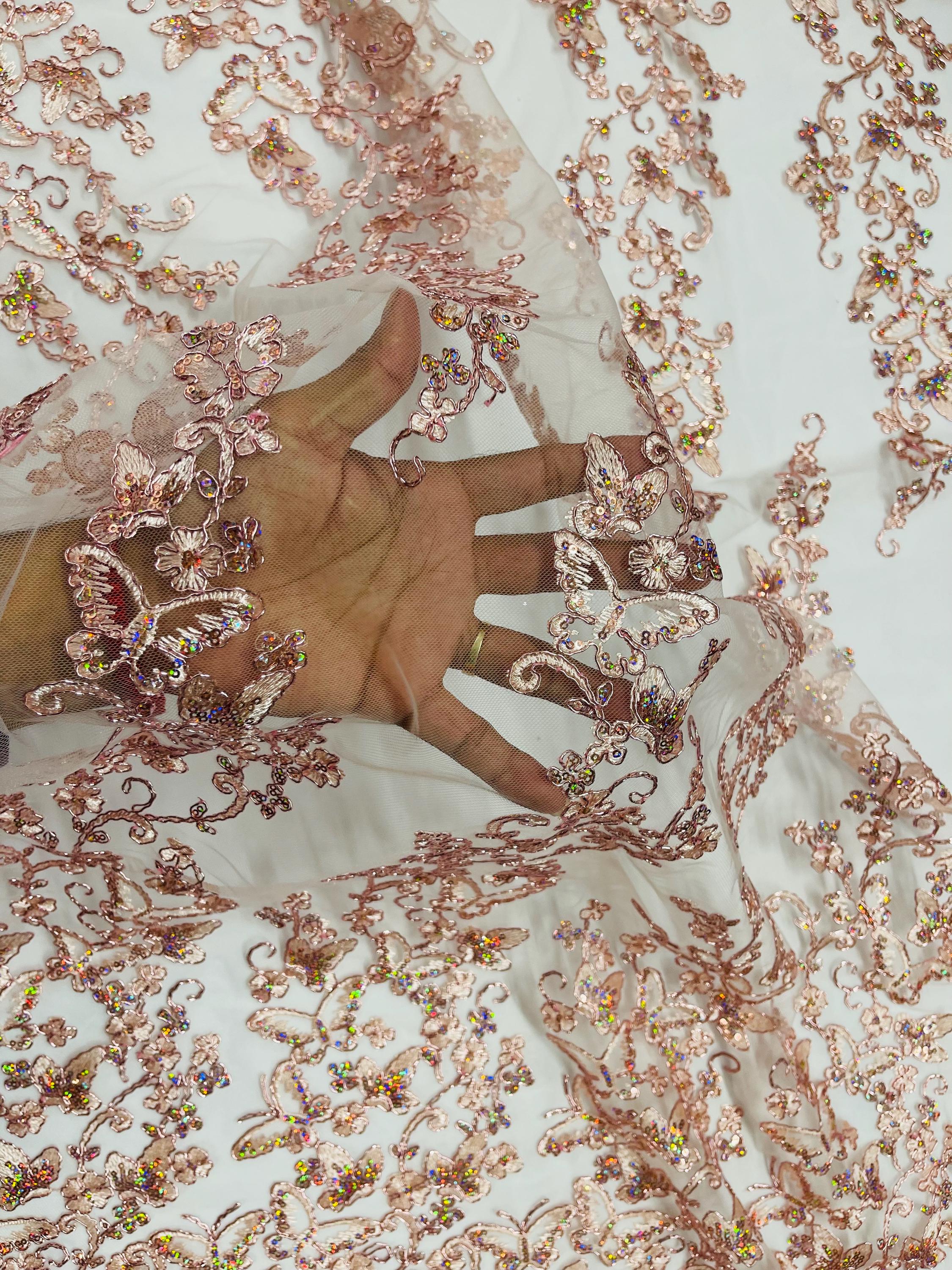 Rose Gold Hologram Sequin Butterfly Lace Fabric: Metallic Corded Embroidery with Sequins