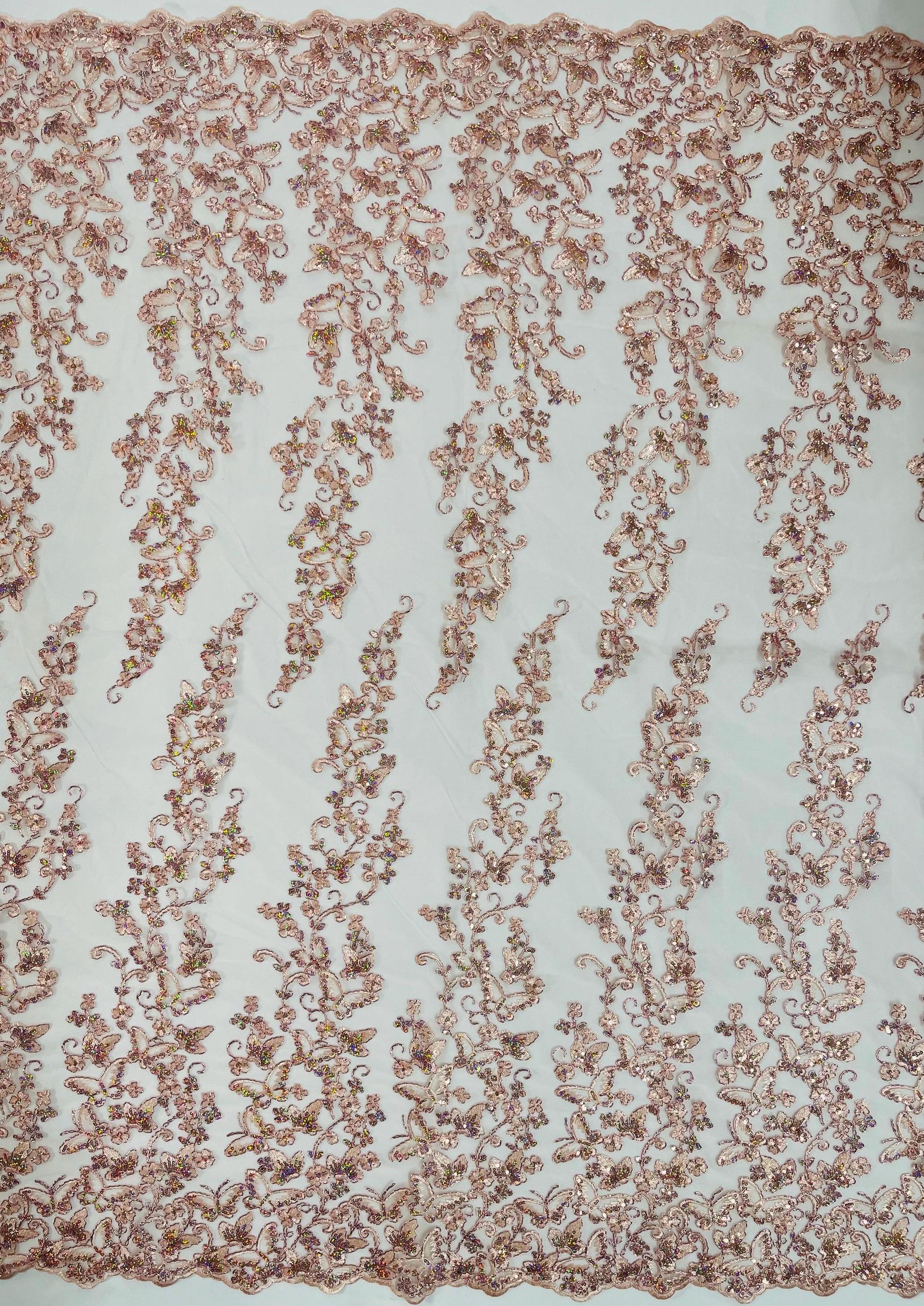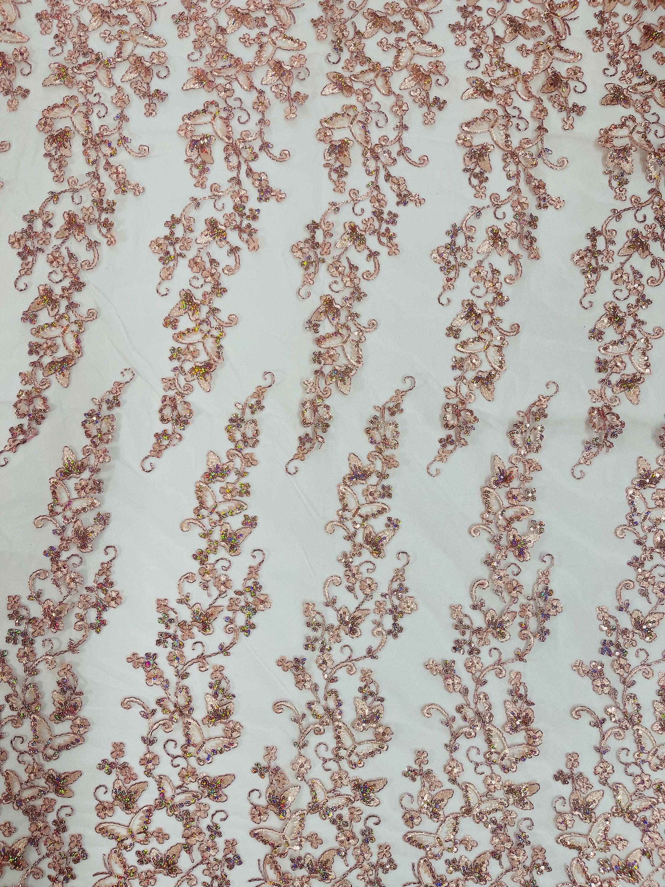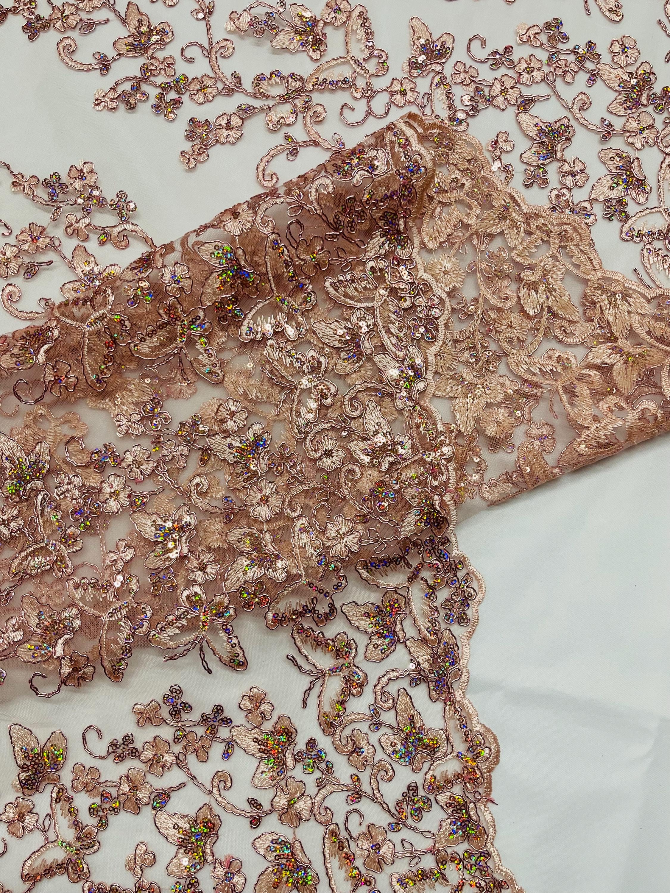 Rose Gold Hologram Sequin Butterfly Lace Fabric: Metallic Corded Embroidery with Sequins