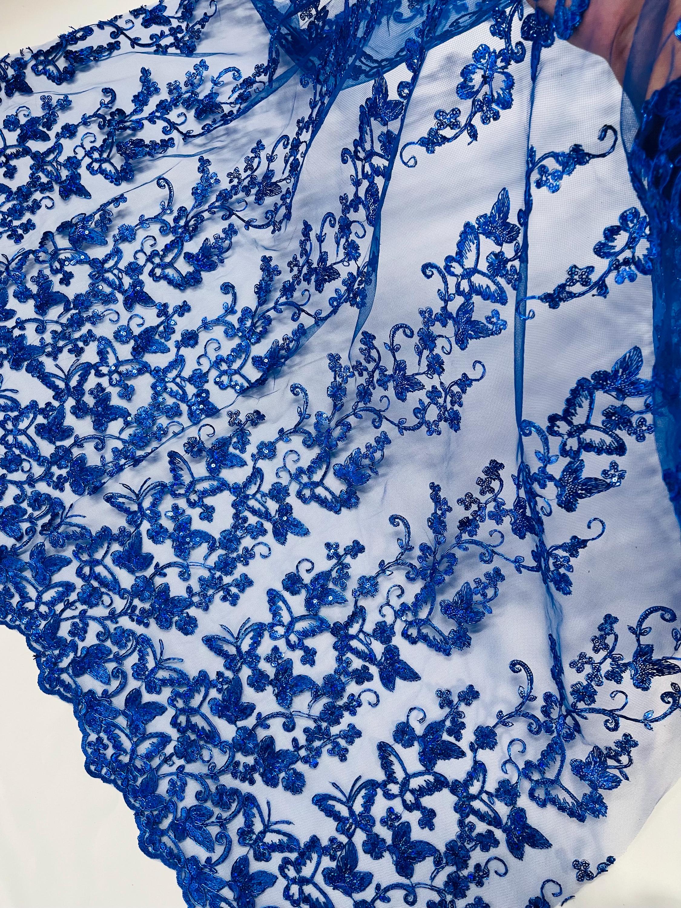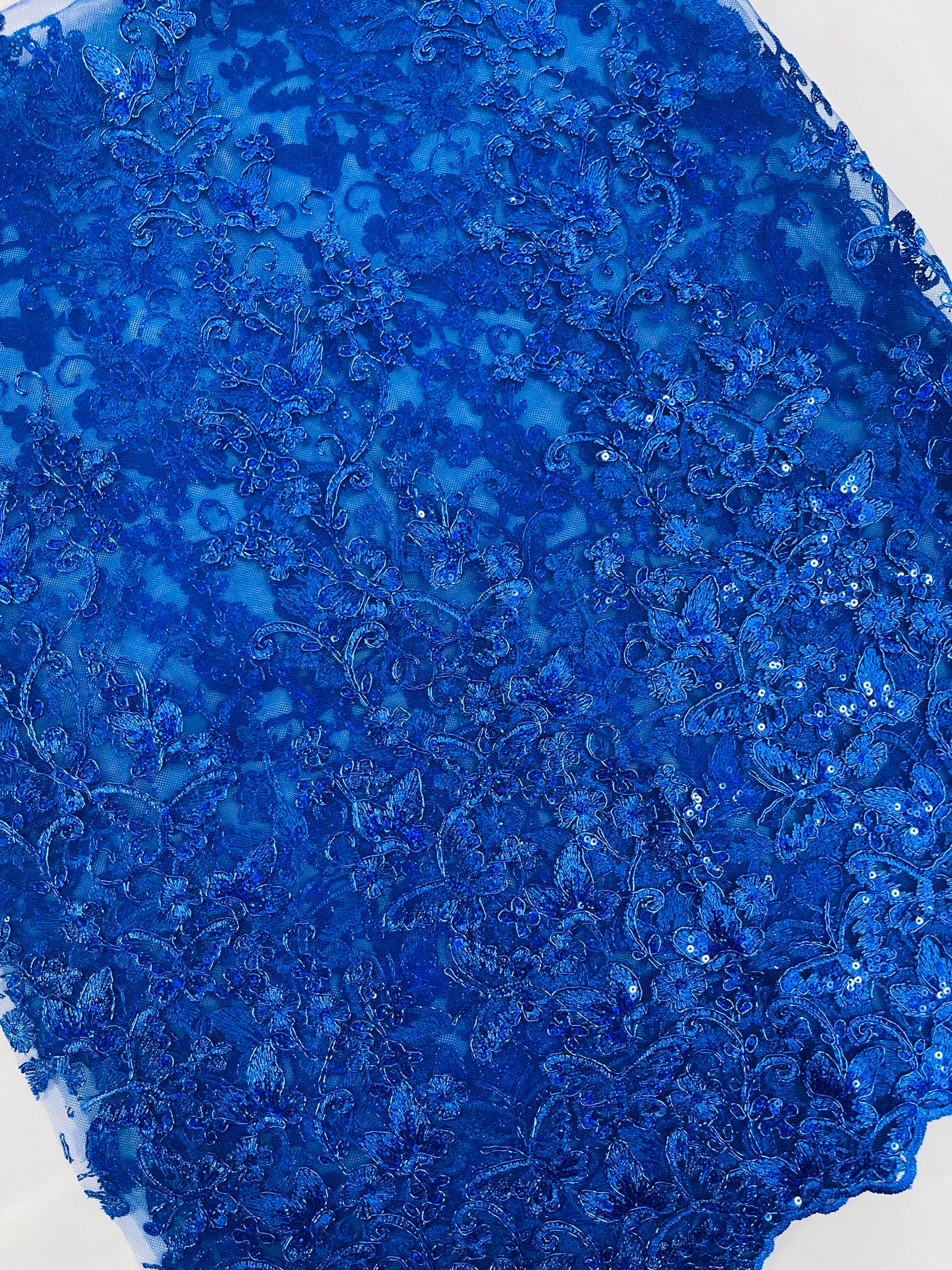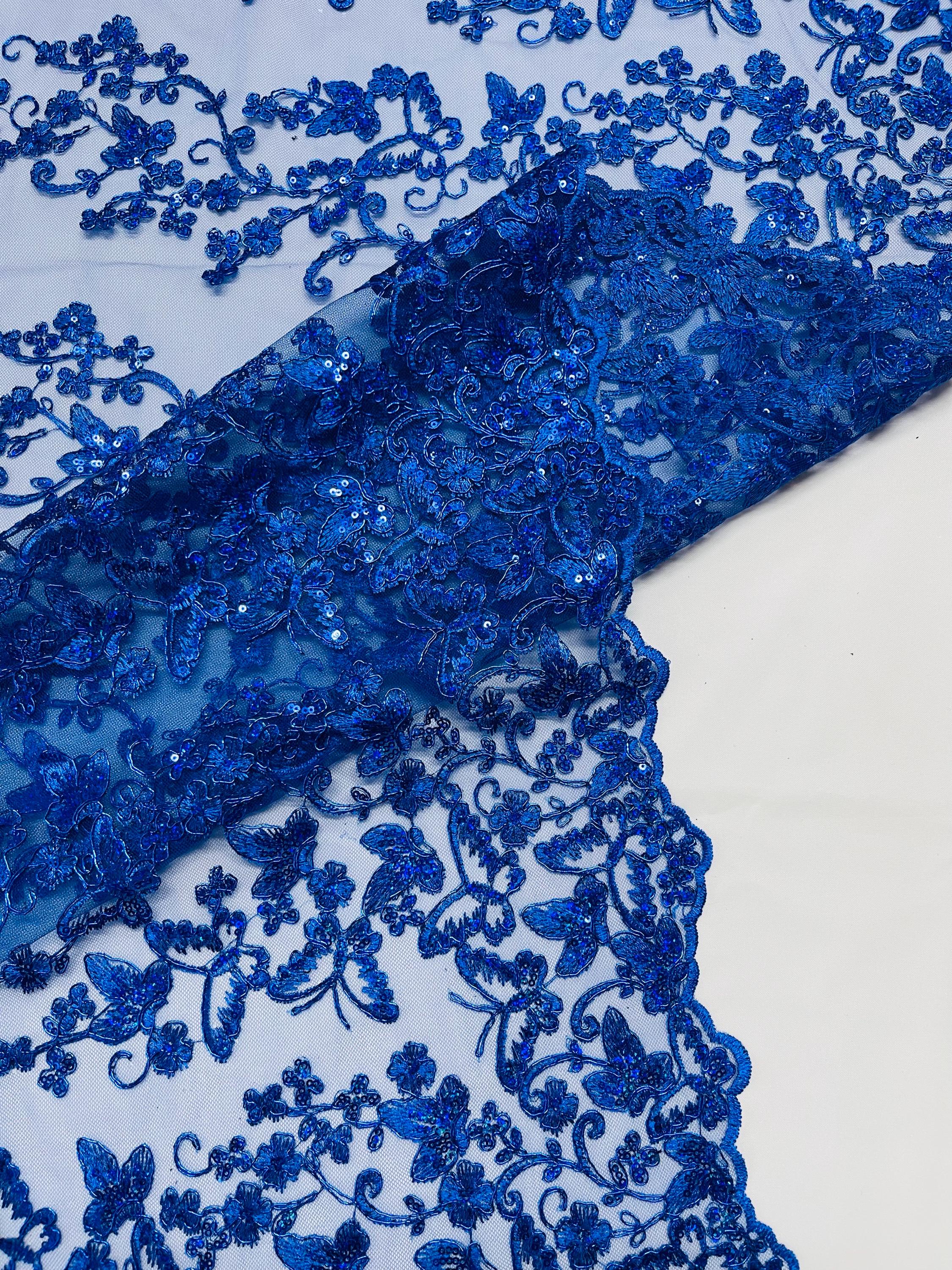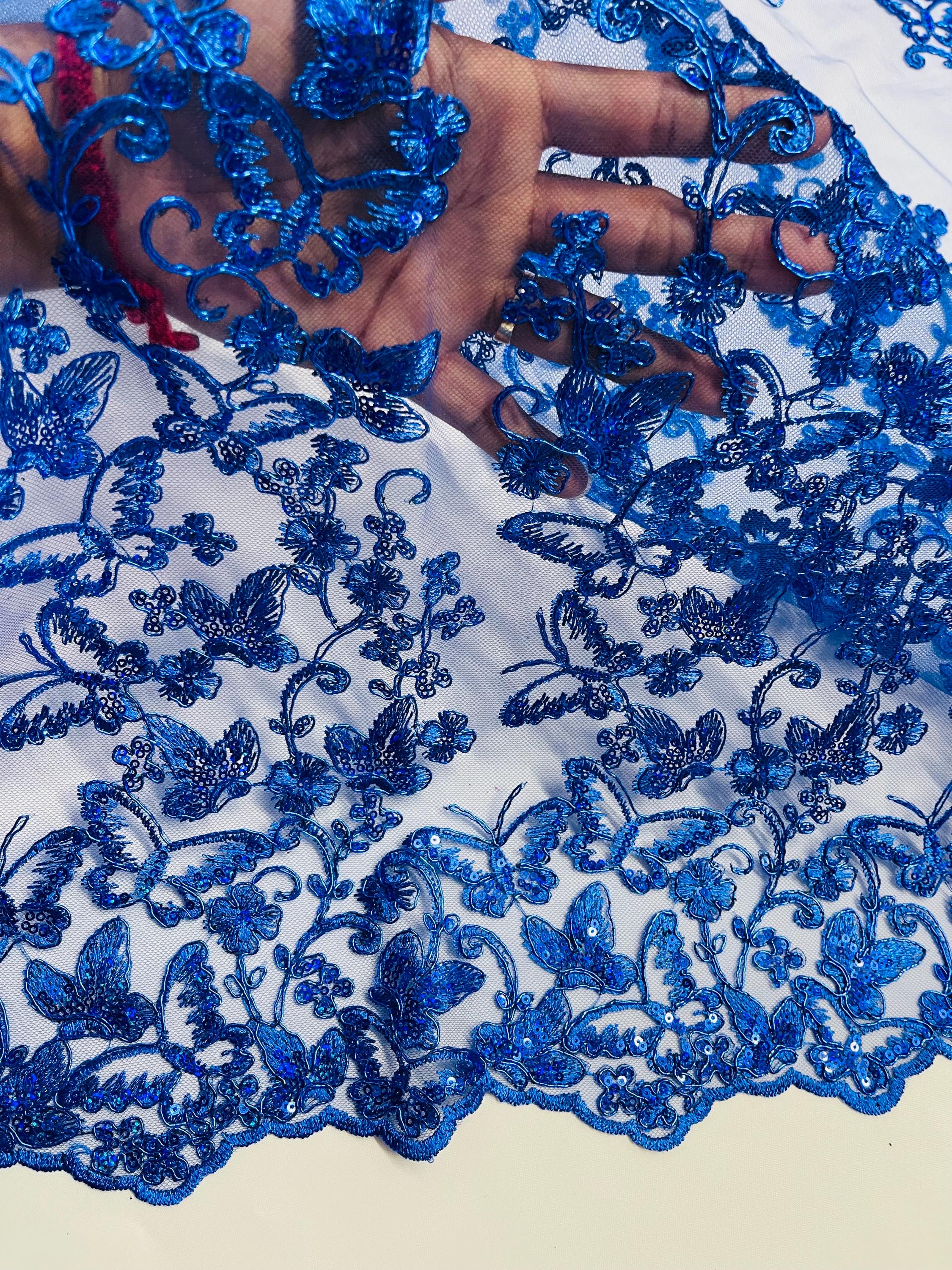 Royal Blue Hologram Sequin Butterfly Lace Fabric: Metallic Corded Embroidery with Sequins