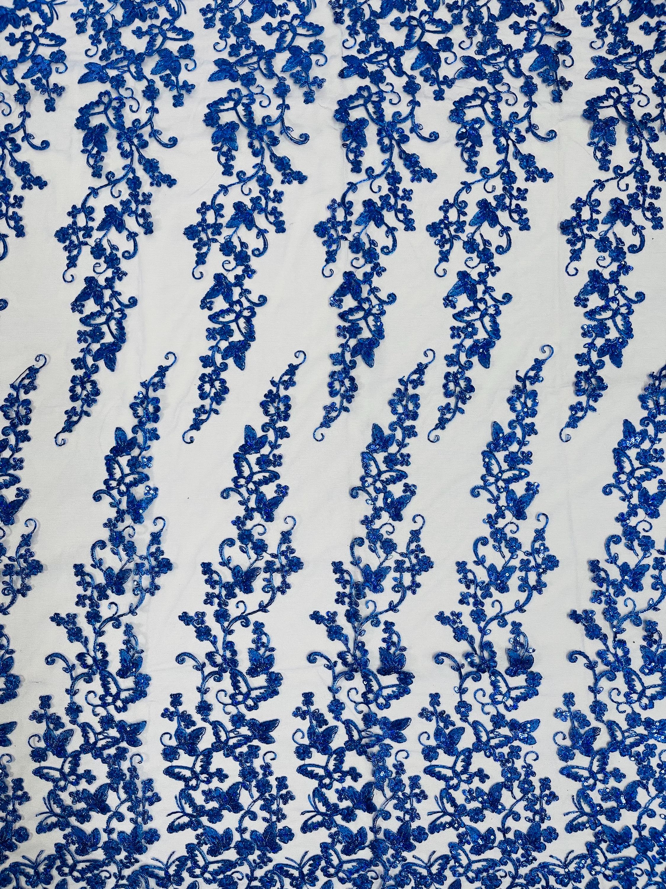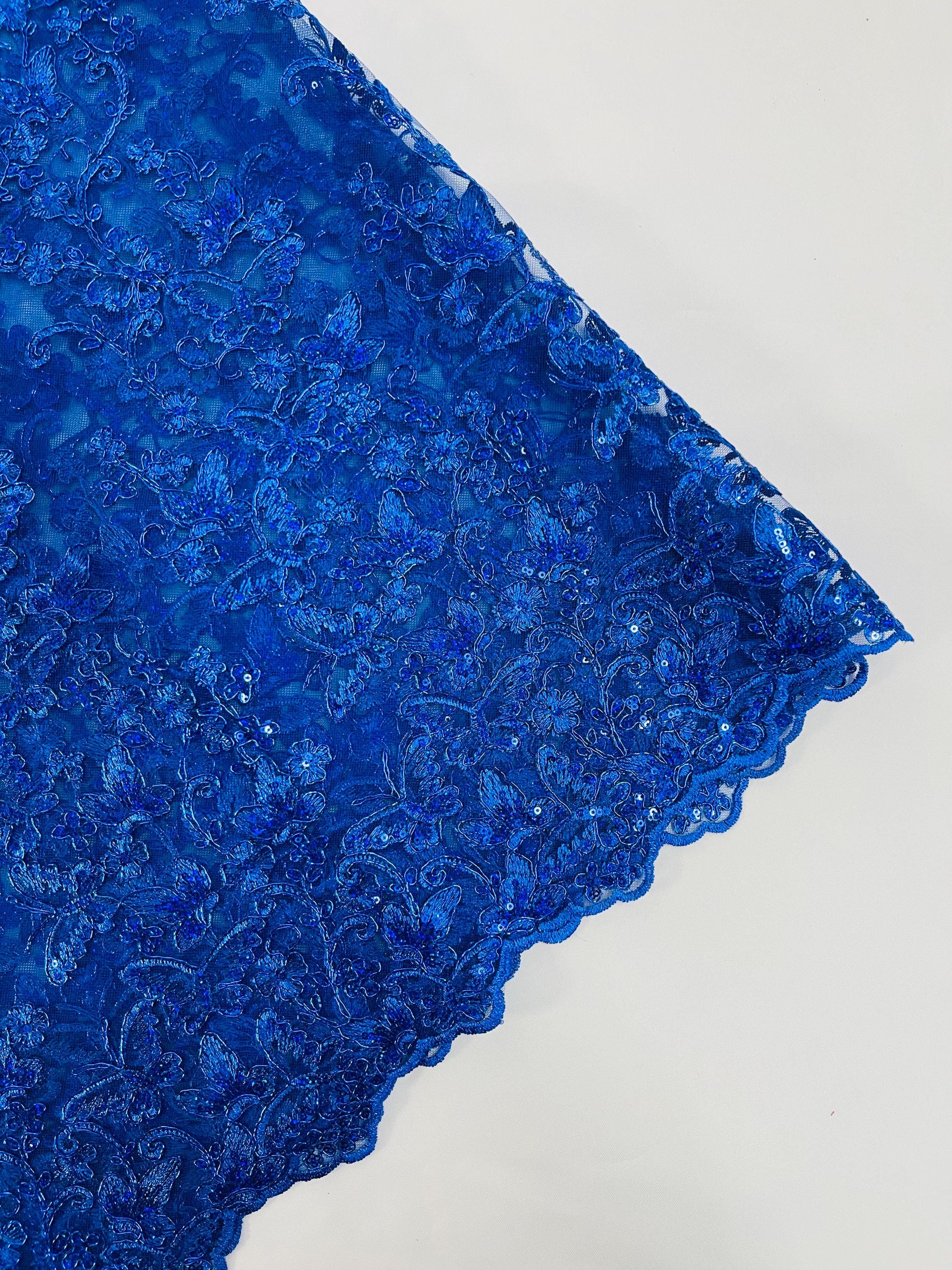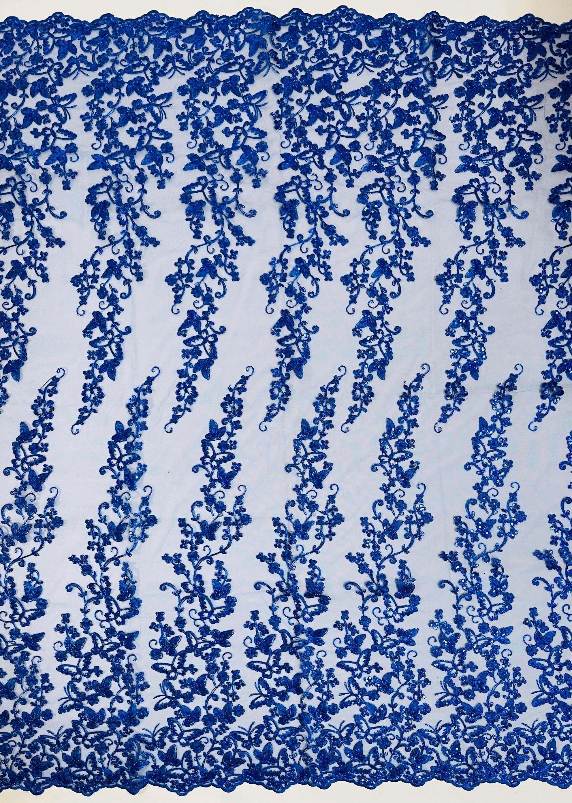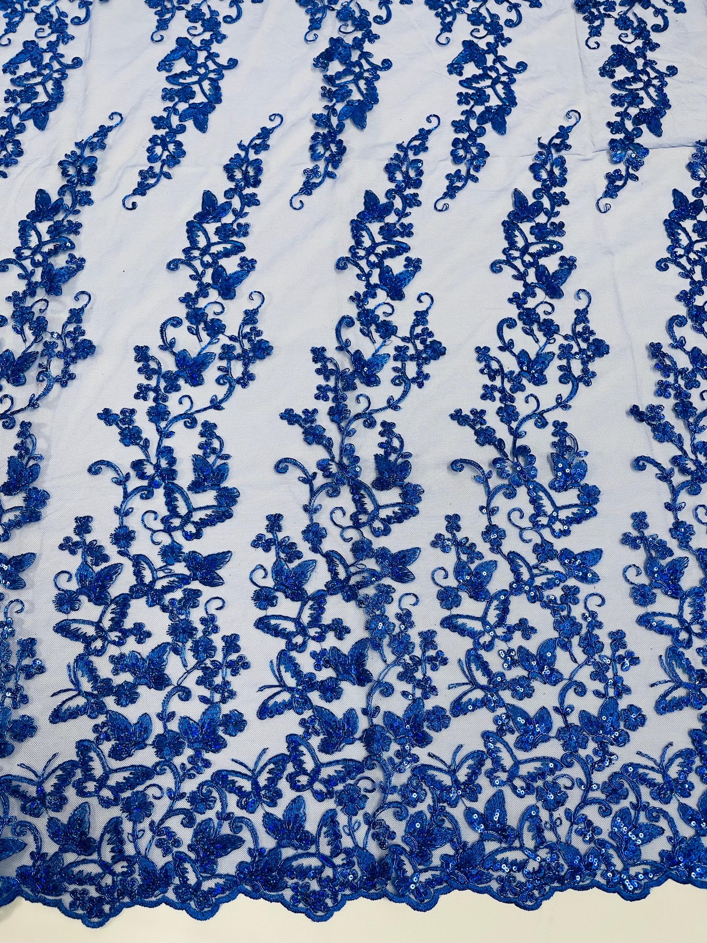 Royal Blue Hologram Sequin Butterfly Lace Fabric: Metallic Corded Embroidery with Sequins