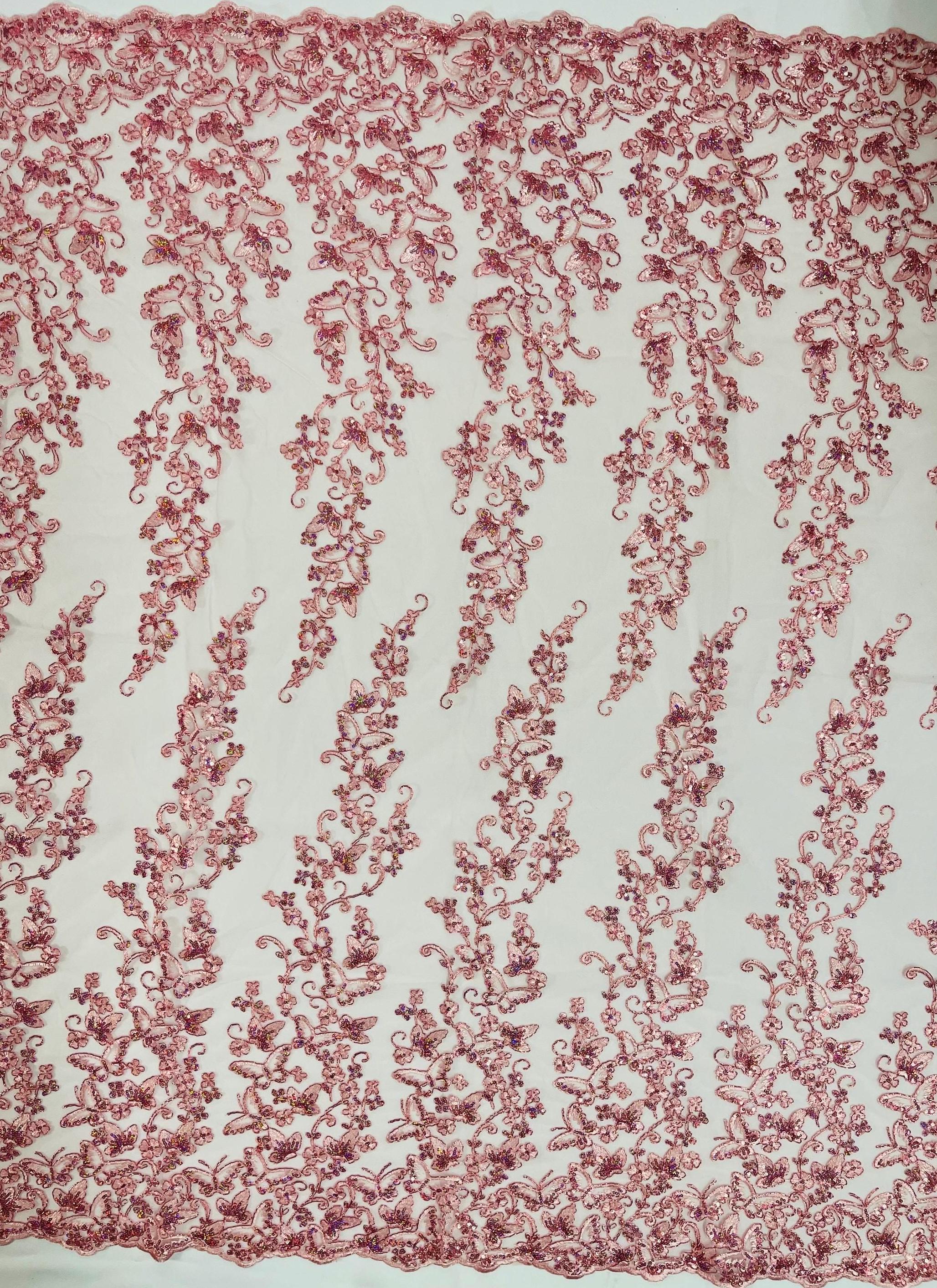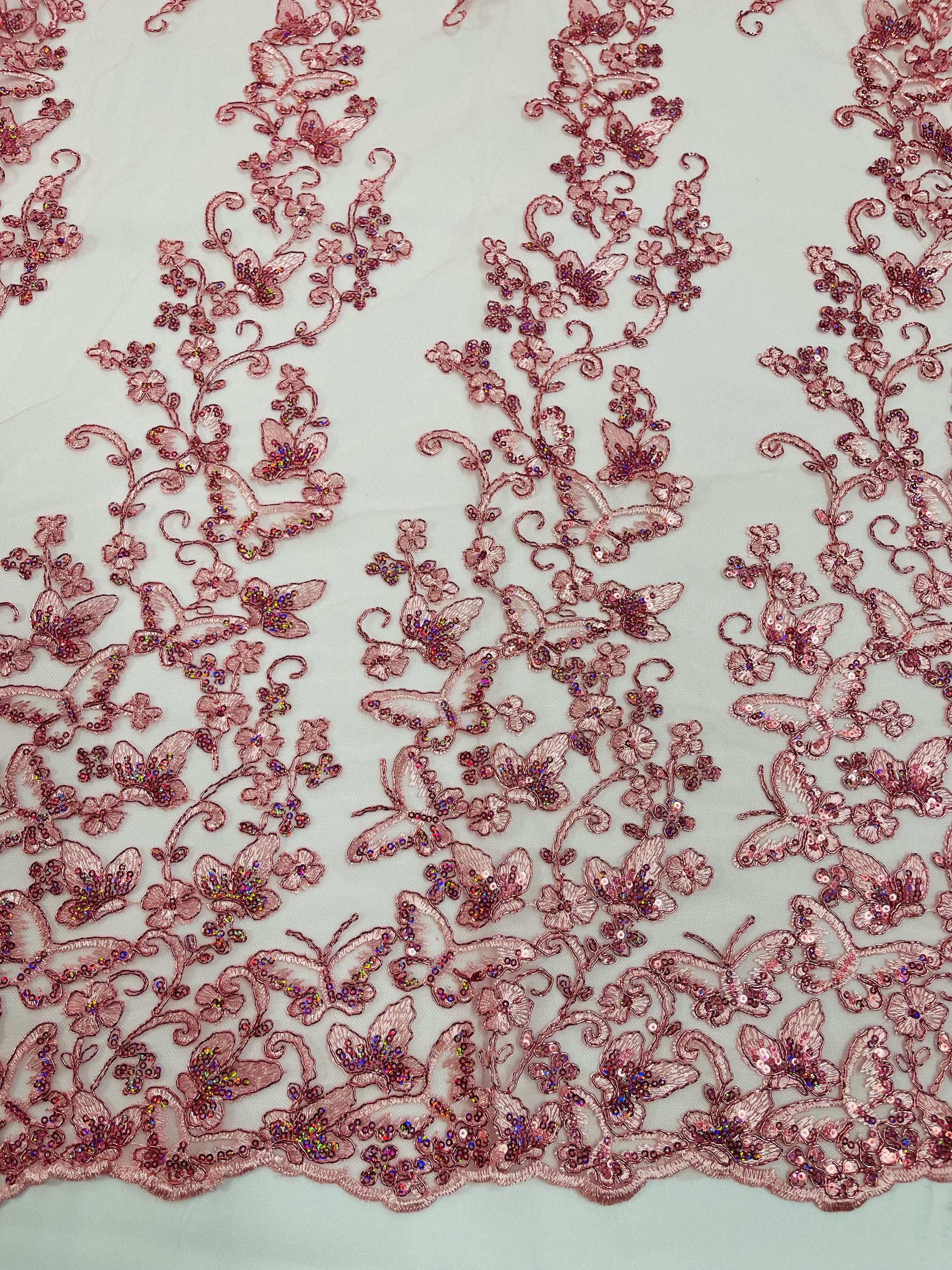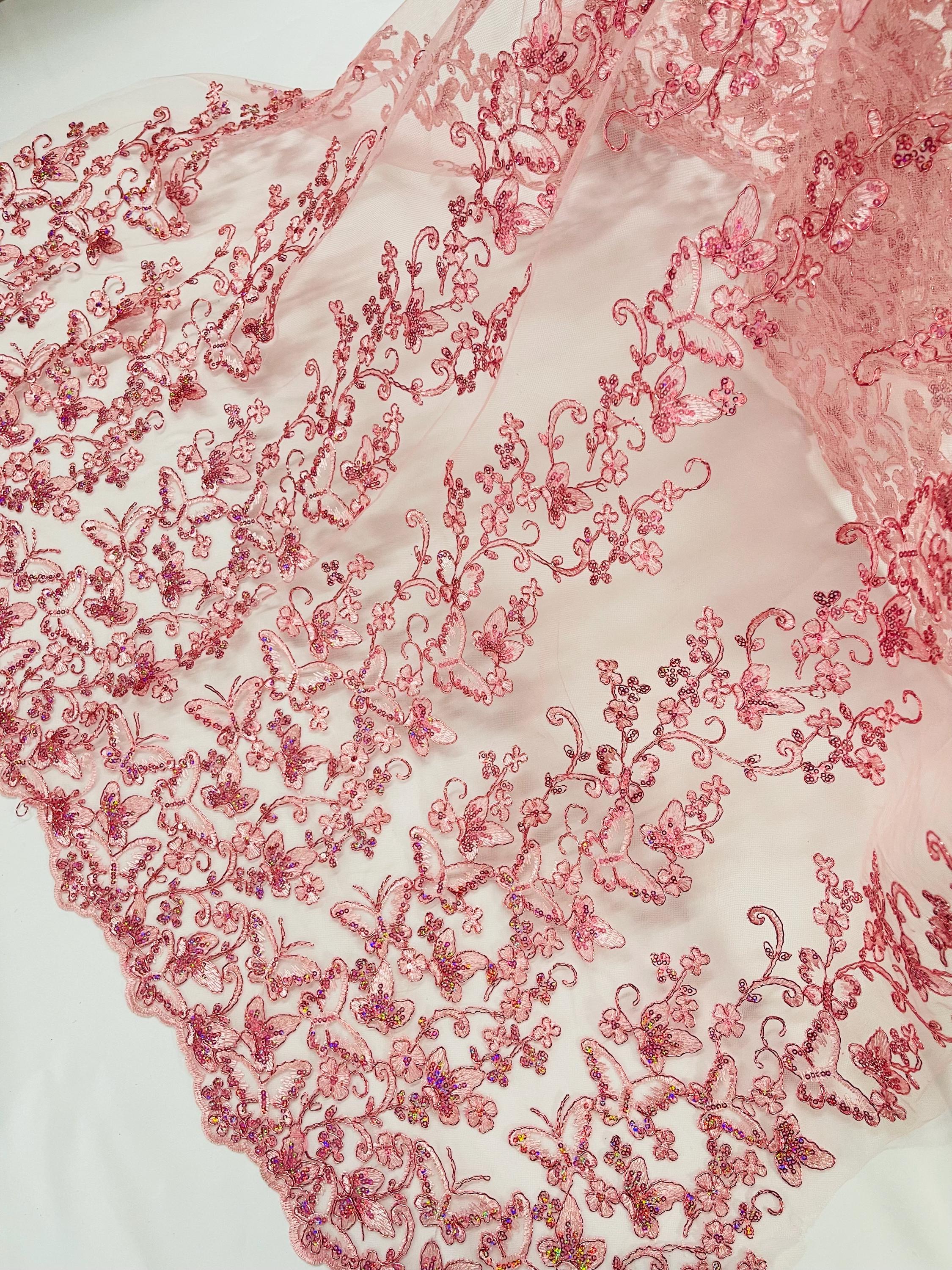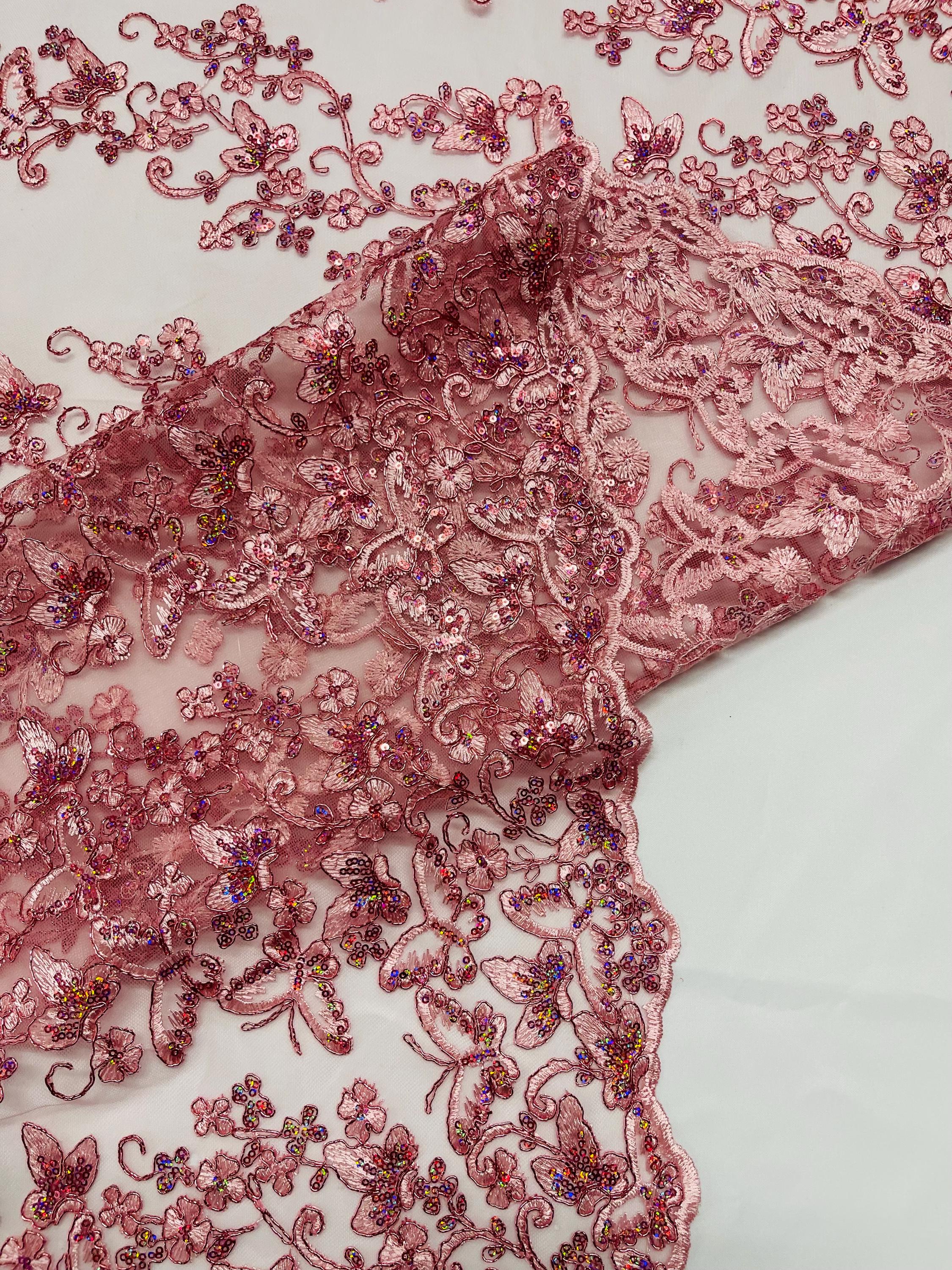 Pink Hologram Sequin Butterfly Lace Fabric: Metallic Corded Embroidery with Sequins