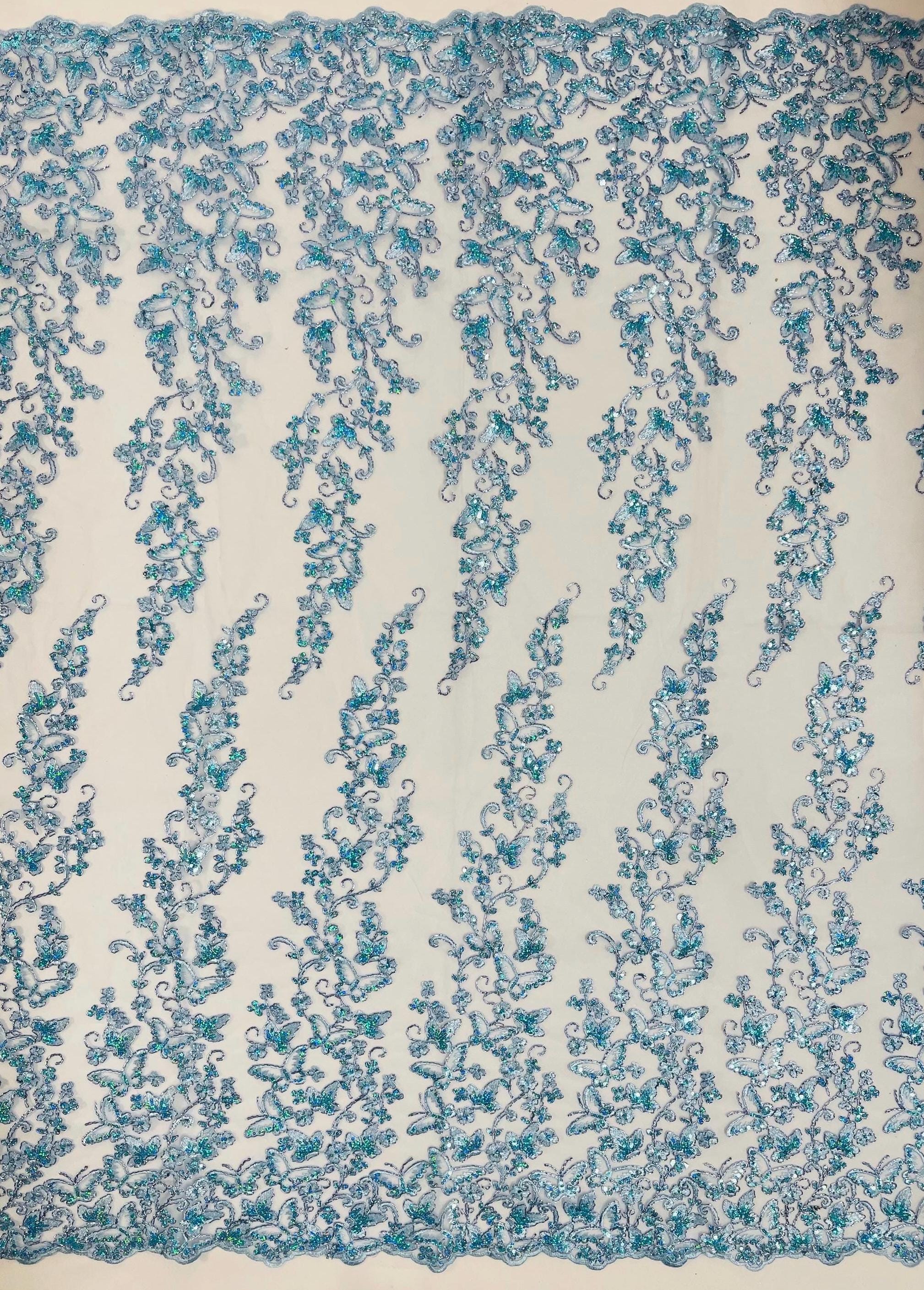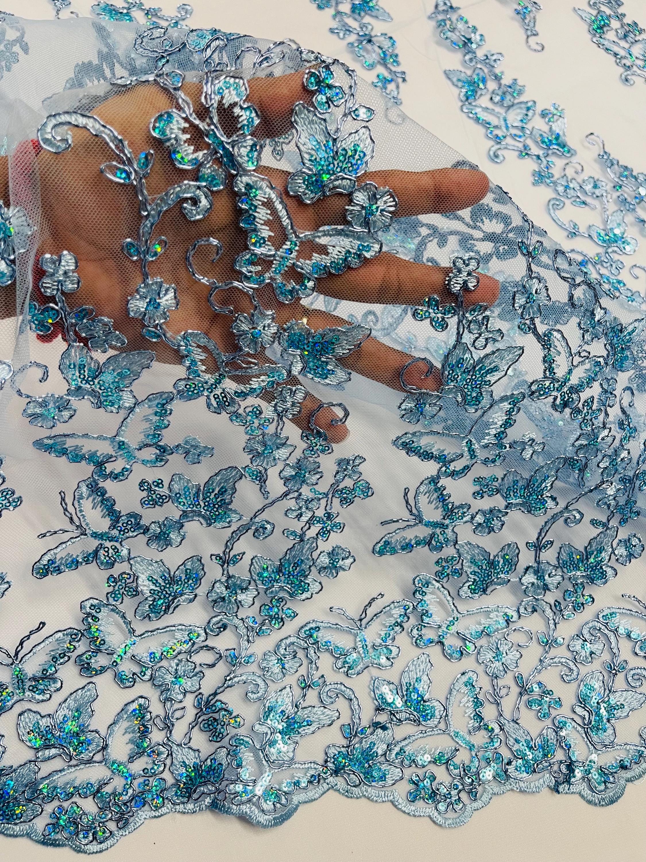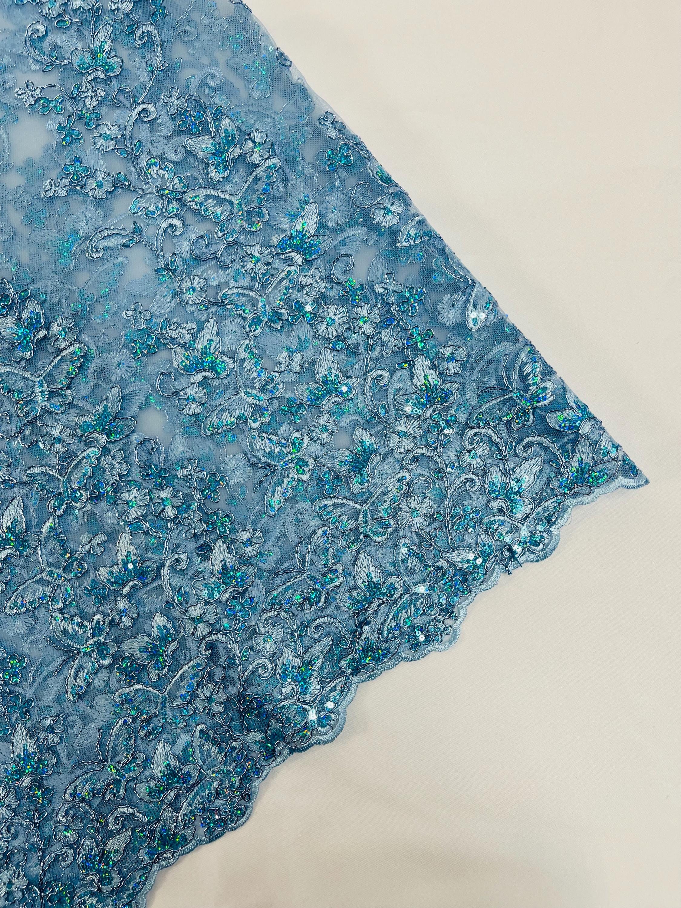 Blue Hologram Sequin Butterfly Lace Fabric: Metallic Corded Embroidery with Sequins