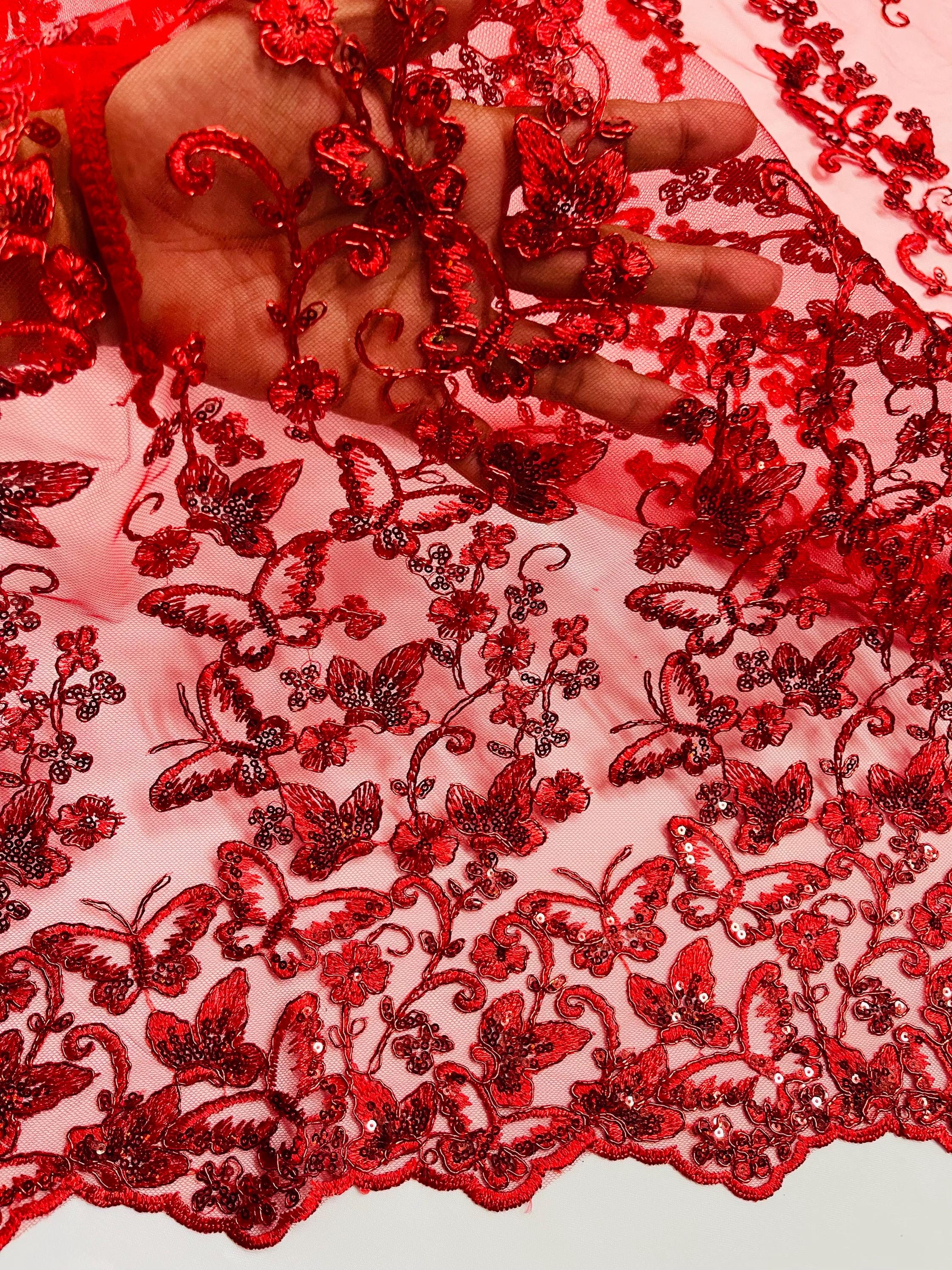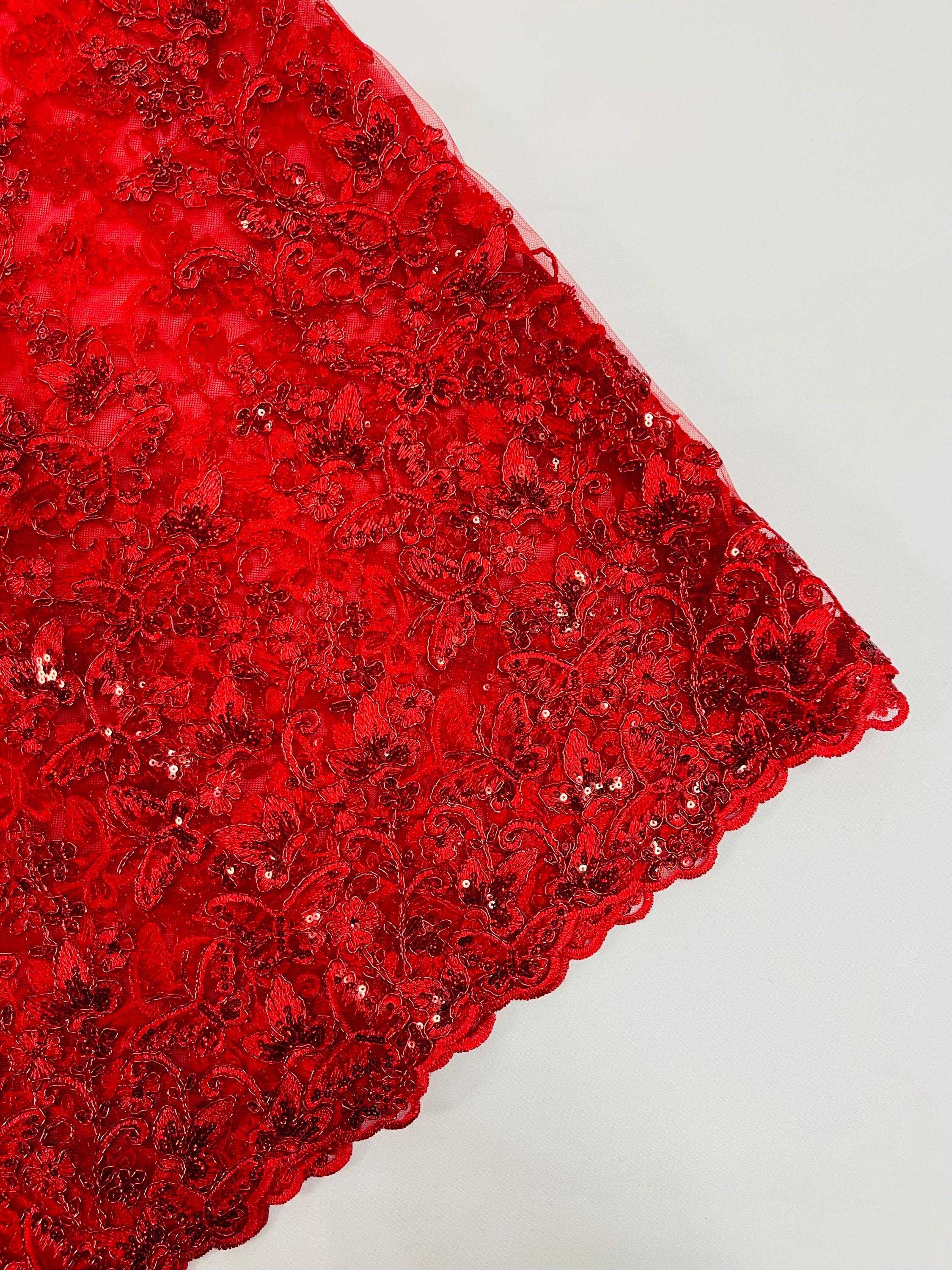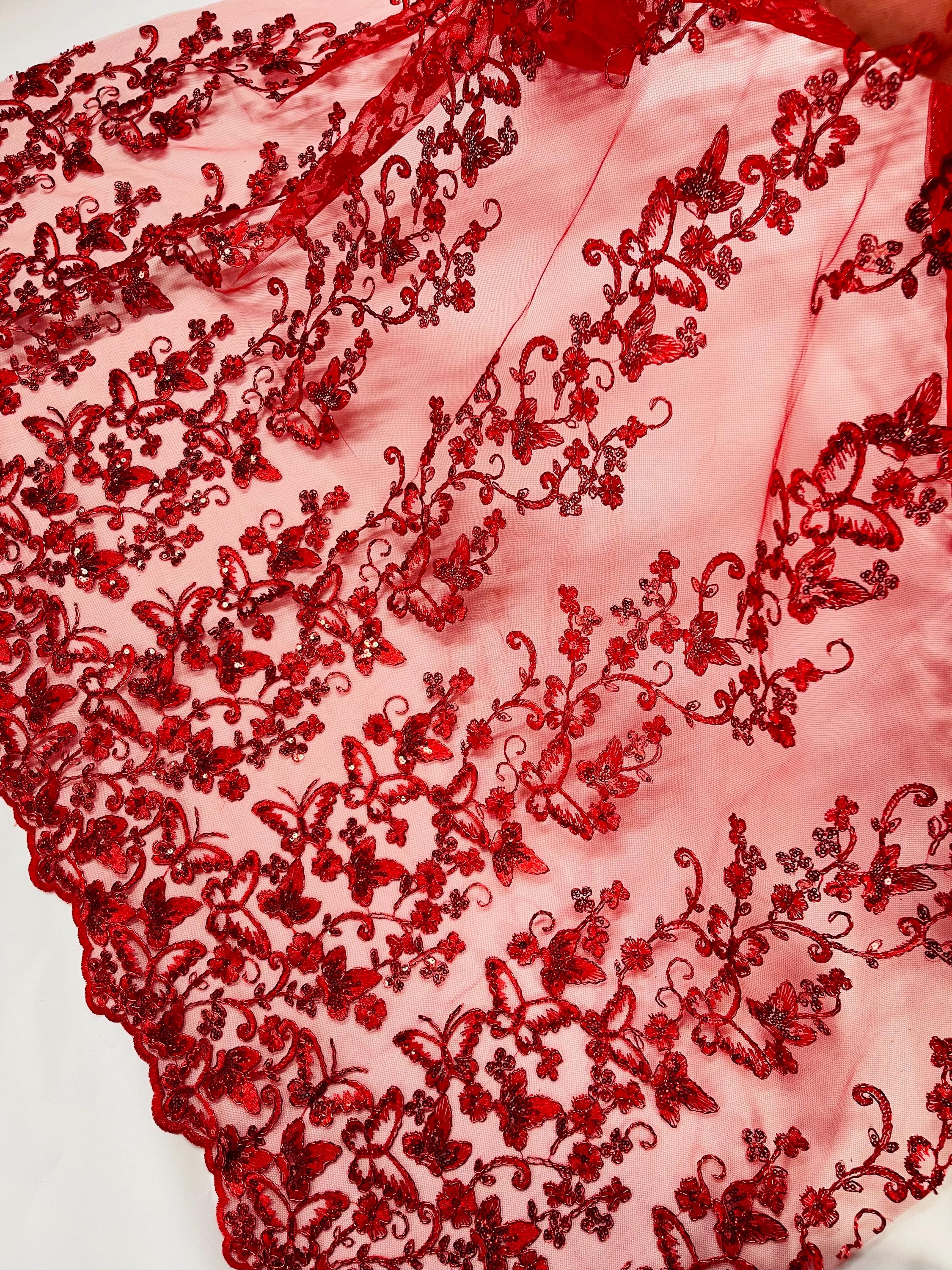 Red Hologram Sequin Butterfly Lace Fabric: Metallic Corded Embroidery with Sequins