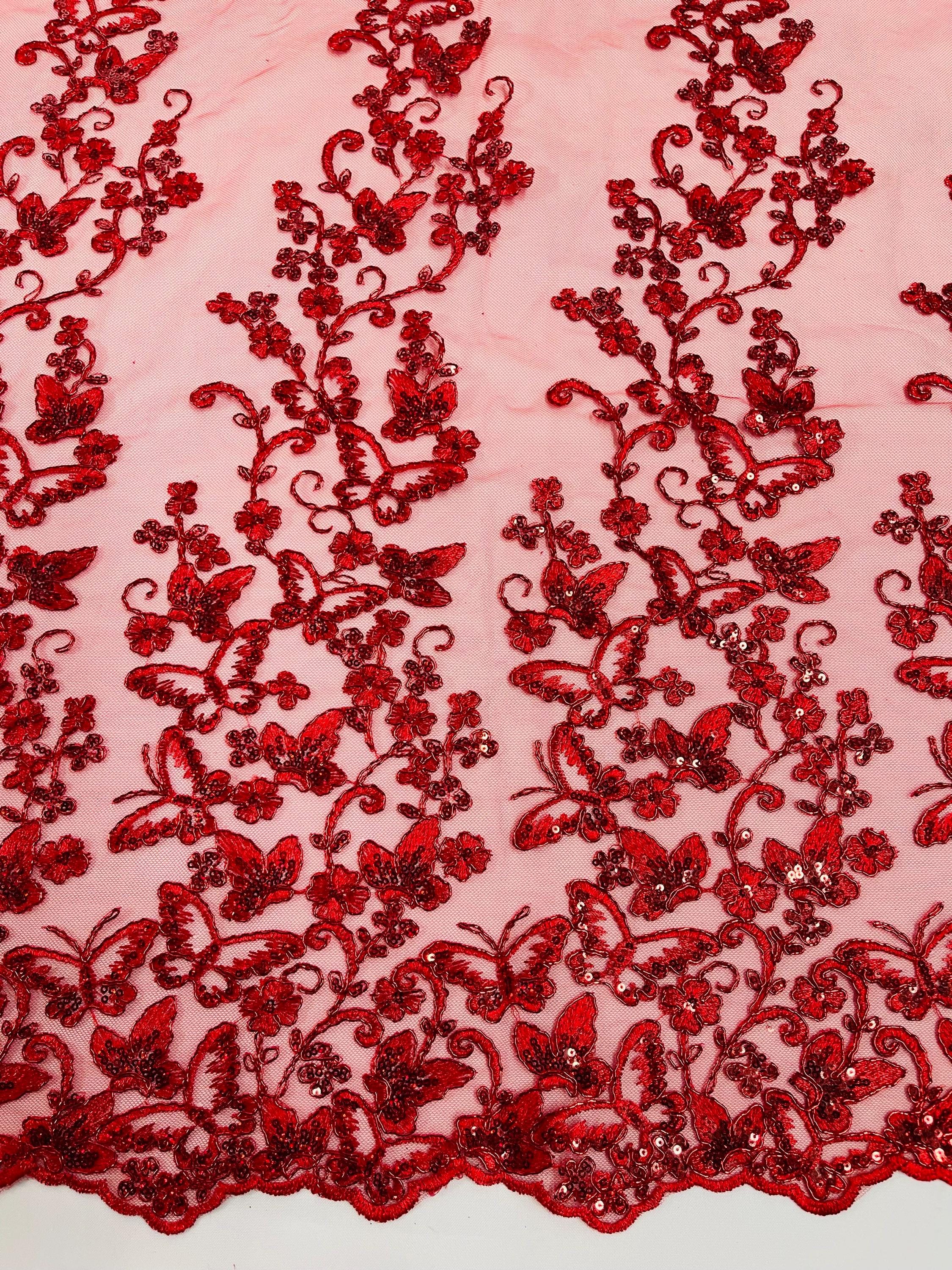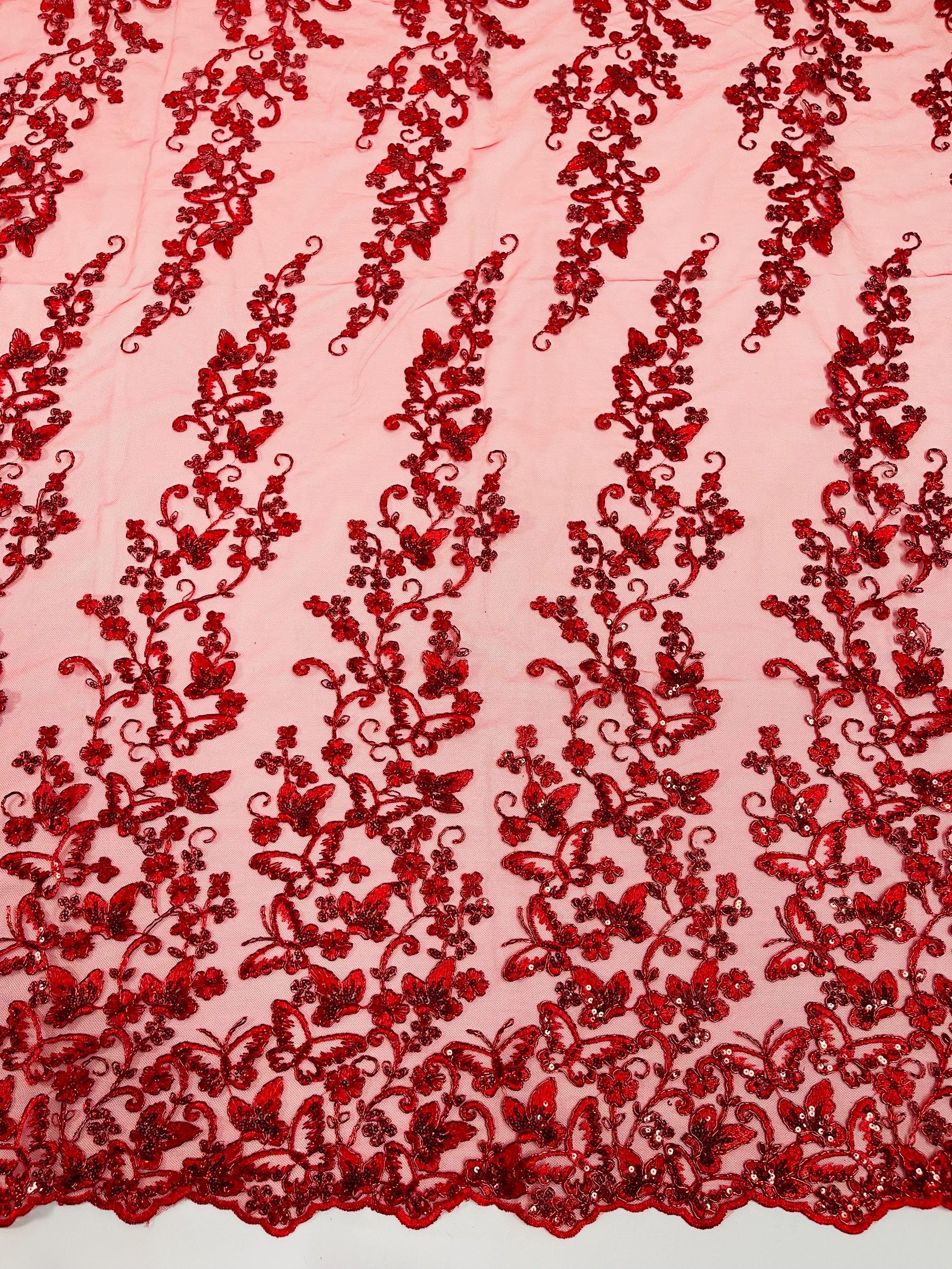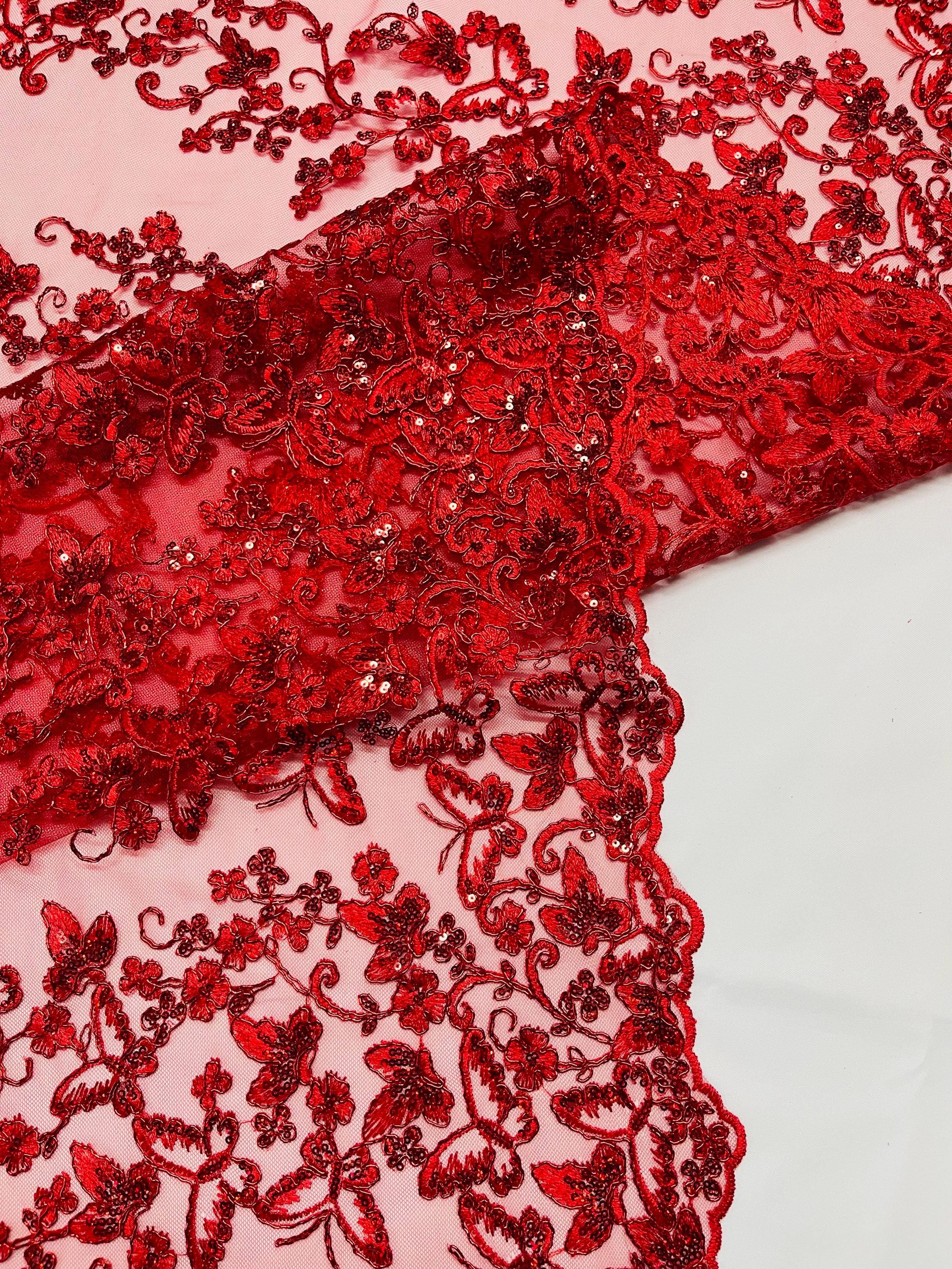 Red Hologram Sequin Butterfly Lace Fabric: Metallic Corded Embroidery with Sequins