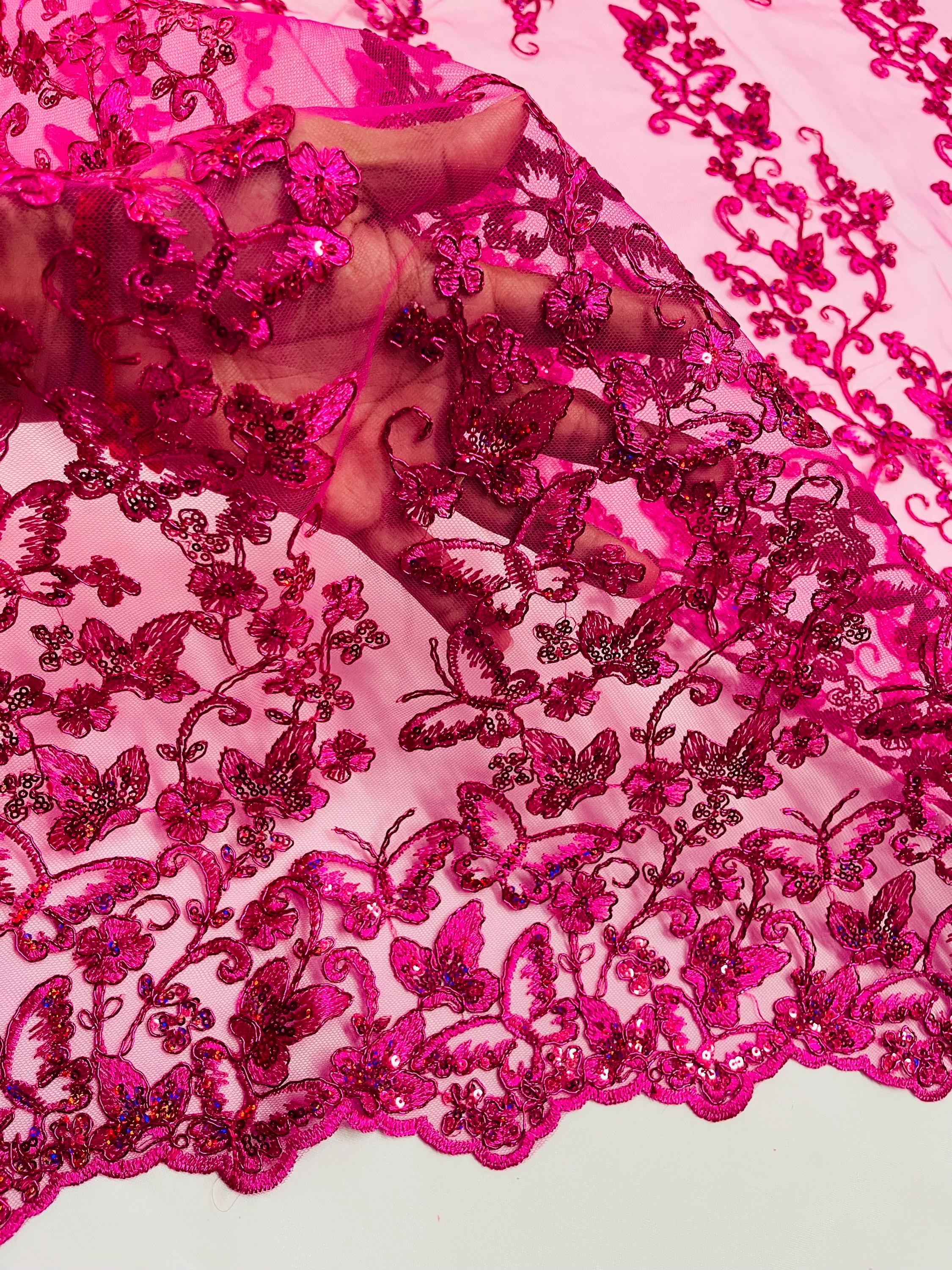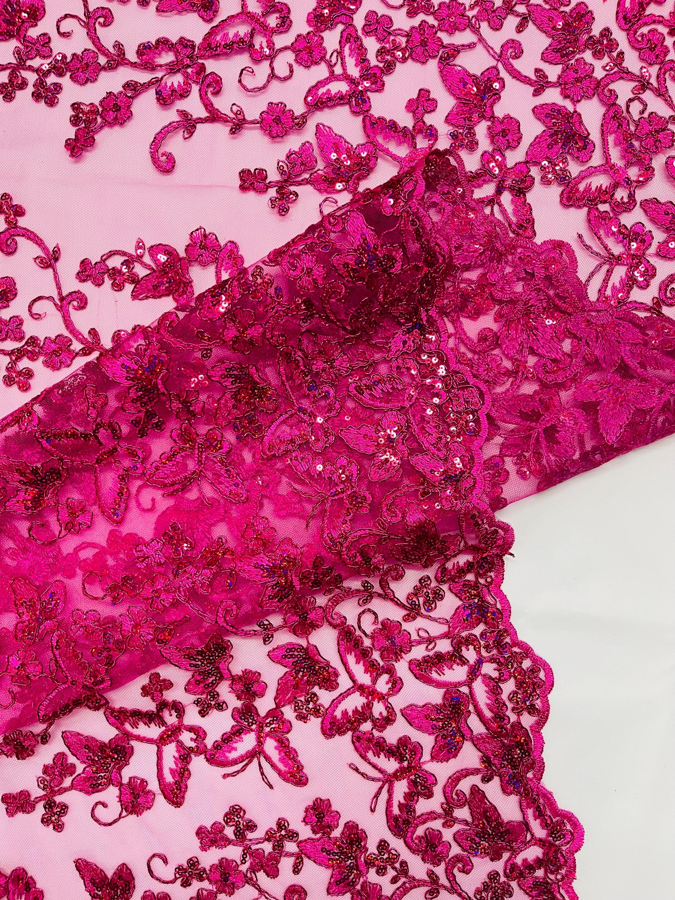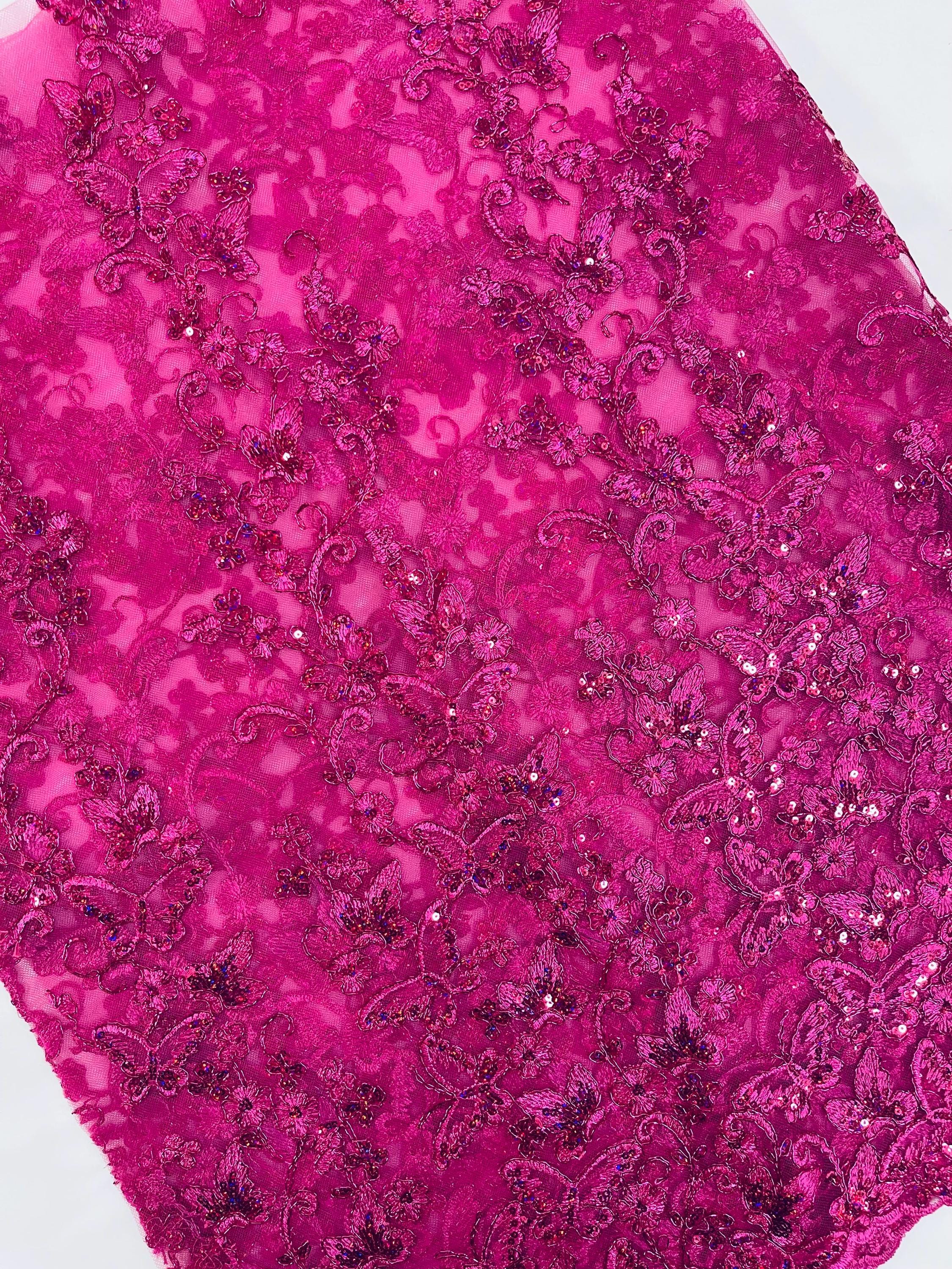 Fuchsia Hologram Sequin Butterfly Lace Fabric: Metallic Corded Embroidery with Sequins
