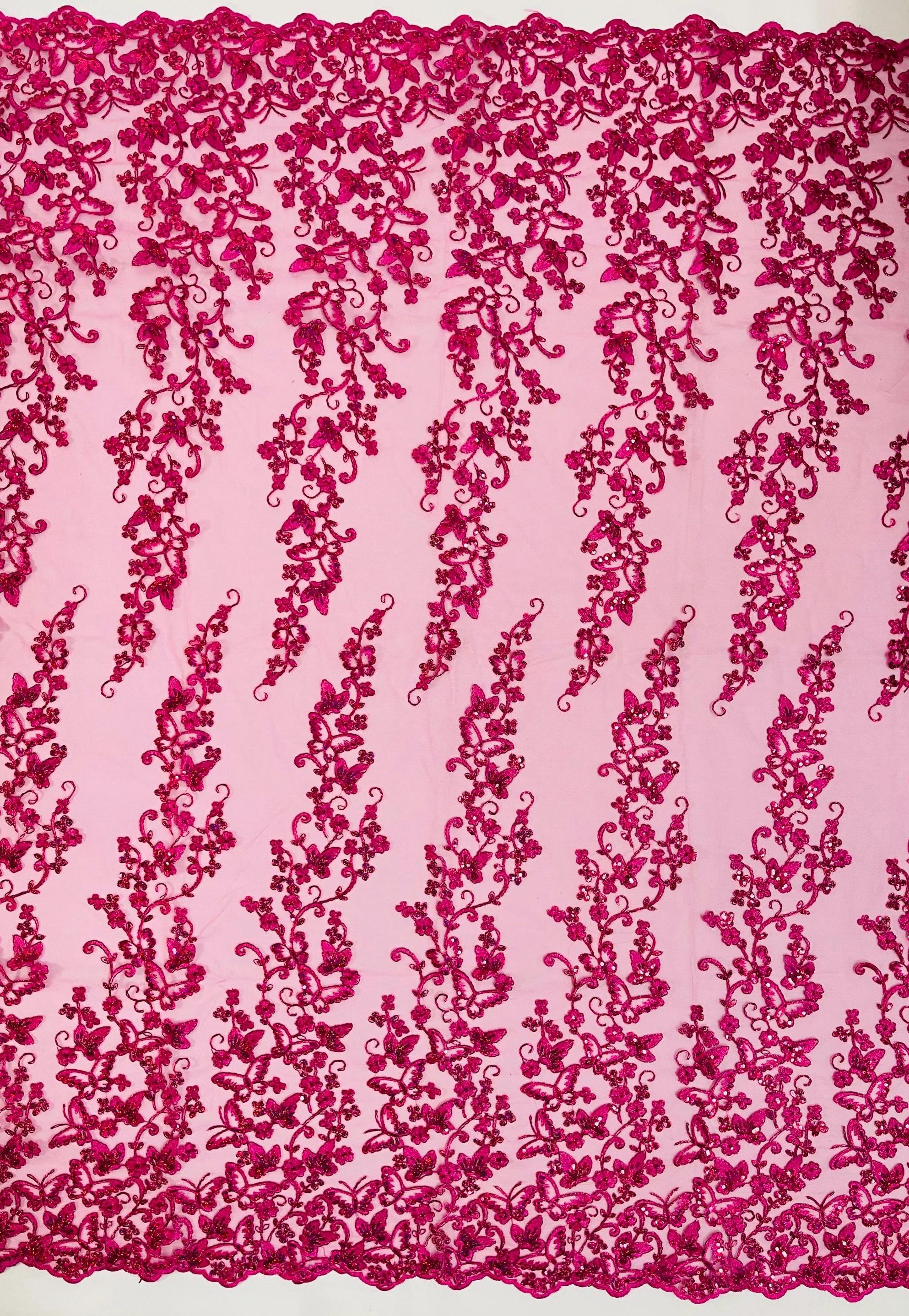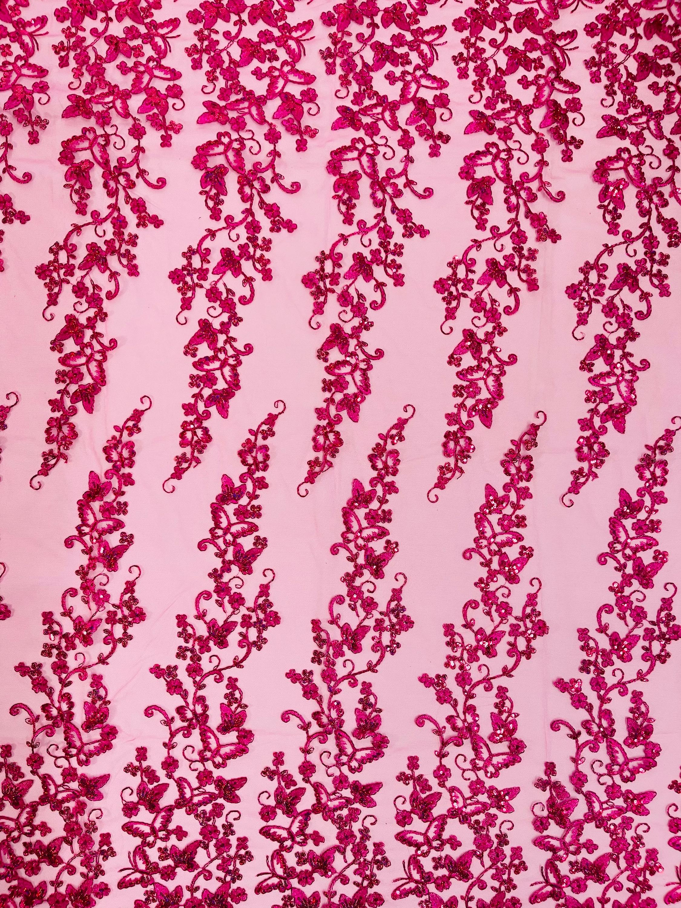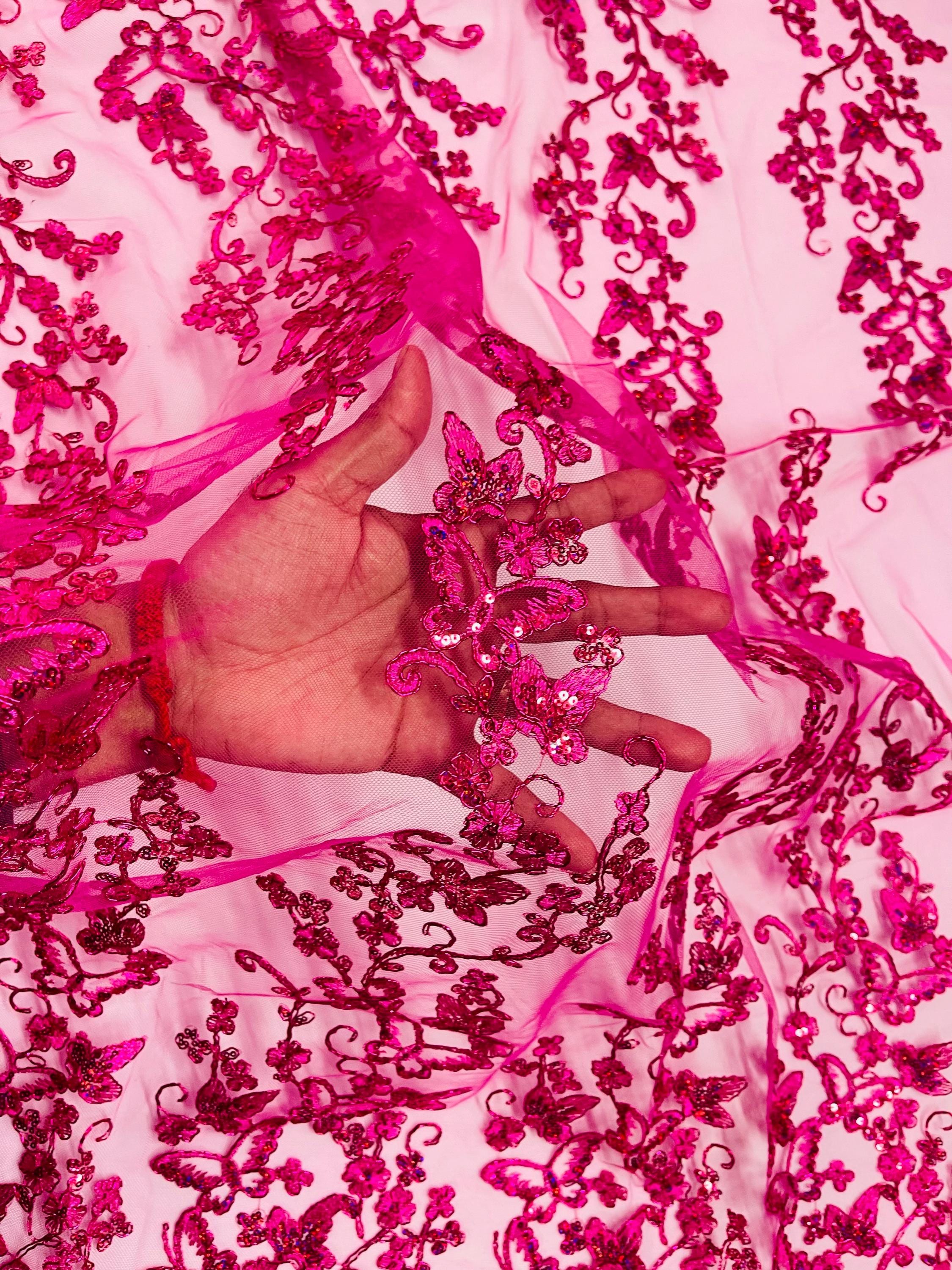 Fuchsia Hologram Sequin Butterfly Lace Fabric: Metallic Corded Embroidery with Sequins