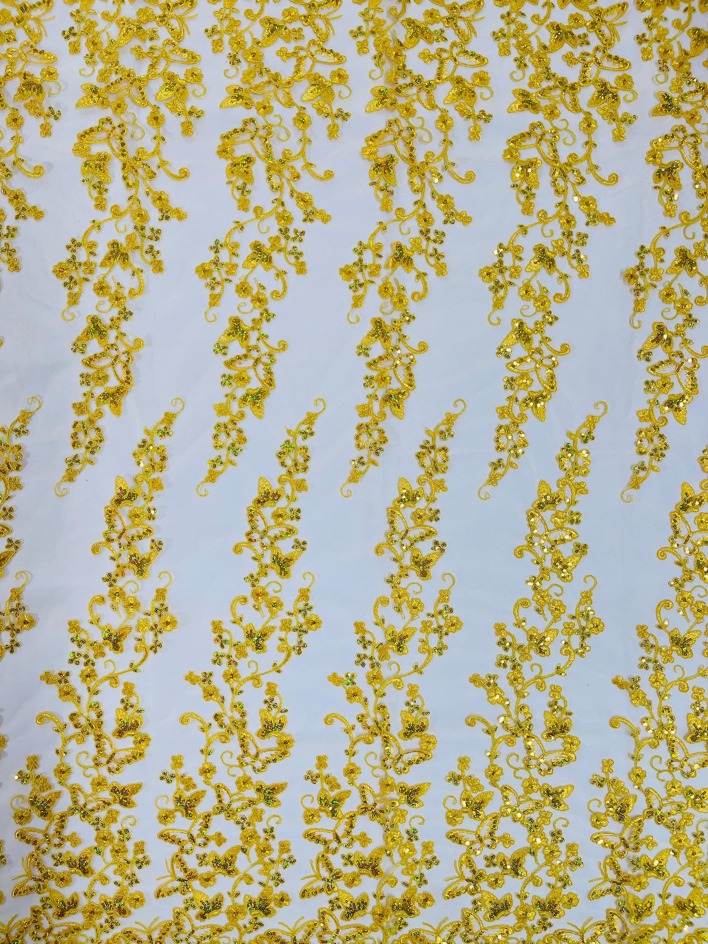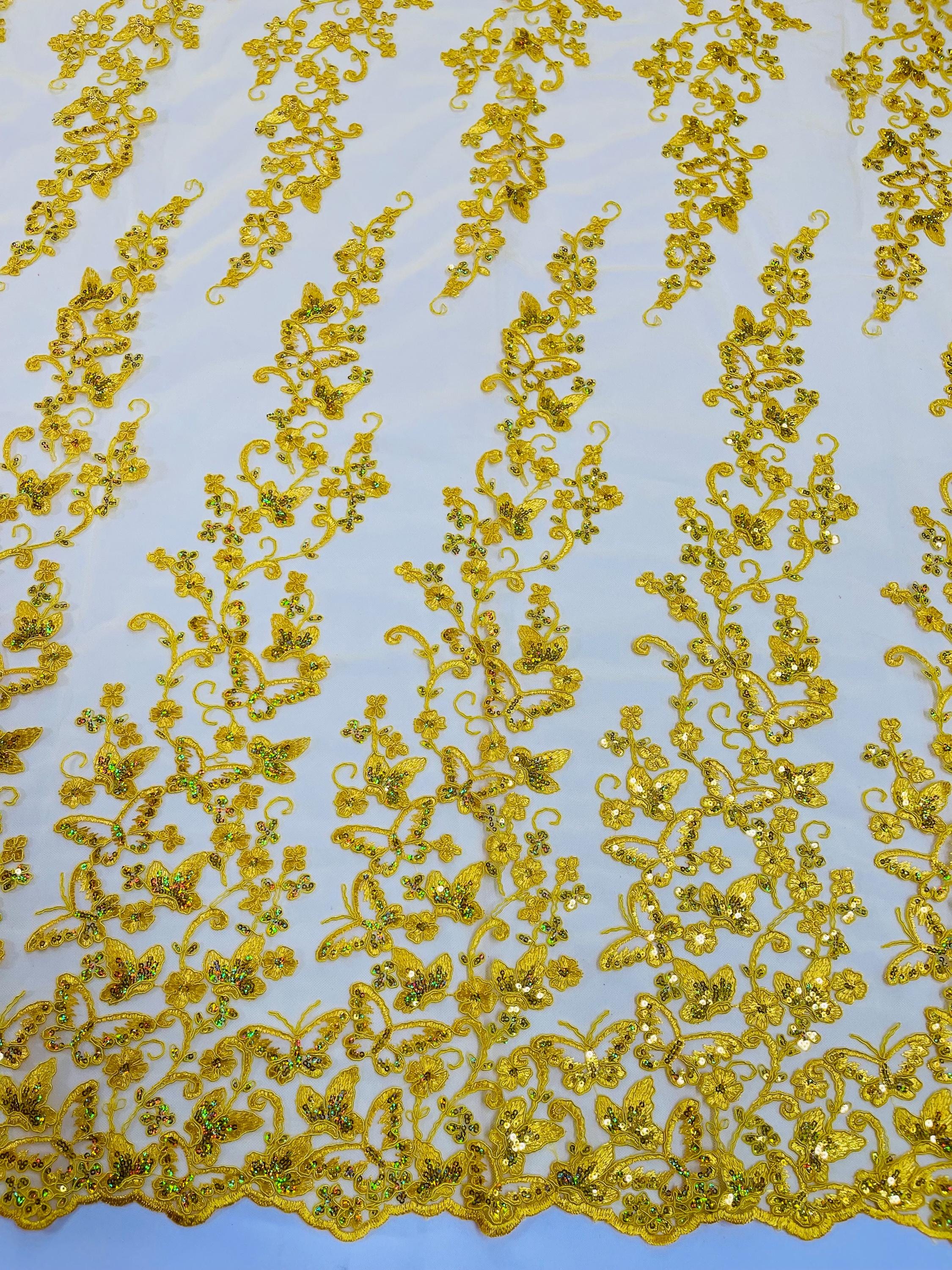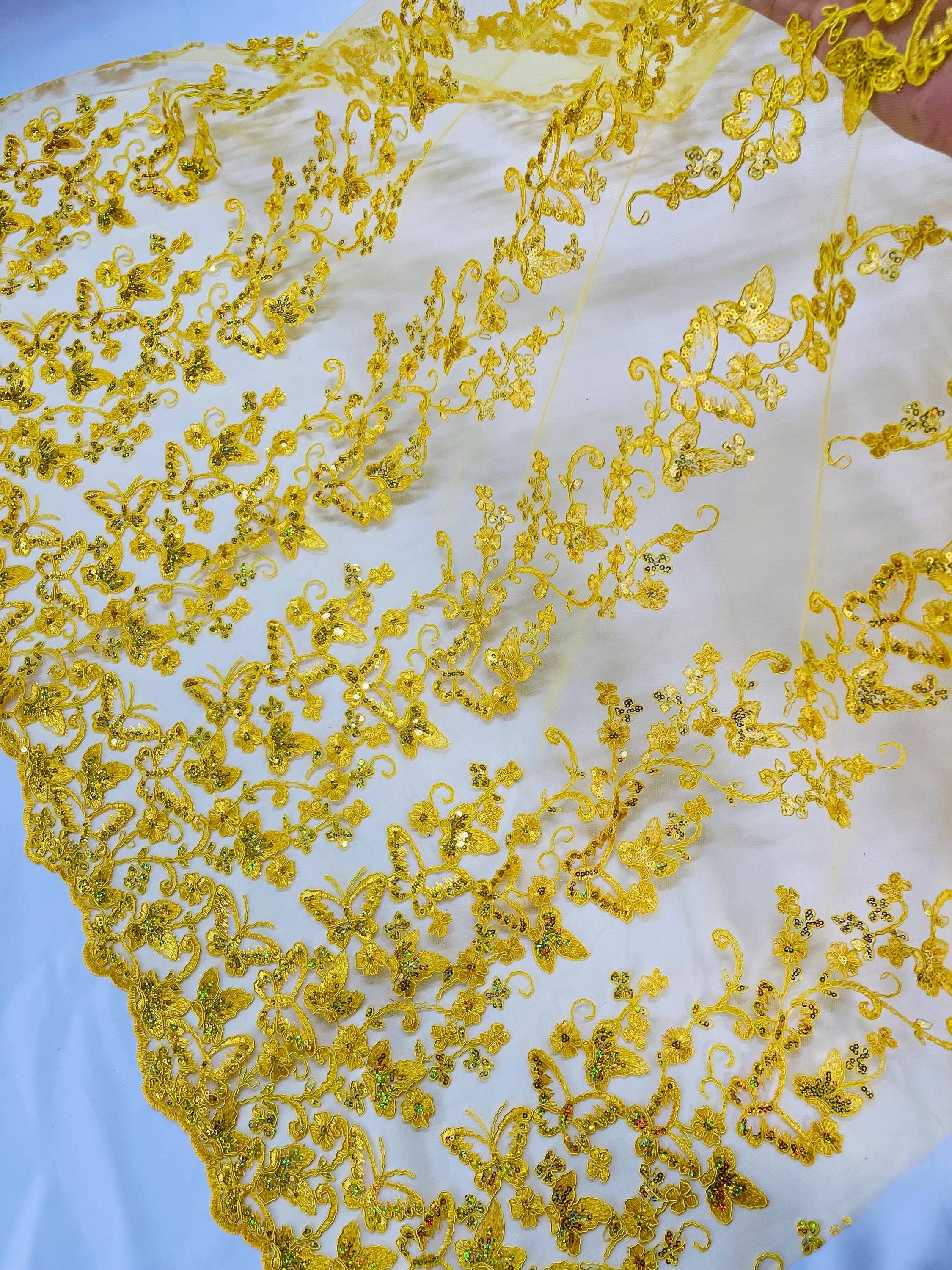 Lilac Hologram Sequin Butterfly Lace Fabric: Corded Embroidery with Sequins on a Mesh